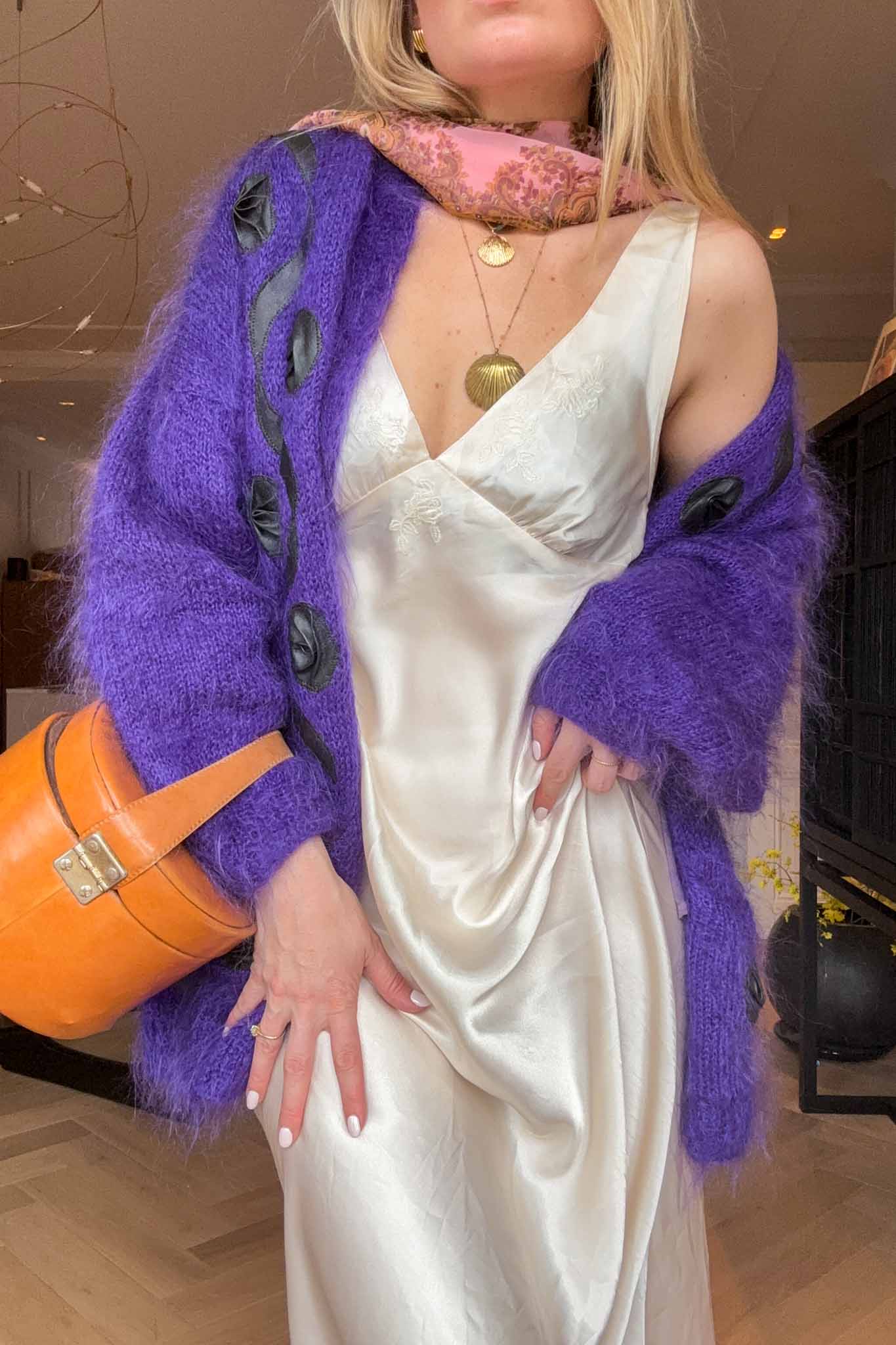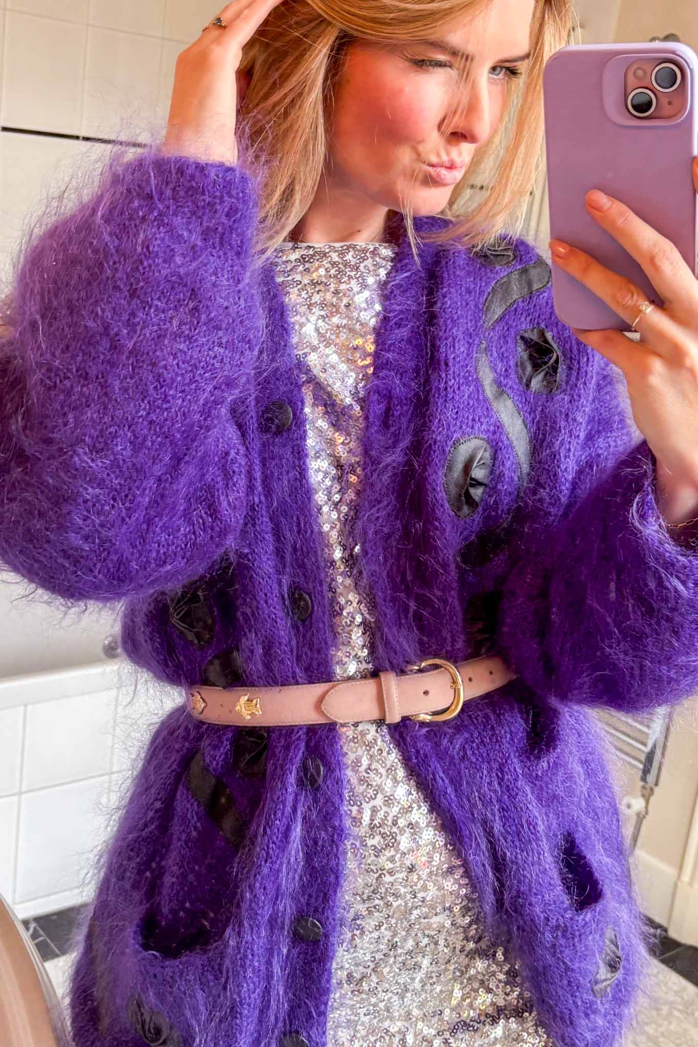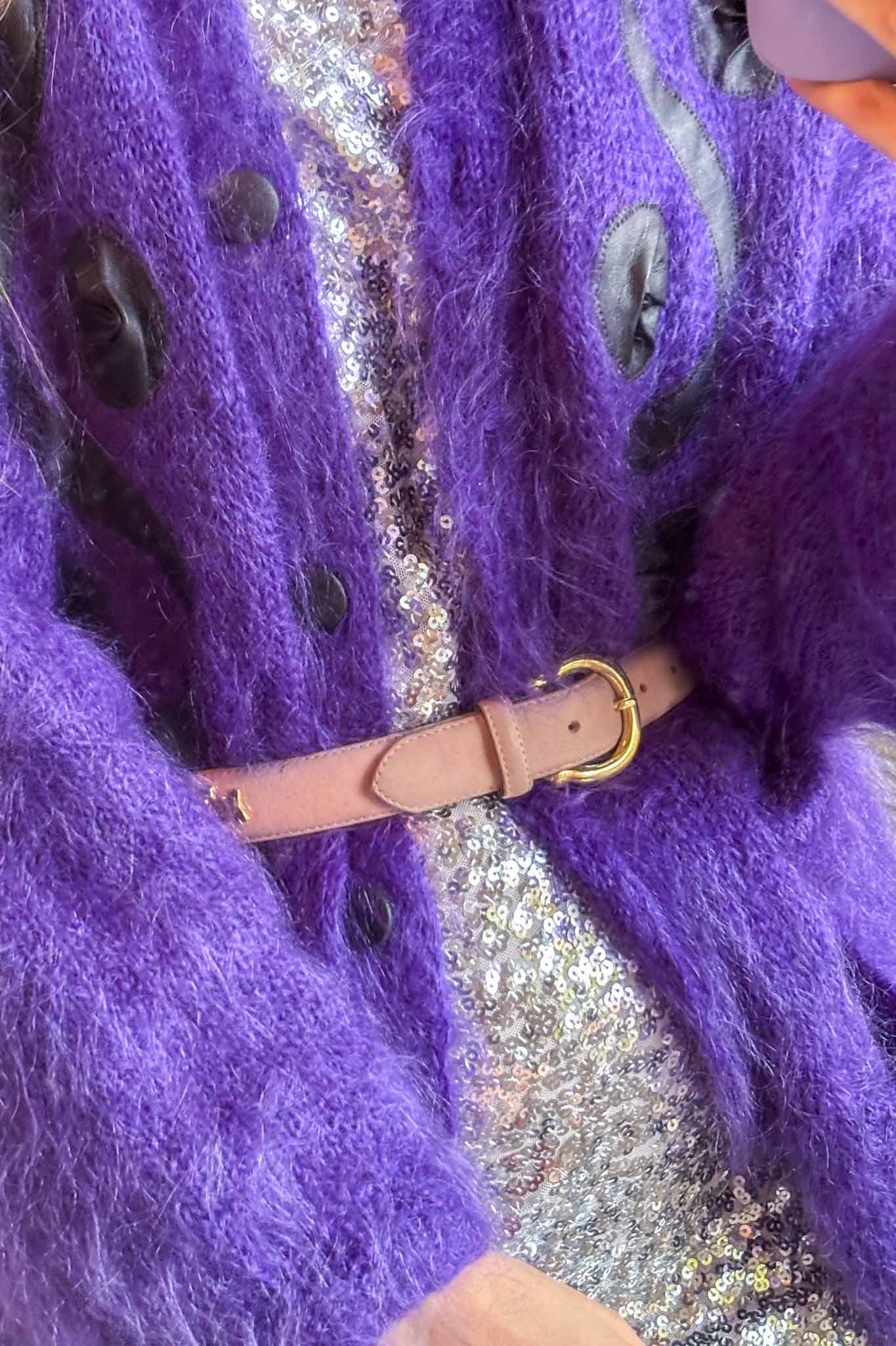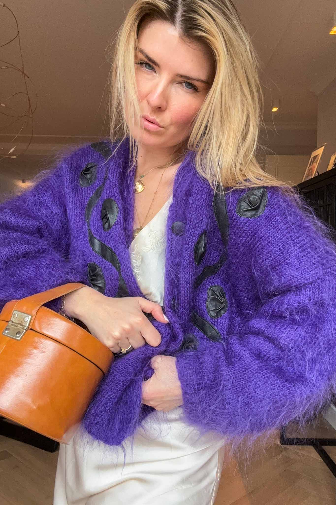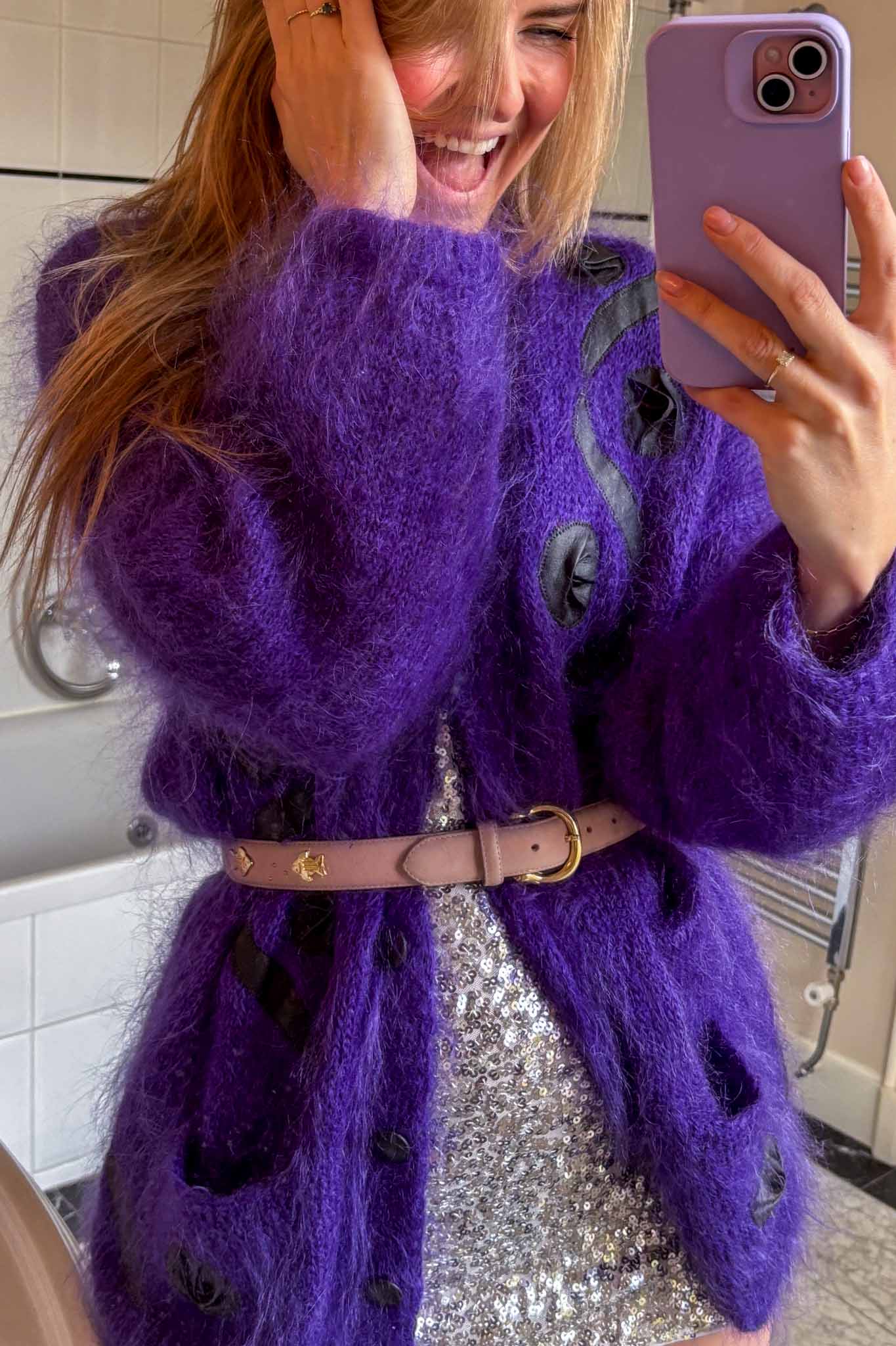 Wrap yourself in effortless elegance with this purple mohair maxi cardigan, a cosy and statement-making piece handpicked in Italy. Soft, plush, and beautifully warm, it features a smooth interior lining for added comfort and refined structure — the perfect blend of chic and practicality for the season.