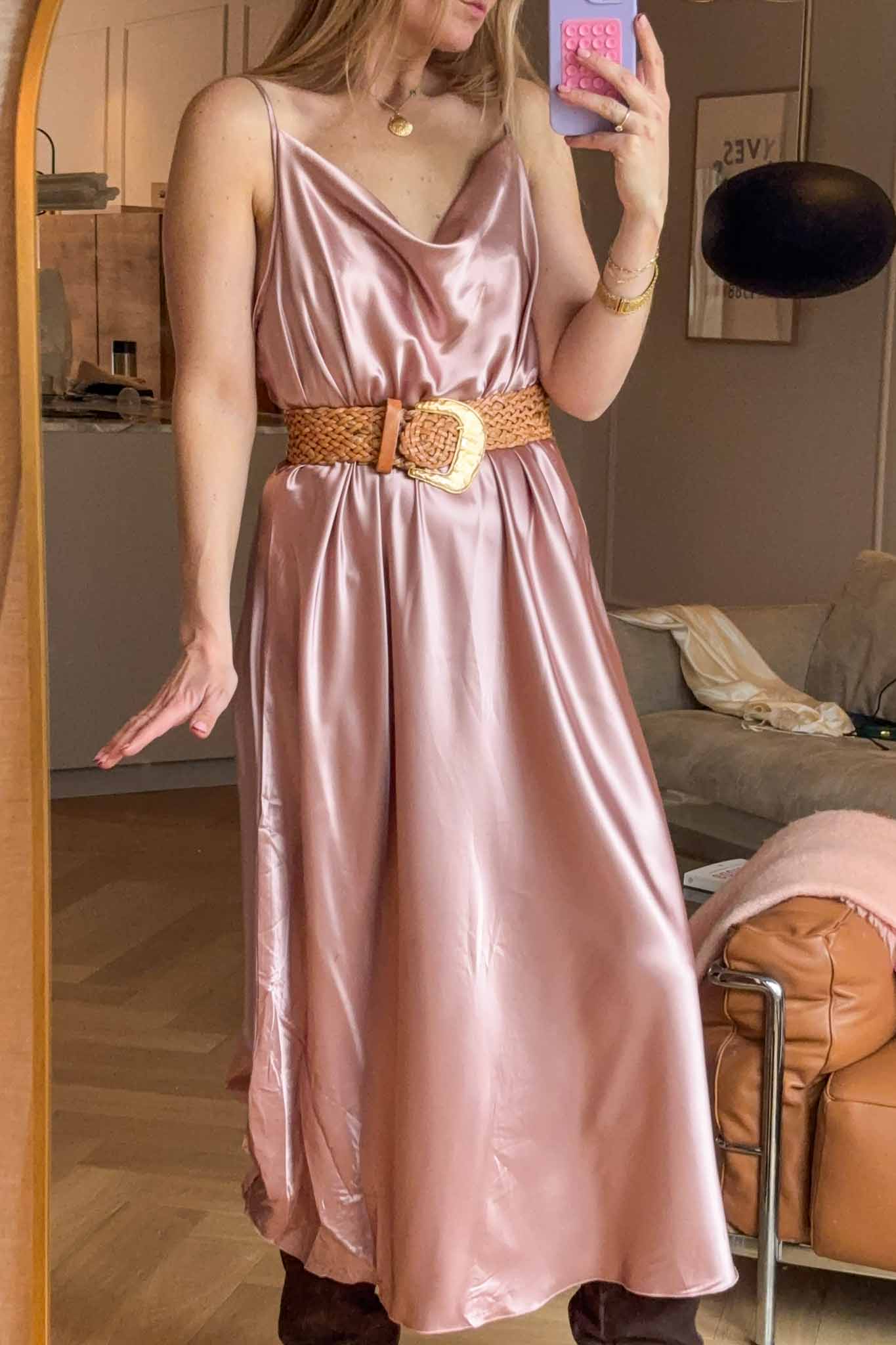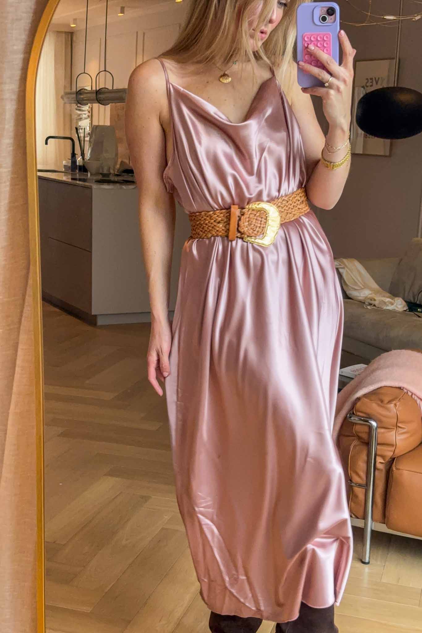 The Soft Blush Slip is a minimal pink satin dress with a loose, flowing silhouette. Lightweight and elegant with a timeless feel.