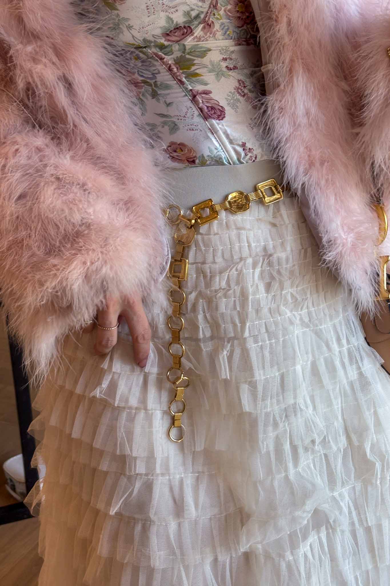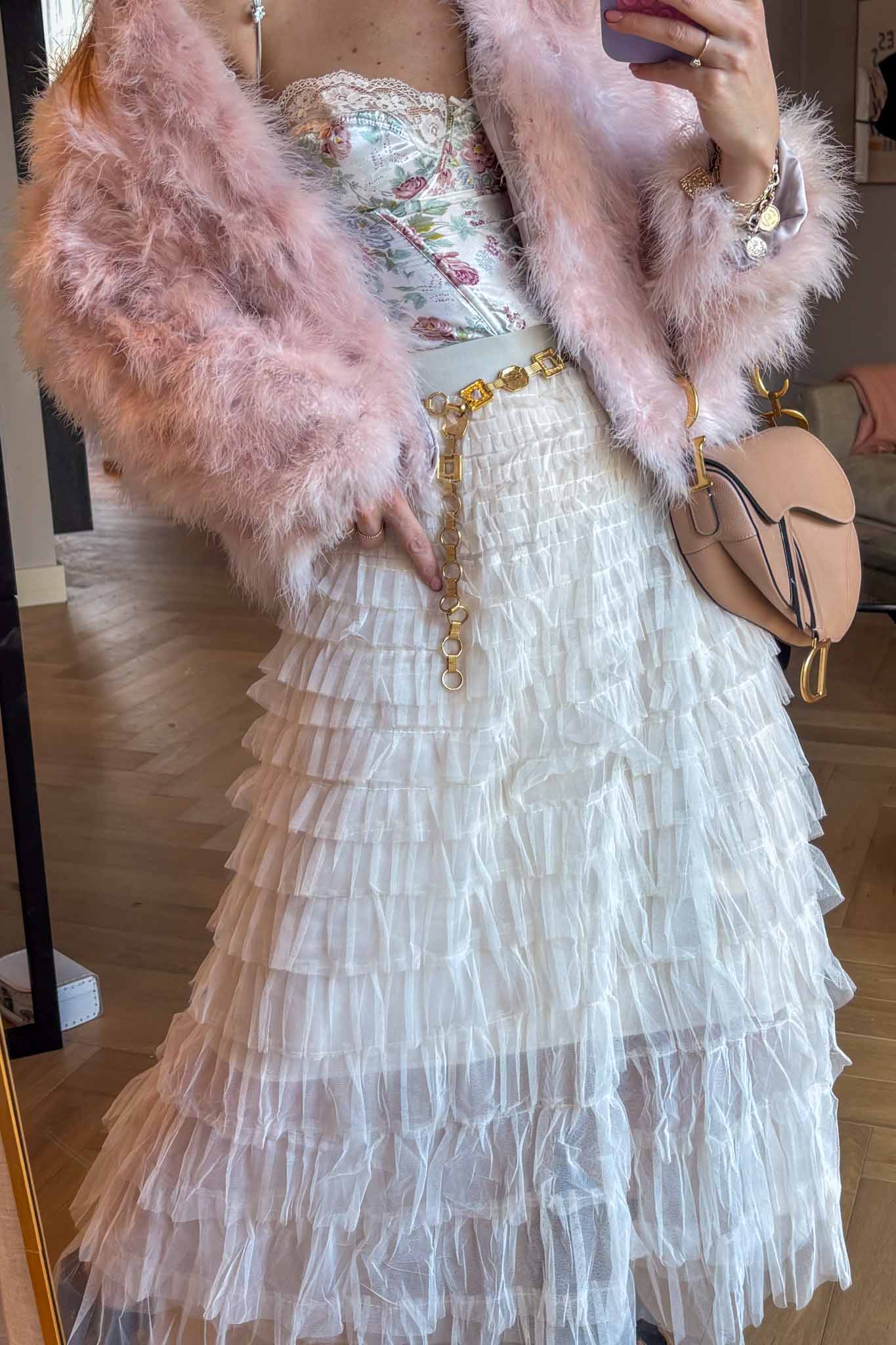 Be à la mode in the beige tulle skirt by Ginger Aardbei! This unique stunner features hypnotic tulle ruffles in a cute beige shade. It is of a maxi length and features an elastic waistband that will help this skirt fit from size 34 up to a 40! It also features an inside lining to avoid transparency. This versatile treasure can add a touch of romance to any outfit as it can be paired with an edgy leather jacket and boots just as well as with a feminine blouse and heels. Dry clean it only. Please be aware this is a new product not vintage, Let’s fall in love!
