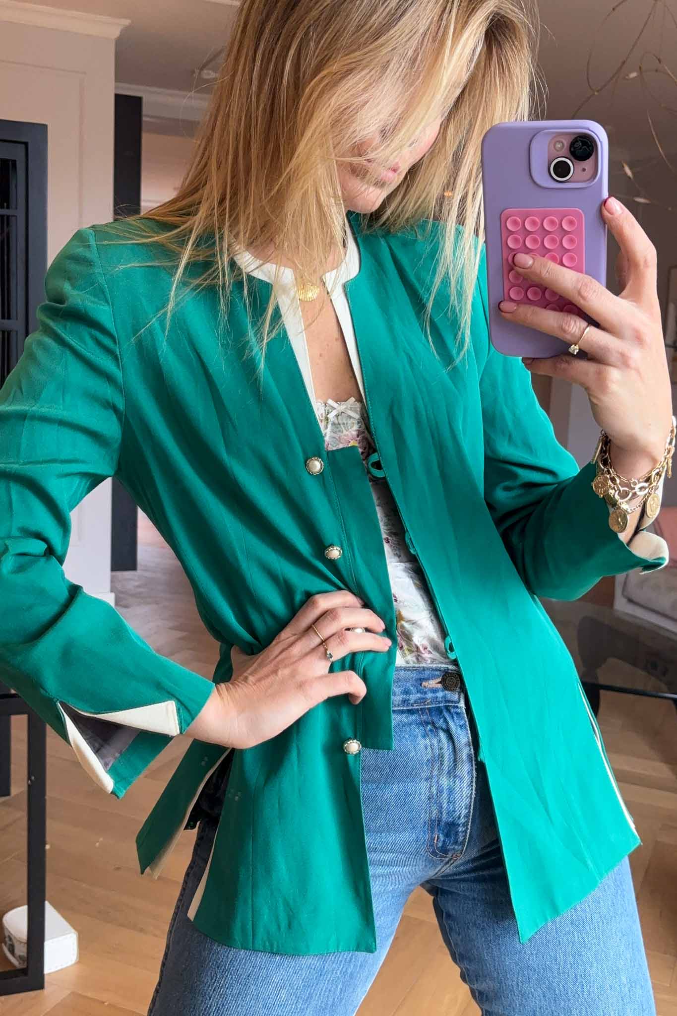 The Silver Button Blazer is a timeless green buttoned-down vintage piece with elegant silver buttons. Clean, structured, and versatile, it’s a refined wardrobe essential.