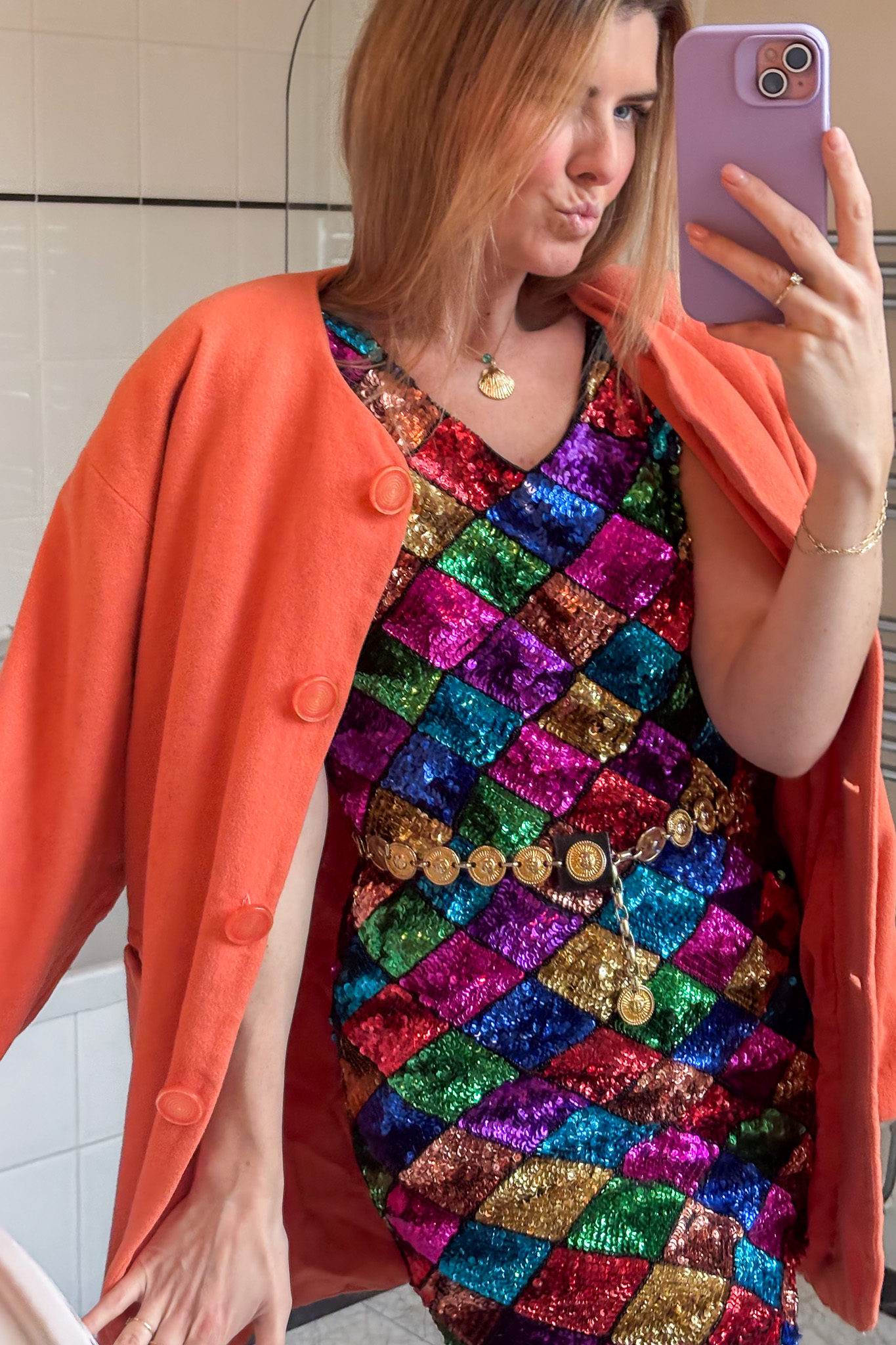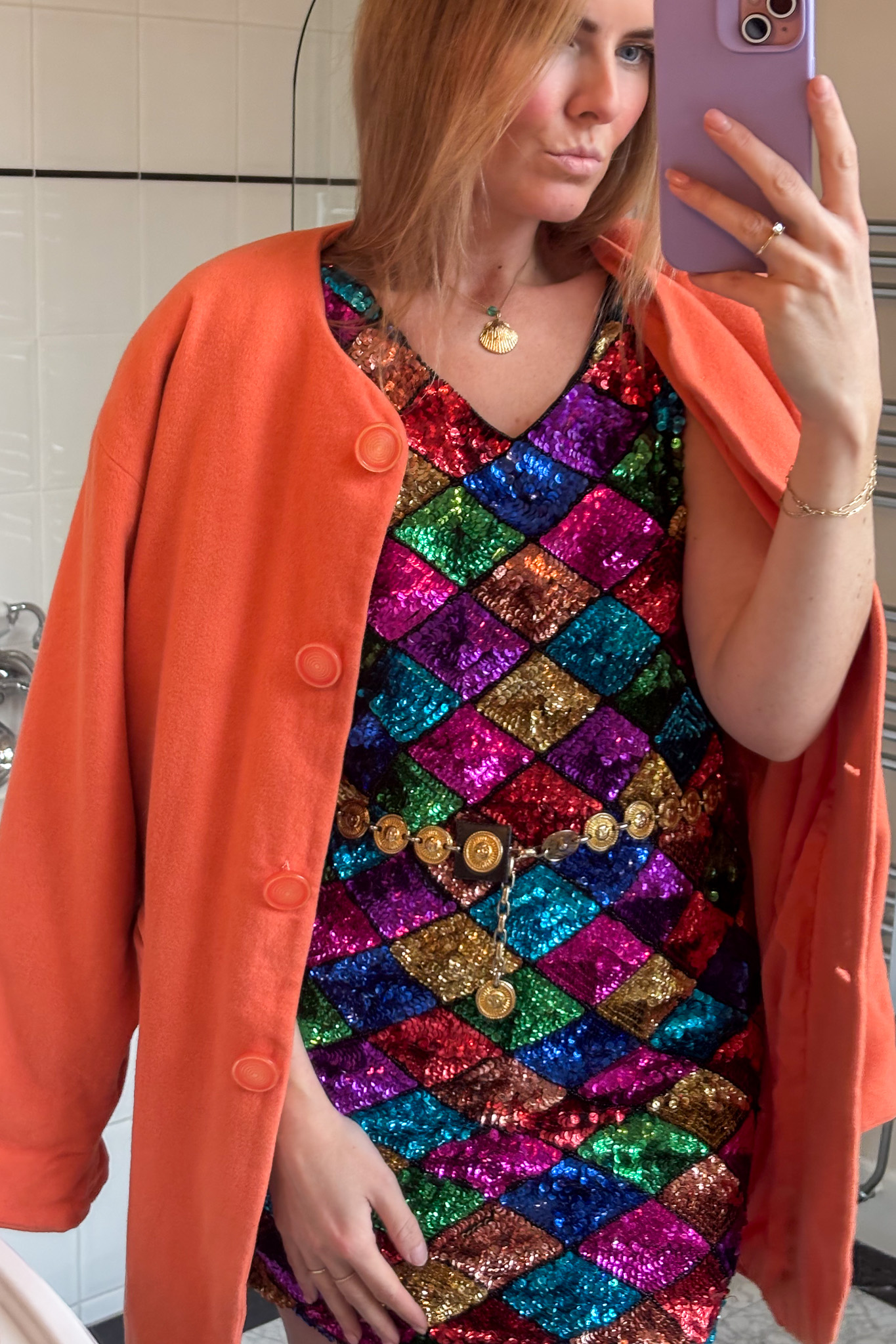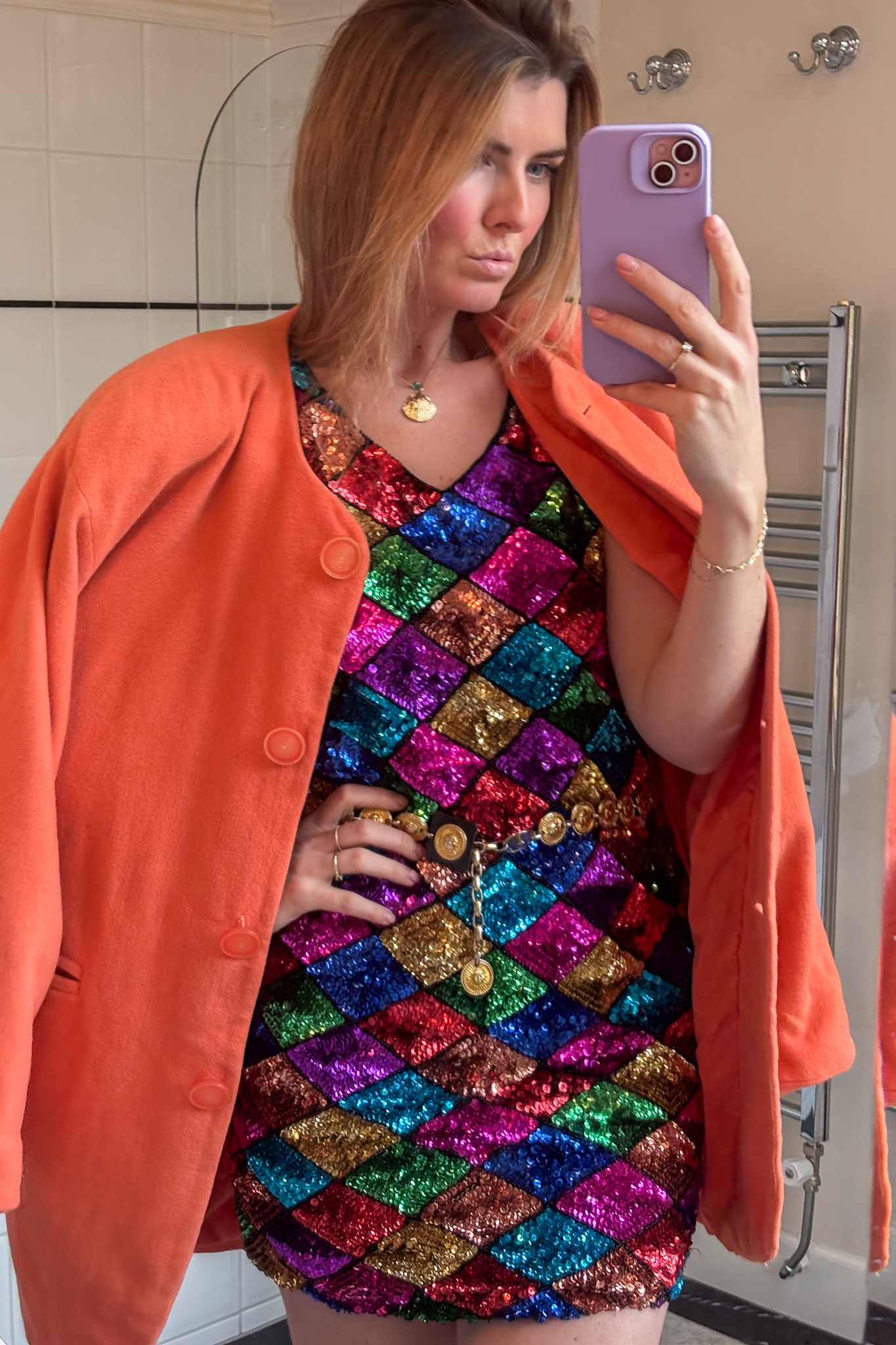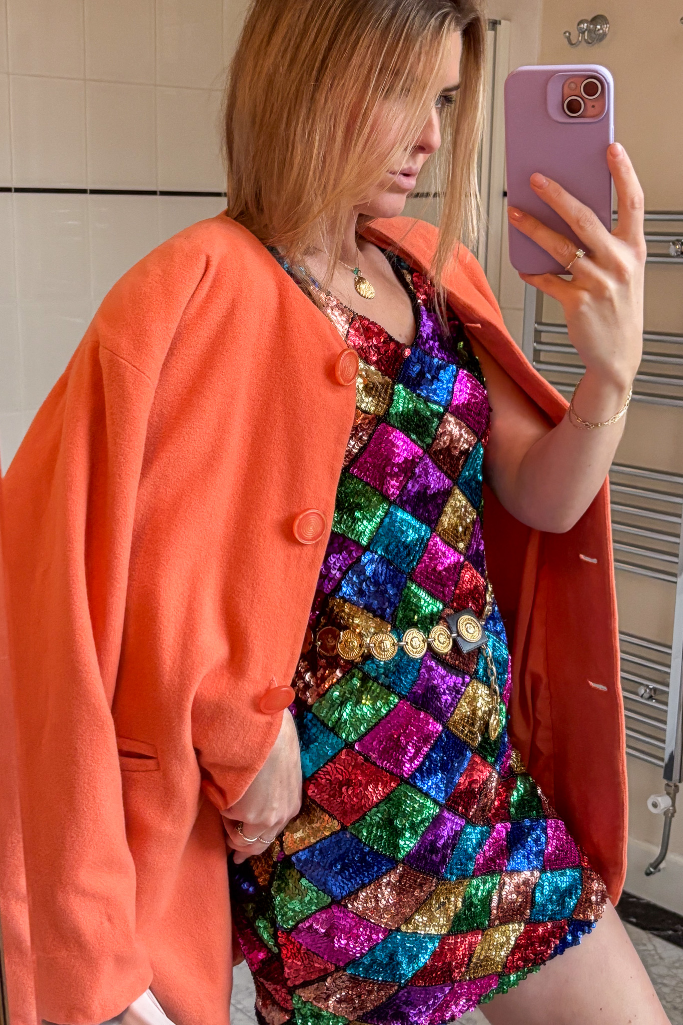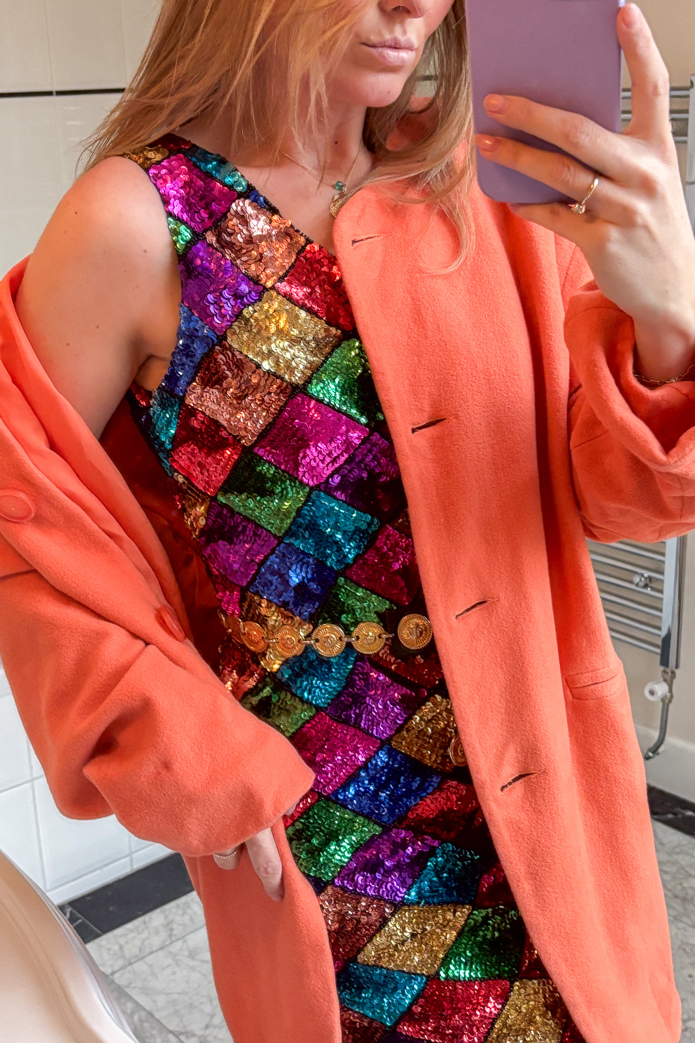 Step into the spotlight with this vintage-inspired sequin midi dress, featuring colorful square details all over that perfectly capture the playful glamour of the 80s. The vibrant multi-colored squares shimmer from every angle, creating a fun yet sophisticated statement for the upcoming holiday season.