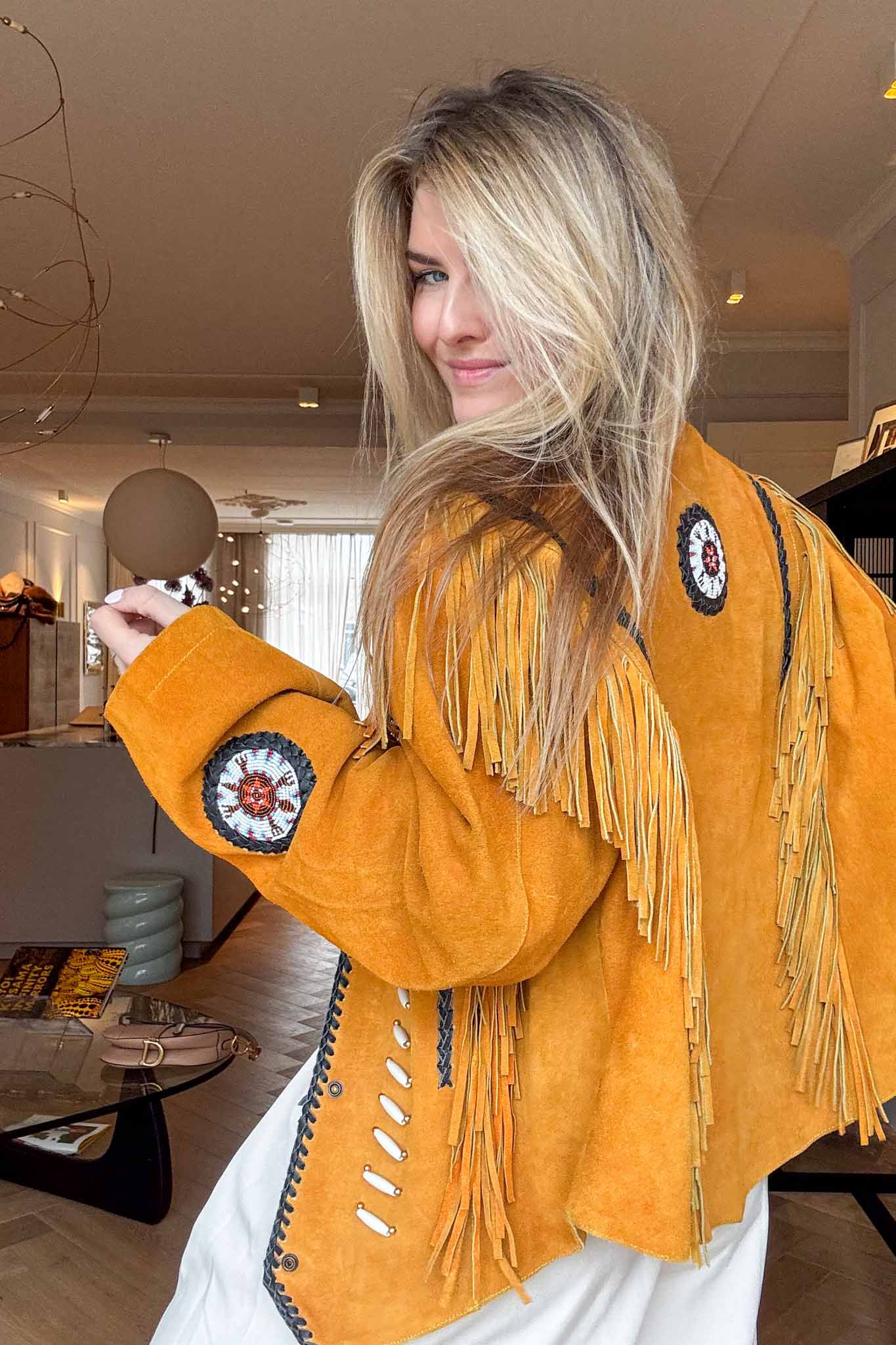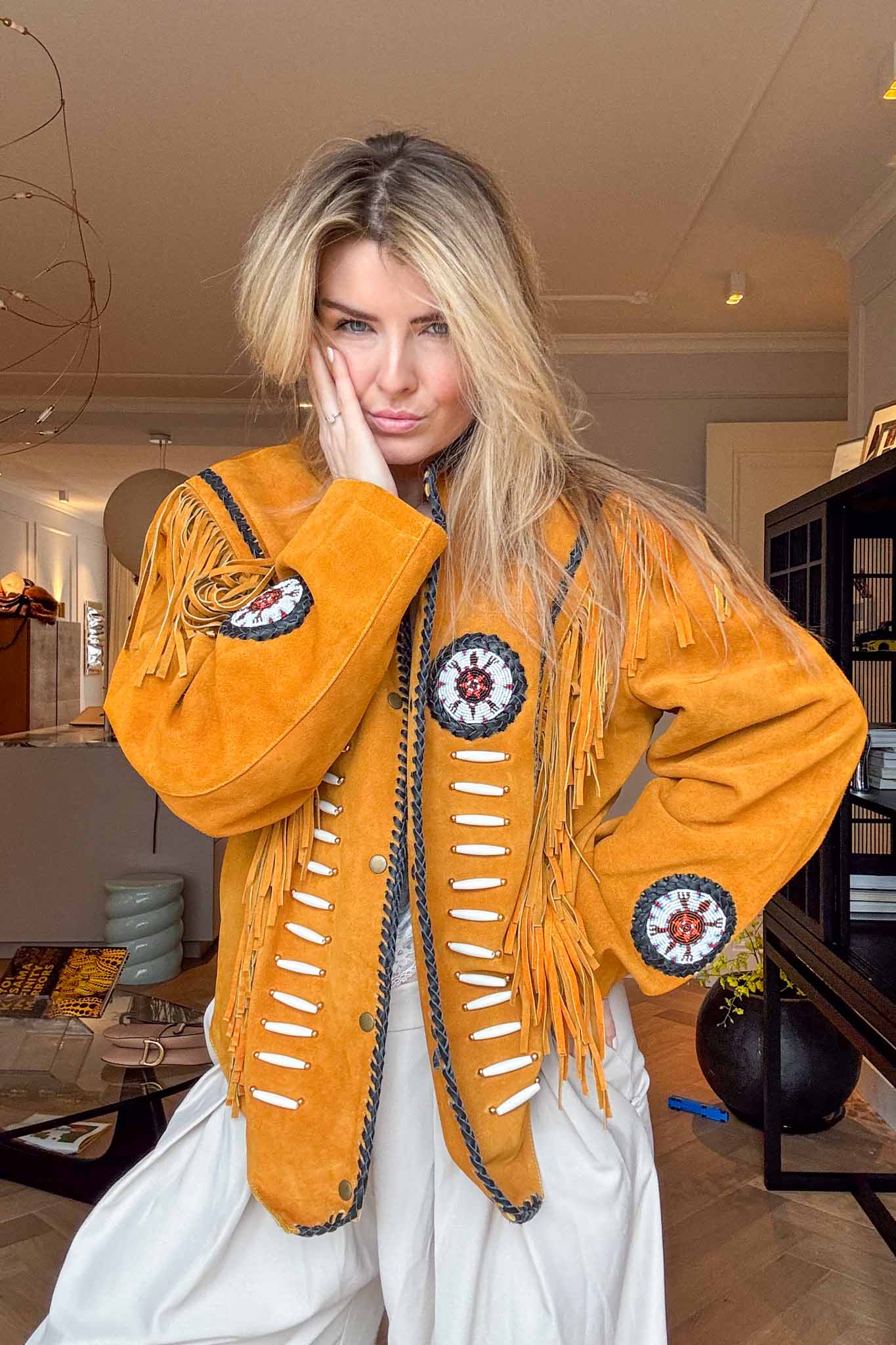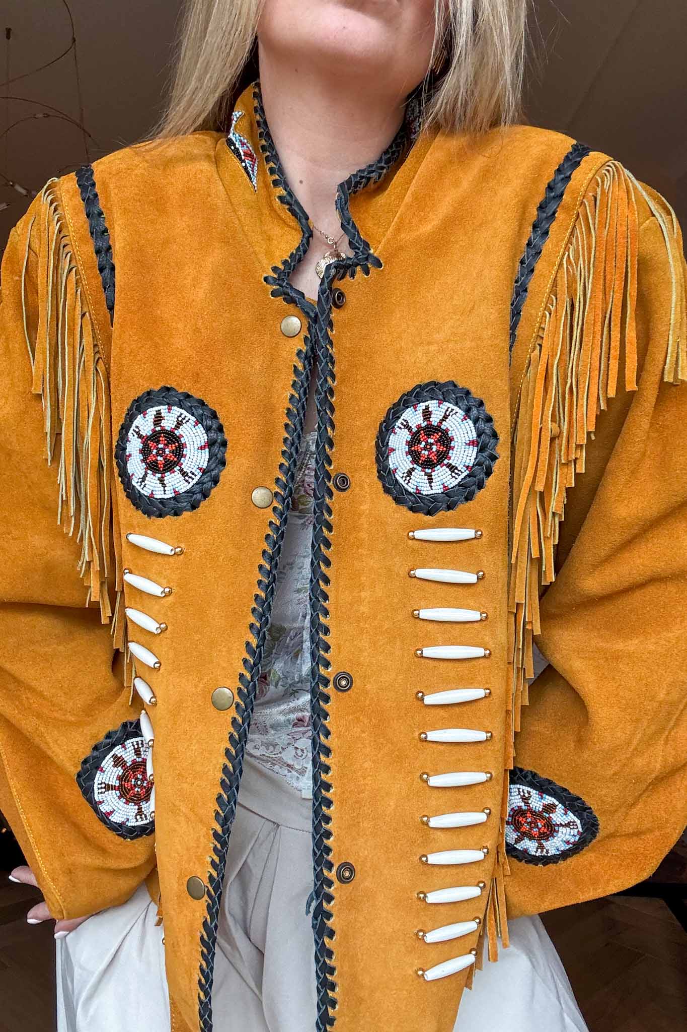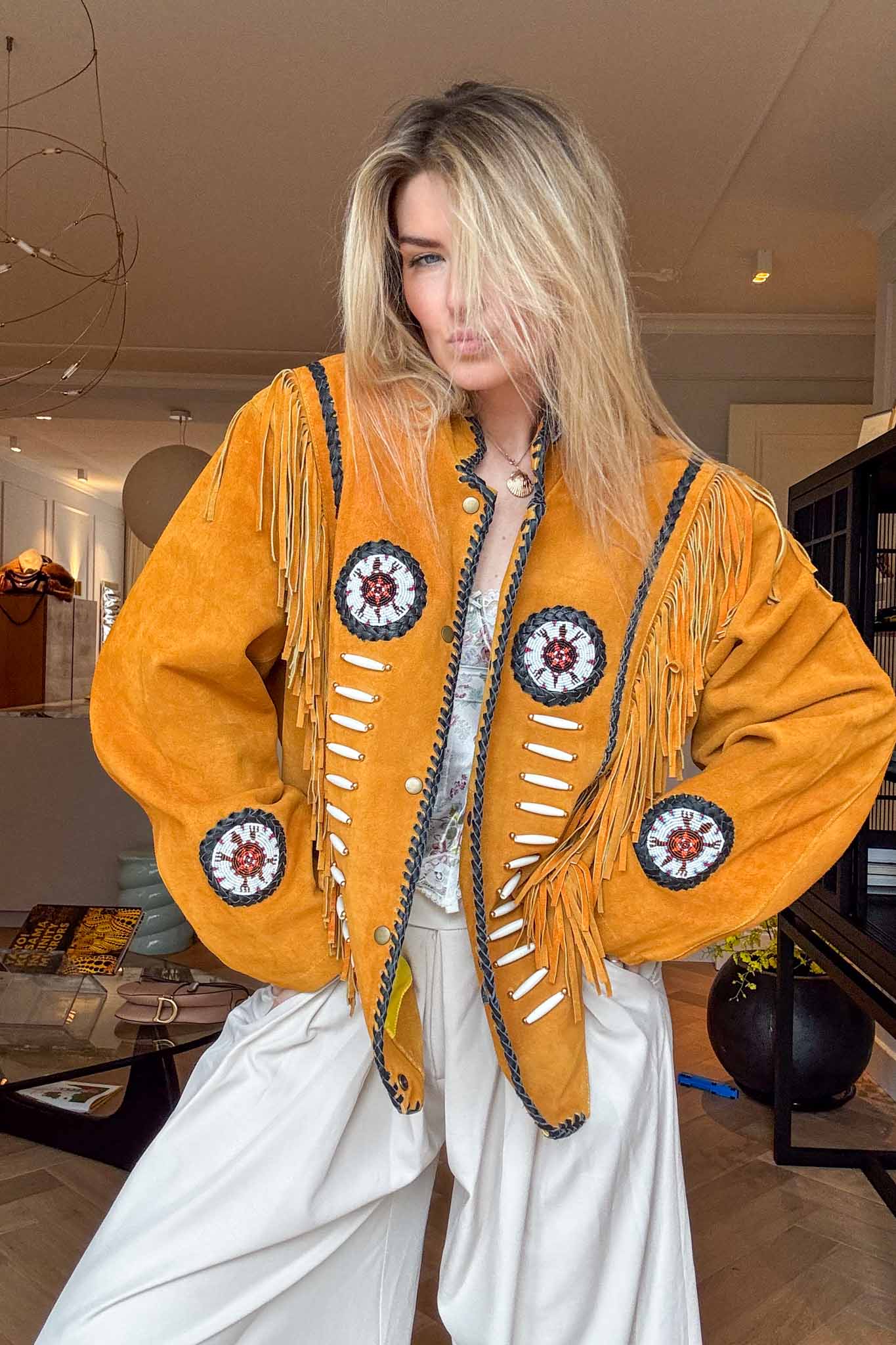 A true collector’s piece, the Desert sauvage 70s is an original 1970s suede masterpiece in a rich ochre yellow with dramatic fringe and exquisite beaded details adorned with oval pearls.