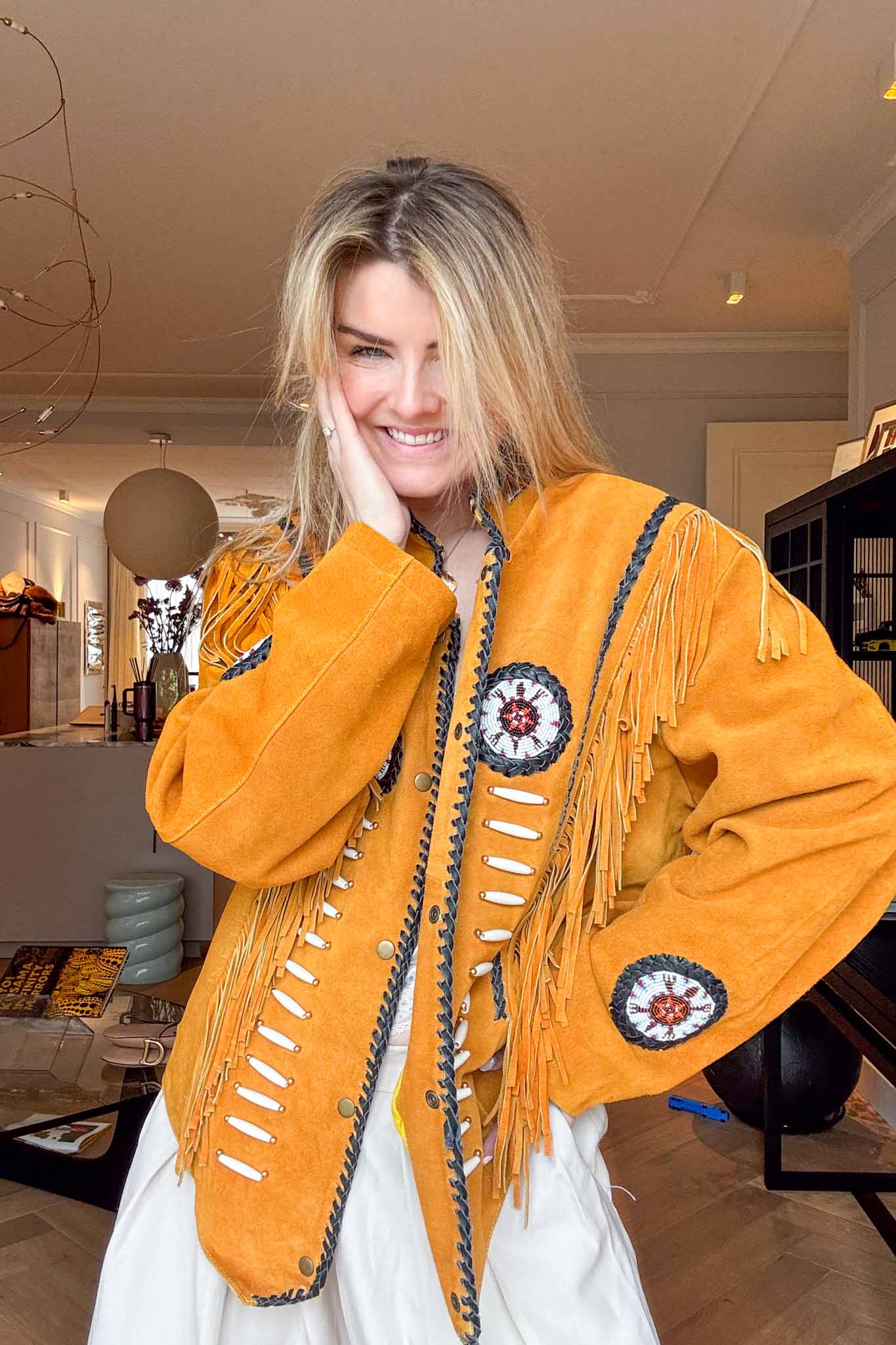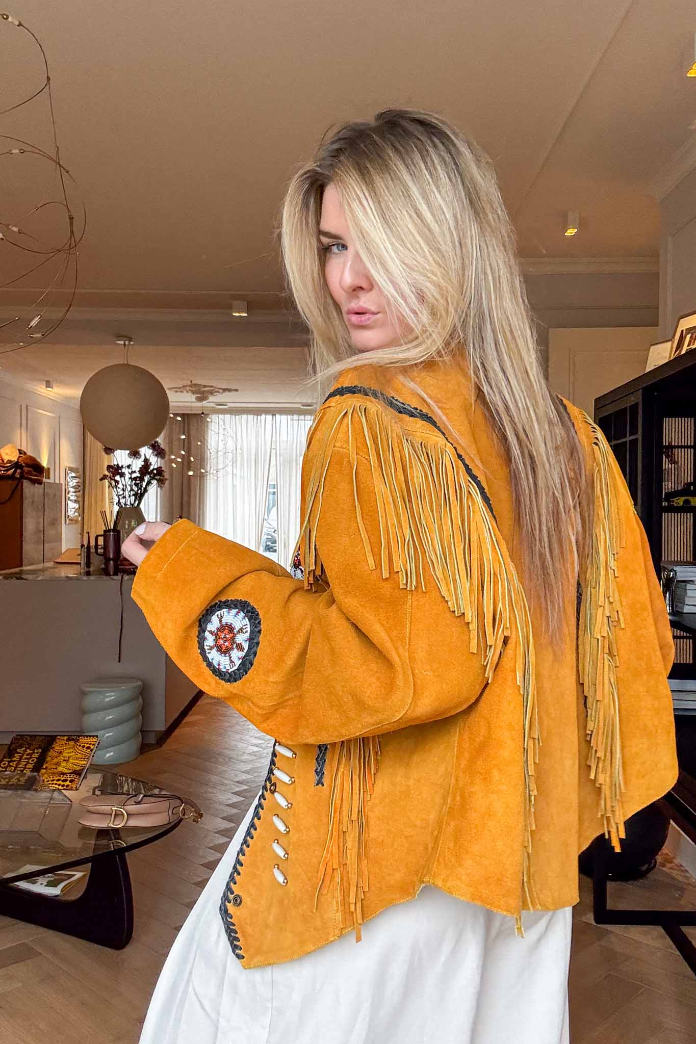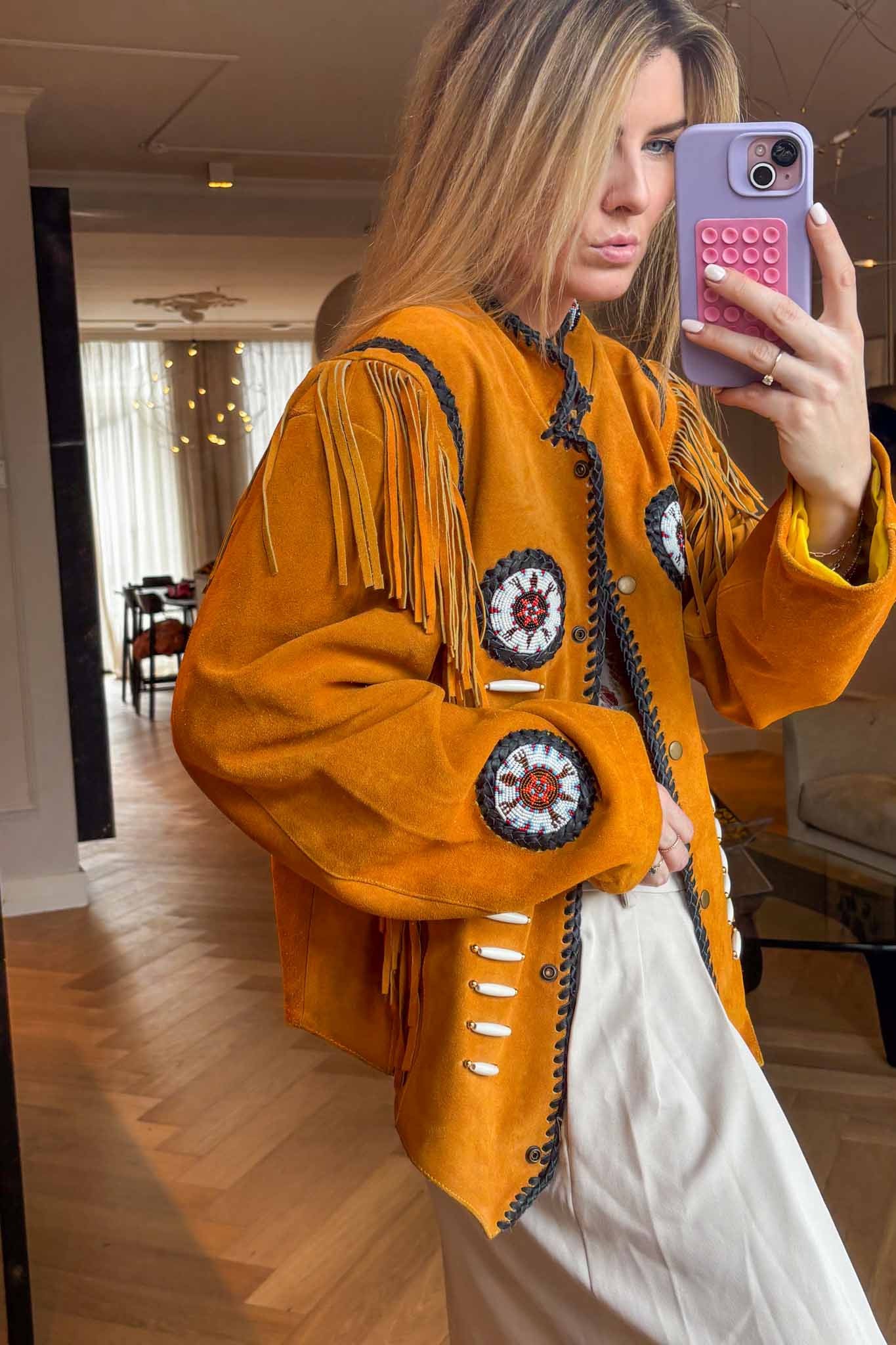 A true collector’s piece, the Desert sauvage 70s is an original 1970s suede masterpiece in a rich ochre yellow with dramatic fringe and exquisite beaded details adorned with oval pearls.