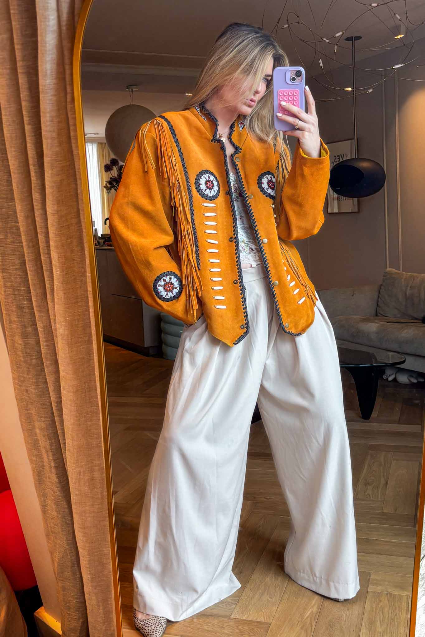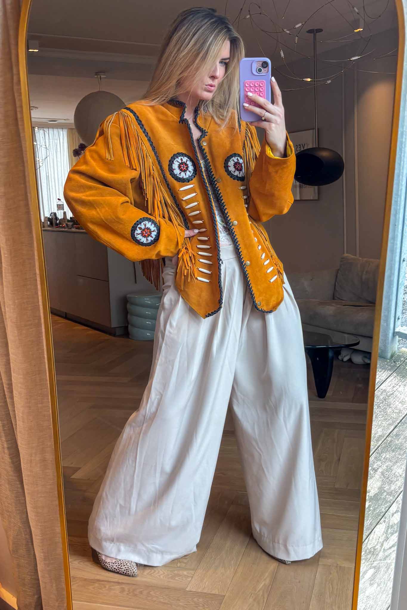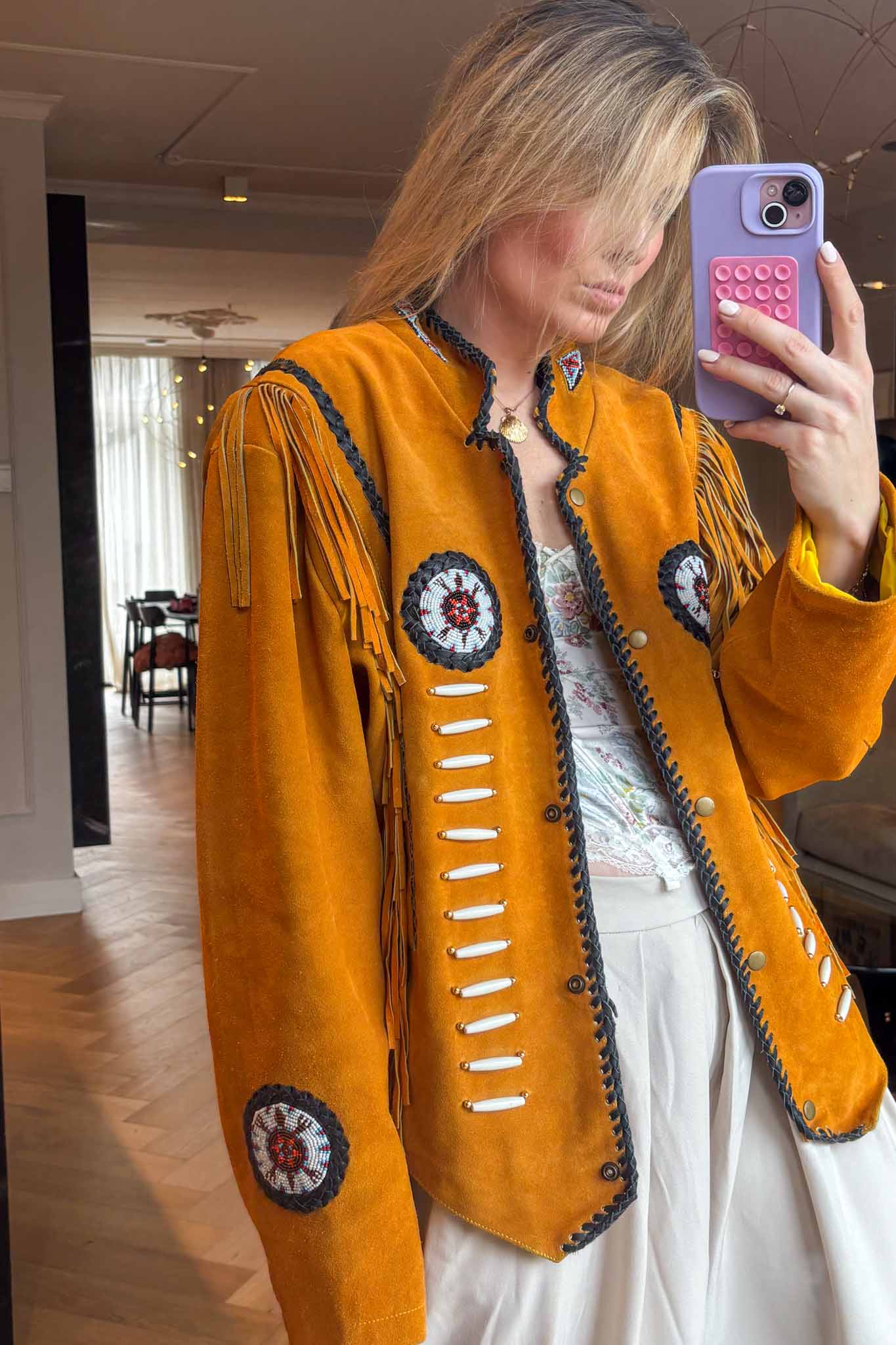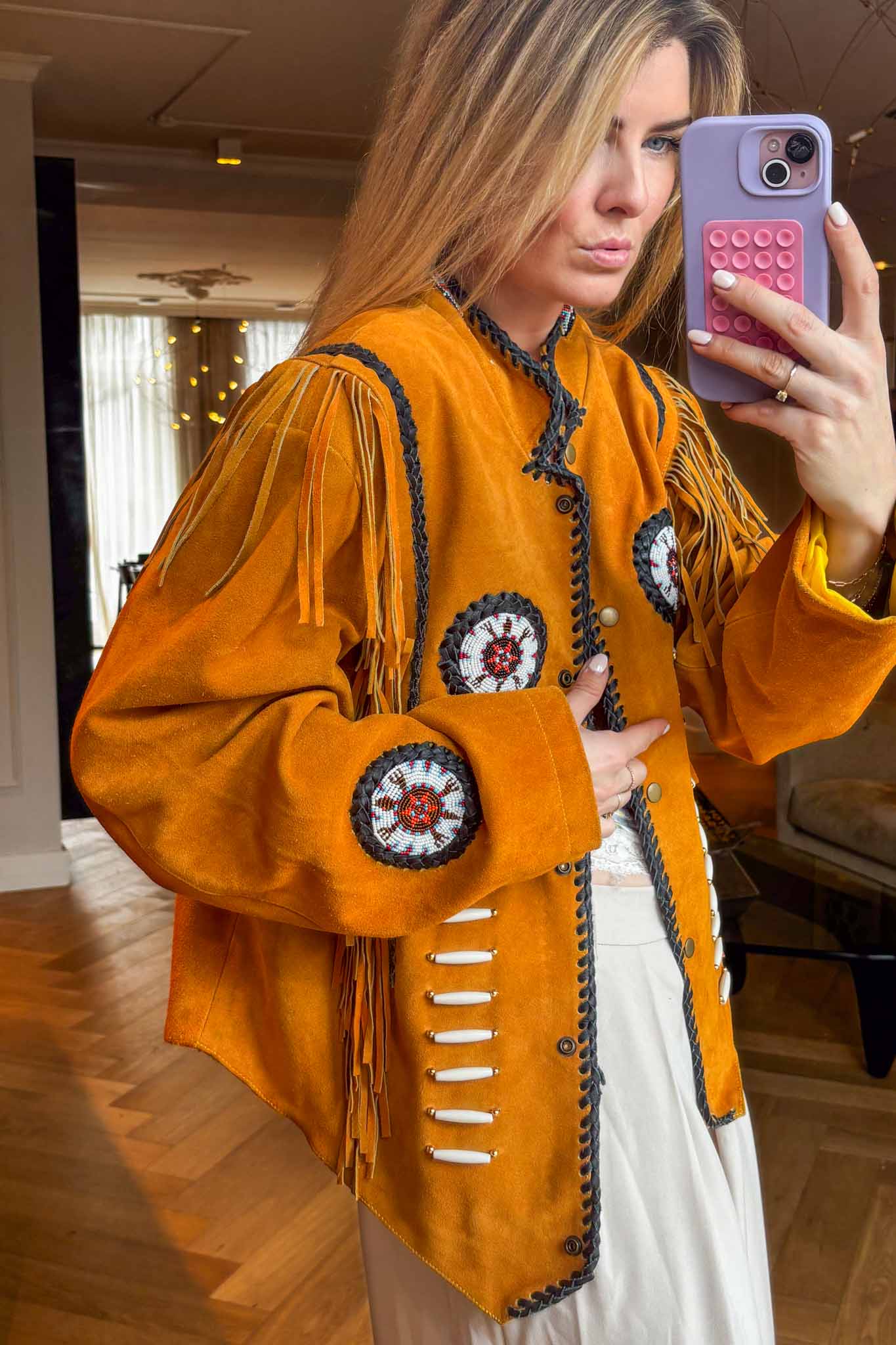 A true collector’s piece, the Desert sauvage 70s is an original 1970s suede masterpiece in a rich ochre yellow with dramatic fringe and exquisite beaded details adorned with oval pearls.
