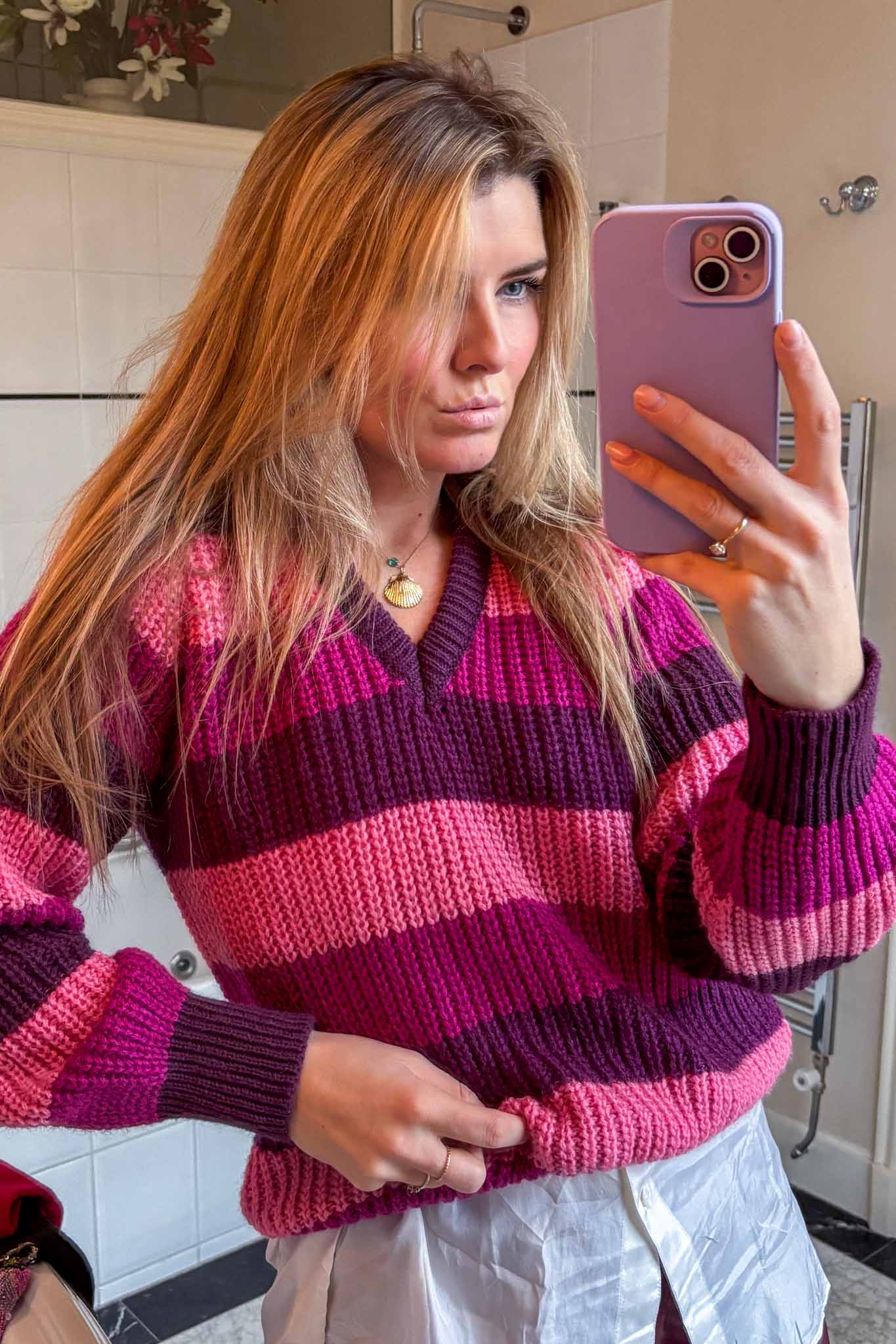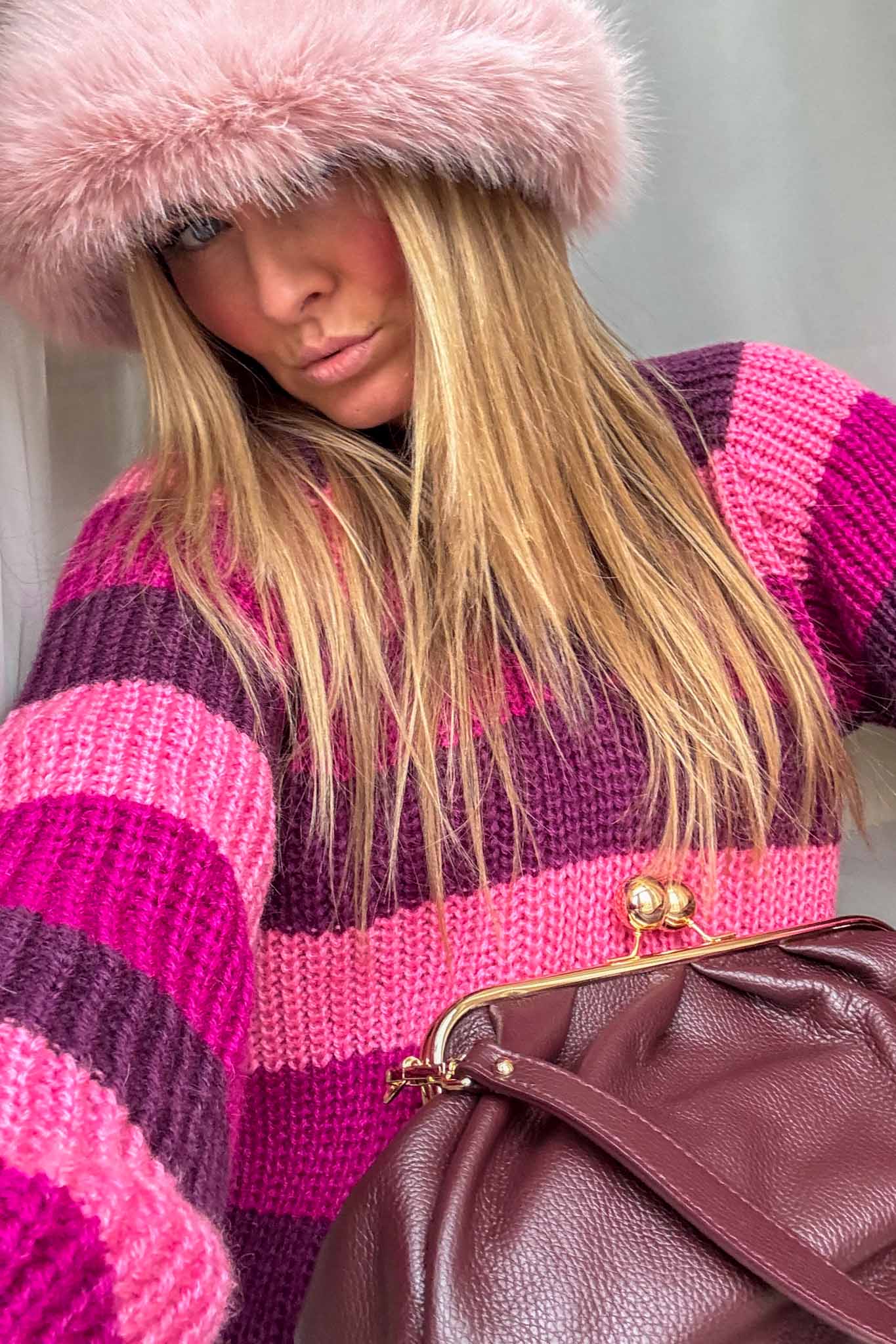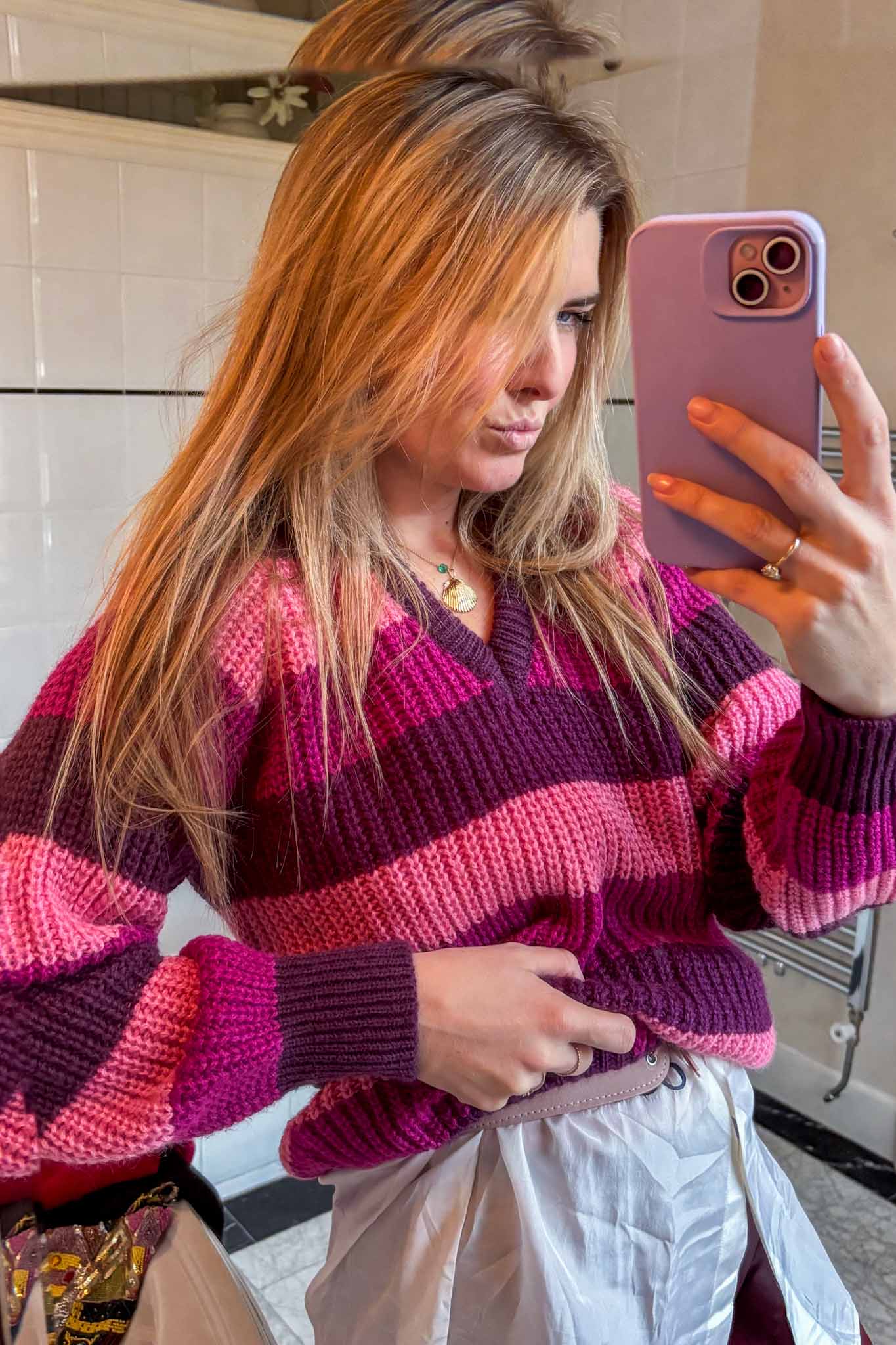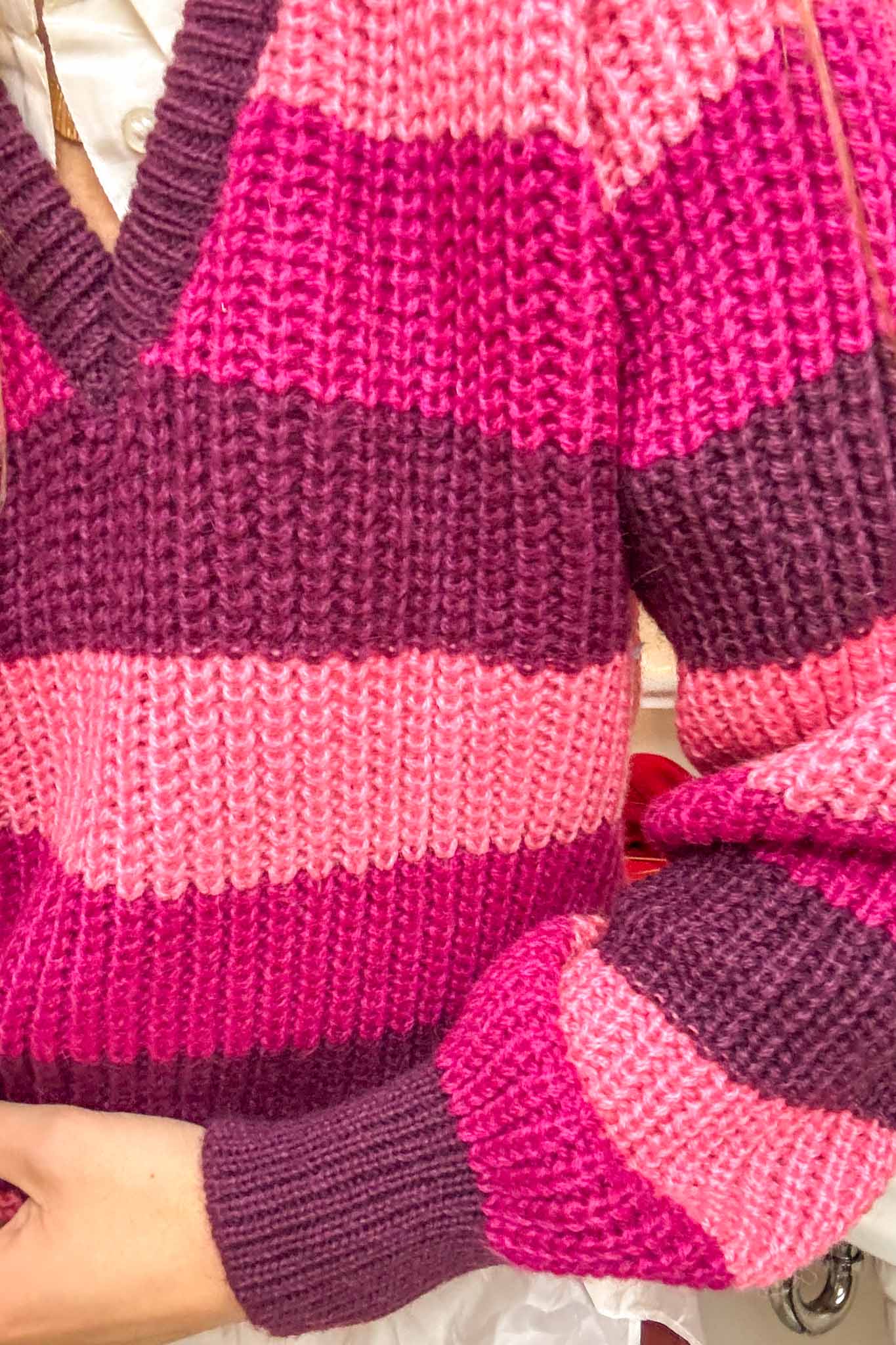 Bring a vibrant touch to your wardrobe with this hand-knitted vintage striped sweater, featuring a beautiful blend of purple, pink, and coral tones. This unique piece was handpicked in Italy and crafted from soft, breathable 100% cotton, making it the perfect colorful companion for the season.