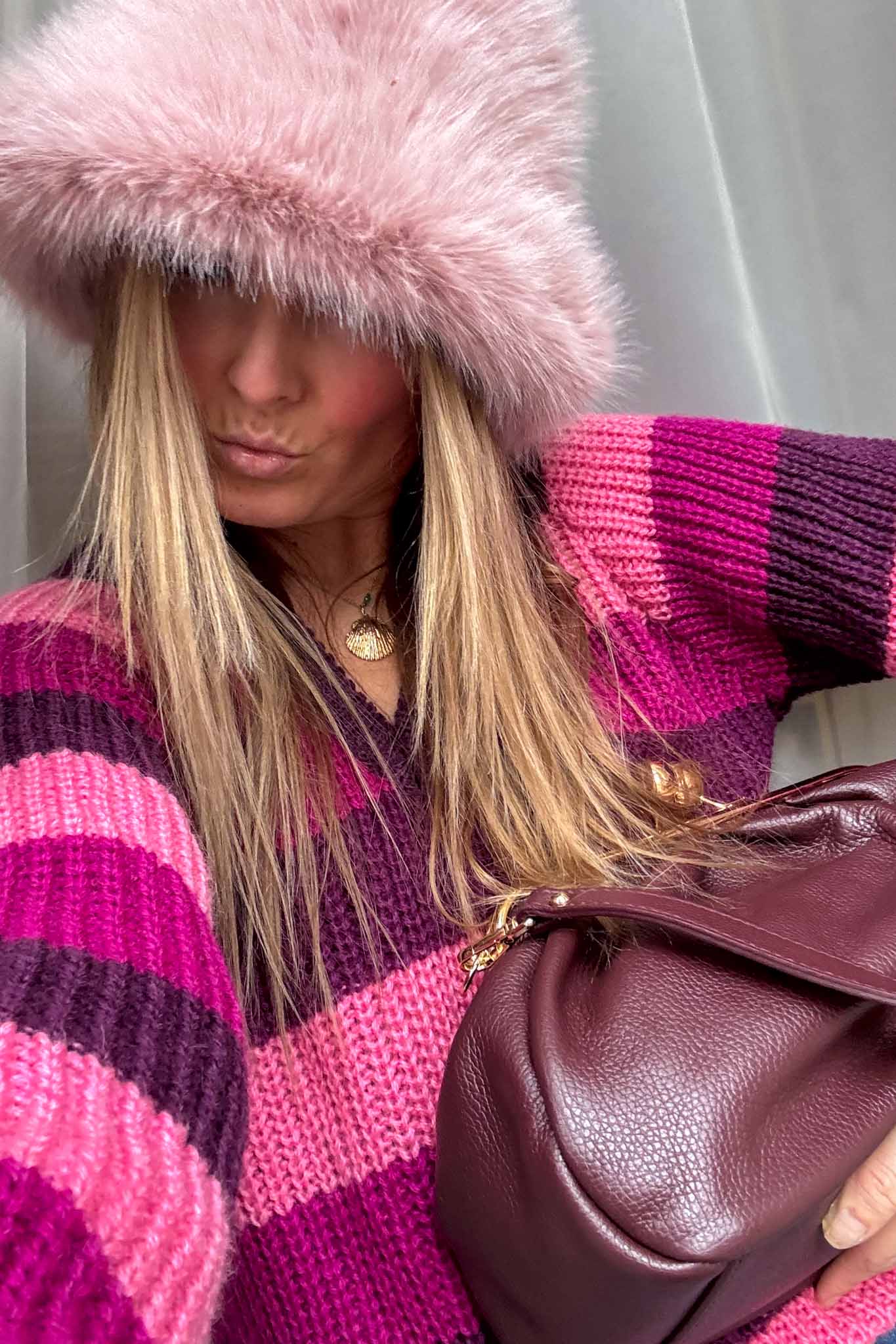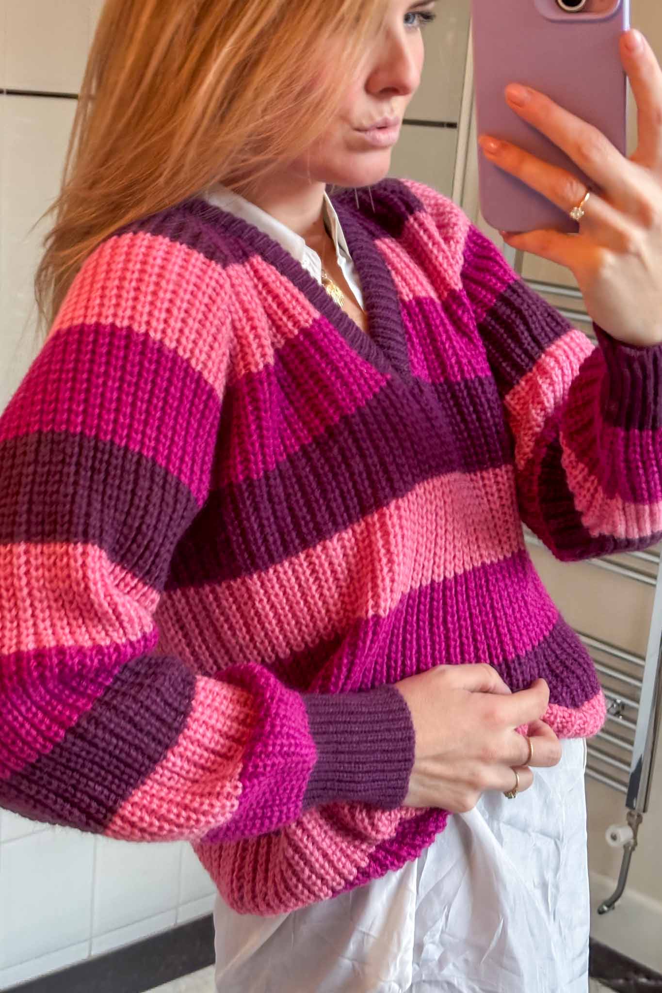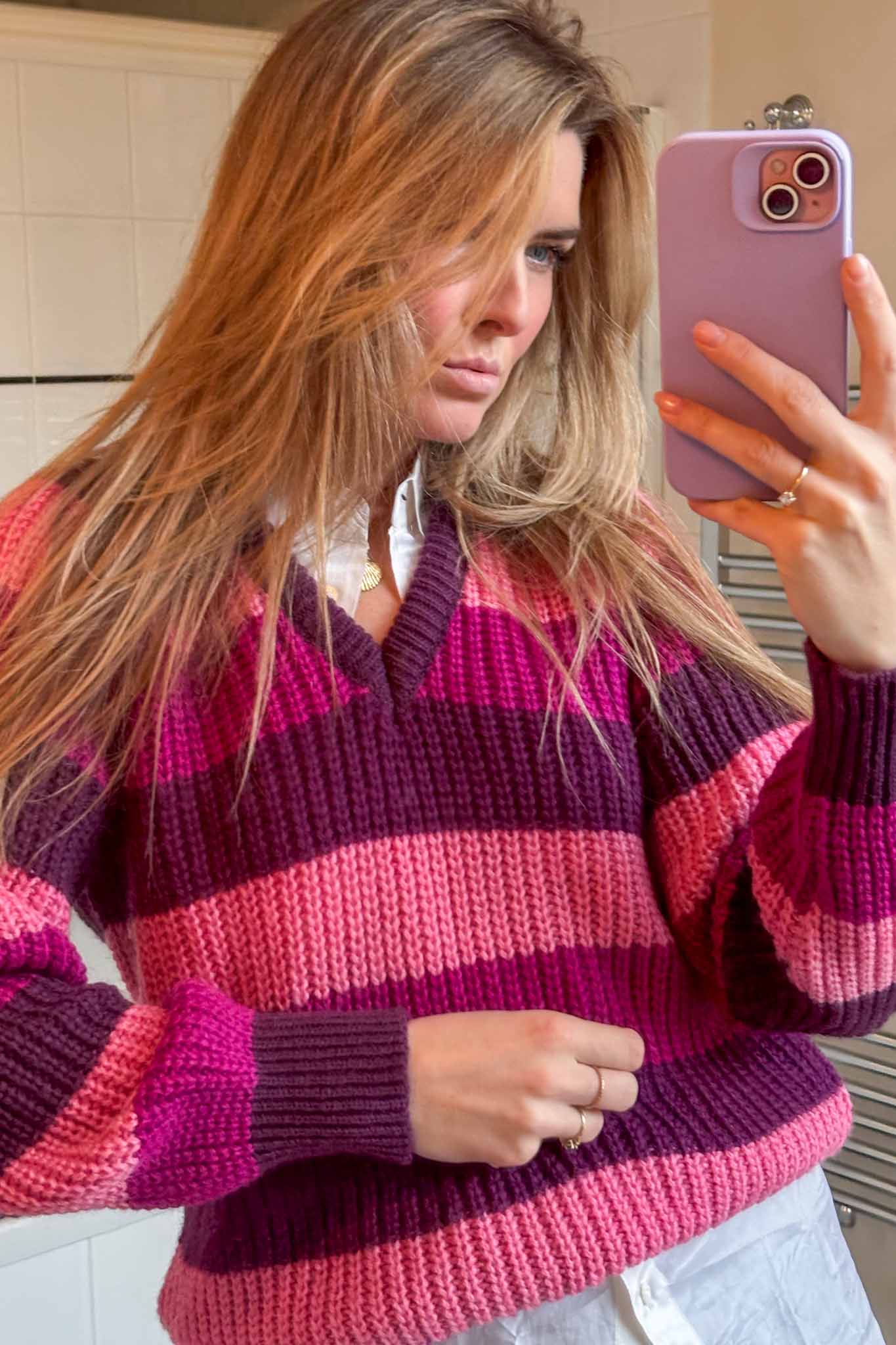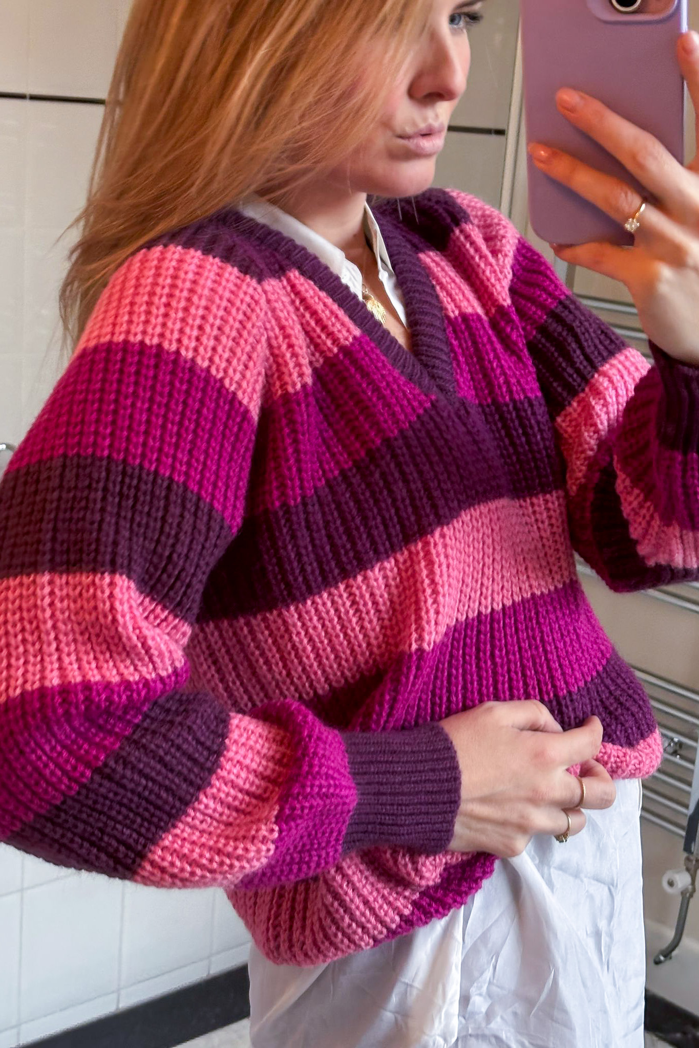 Bring a vibrant touch to your wardrobe with this hand-knitted vintage striped sweater, featuring a beautiful blend of purple, pink, and coral tones. This unique piece was handpicked in Italy and crafted from soft, breathable 100% cotton, making it the perfect colorful companion for the season.