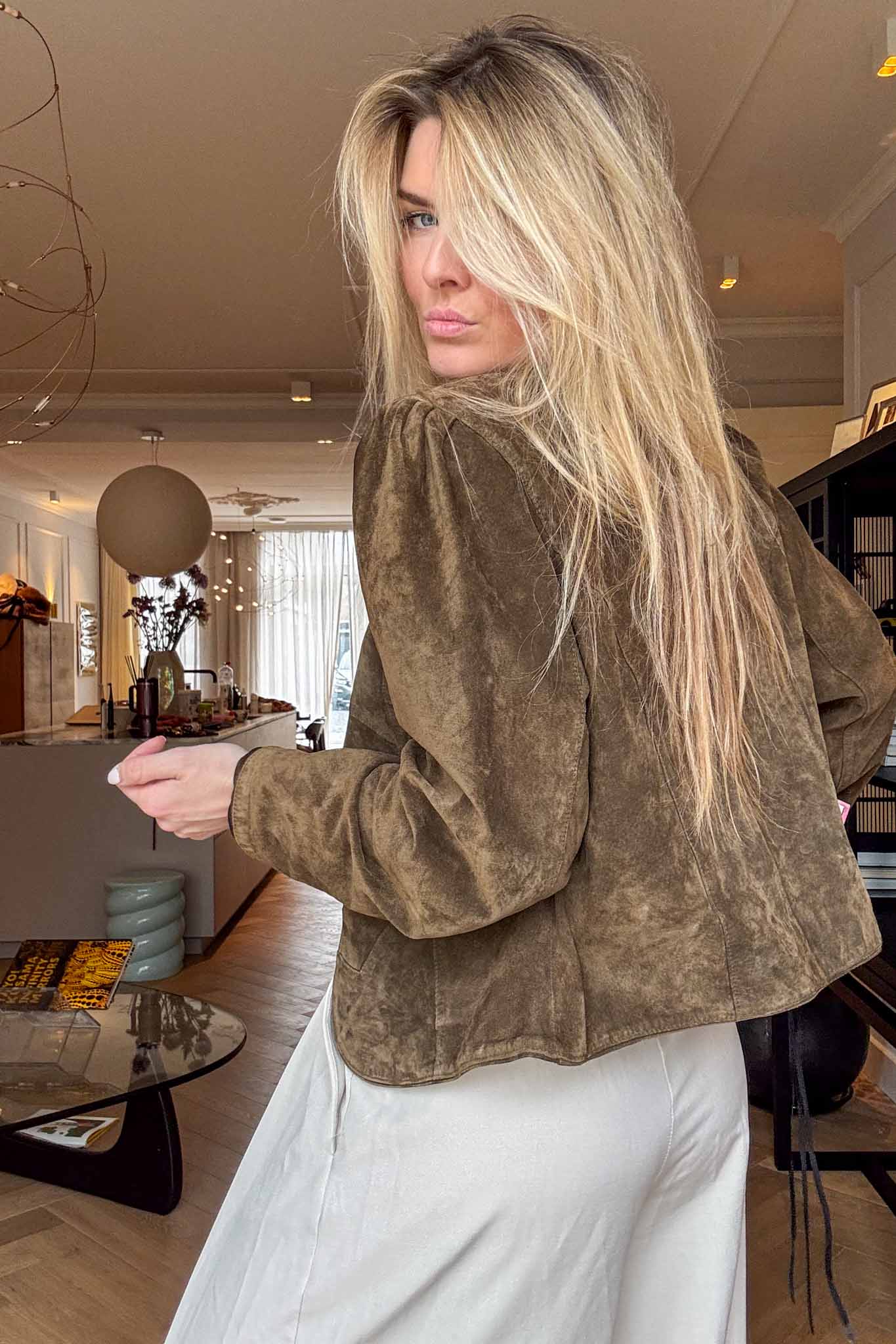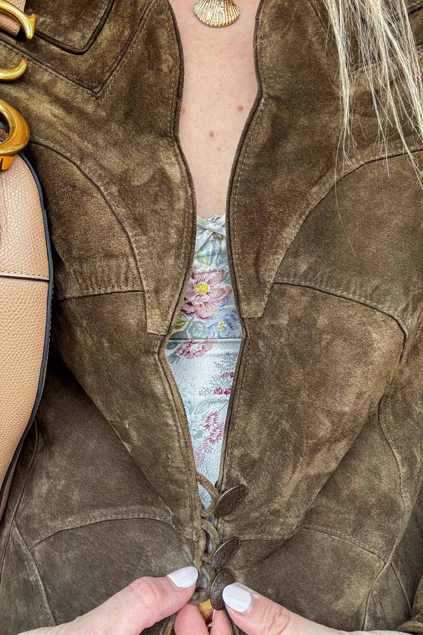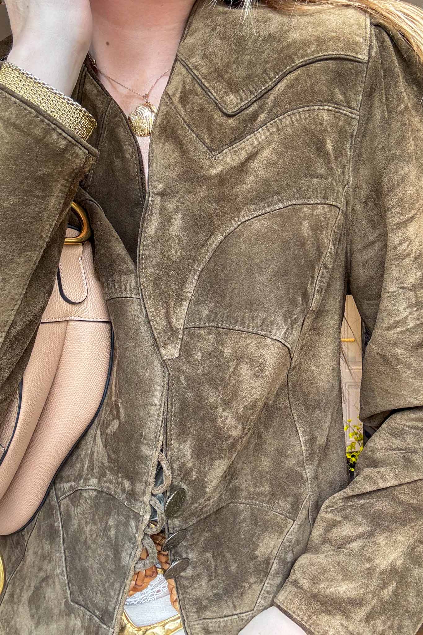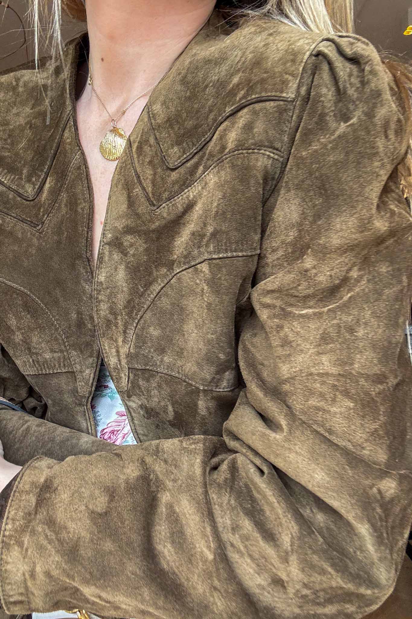 Short, structured, and effortlessly stylish, this green suede jacket features subtle relief patches that add texture without overpowering the classic silhouette. Ideal for layering over dresses or tops for a chic finish.