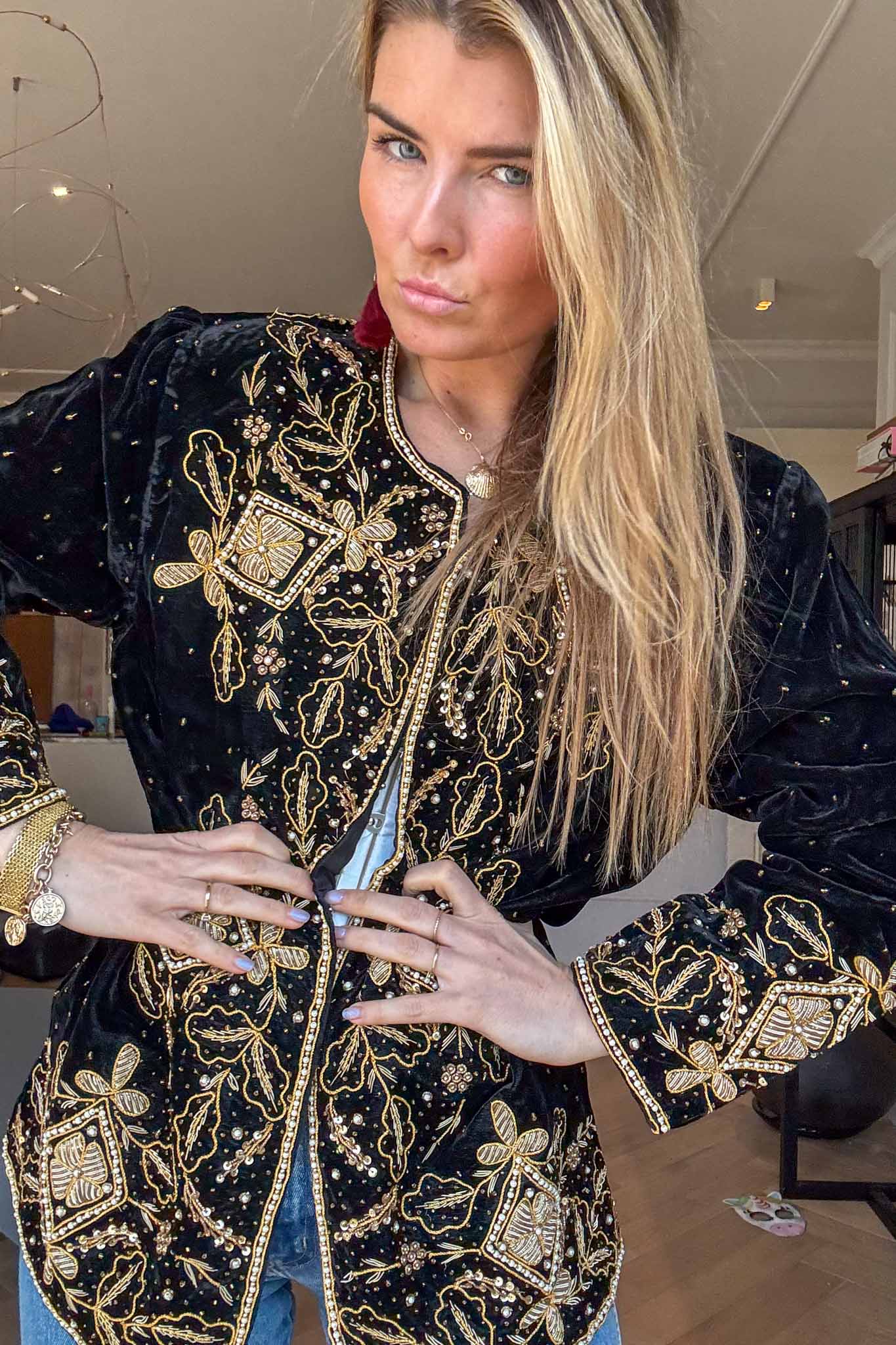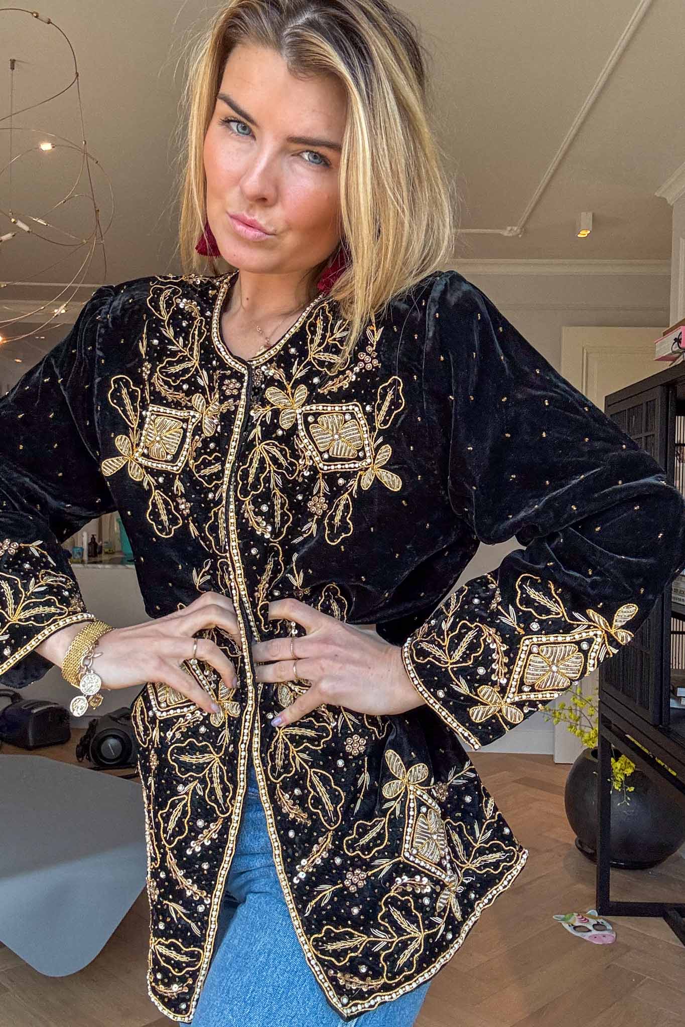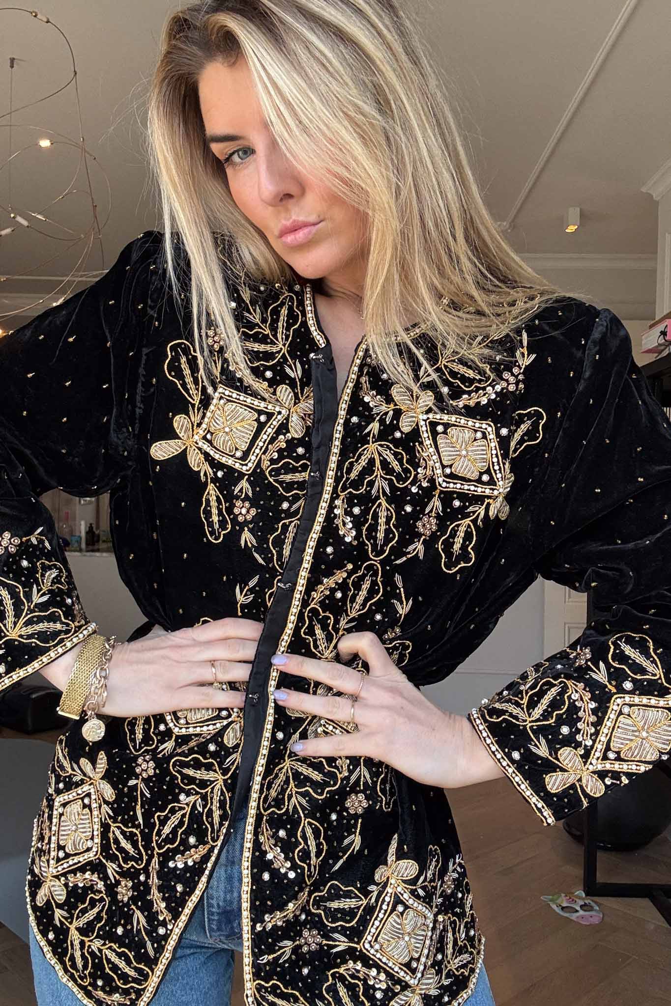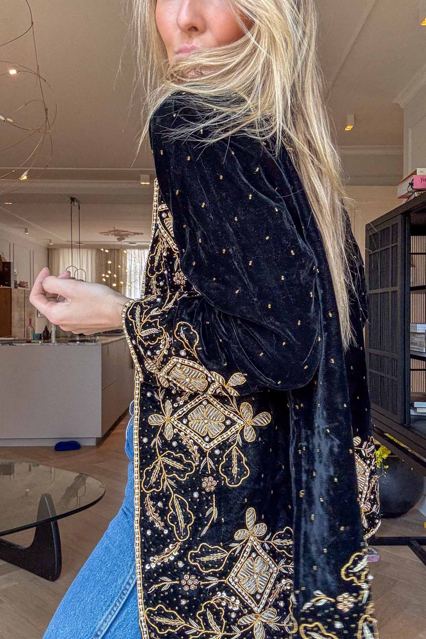 Step into timeless glamour with the Étoile du Désert – 1970s beauty velvet 70s jacket. Crafted from luxurious deep black velvet, this vintage piece is adorned with intricate, hand-sewn golden embroidery that covers the garment in stunning, meticulous detail, reflecting the rich artistry of the Middle East.