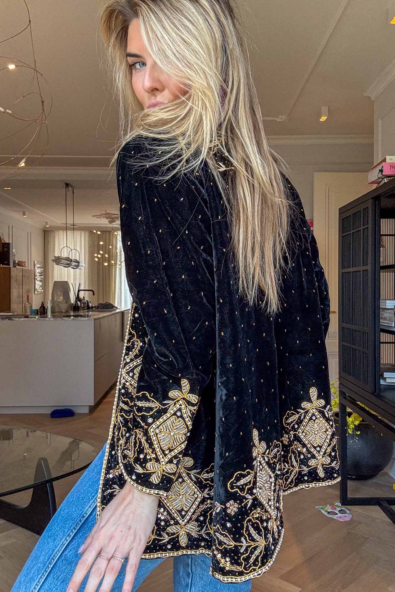 A statement of heritage, craftsmanship, and luxury, this velvet masterpiece combines rich textures, golden shimmer, and timeless vintage allure—perfect for special occasions, layering over chic modern outfits, or as a centerpiece in a curated collection.