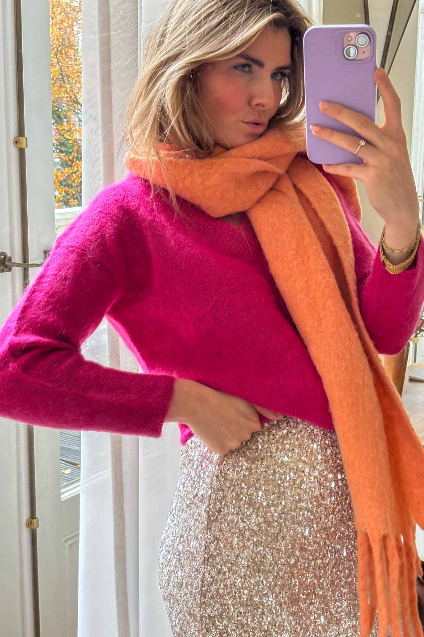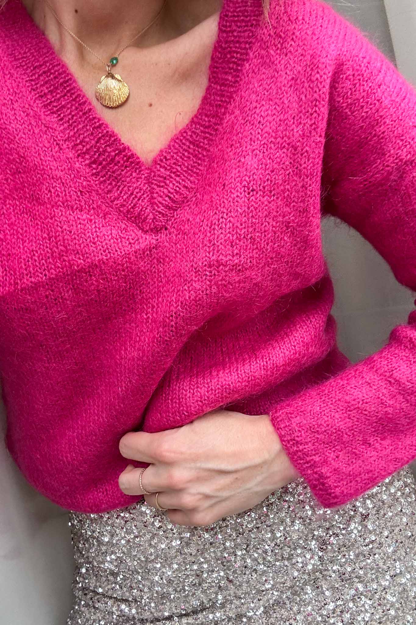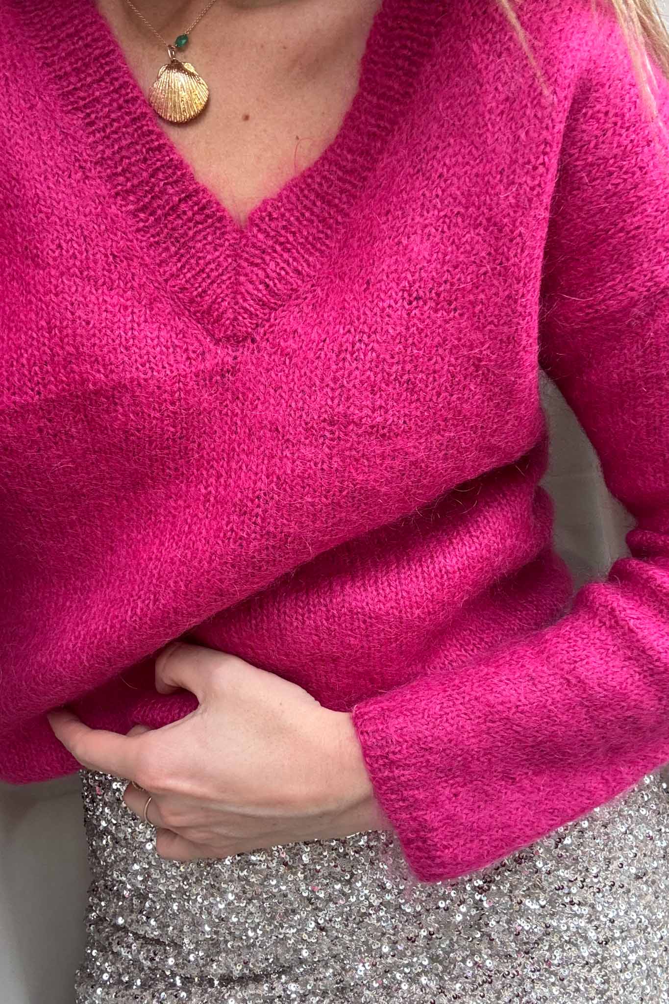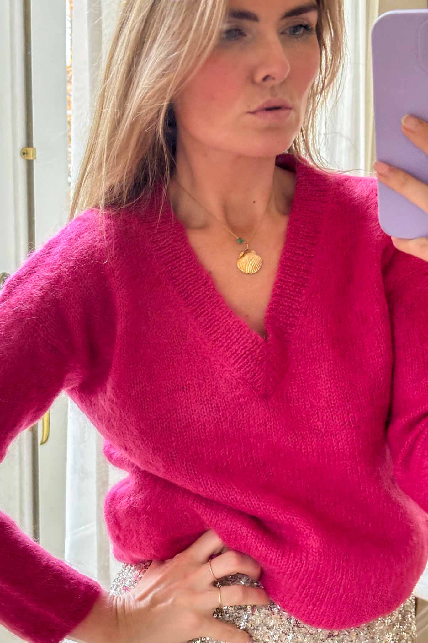 Its classic knit design makes it perfect for layering over jeans, skirts, or under jackets and coats, while the vivid fuchsia hue keeps your look fresh, fun, and effortlessly chic.