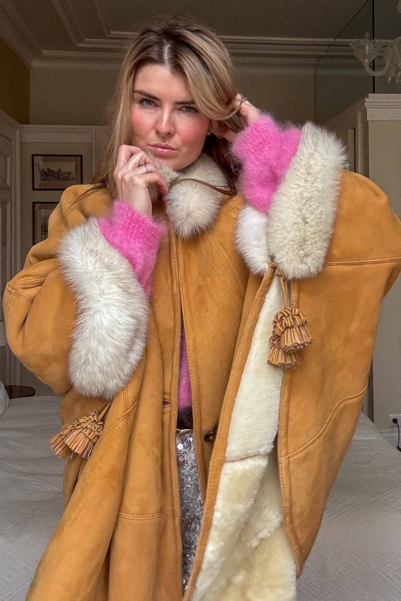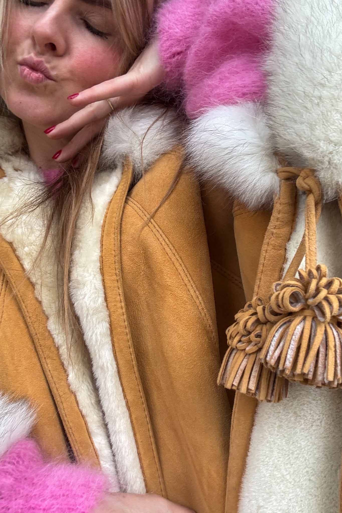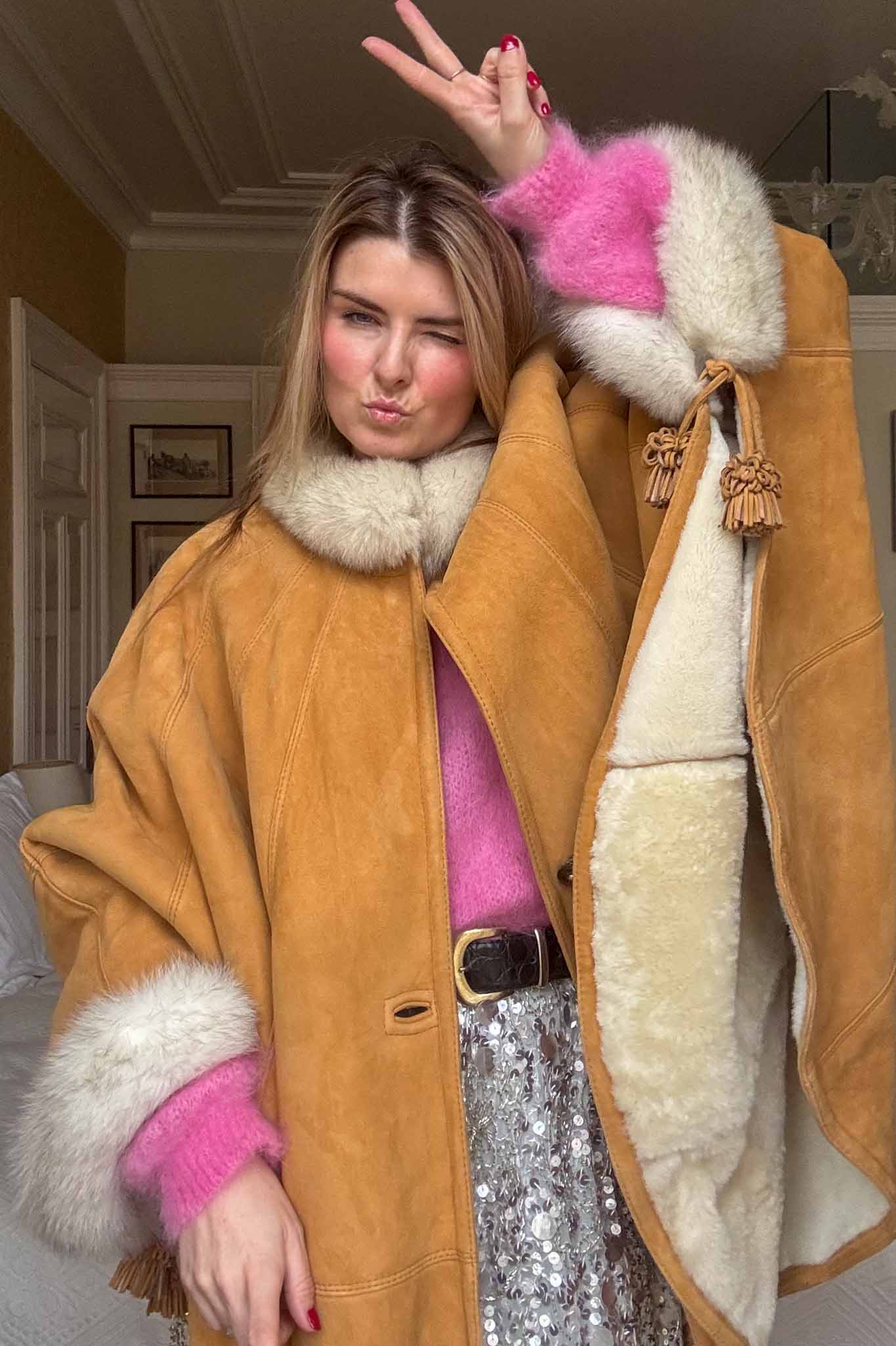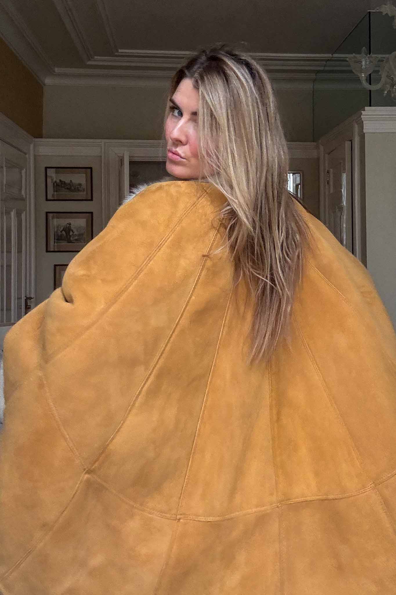 Wrap yourself in timeless Italian luxury with the La Dolce Lammy Cape. Handpicked in Italy, this vintage treasure is crafted from supple suede with a plush lammy lining that keeps you warm while exuding effortless elegance. The dramatic fur-like collar and wrist details bring the perfect touch of chic, making this cape as striking as it is cozy. We totally fell in love with the quality of this beauty, the tassels details, the lammy detailing….