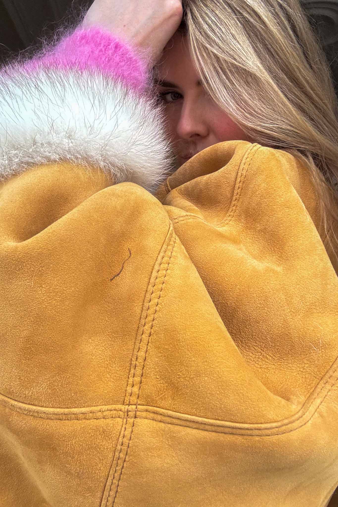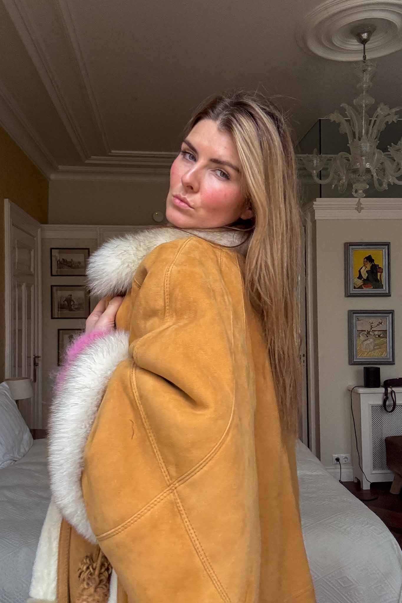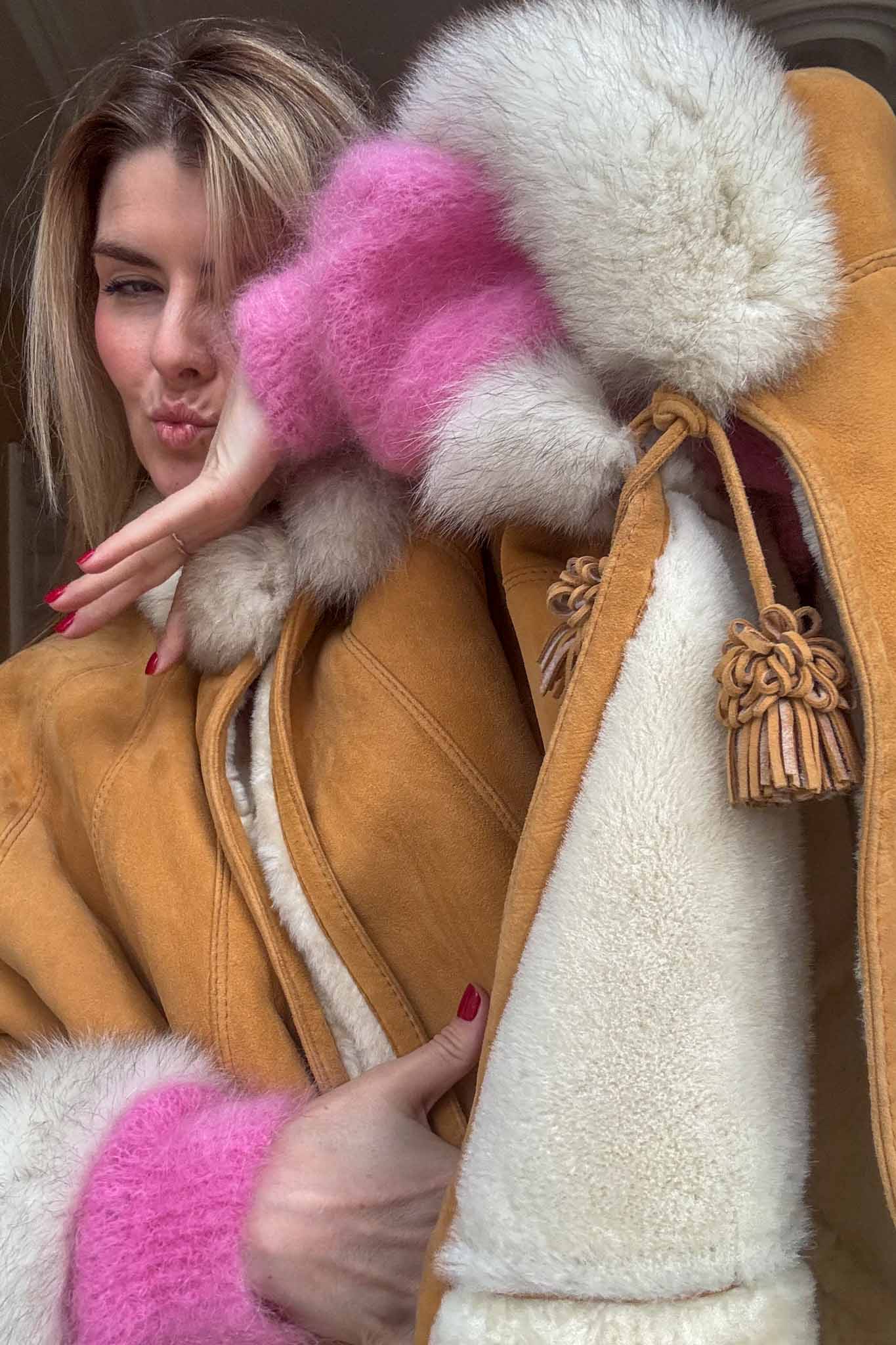 Wrap yourself in timeless Italian luxury with the La Dolce Lammy Cape. Handpicked in Italy, this vintage treasure is crafted from supple suede with a plush lammy lining that keeps you warm while exuding effortless elegance. The dramatic fur-like collar and wrist details bring the perfect touch of chic, making this cape as striking as it is cozy. We totally fell in love with the quality of this beauty, the tassels details, the lammy detailing….