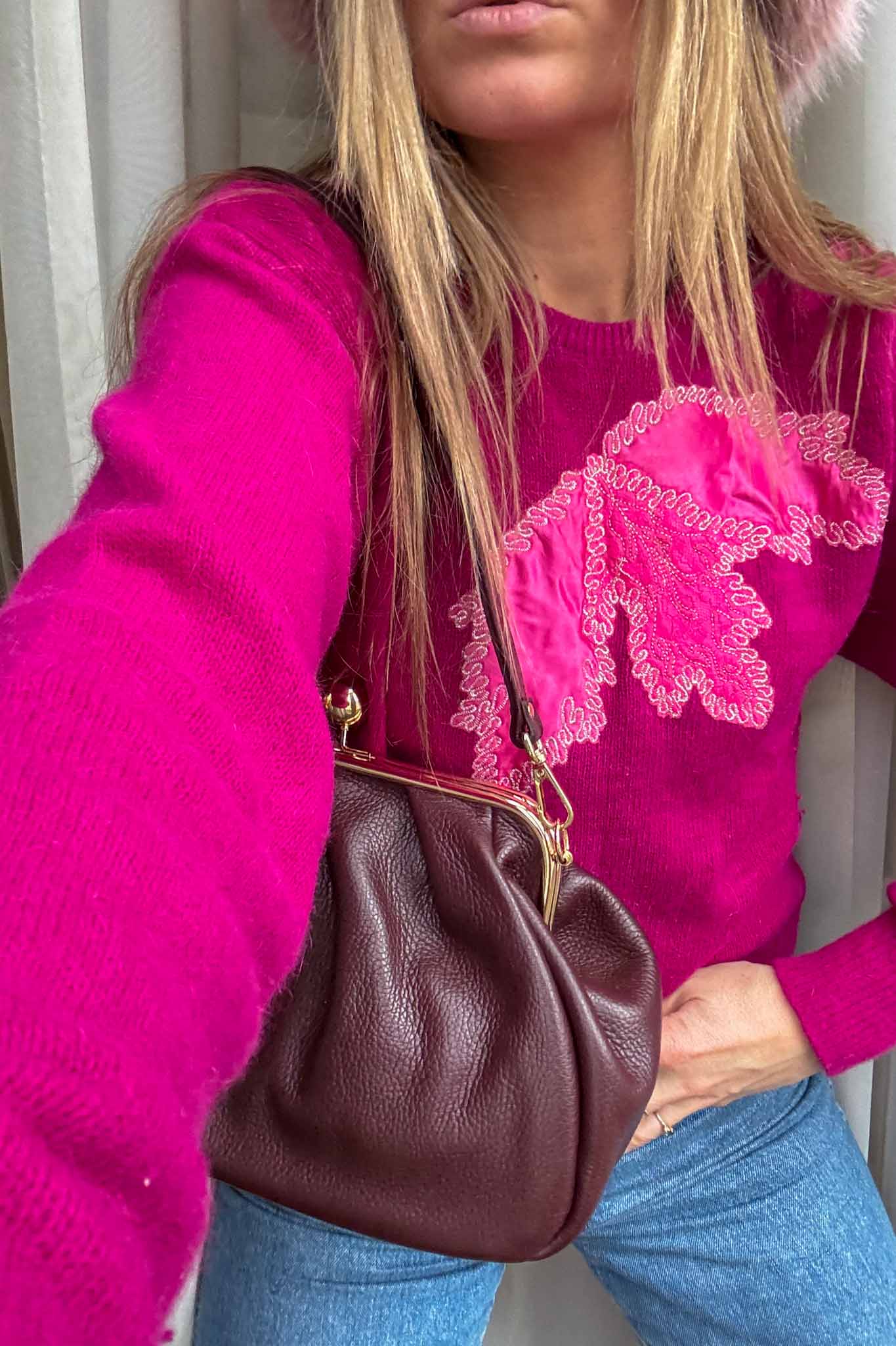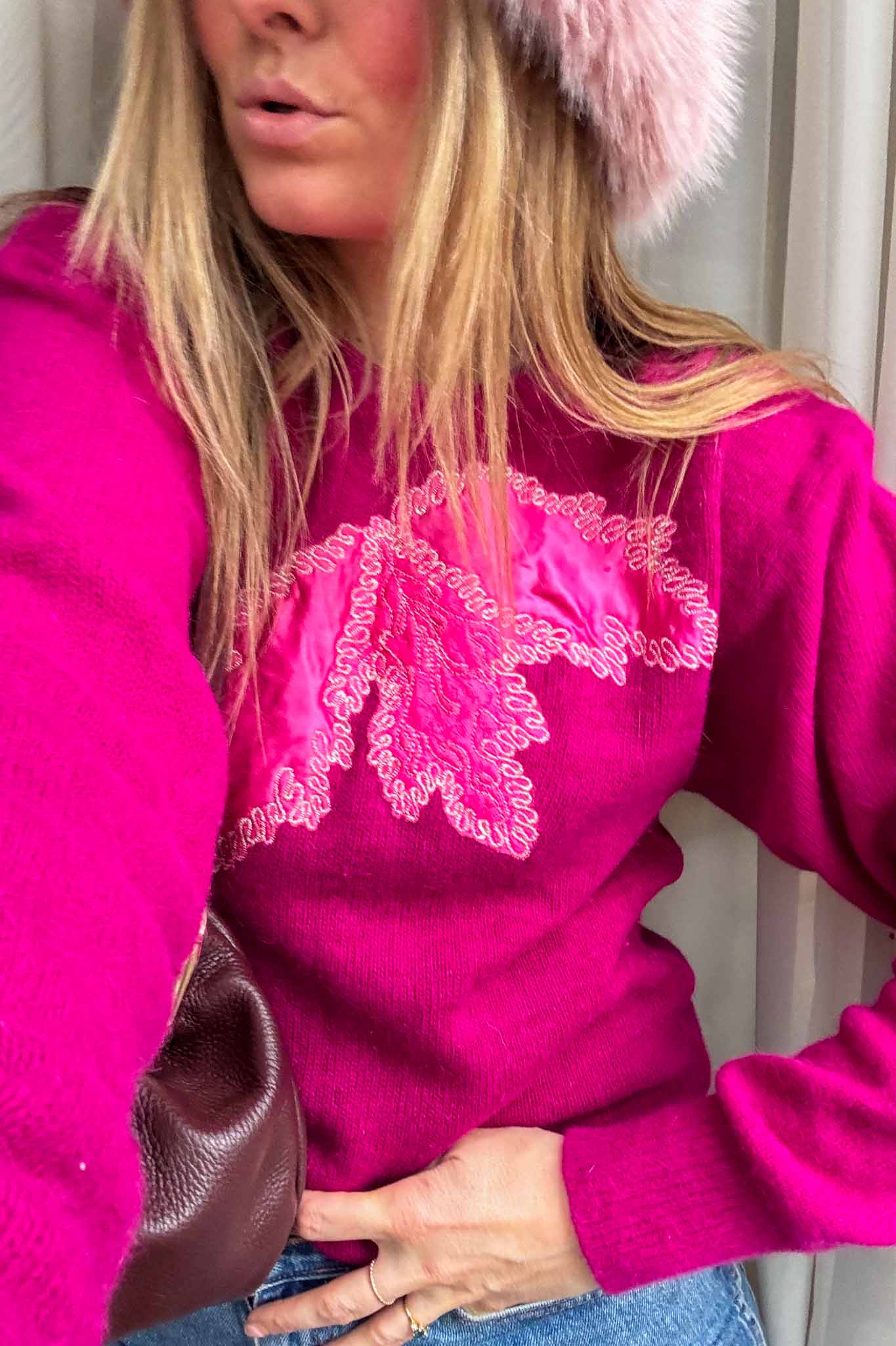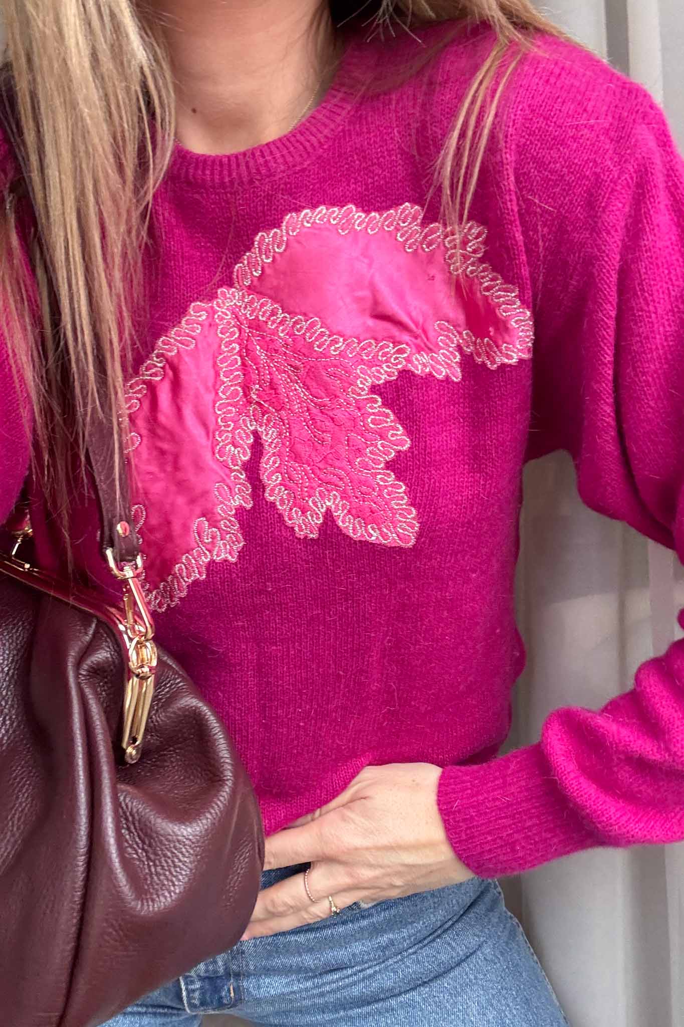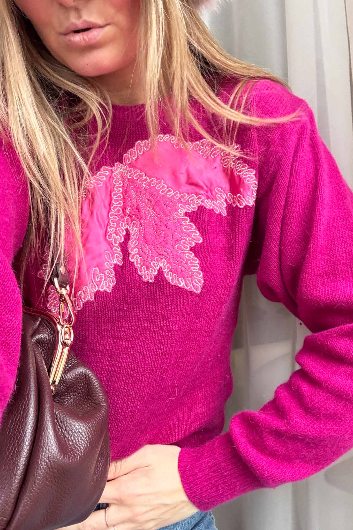 Bring a pop of color and charm to your wardrobe with this gorgeous fuchsia pink soft knit, crafted to feel incredibly soft and cozy. The standout feature is a delicate leaf-shaped detail on the front, adding a sweet, nature-inspired touch that sets this piece apart.