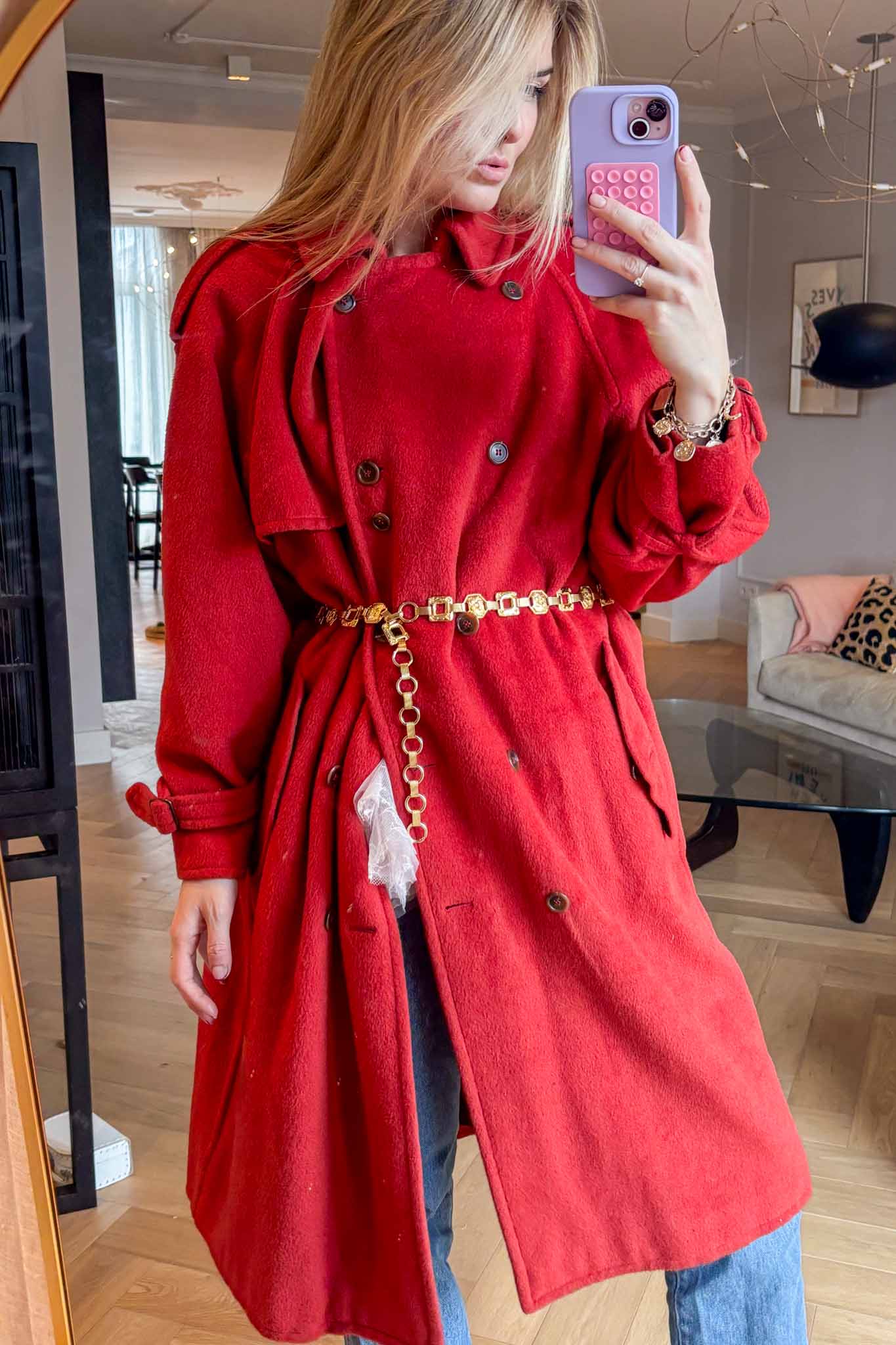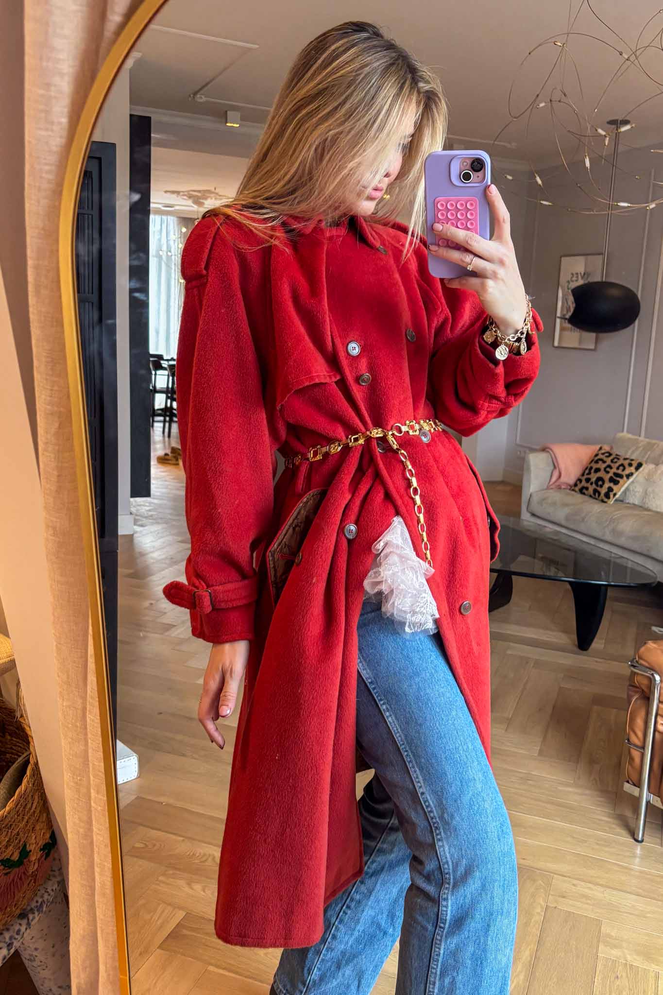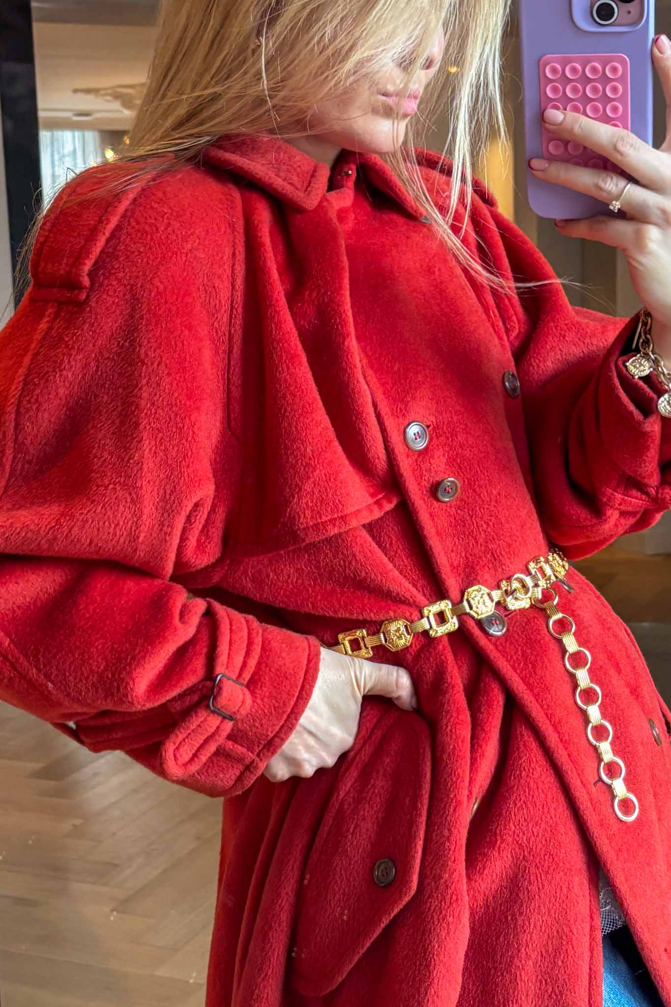 The Madame’s Military Woolen Dream Coat is a full-length, double-breasted vintage trench in a striking red. Featuring classic military-inspired details like buckled cuffs, shoulder flaps, and breast flap pockets, it can be worn open or closed, adding instant elegance and authority to any look.