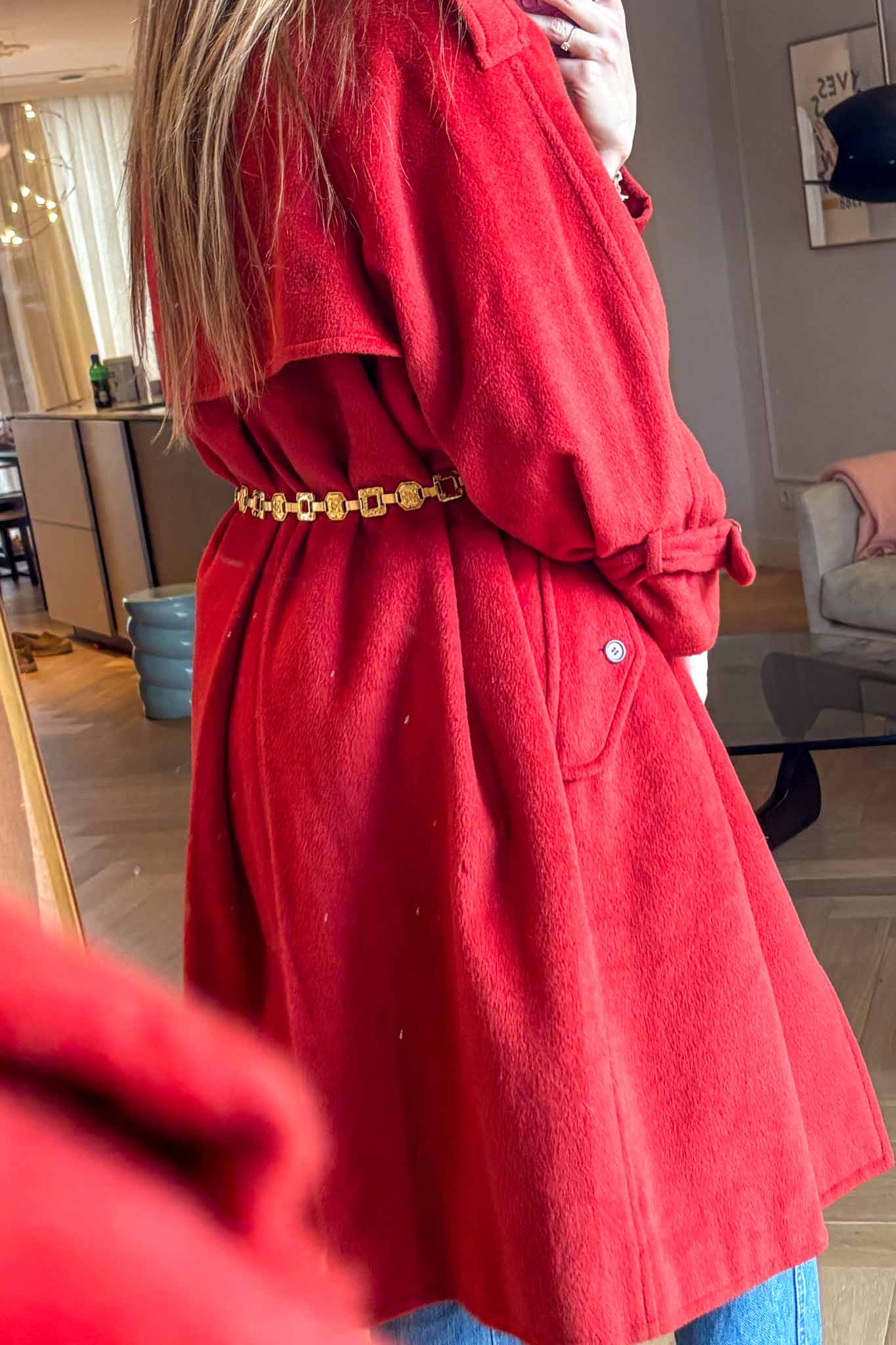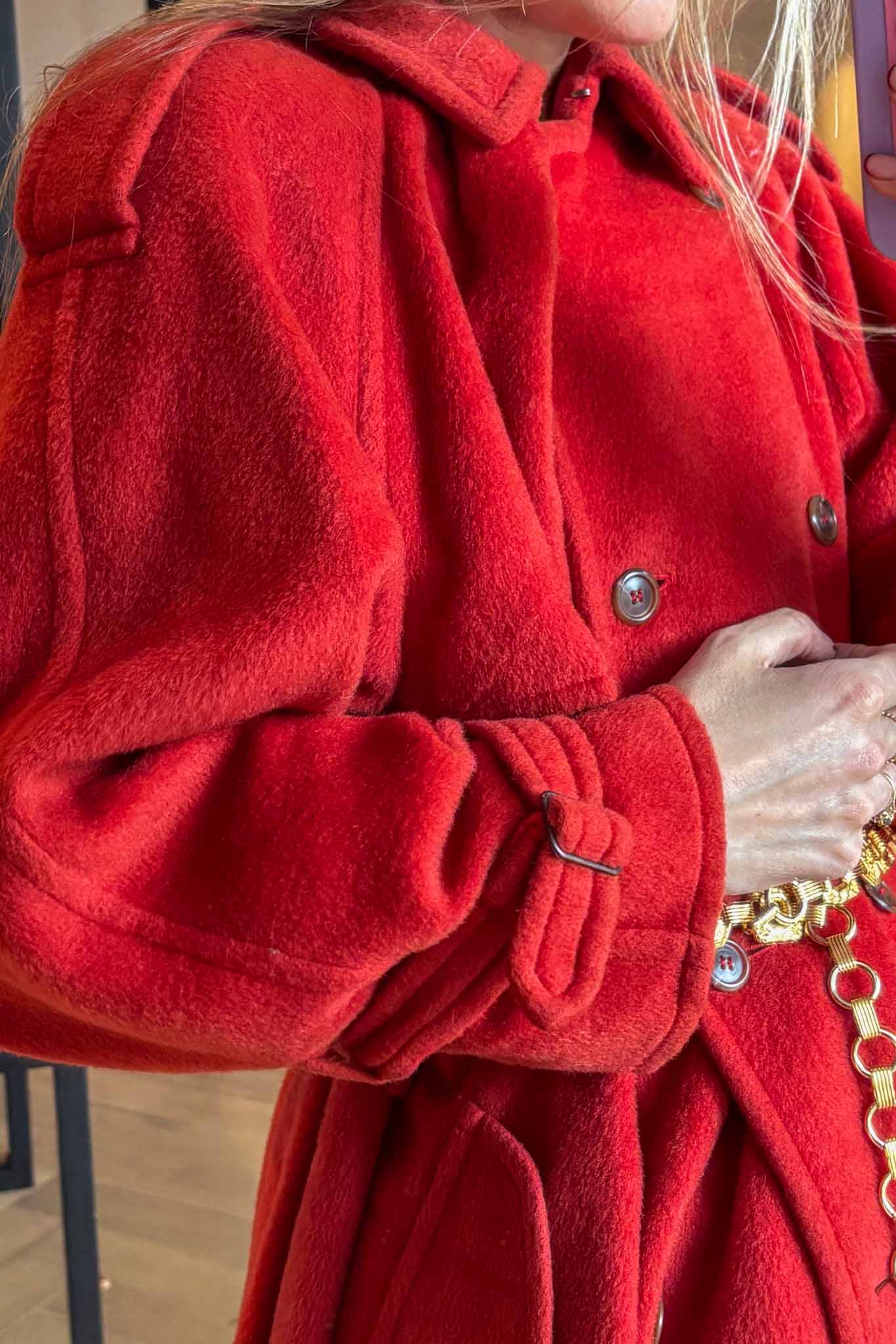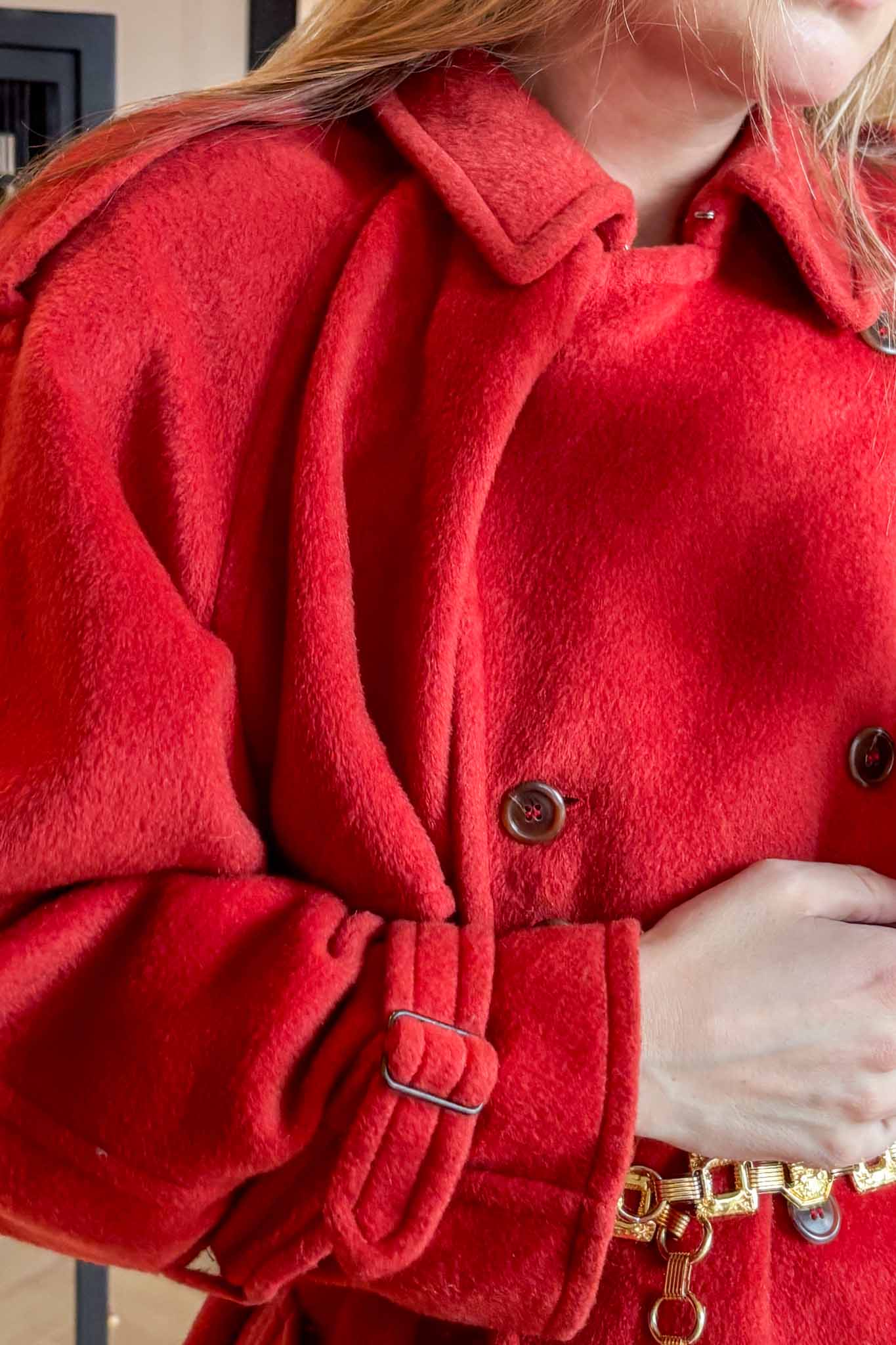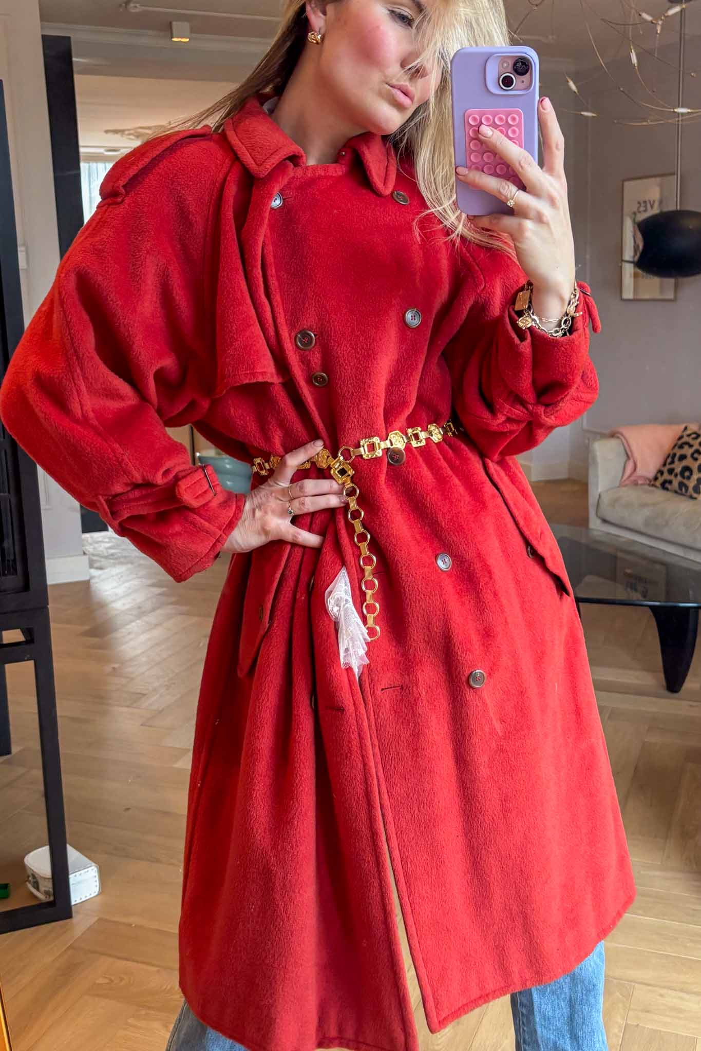 The Madame’s Military Woolen Dream Coat is a full-length, double-breasted vintage trench in a striking red. Featuring classic military-inspired details like buckled cuffs, shoulder flaps, and breast flap pockets, it can be worn open or closed, adding instant elegance and authority to any look.