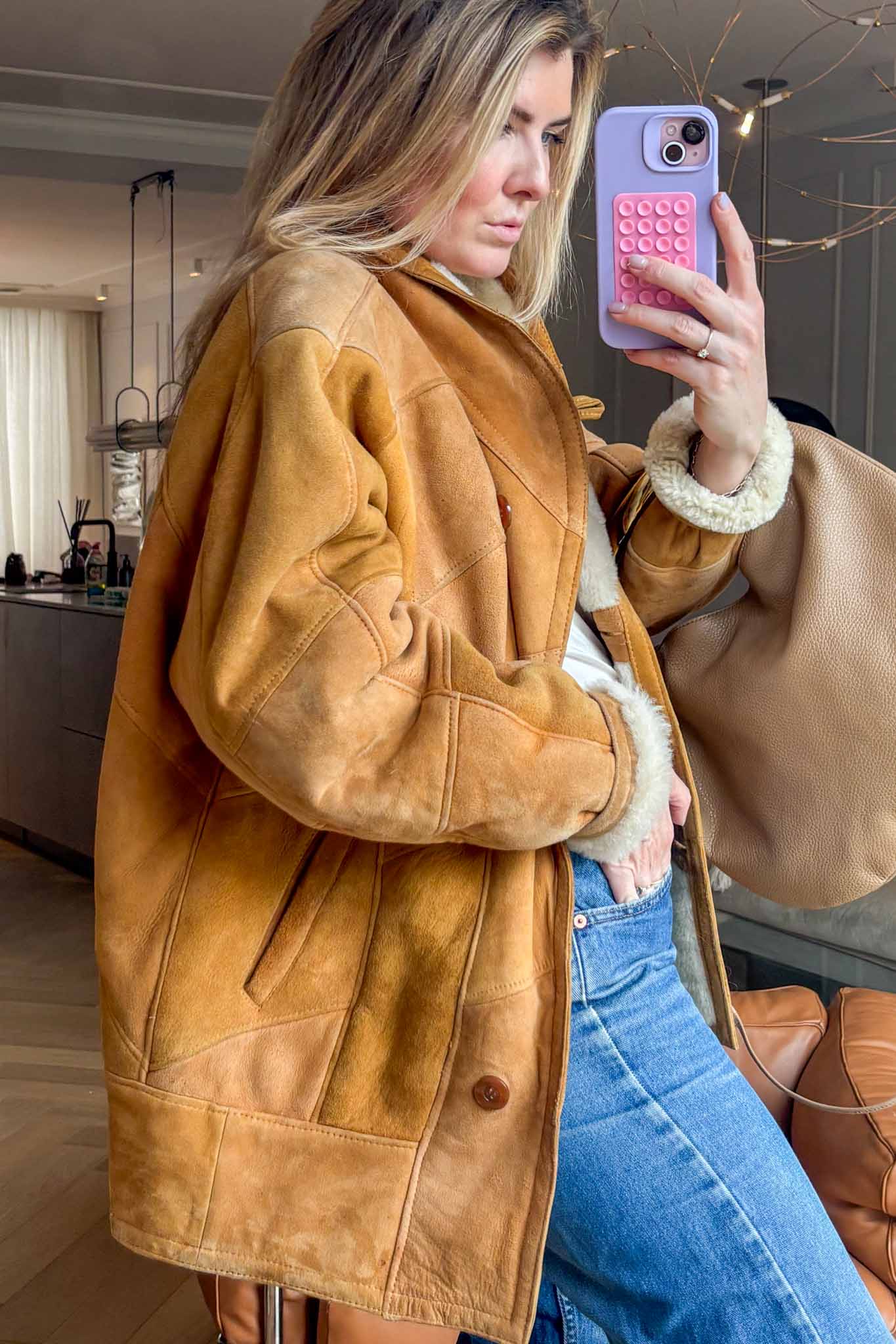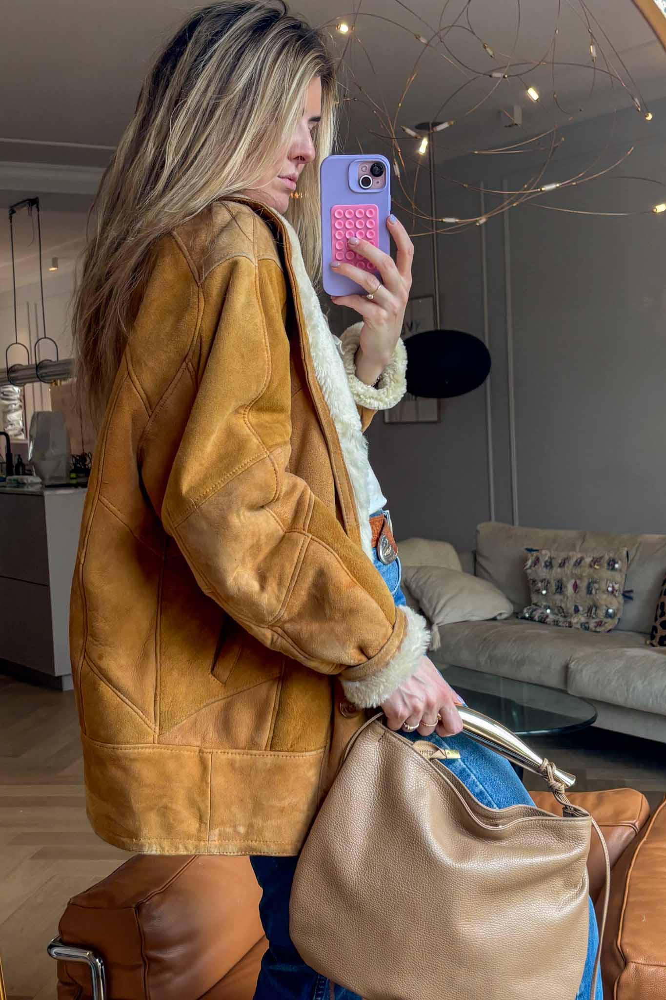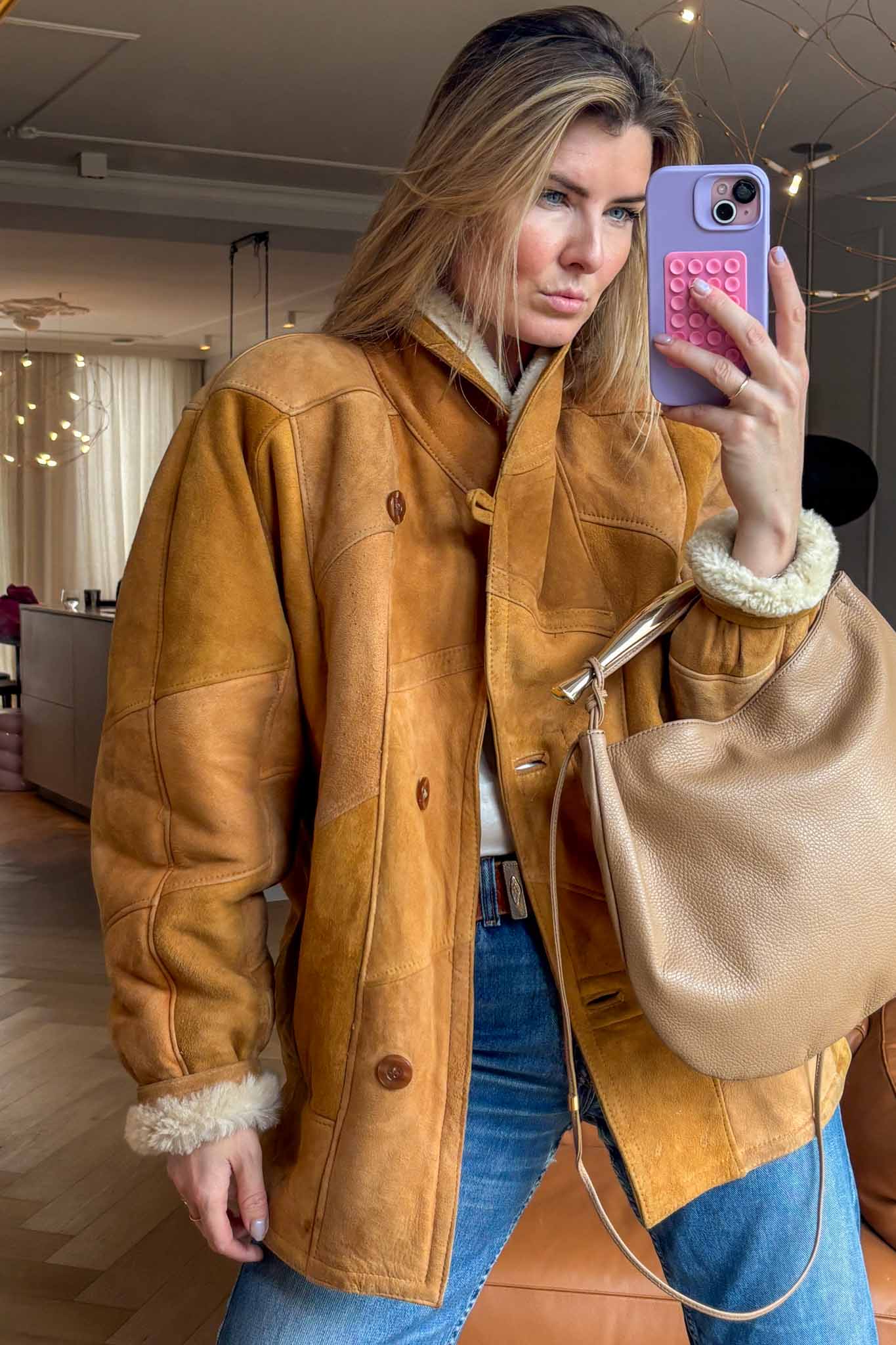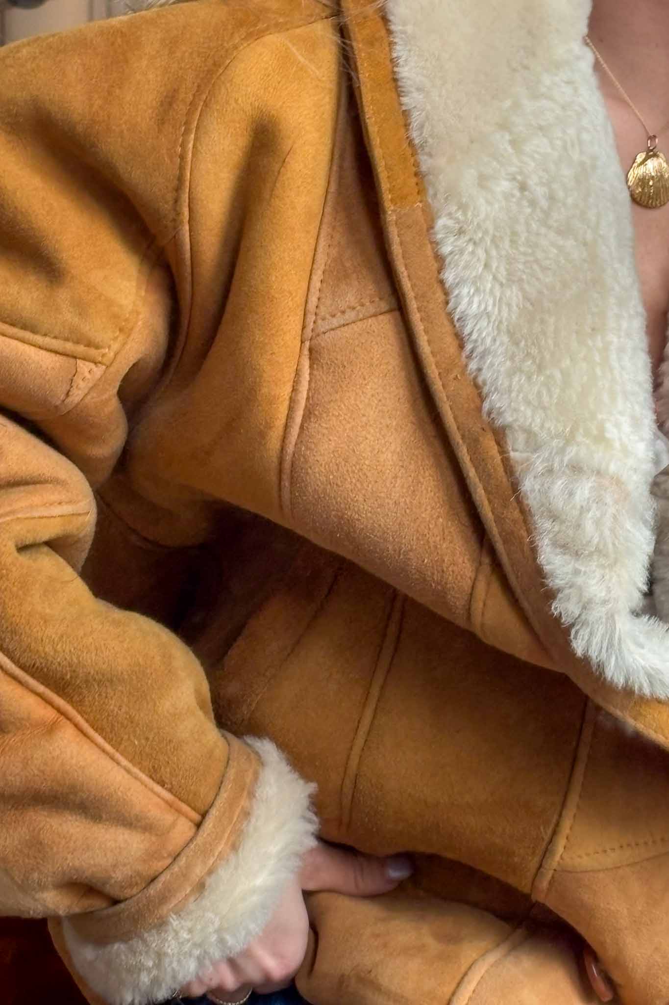 Elevate your wardrobe with the Maison Cognac – Suede & Shearling Chic Statement Coat, a perfect blend of cozy sophistication and modern style. Crafted from soft cognac suede with luxurious shearling/lammy collar details, this coat sits just under the waist, offering a flattering, versatile silhouette. Designed for sizes 38–40, with an oversized fit in 36, it combines a chic, trendy look with vintage charm.
