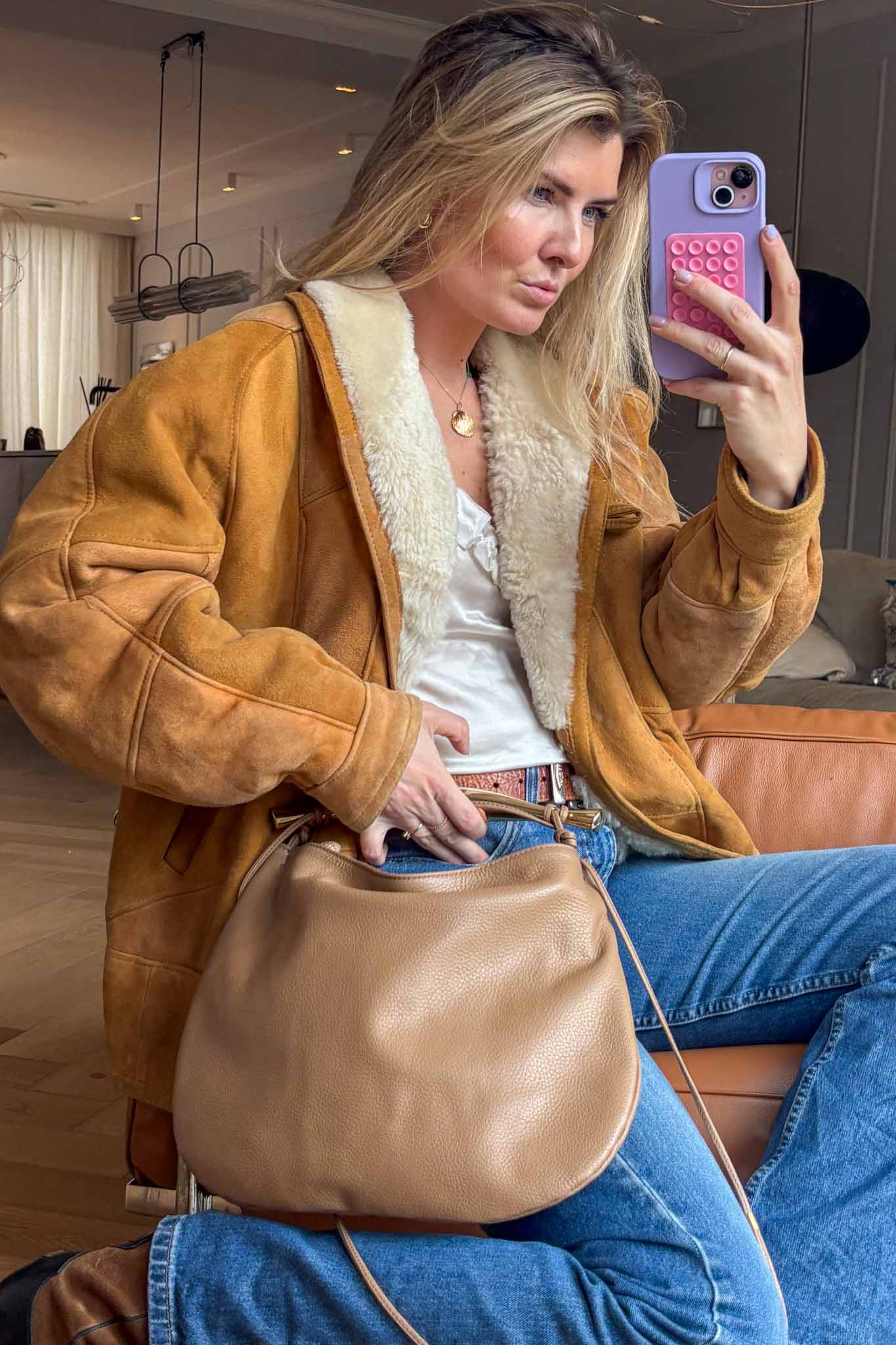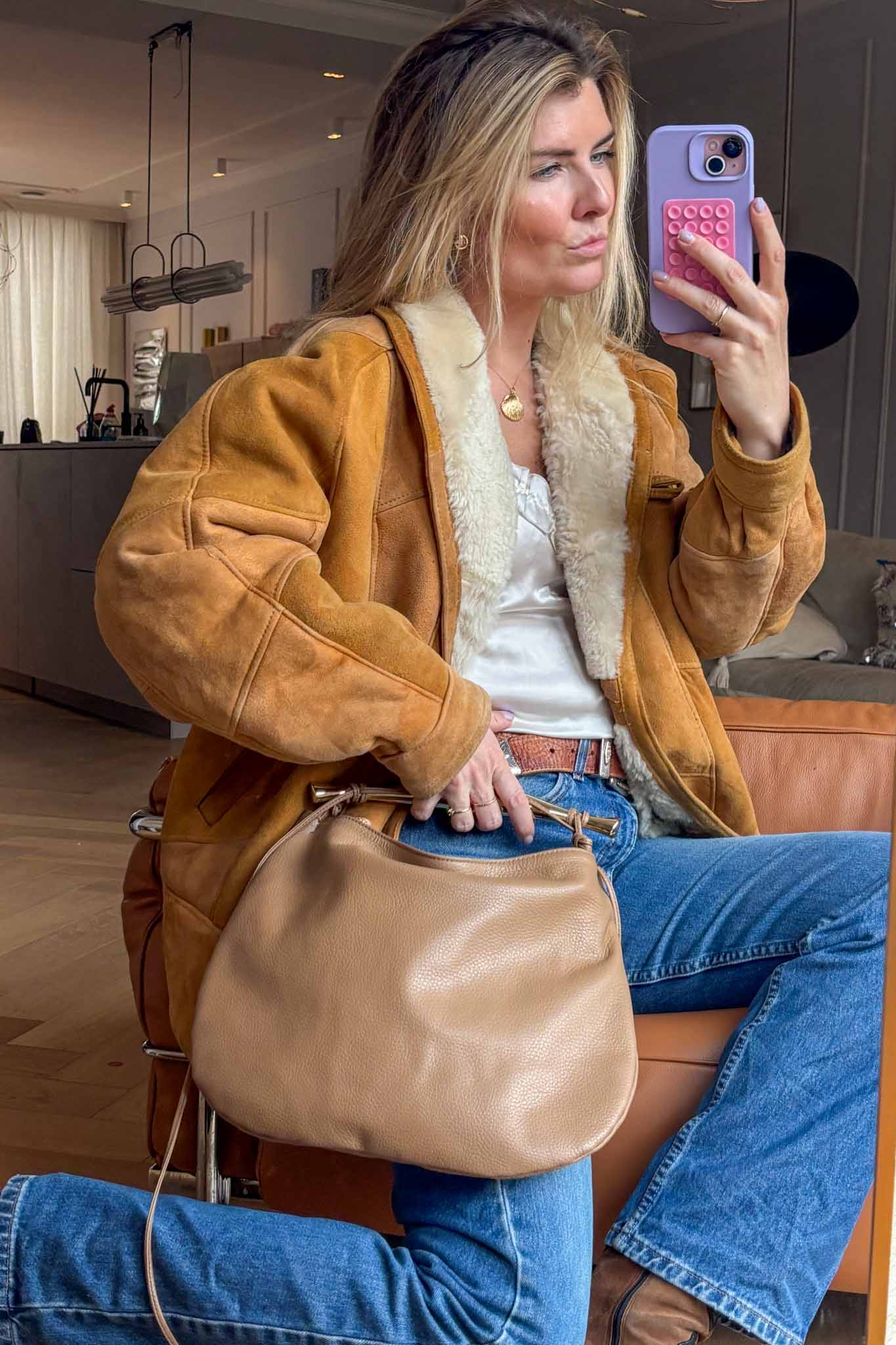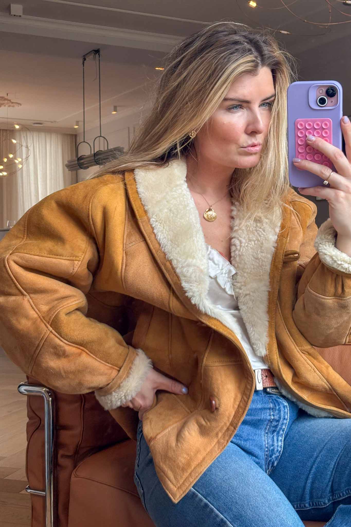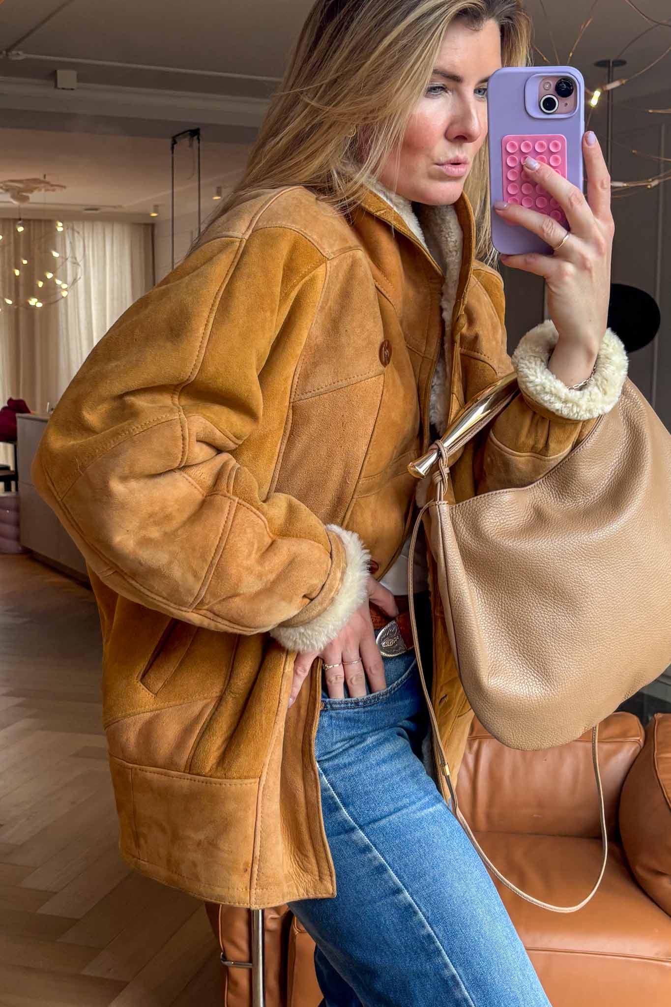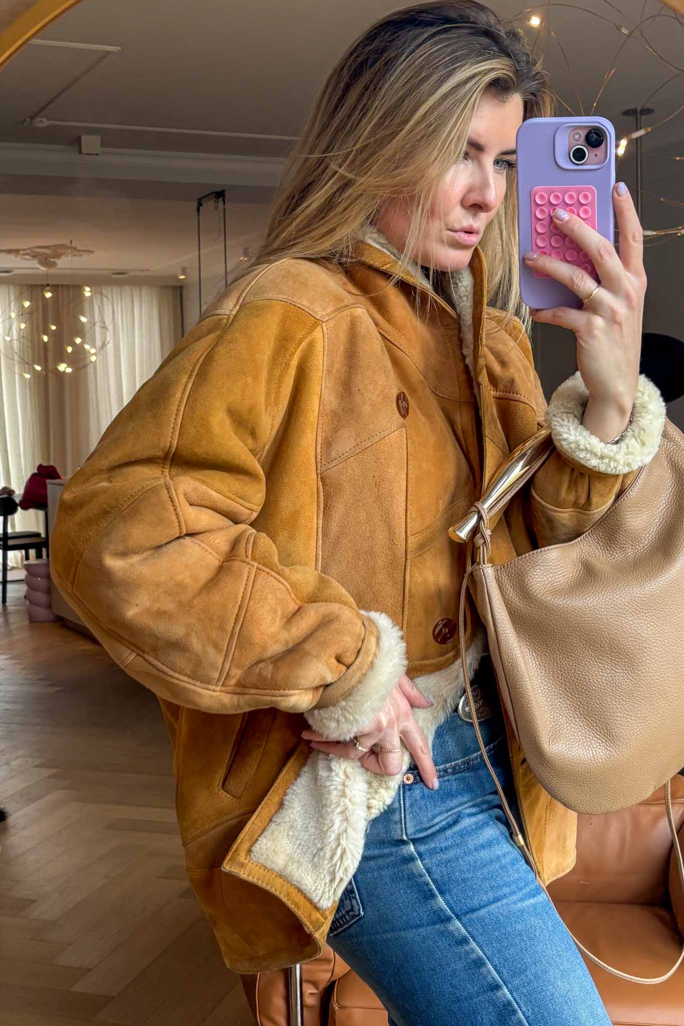 Elevate your wardrobe with the Maison Cognac – Suede & Shearling Chic Statement Coat, a perfect blend of cozy sophistication and modern style. Crafted from soft cognac suede with luxurious shearling/lammy collar details, this coat sits just under the waist, offering a flattering, versatile silhouette. Designed for sizes 38–40, with an oversized fit in 36, it combines a chic, trendy look with vintage charm.