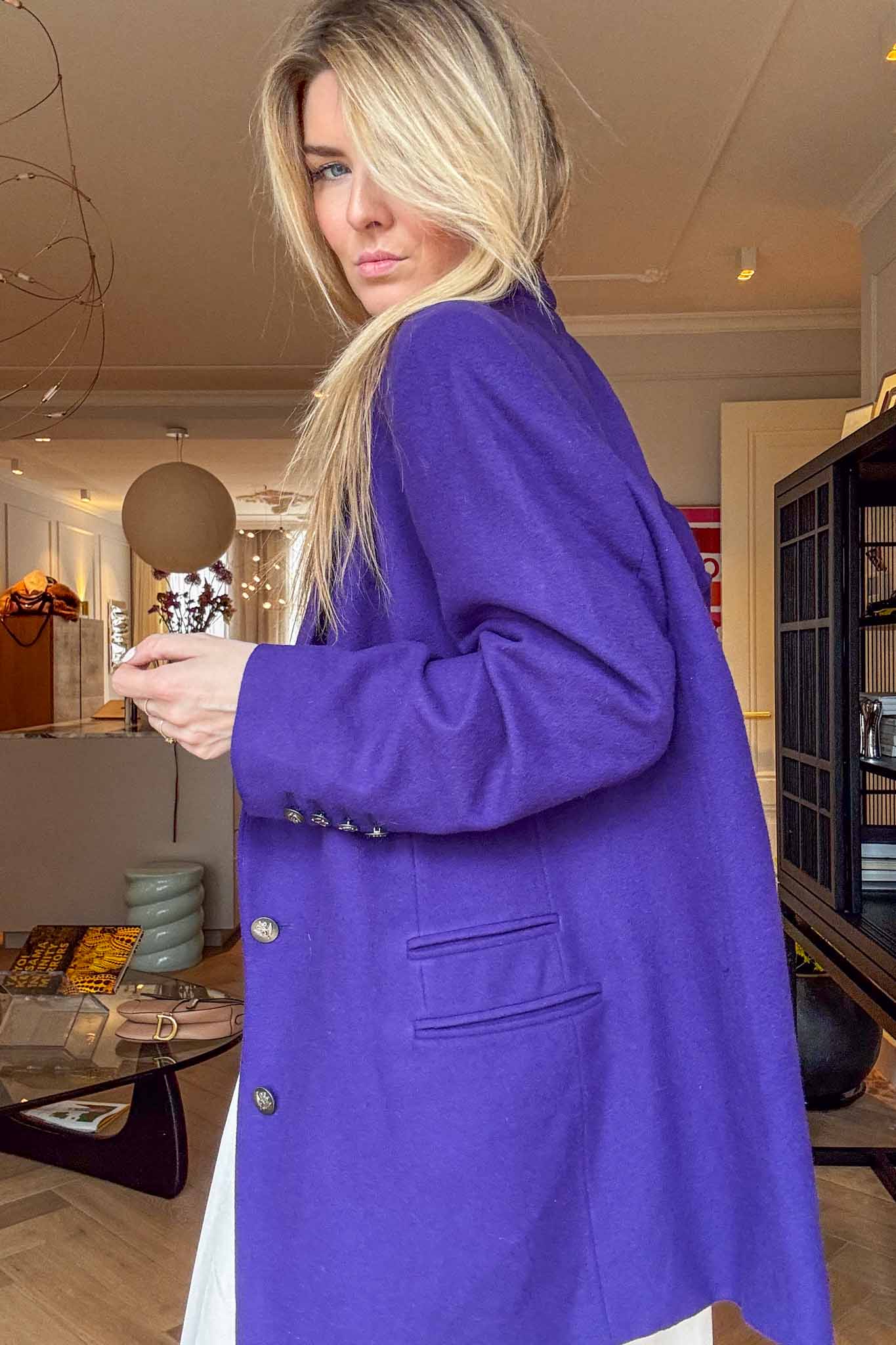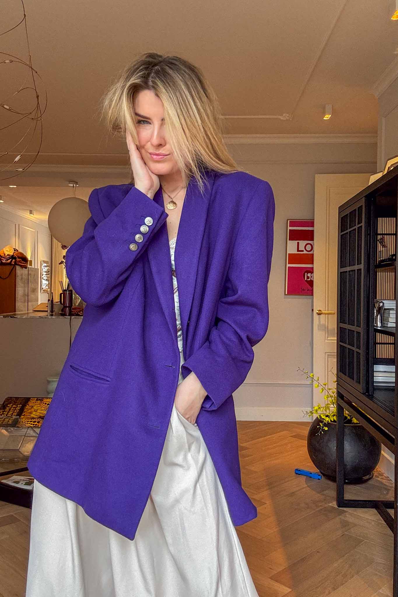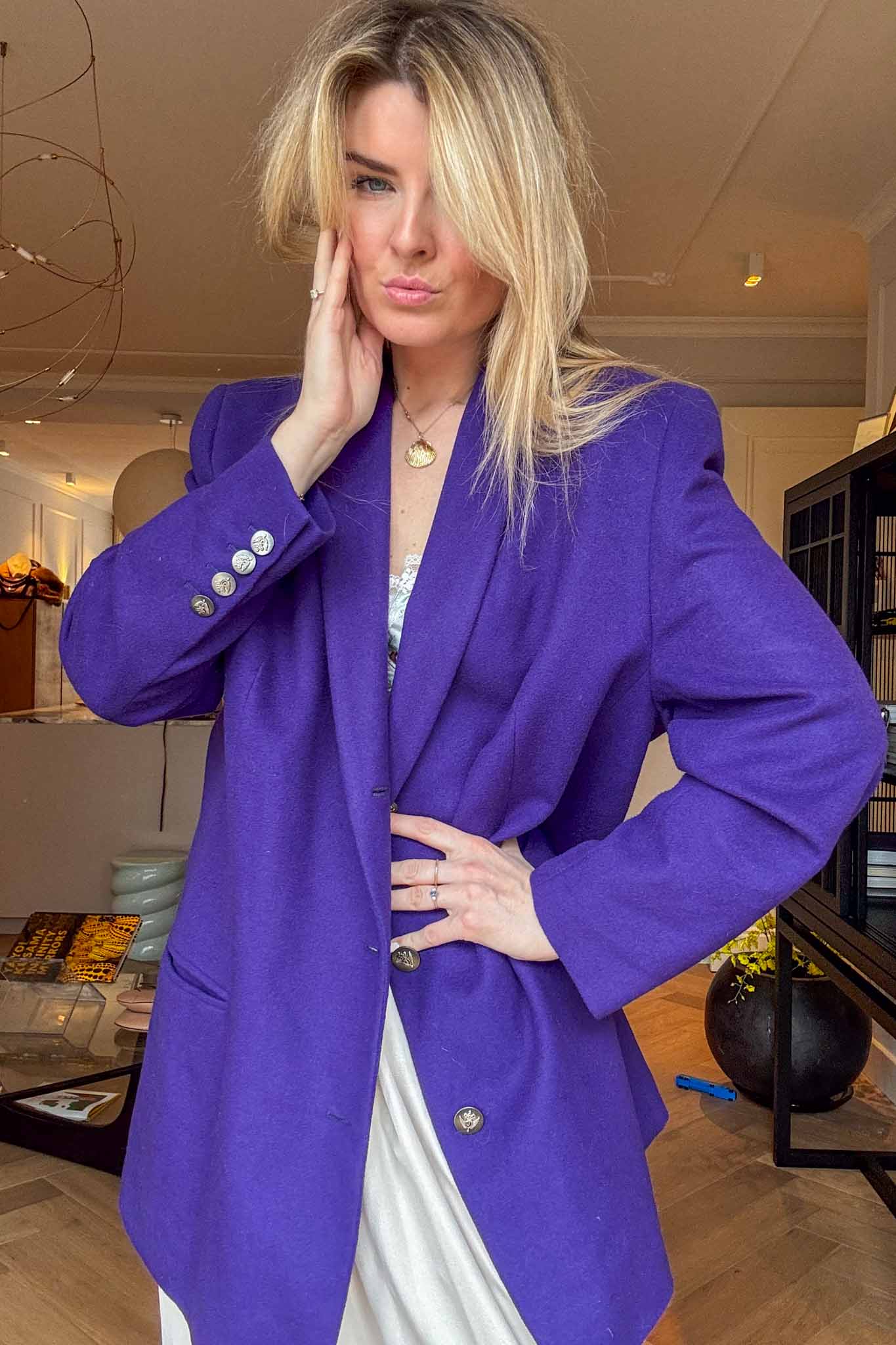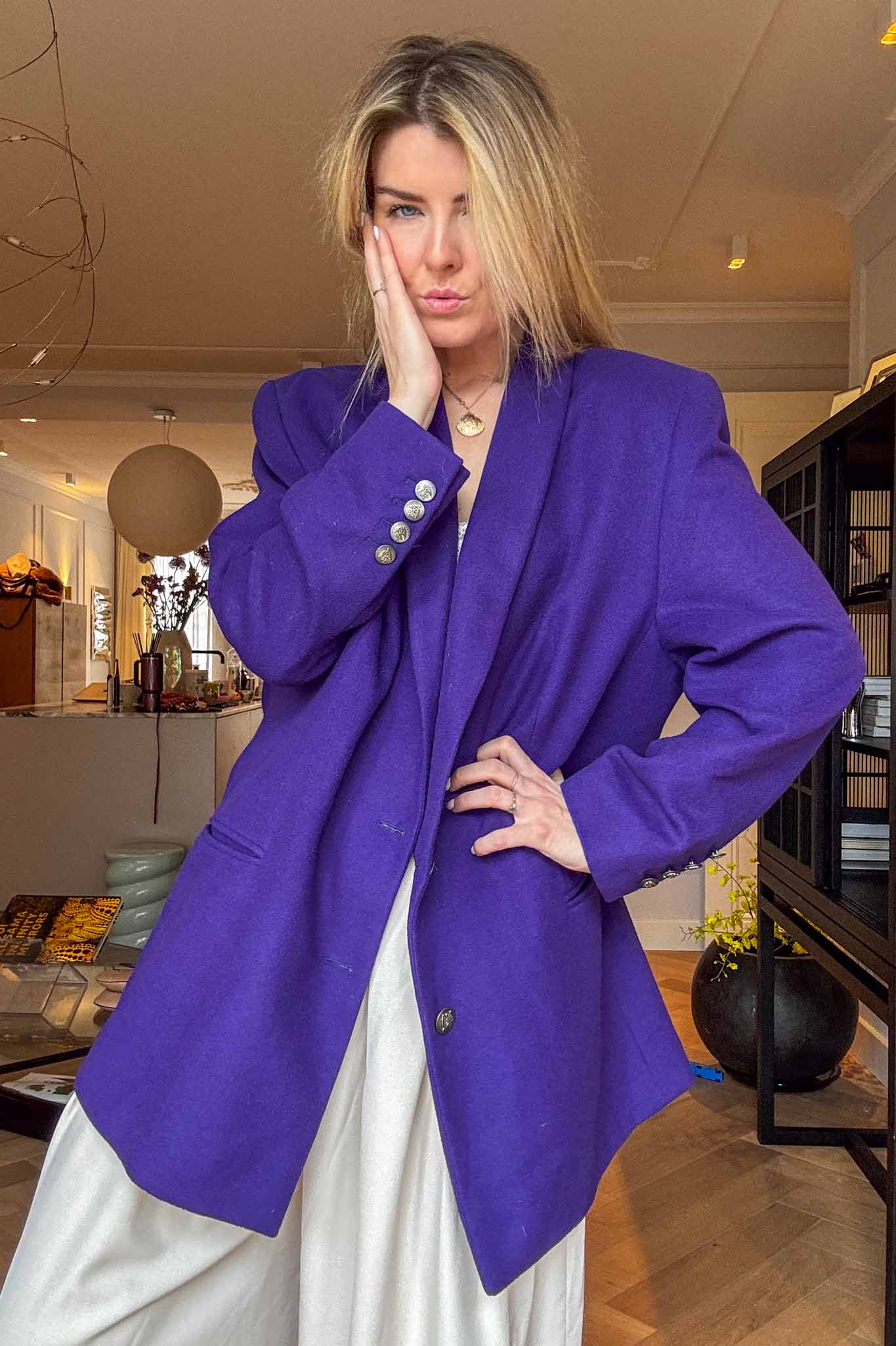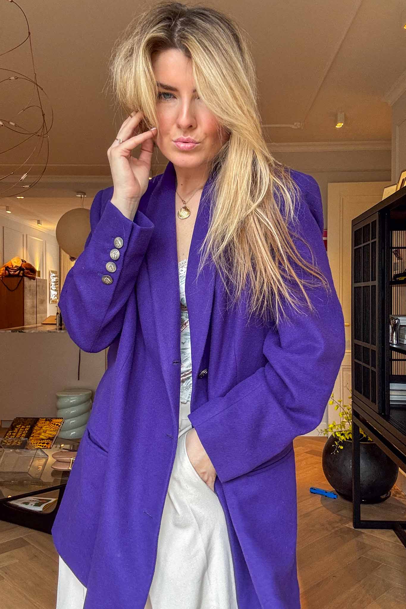A bold and classic oversized blazer in deep purple, perfectly tailored to create a dramatic yet elegant silhouette. Layer it over dresses or tailored pants for a statement look with classic sophistication. Can be worn oversized or with a smaller fit.