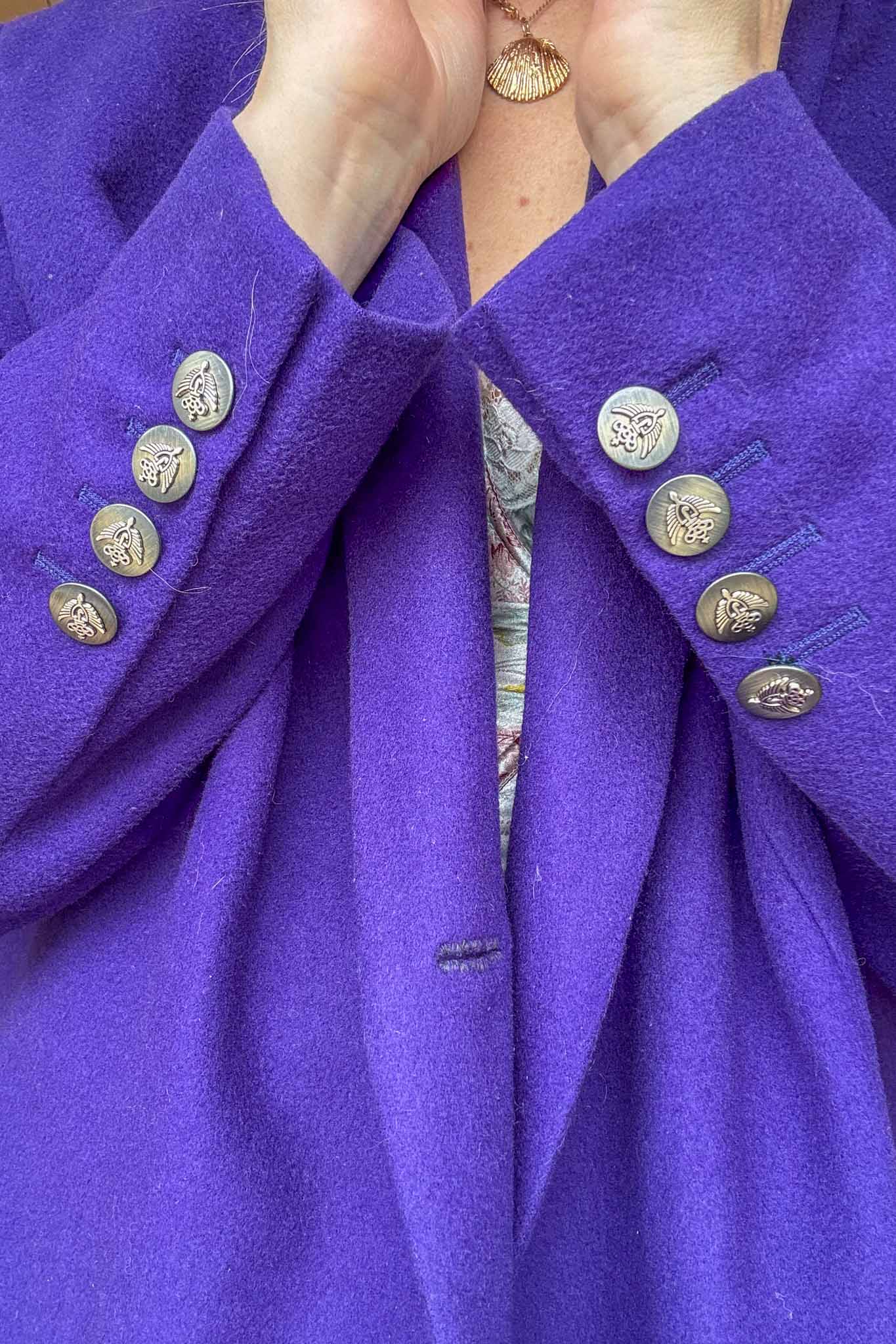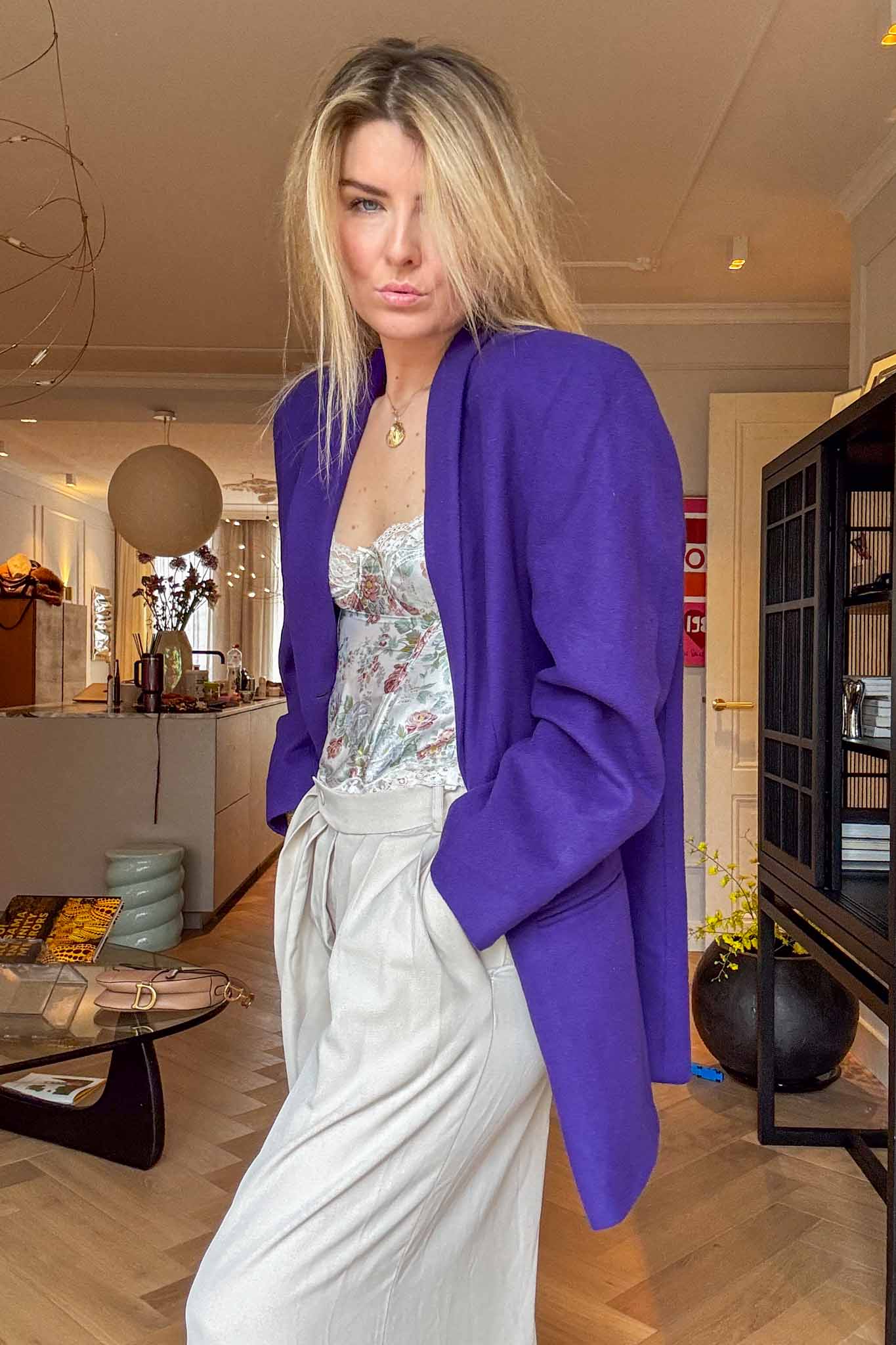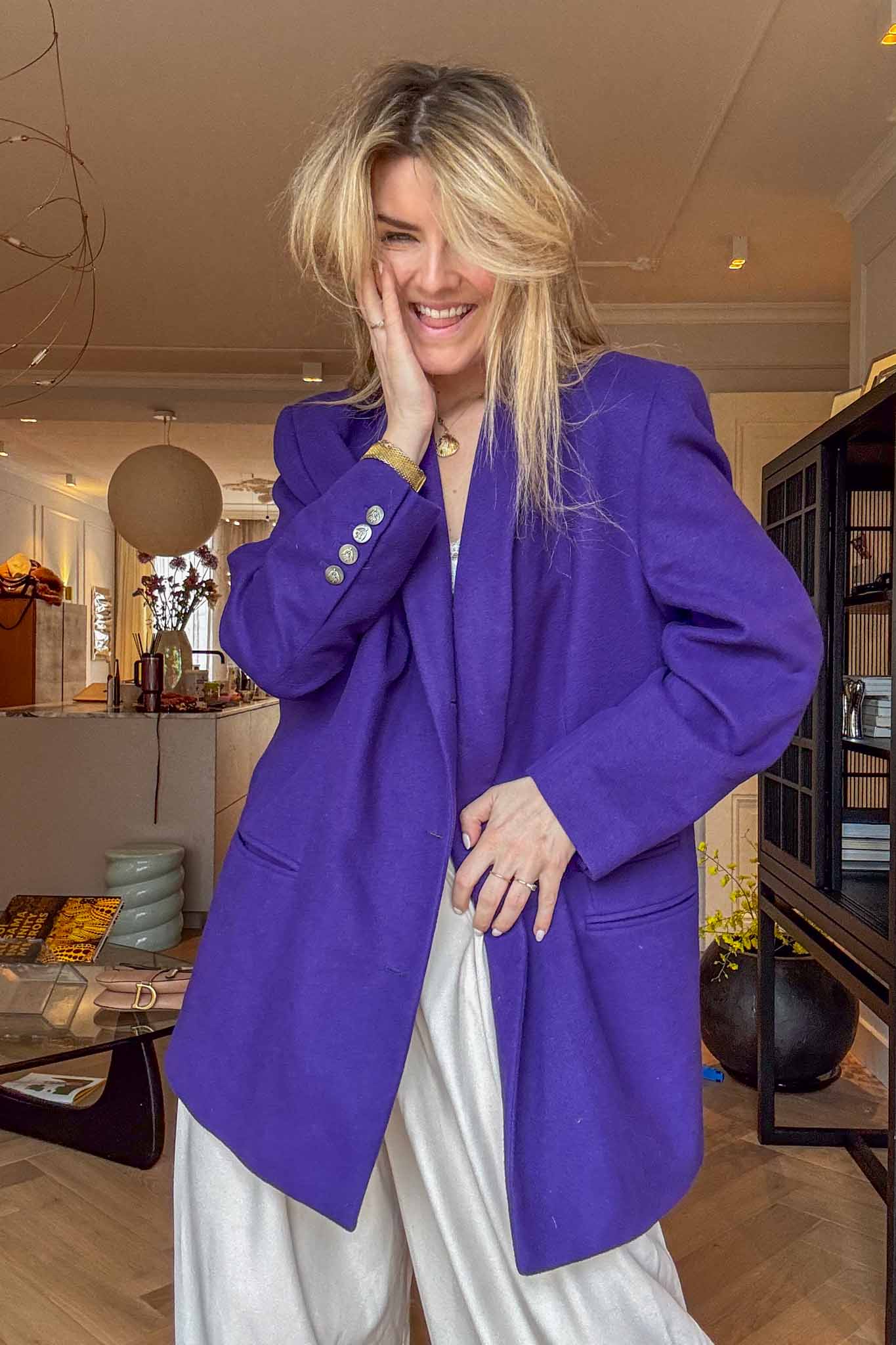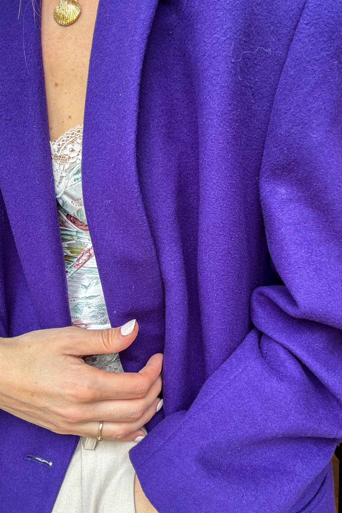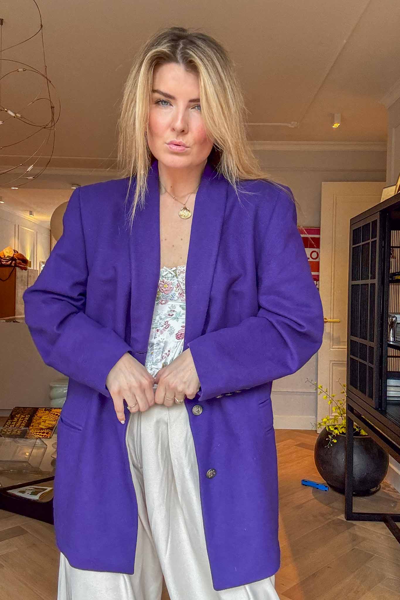A bold and classic oversized blazer in deep purple, perfectly tailored to create a dramatic yet elegant silhouette. Layer it over dresses or tailored pants for a statement look with classic sophistication. Can be worn oversized or with a smaller fit.