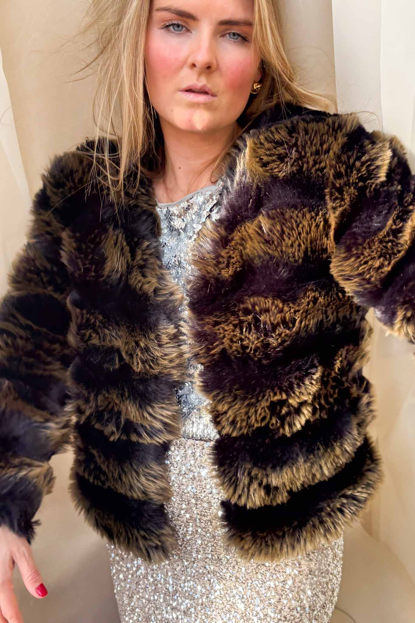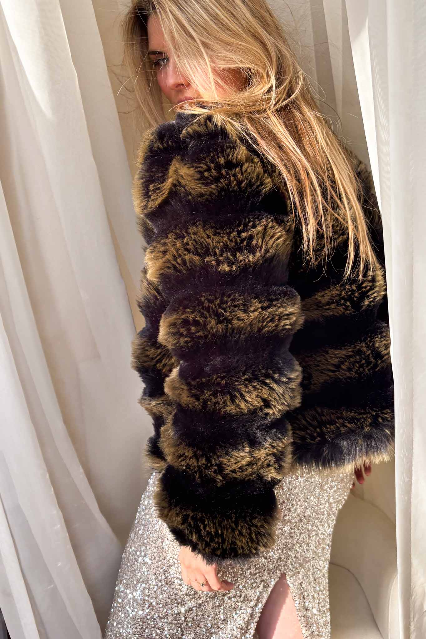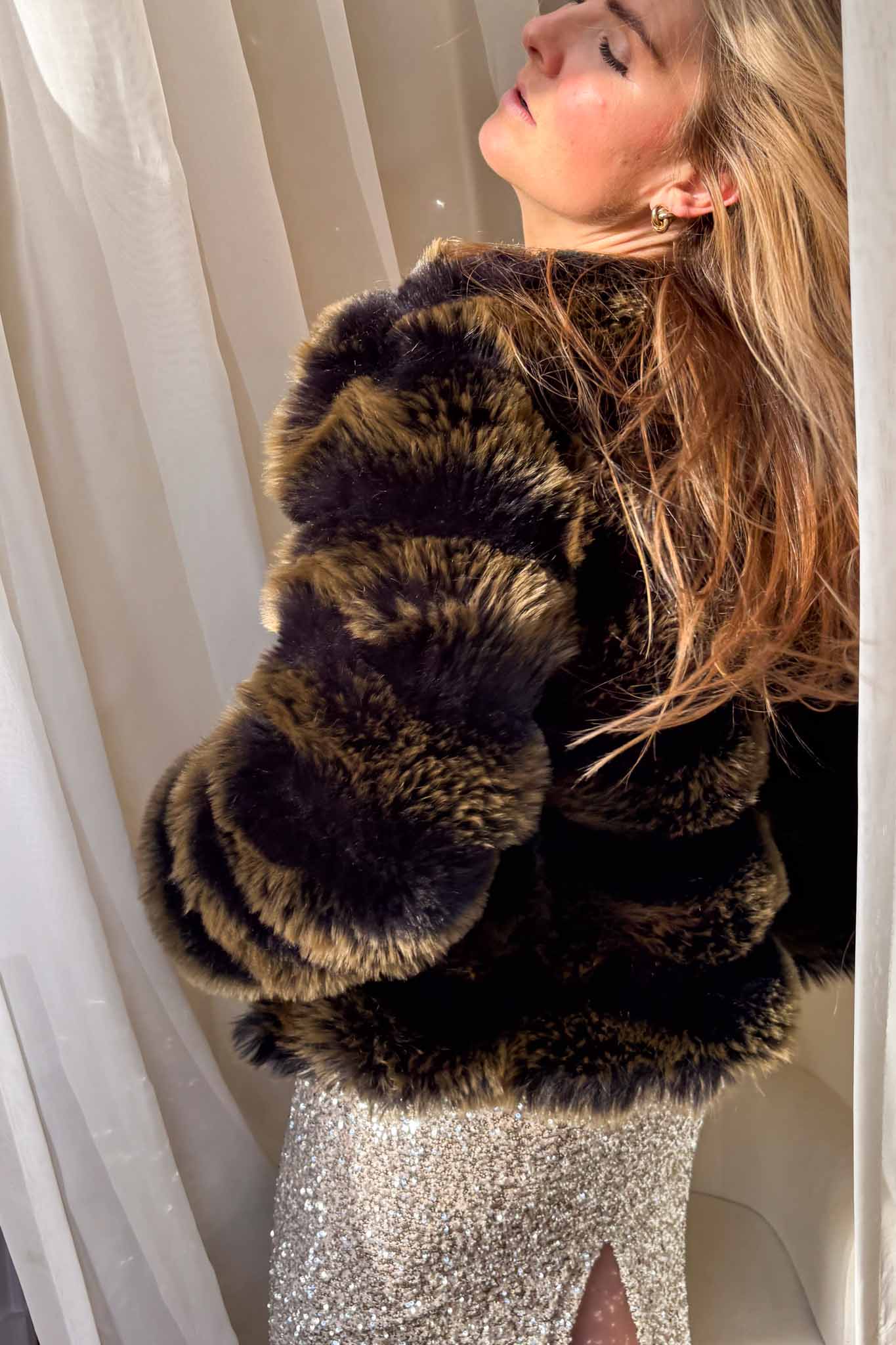 Elevate your winter wardrobe with this luxurious Parisian faux-fur short coat, crafted to blend chic city style with irresistible comfort. Designed in Paris, it features a stunning mix of caramelo and deep black shades, arranged in unique, artful stripes that create texture, depth, and a truly sophisticated look.