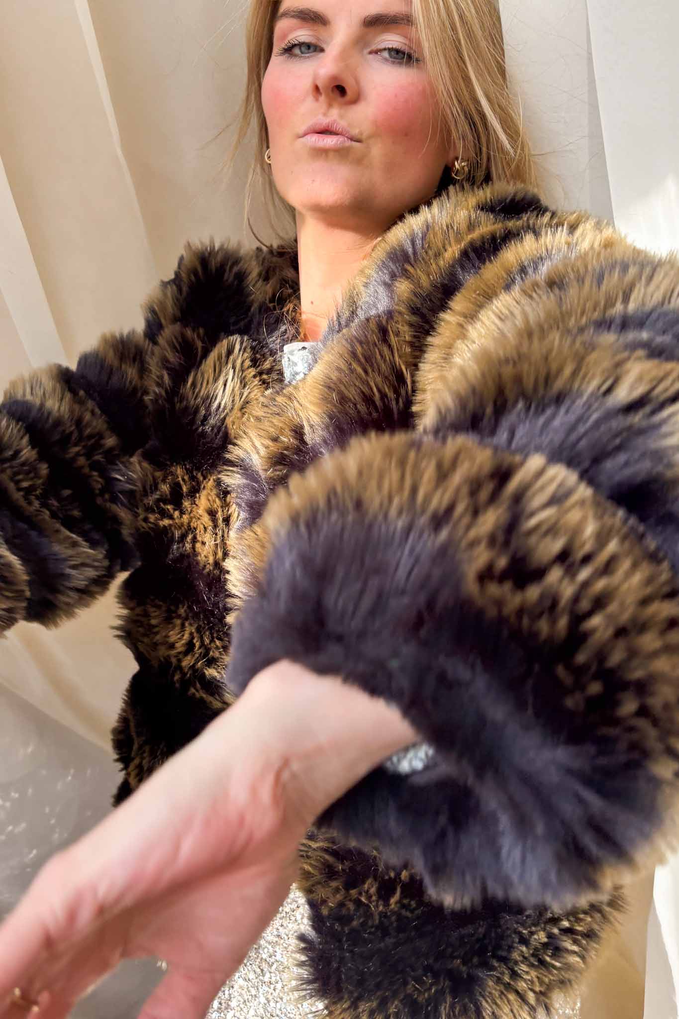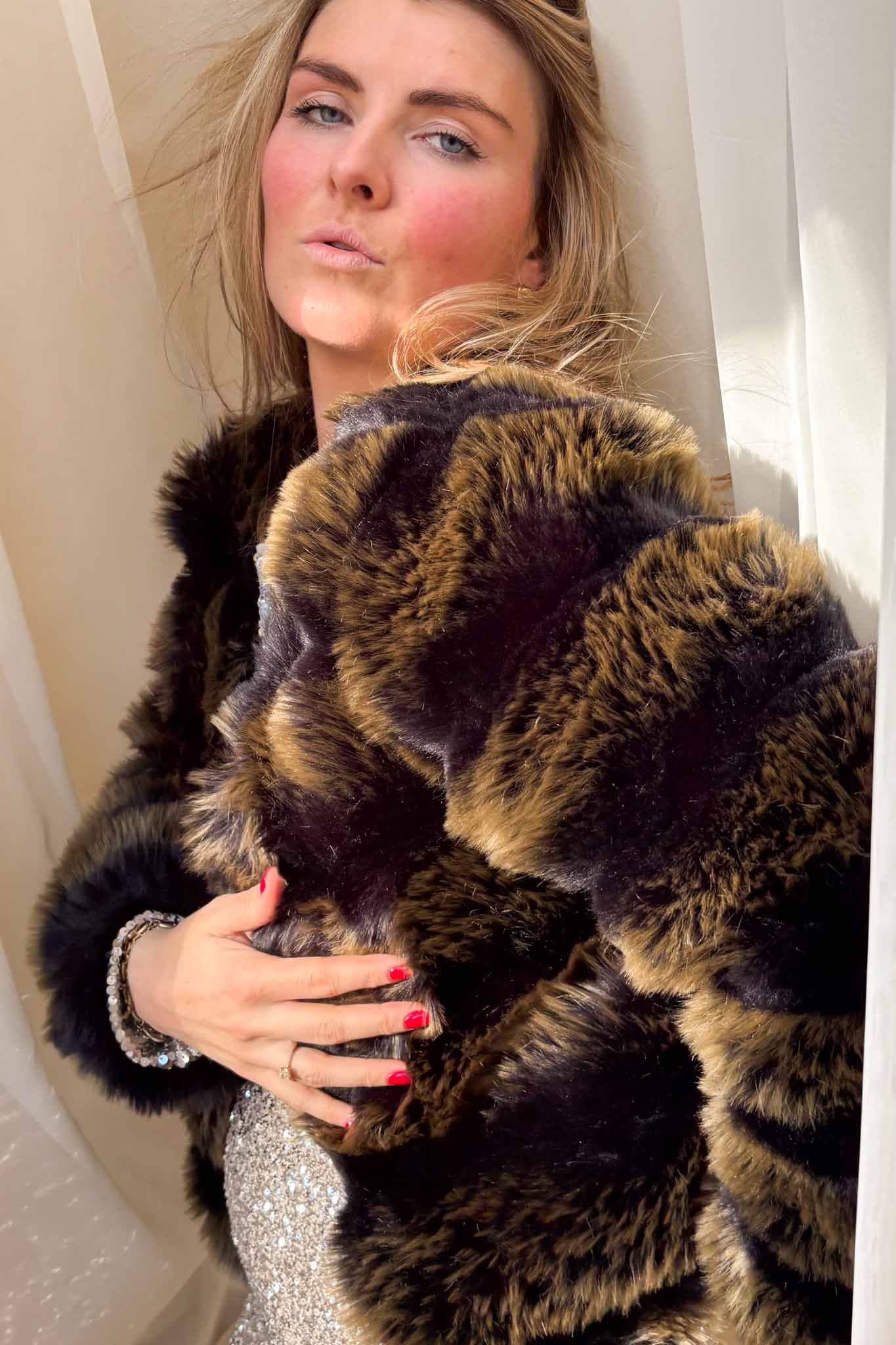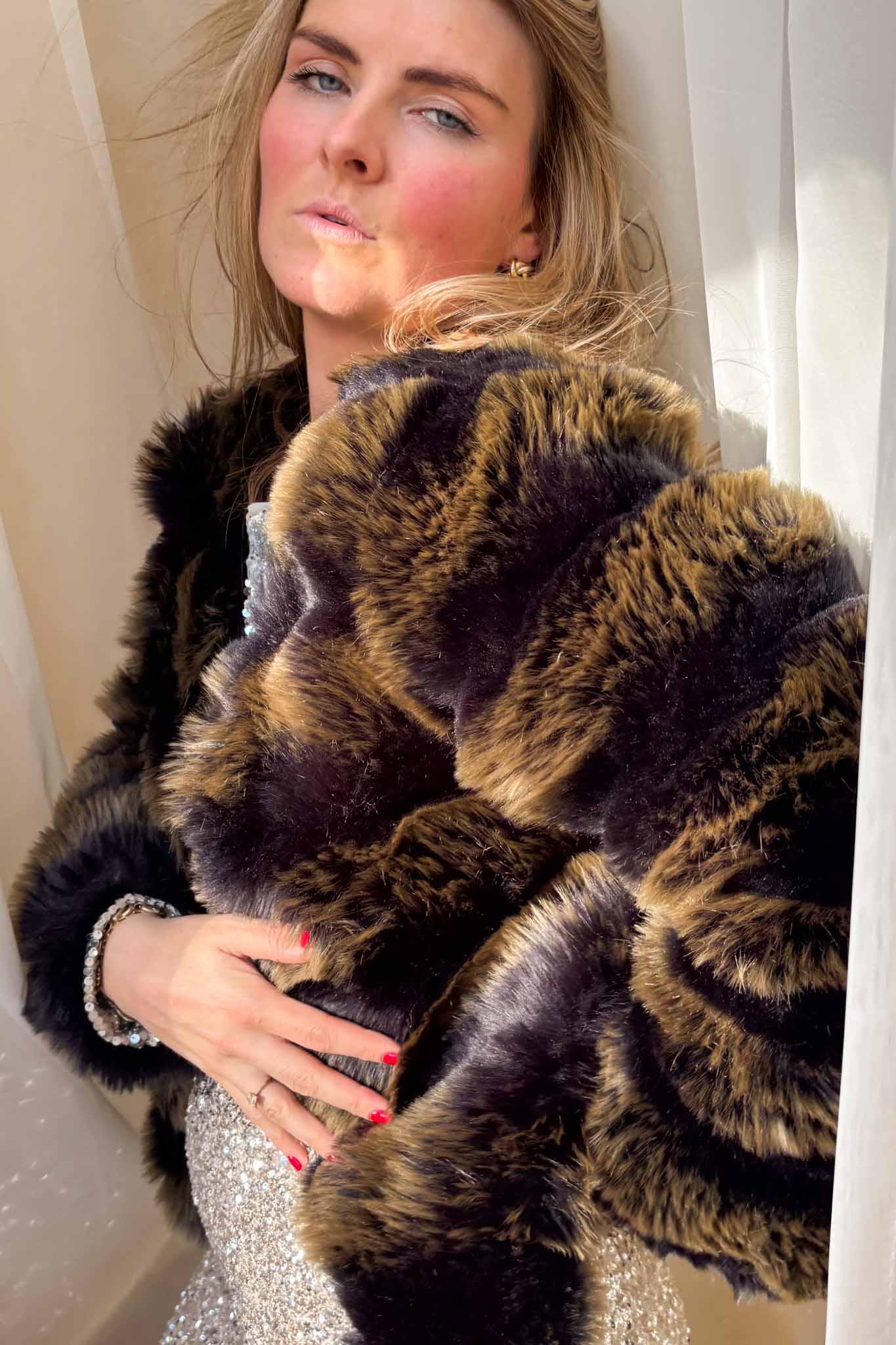 Elevate your winter wardrobe with this luxurious Parisian faux-fur short coat, crafted to blend chic city style with irresistible comfort. Designed in Paris, it features a stunning mix of caramelo and deep black shades, arranged in unique, artful stripes that create texture, depth, and a truly sophisticated look.
