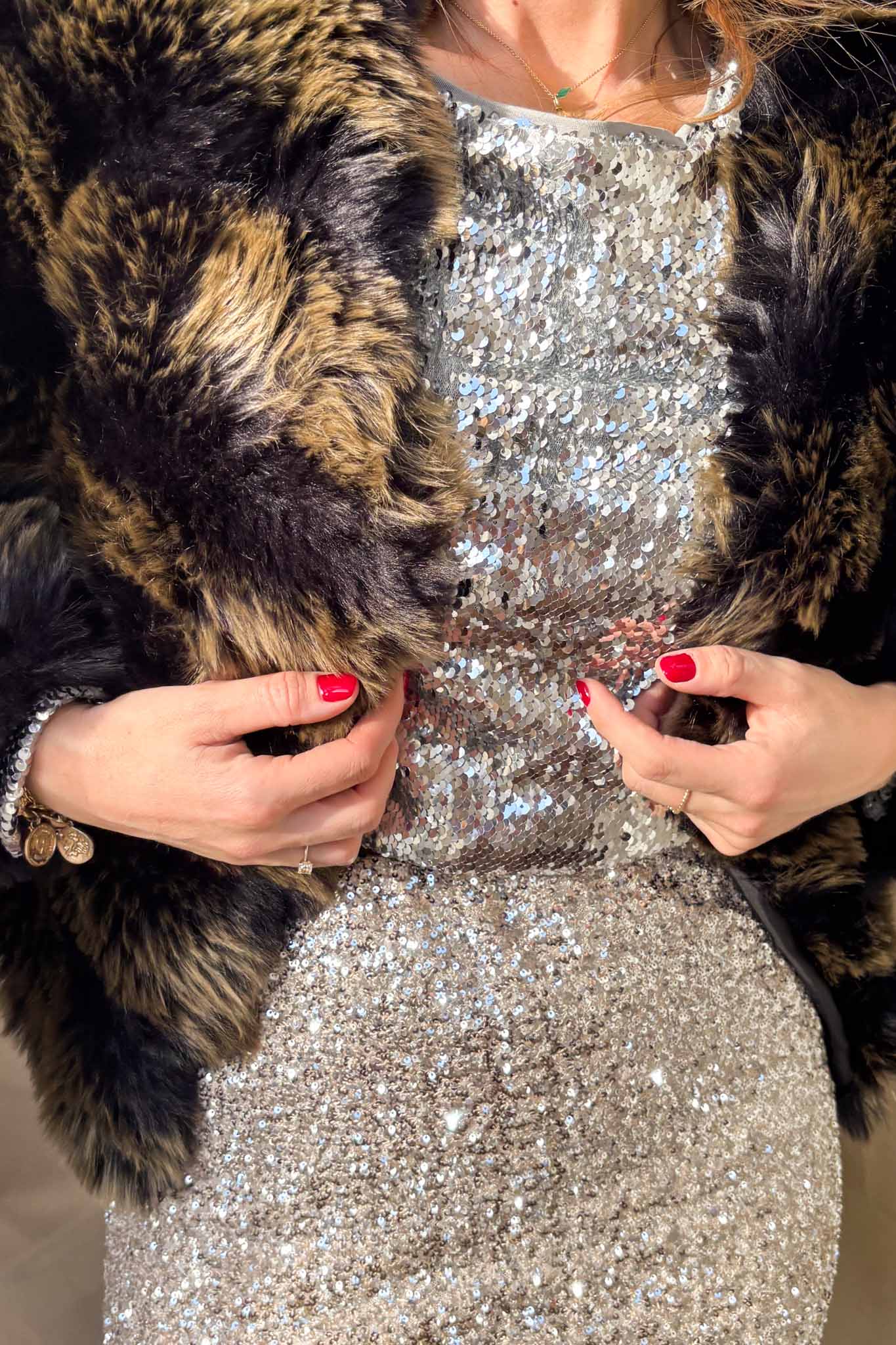 The plush faux fur offers a soft, velvety touch while maintaining an elegant structure. Its short, modern cut pairs effortlessly with denim, dresses, or tailored trousers, making it your go-to piece for both day and night.