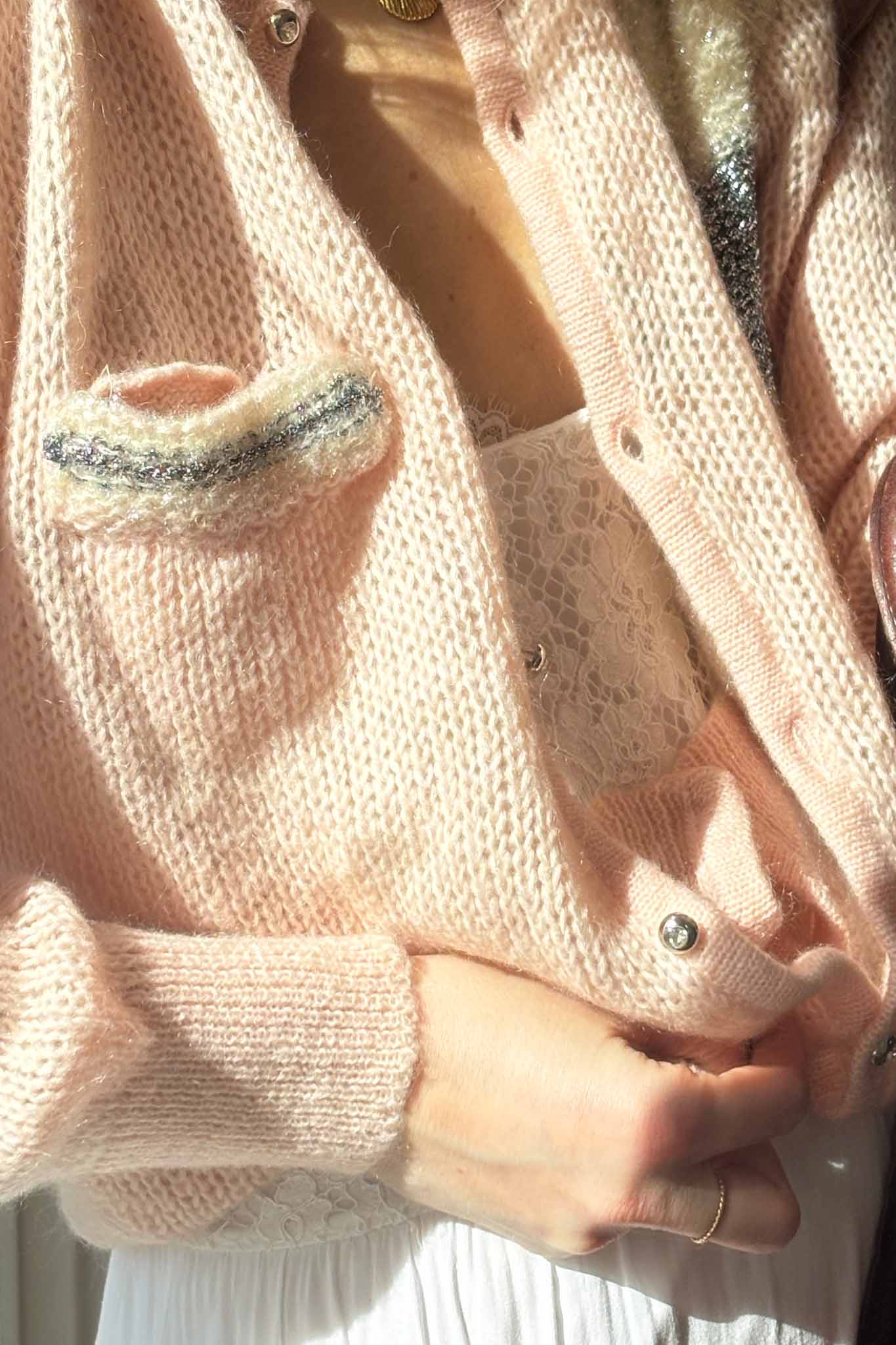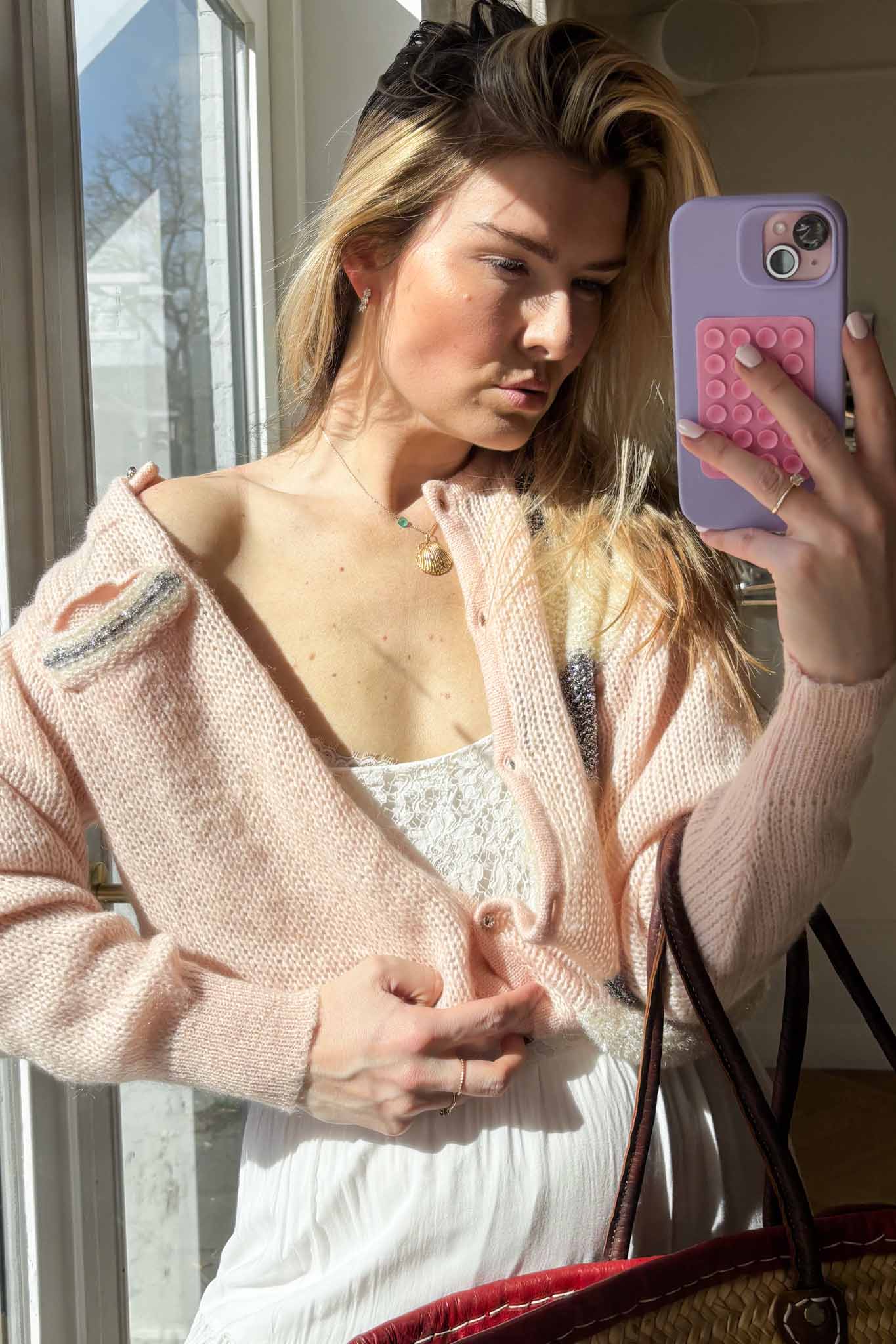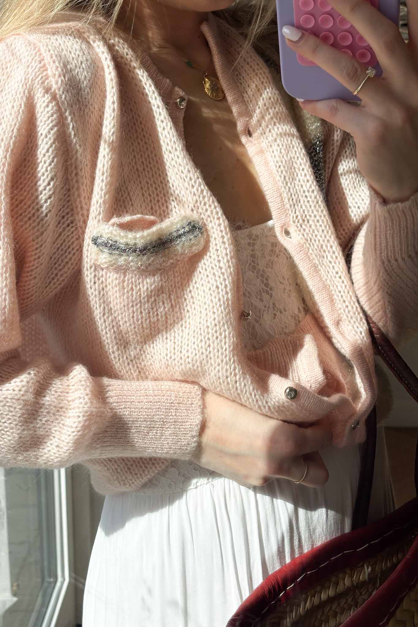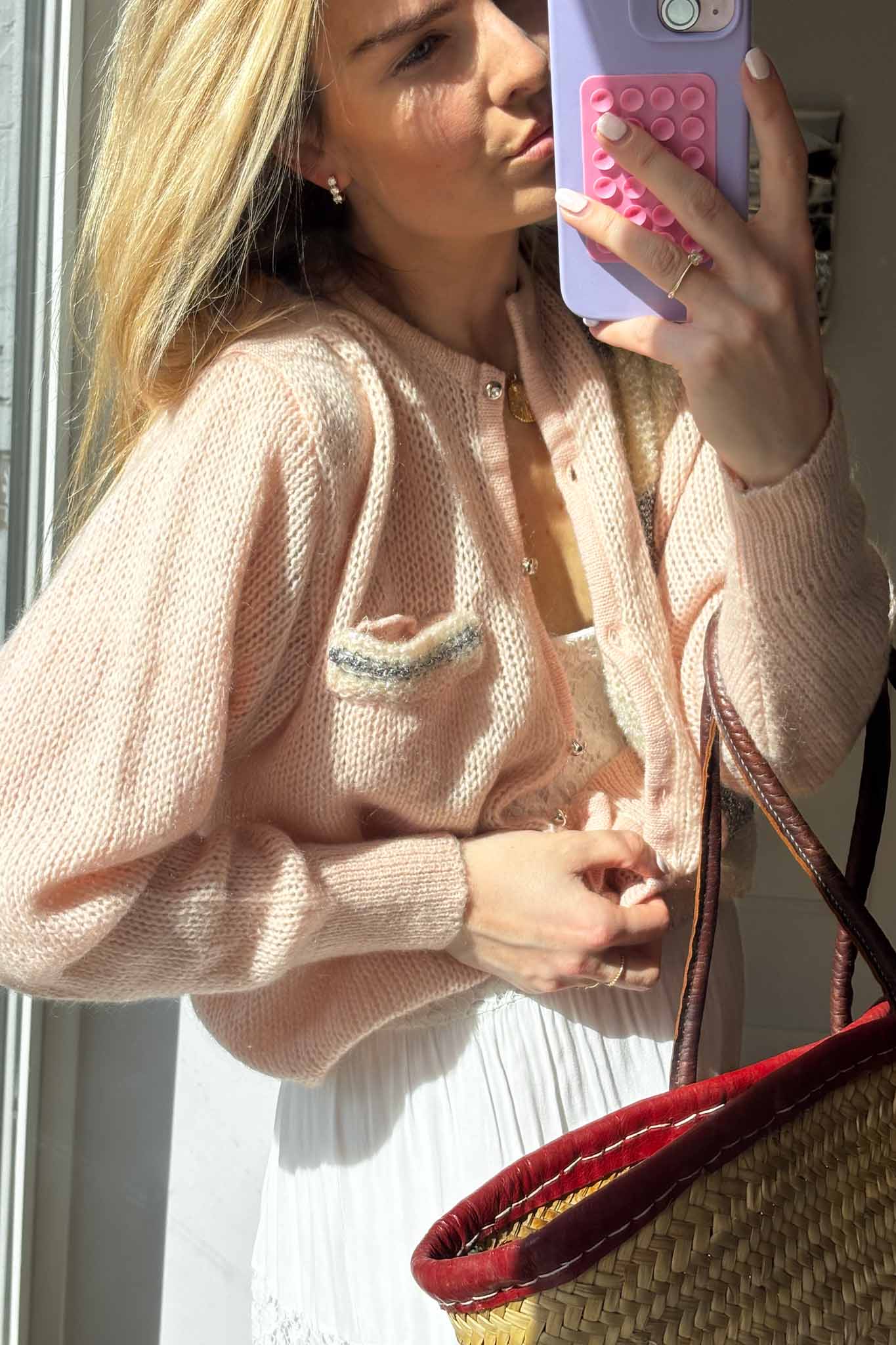 A soft pink wool cardigan with an elevated, feminine feel. The silhouette is classic, while subtle detailing adds just enough interest to make it stand out. Easy to throw over a tank, wear buttoned as a top, or style with tailored trousers for a chic everyday look.