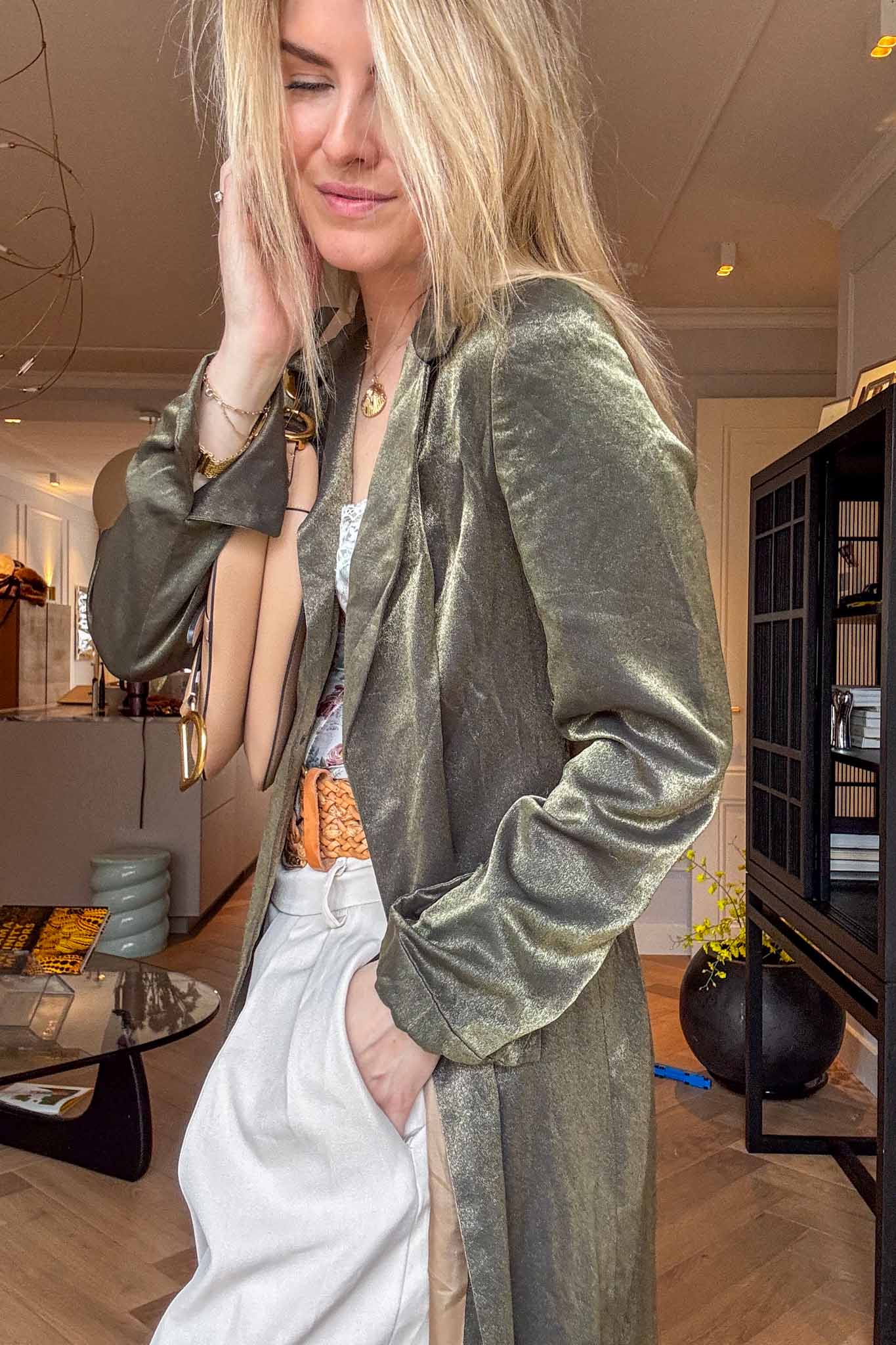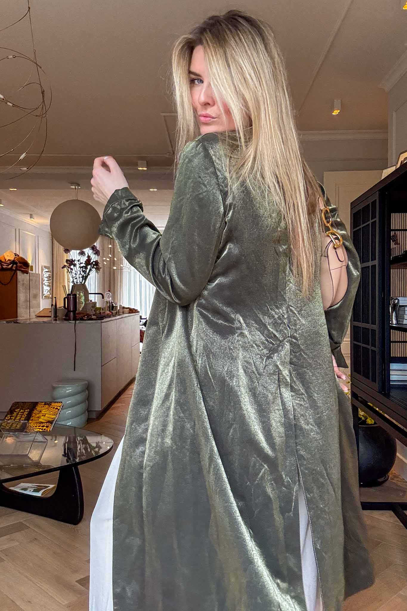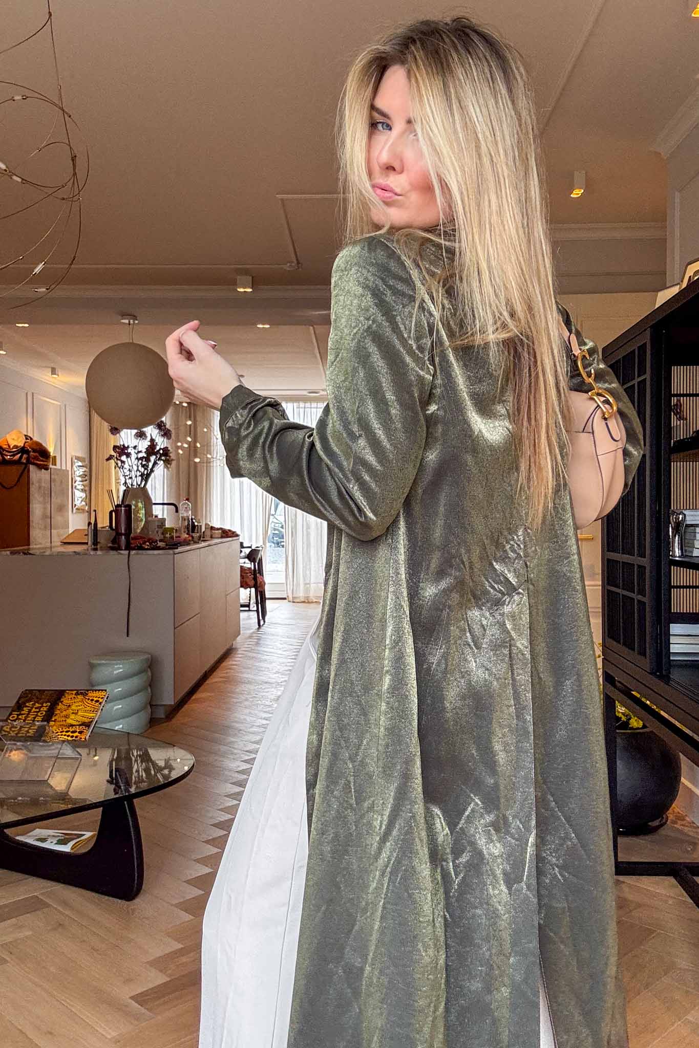 Flowing, elegant, and effortless. This sage green kaftan with a subtle satiny finish is perfect worn over pants or dresses, adding a chic, slightly bohemian vibe to spring looks. The maxi length gives it a graceful movement.