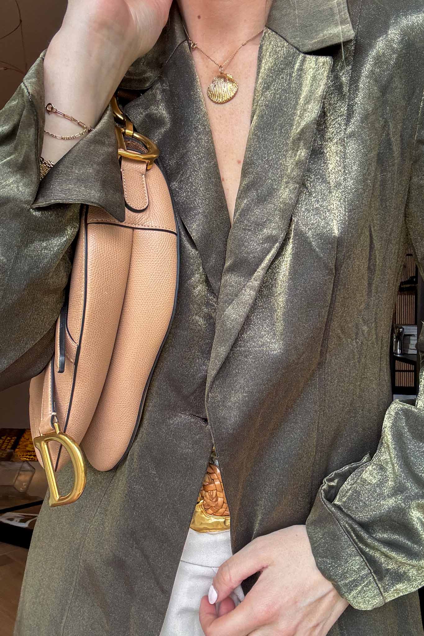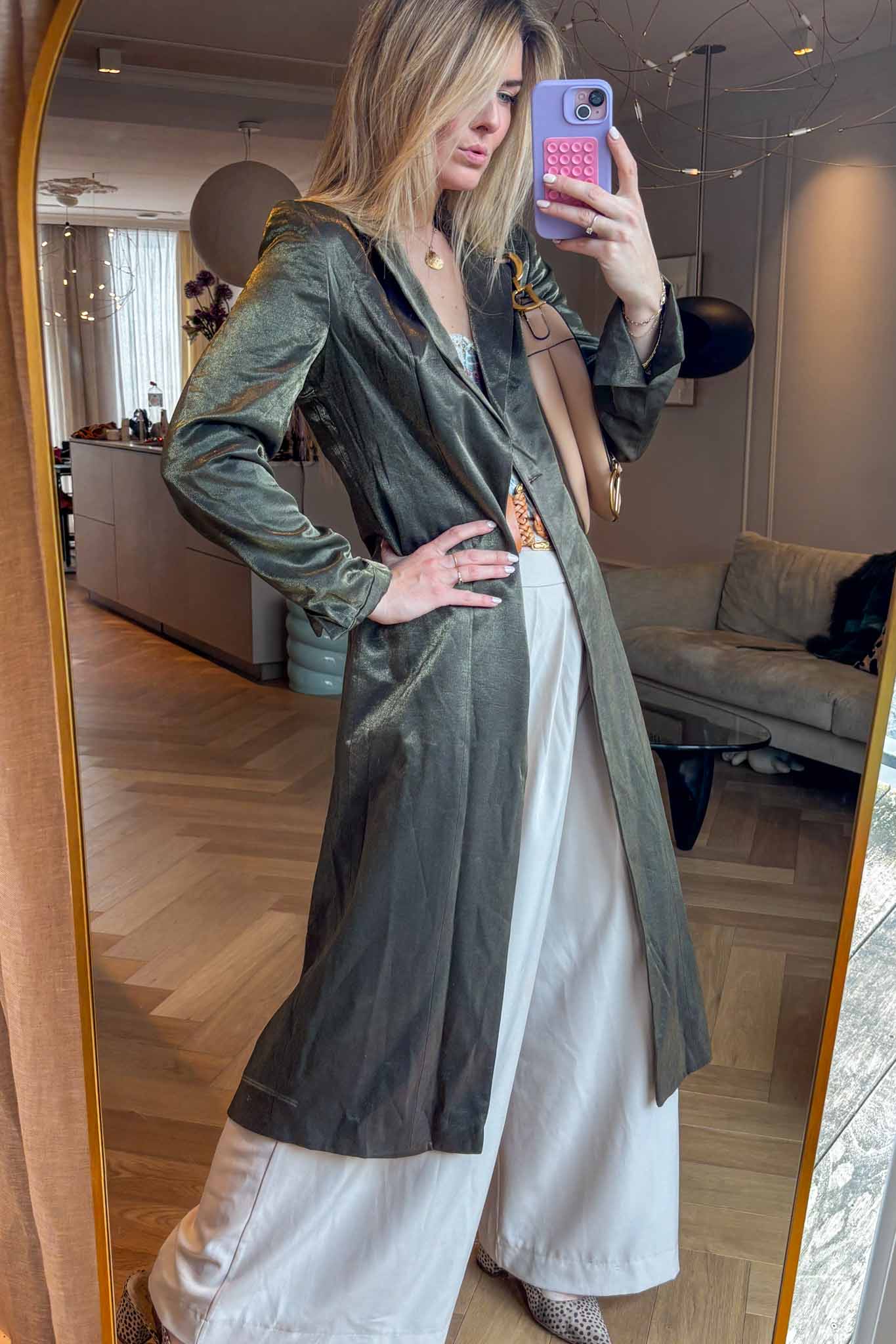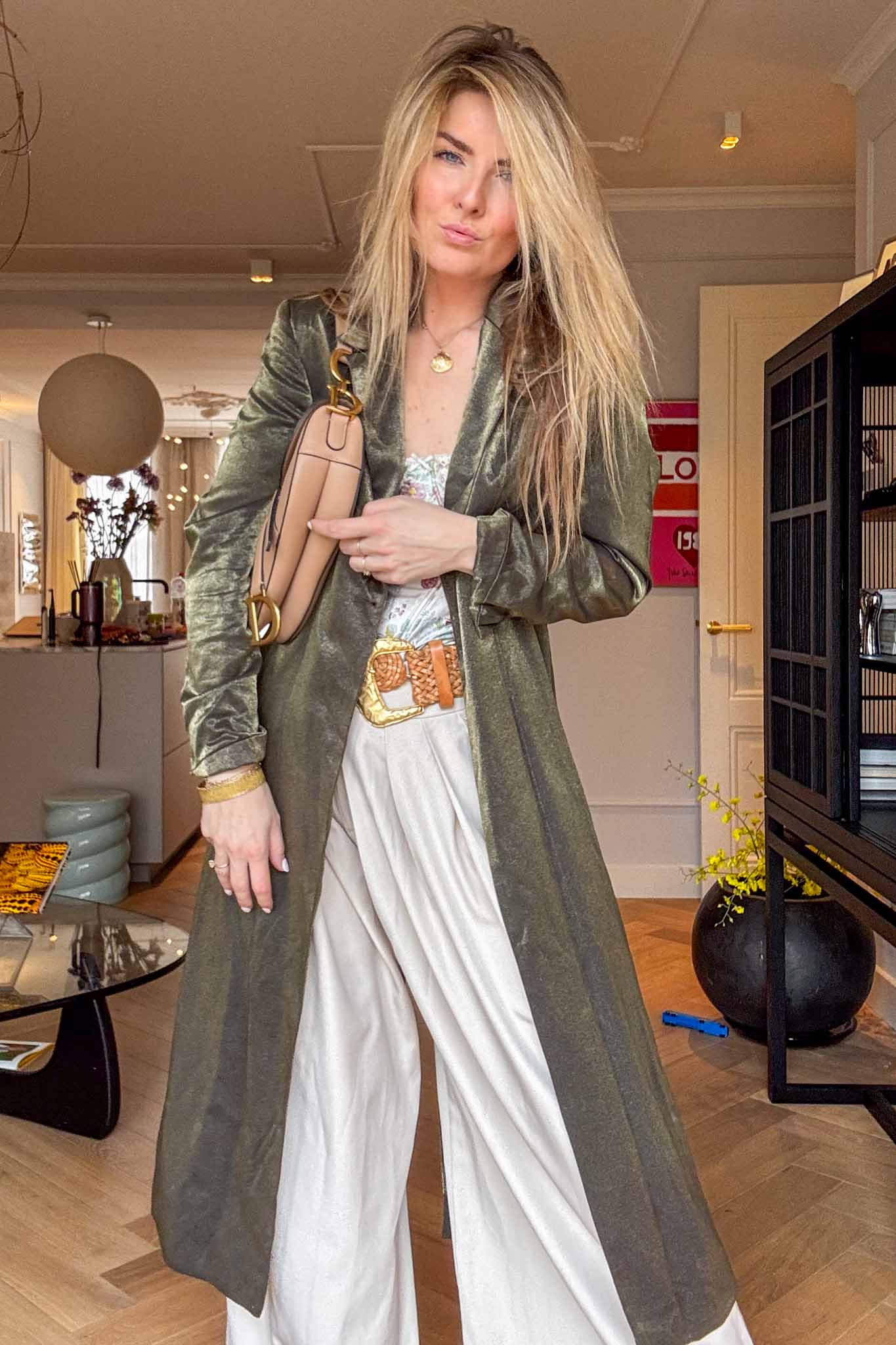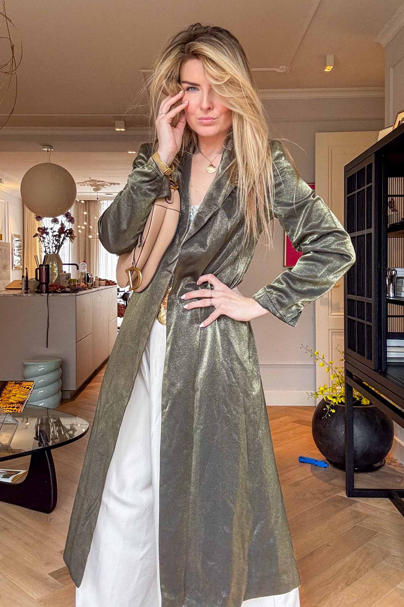 Flowing, elegant, and effortless. This sage green kaftan with a subtle satiny finish is perfect worn over pants or dresses, adding a chic, slightly bohemian vibe to spring looks. The maxi length gives it a graceful movement.