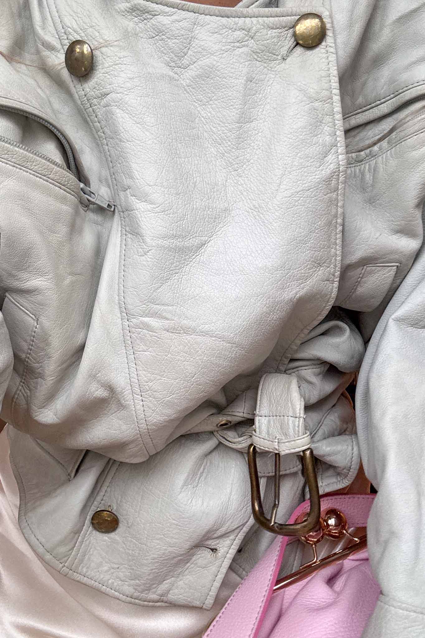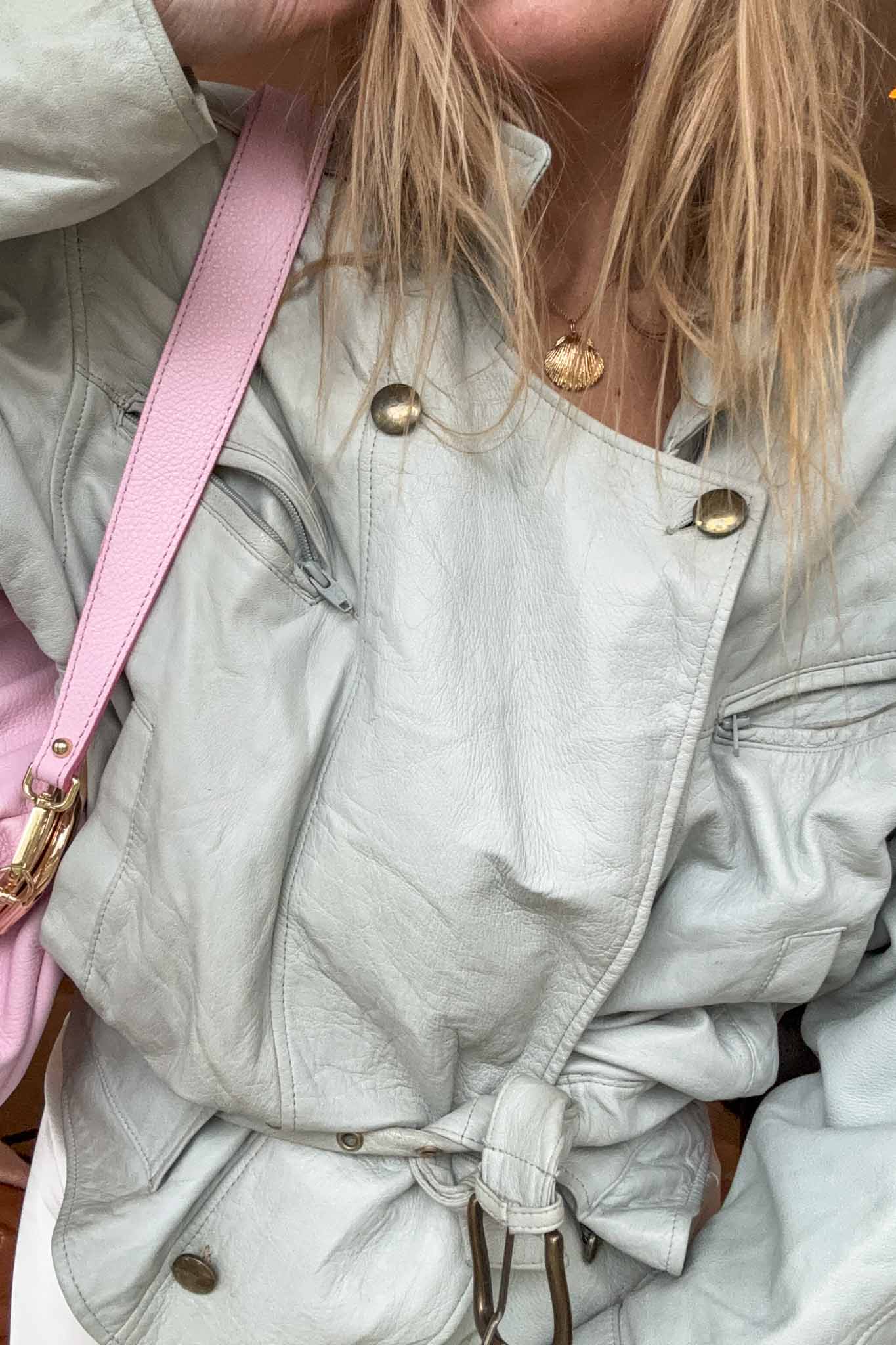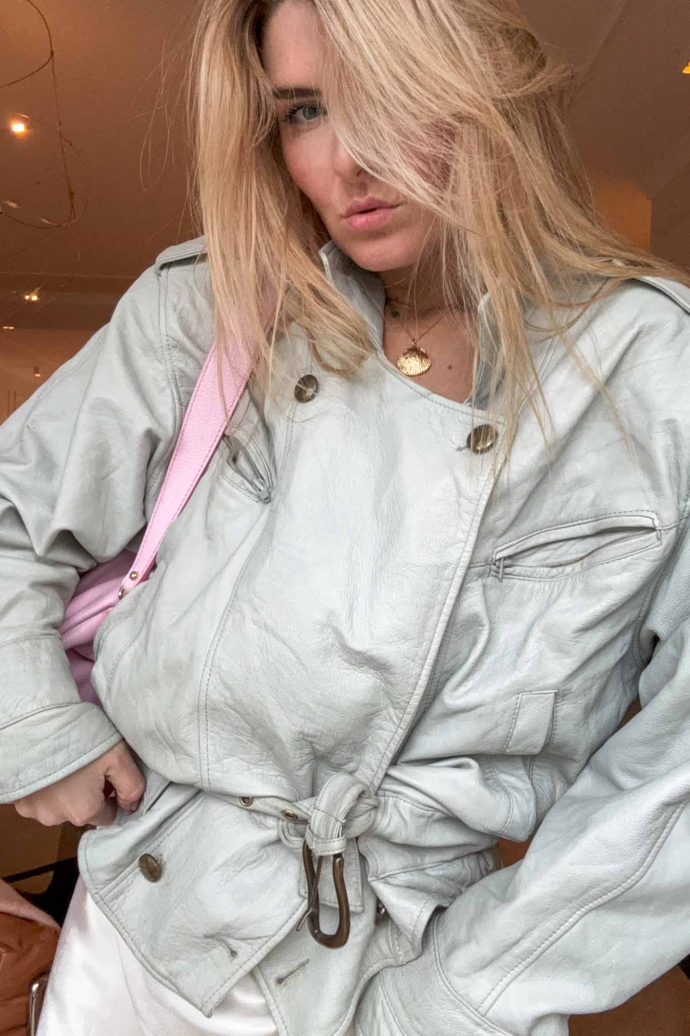 The Baby Blue 80s Jacket is a standout vintage leather piece with a soft puffy silhouette and belted waist. Crafted from light blue calf leather, it brings bold retro energy while remaining wearable and flattering.