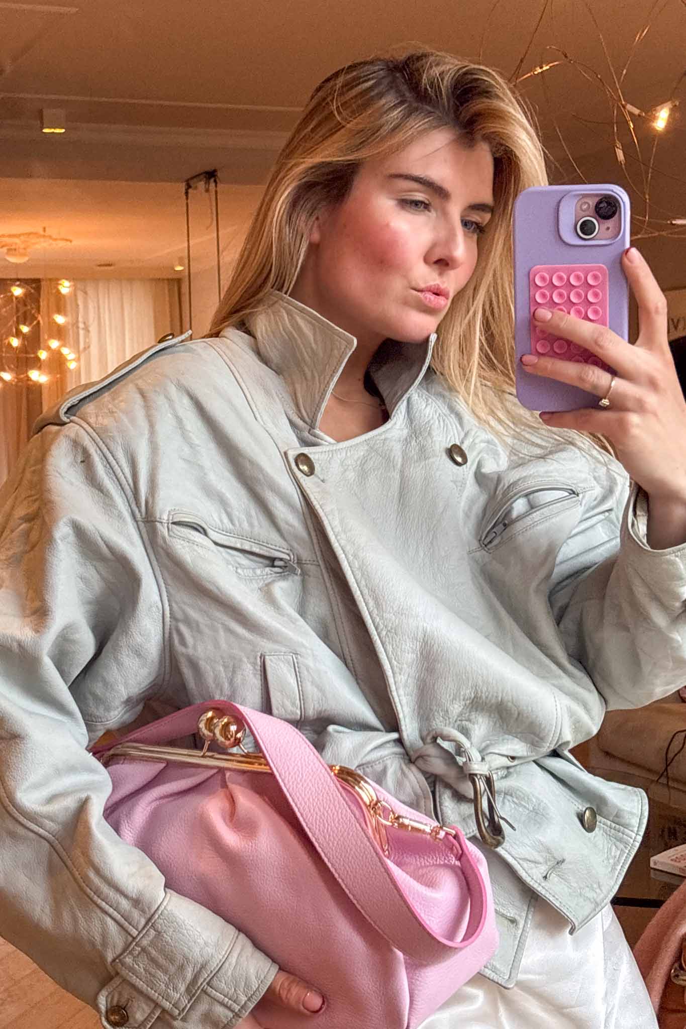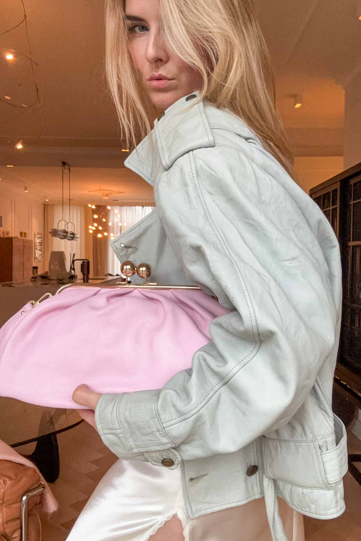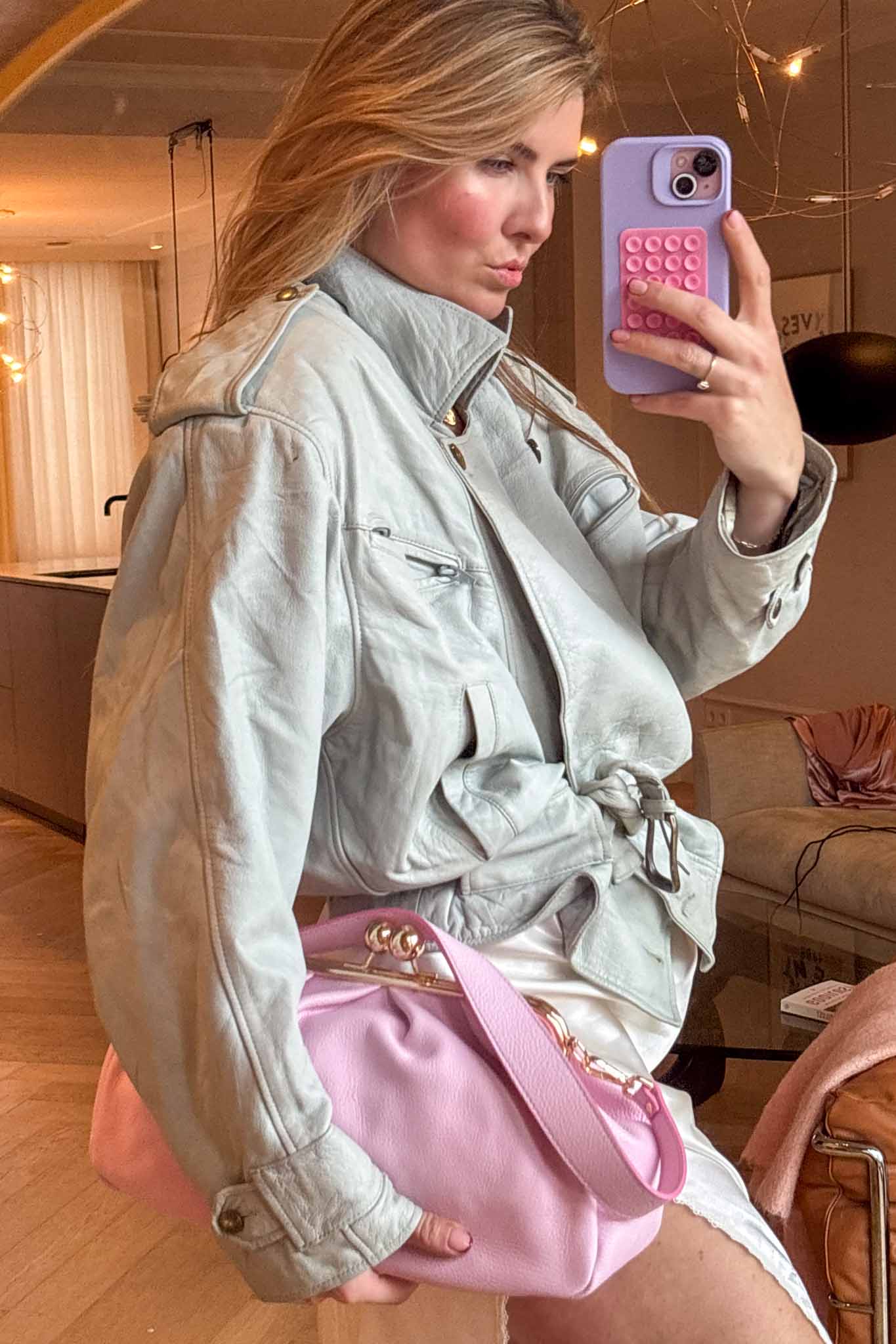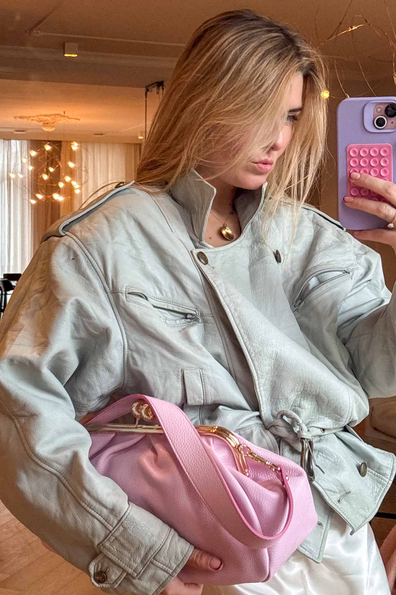 The Baby Blue 80s Jacket is a standout vintage leather piece with a soft puffy silhouette and belted waist. Crafted from light blue calf leather, it brings bold retro energy while remaining wearable and flattering.