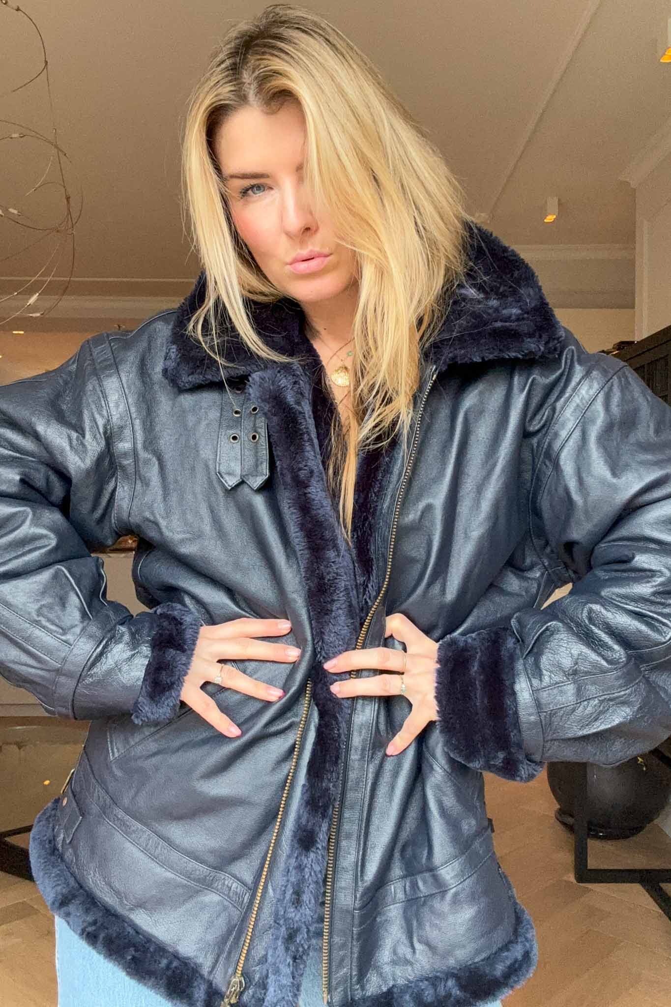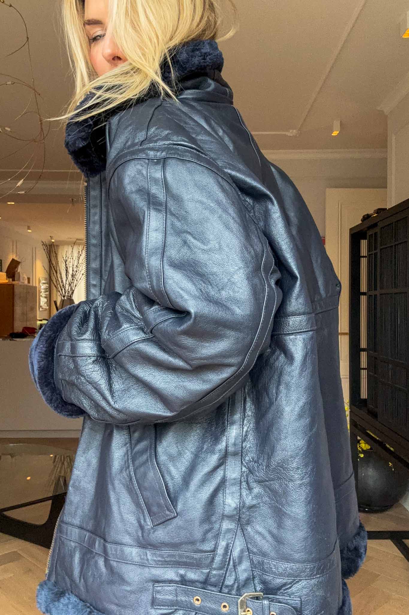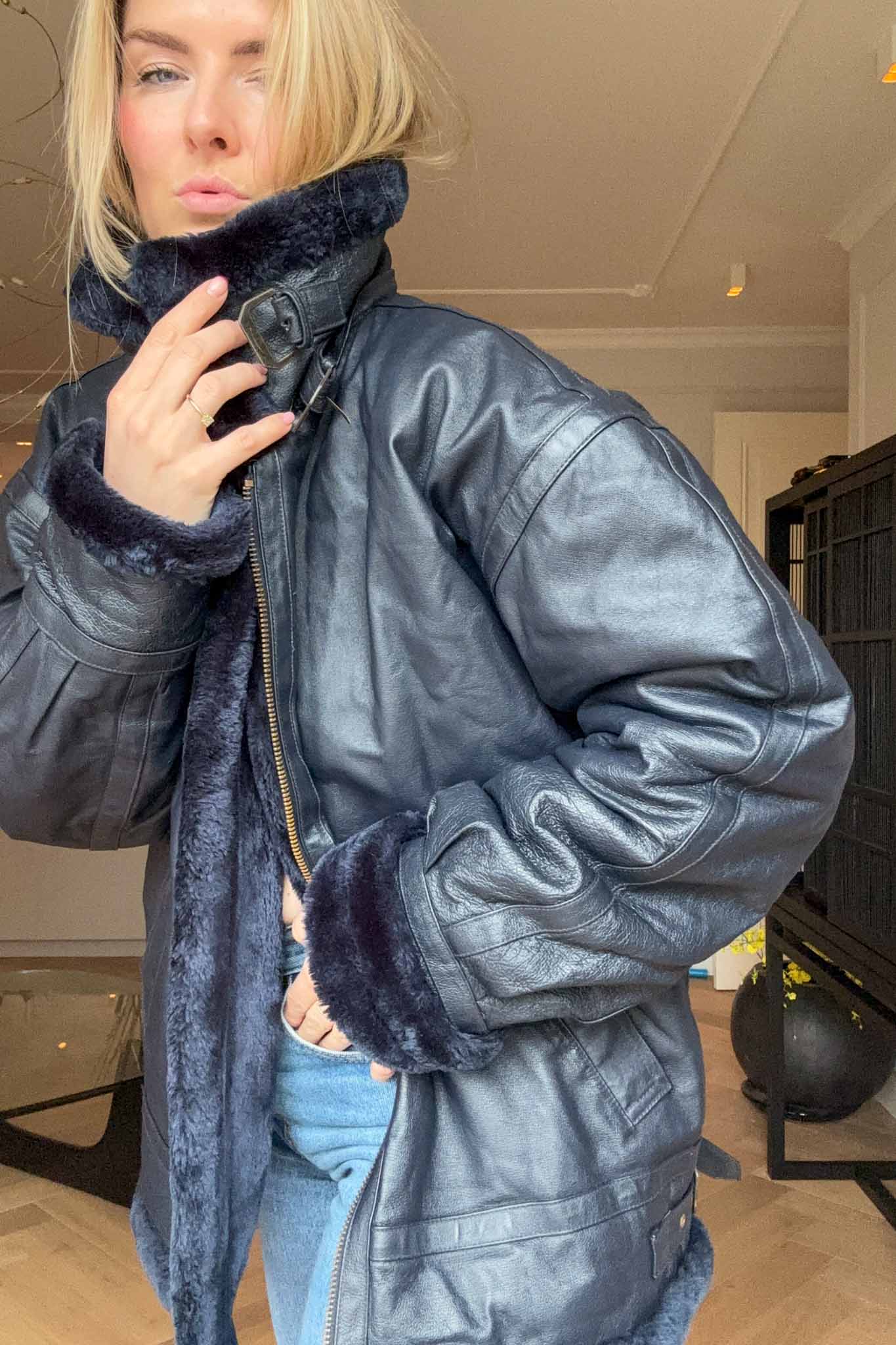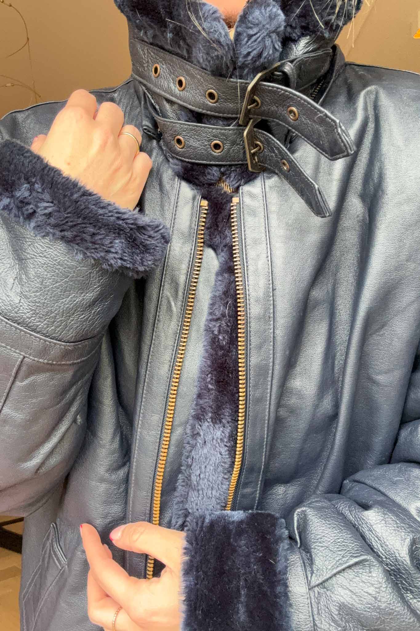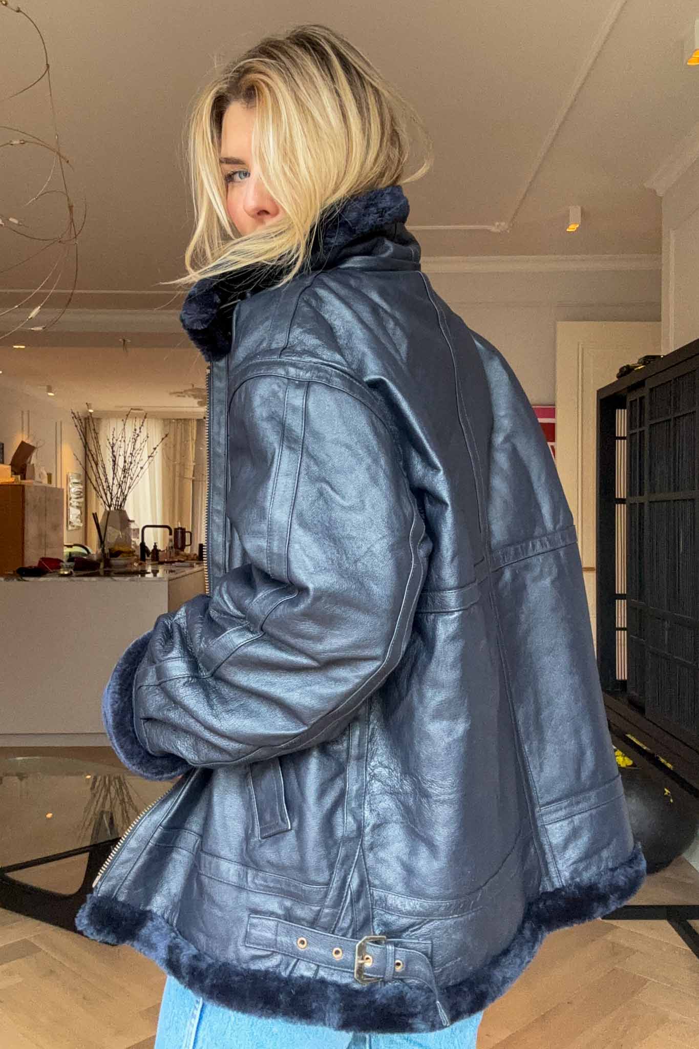 The Blue Bombshell Lammy Coat is a rare vintage statement crafted from metallic blue leather with a full sherling lining. Designed with belted hook details at the neckline, it can be worn fully closed for warmth or styled open with the collar folded down. Bold yet luxurious, this coat combines comfort with strong character.