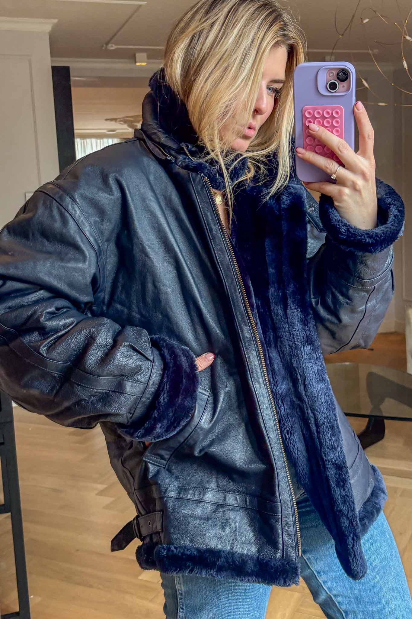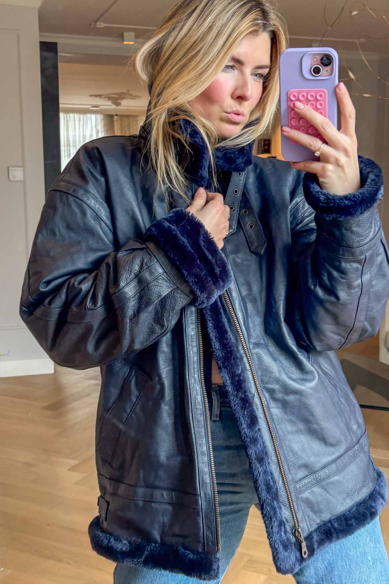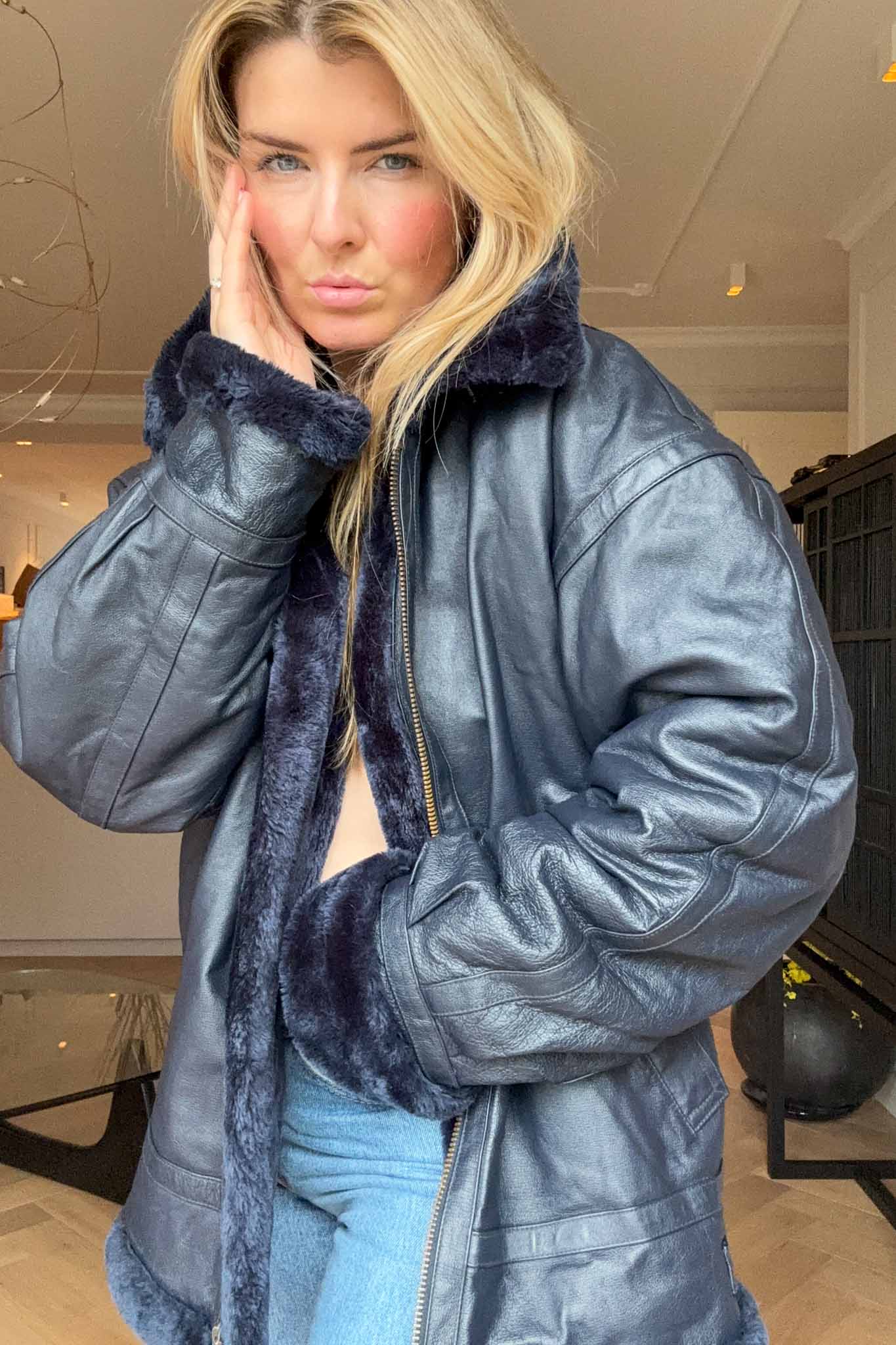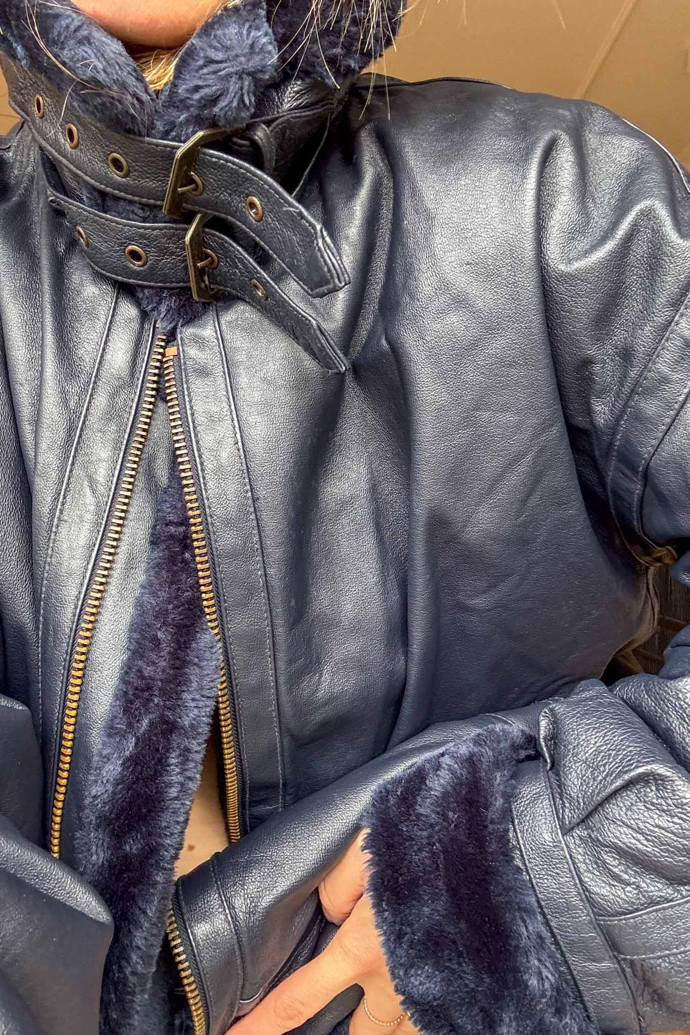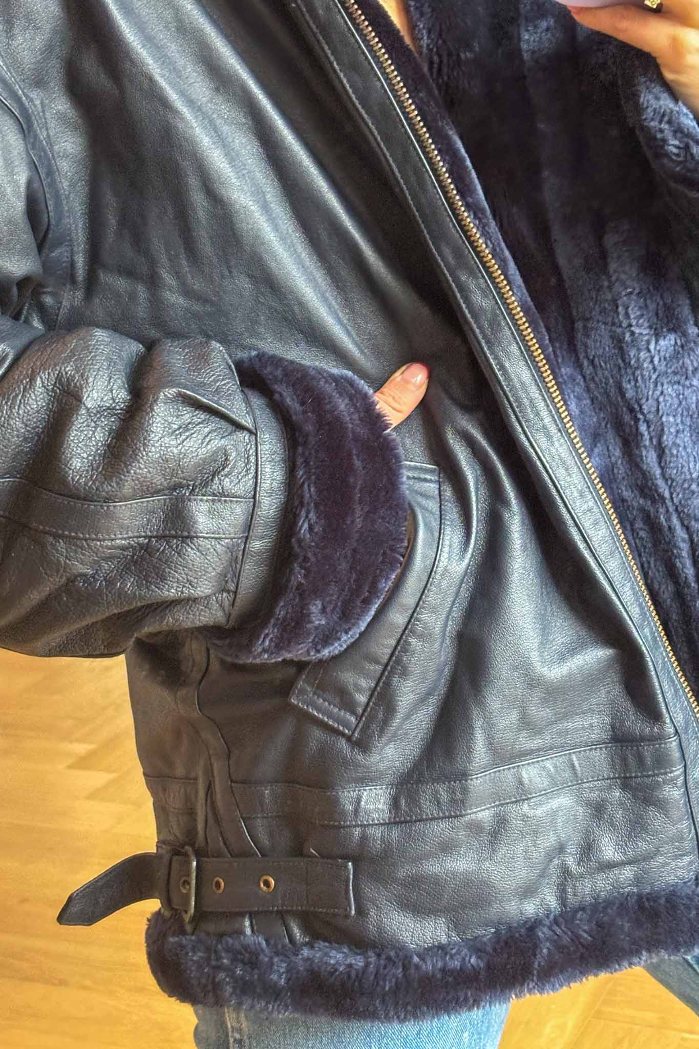 The Blue Bombshell Lammy Coat is a rare vintage statement crafted from metallic blue leather with a full sherling lining. Designed with belted hook details at the neckline, it can be worn fully closed for warmth or styled open with the collar folded down. Bold yet luxurious, this coat combines comfort with strong character.
