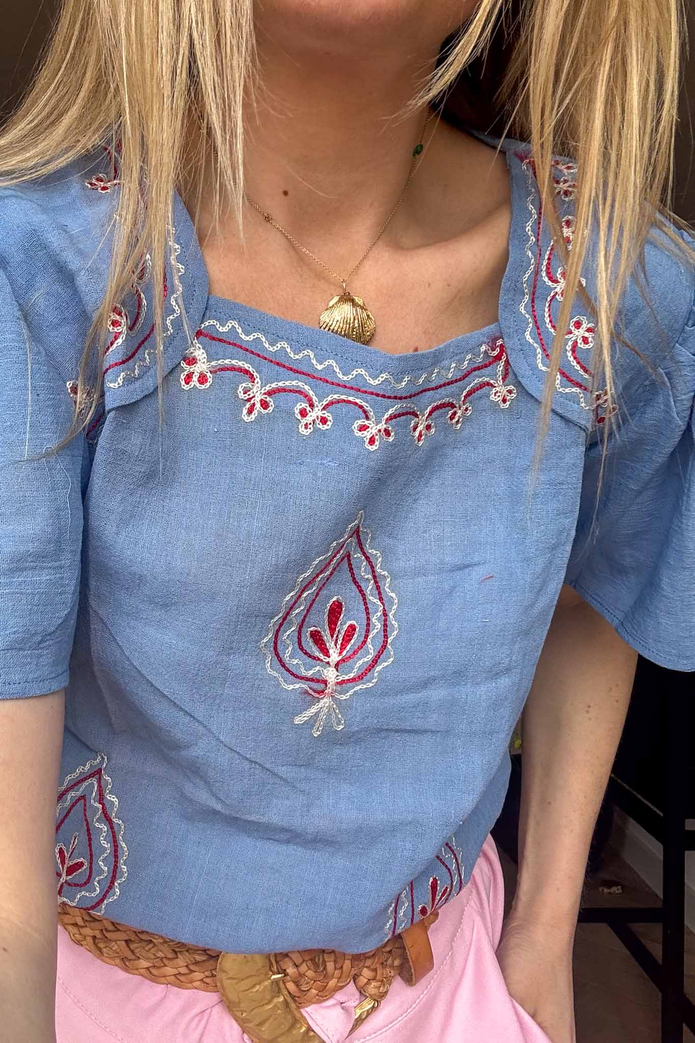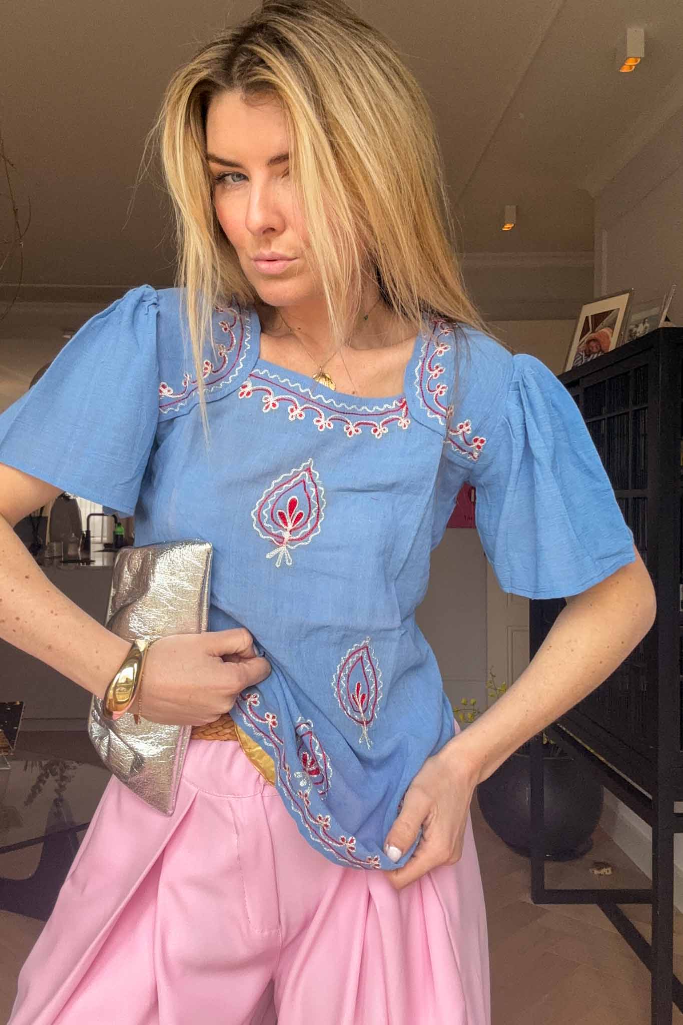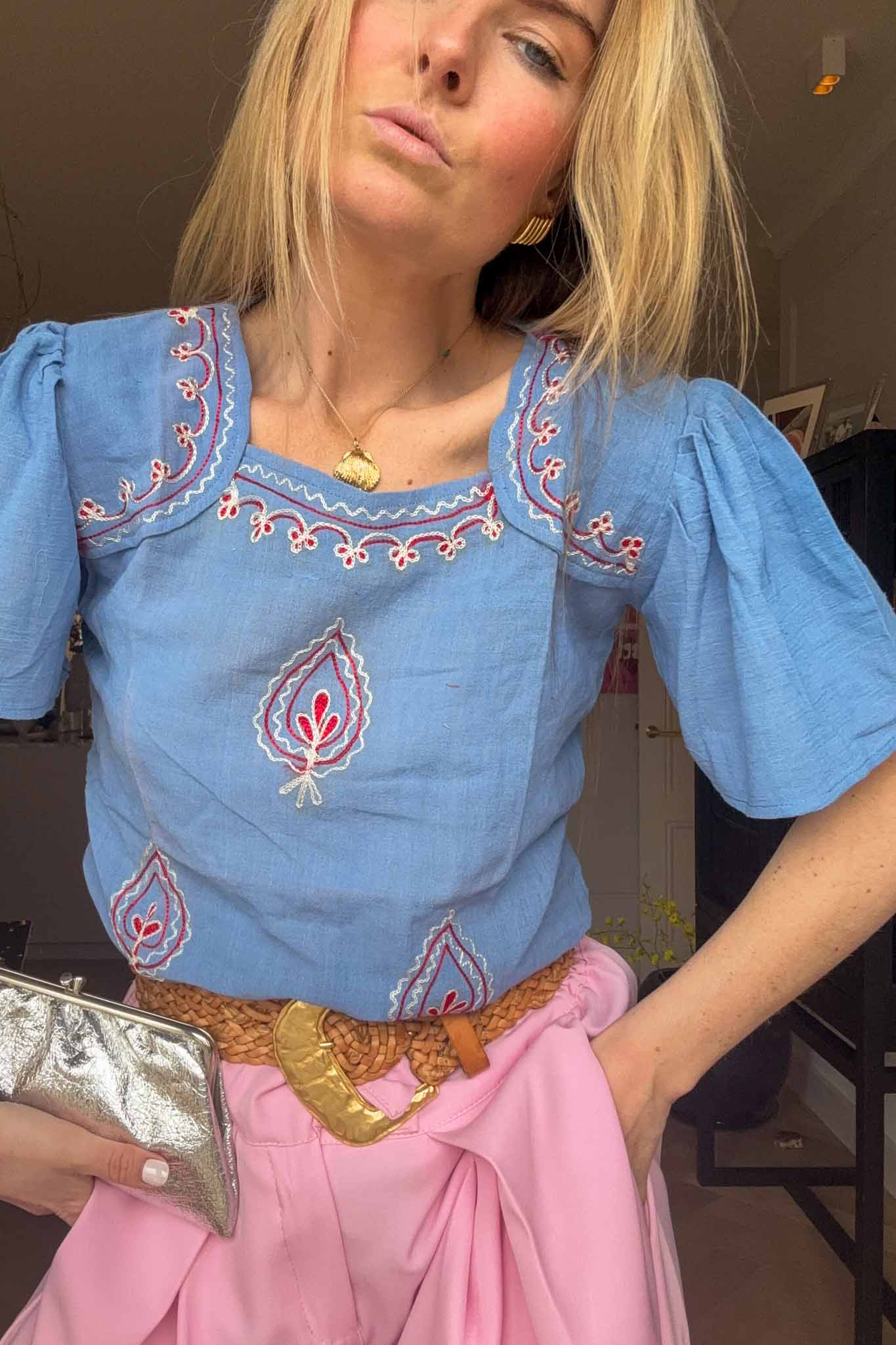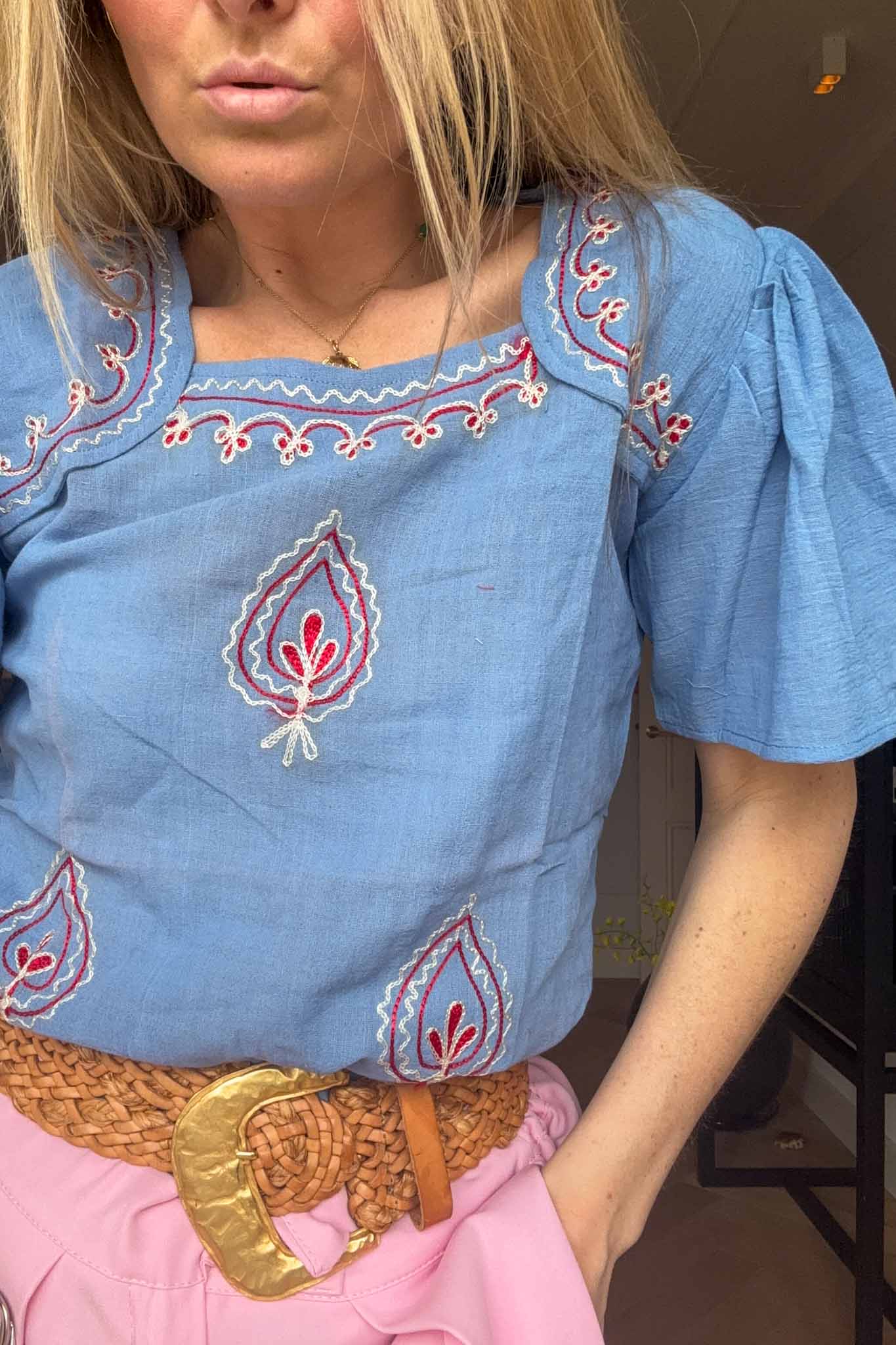 A stunning handpicked Indian cotton blouse with beautiful embroidered details and a light, airy feel. The plissé detailing on the shoulders gives it a soft romantic silhouette while the short sleeves make it perfect for warm days.