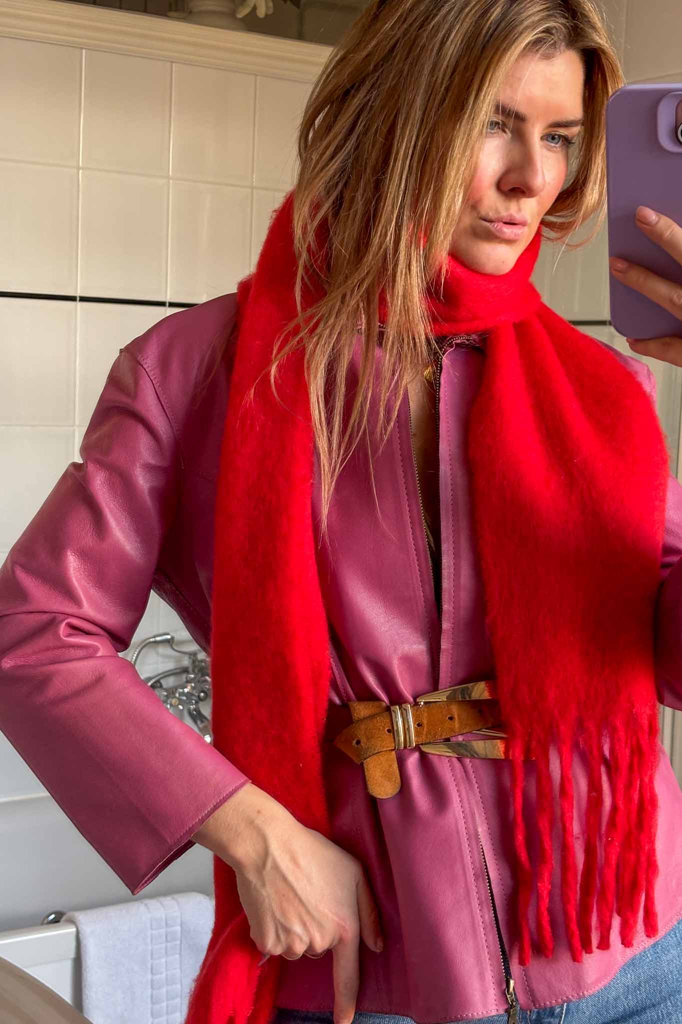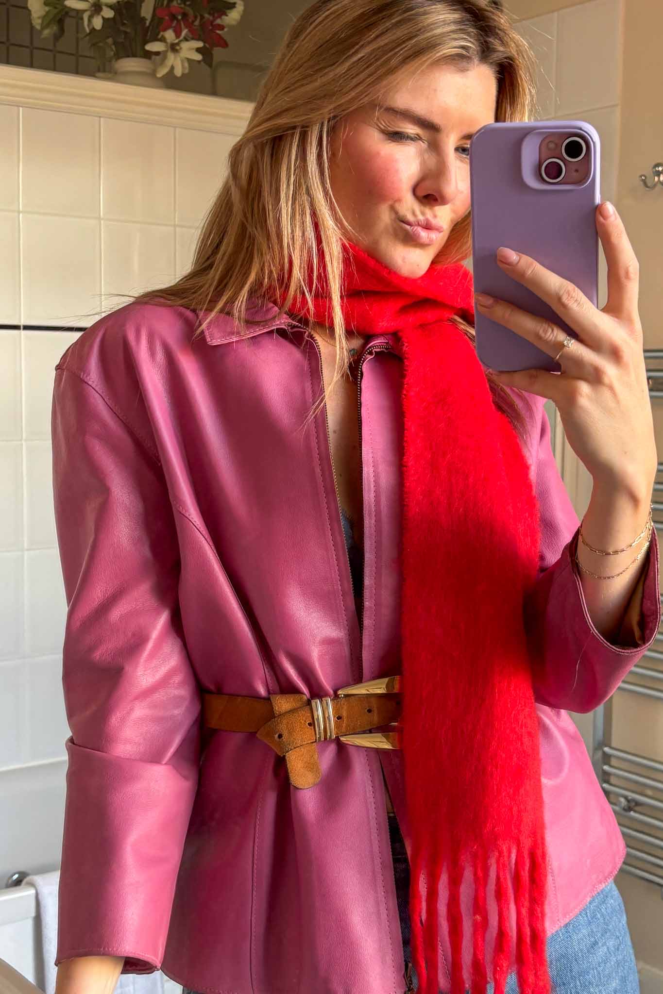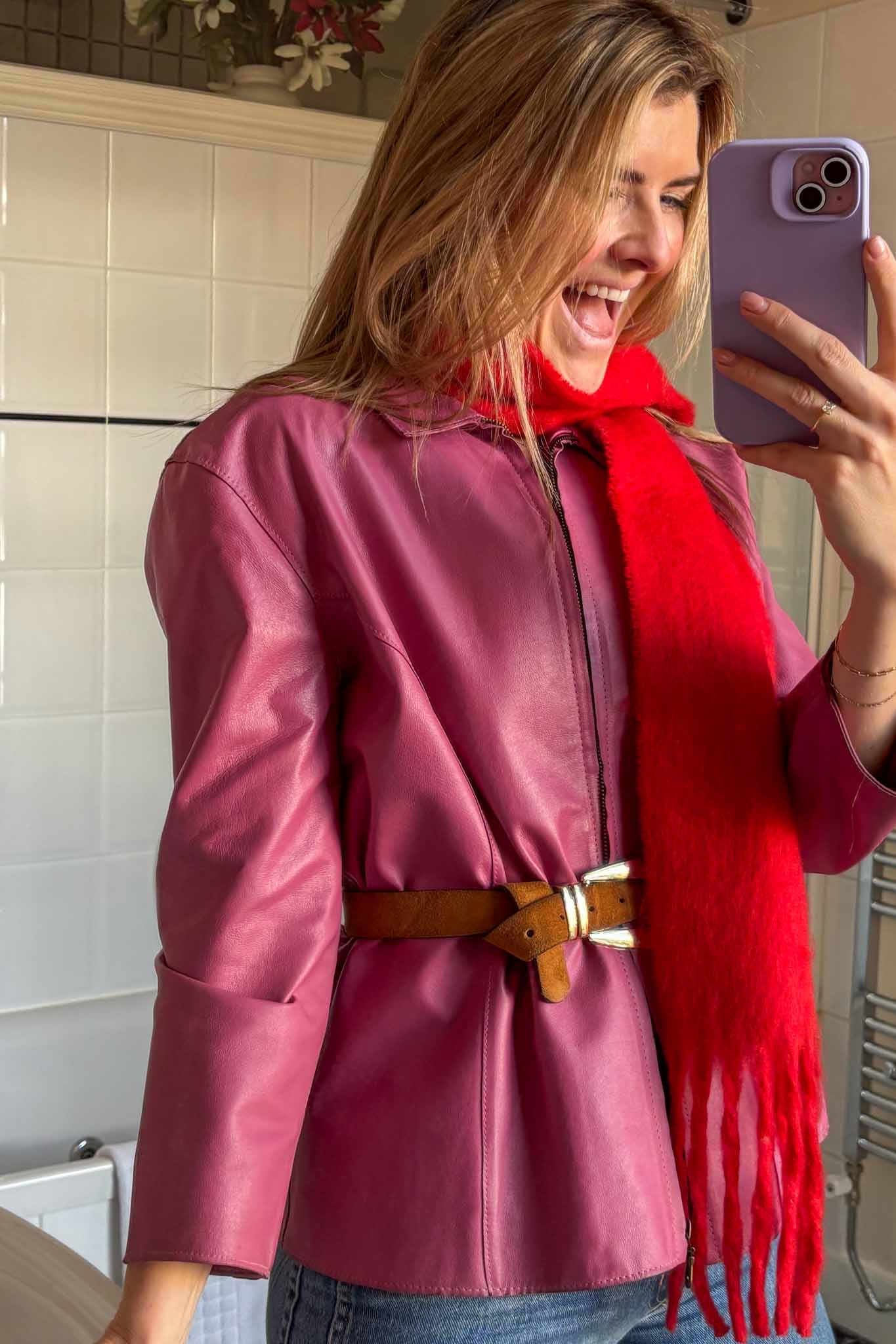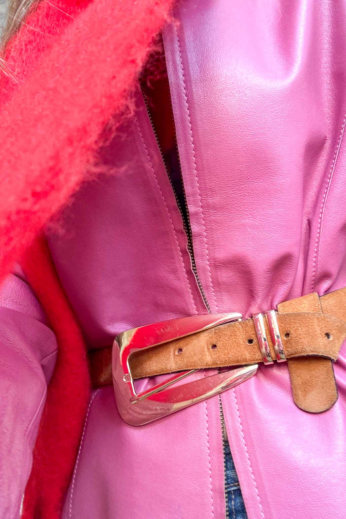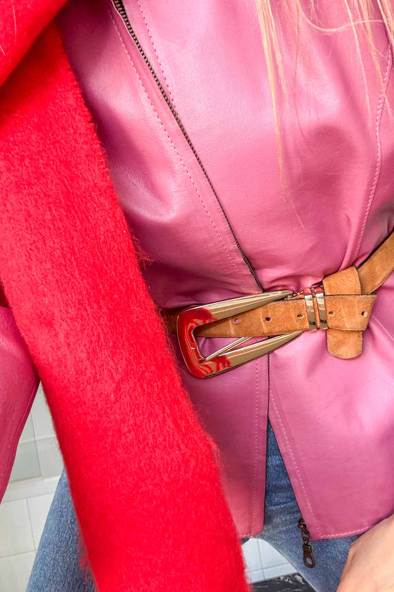 Effortlessly chic with a touch of edge, The blush rider leather jacket is the ultimate staple for any wardrobe. Crafted from supple pink leather, this short-length beauty features a sleek front zipper and a classic collar for a refined yet modern look. Its minimalist design allows for endless styling possibilities, making it the perfect piece to throw over a dress or pair with your favorite denim. A timeless essential with a soft feminine twist, this jacket is where sophistication meets cool. This jacket was steamed and cleaned.