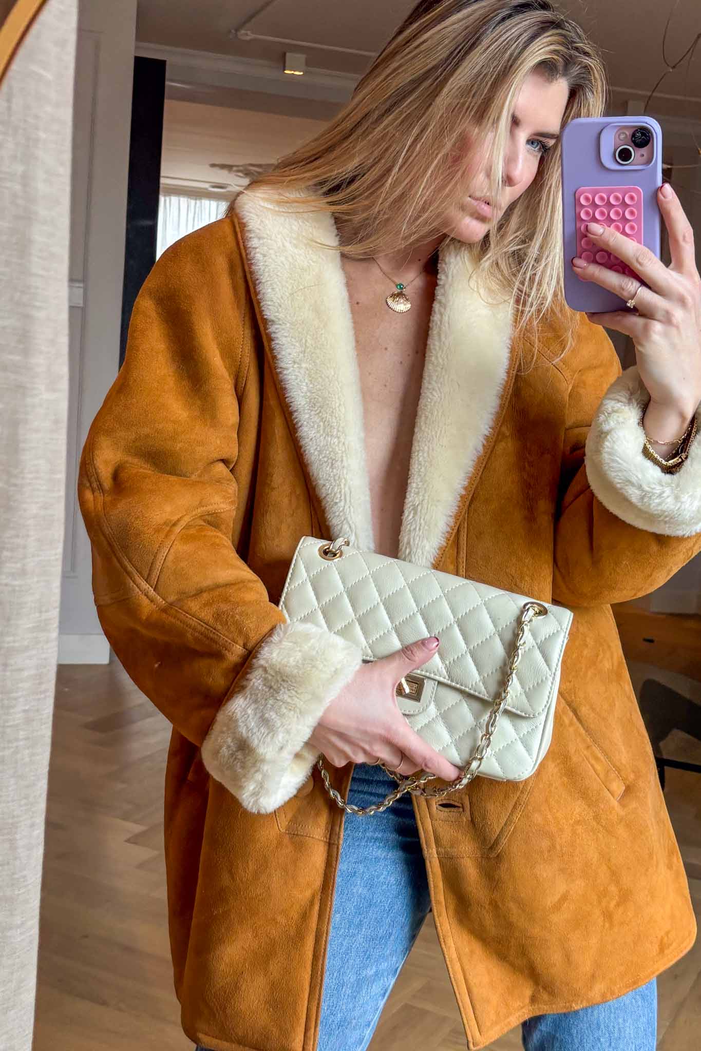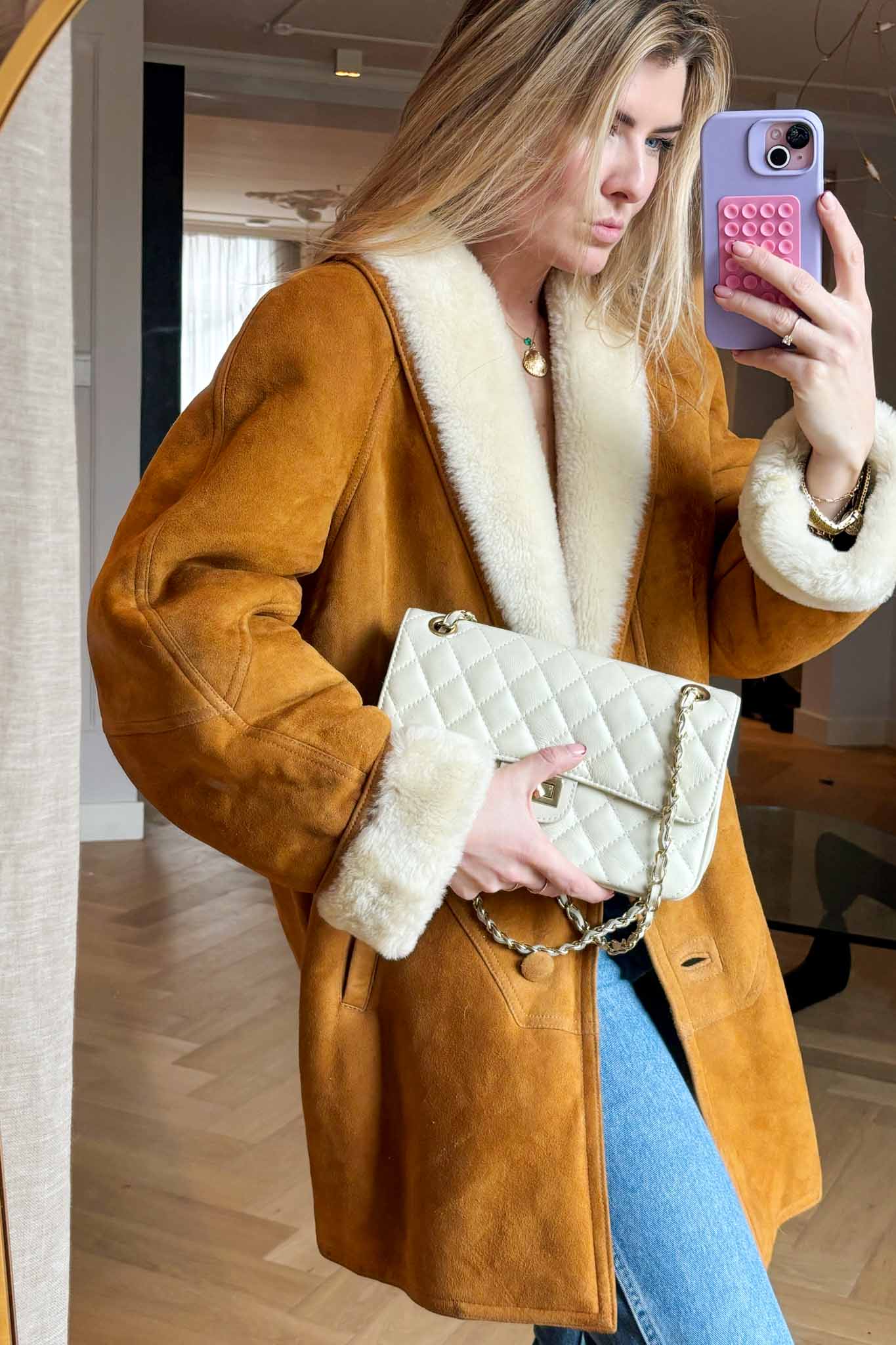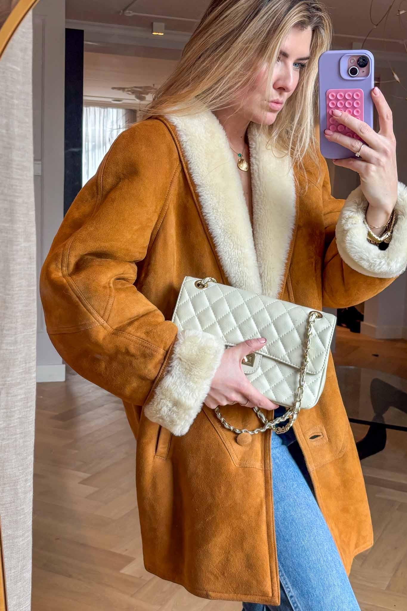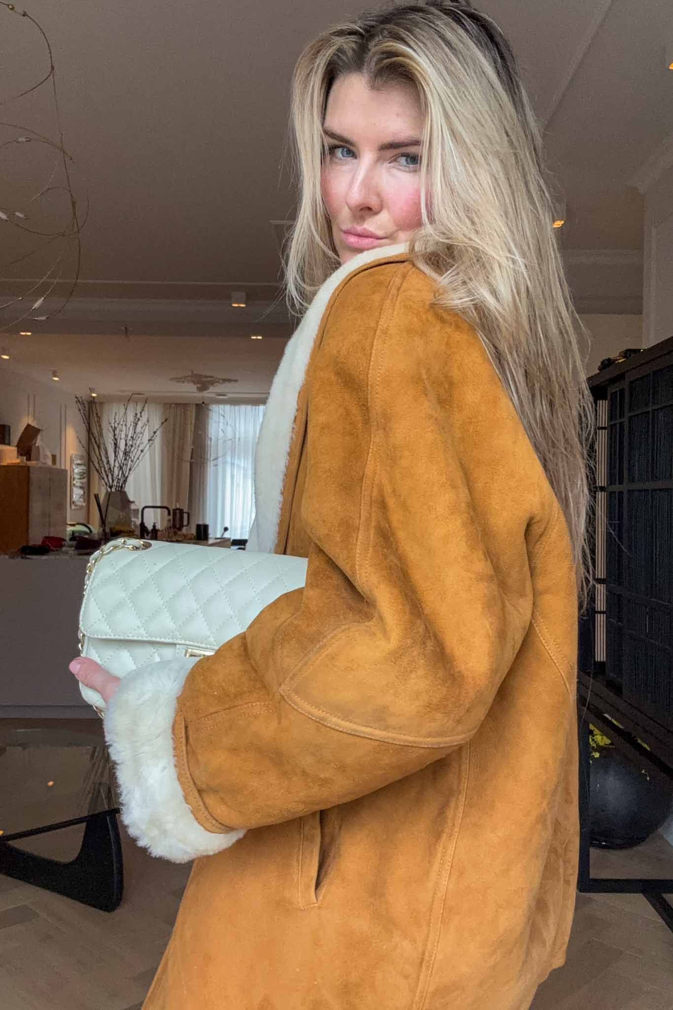 The Cognac Classic Lammy Coat is a timeless suede coat lined with soft cream sherling. Elegant, warm, and effortlessly chic, it features a clean silhouette that works both casually and dressed up. A true forever winter piece.