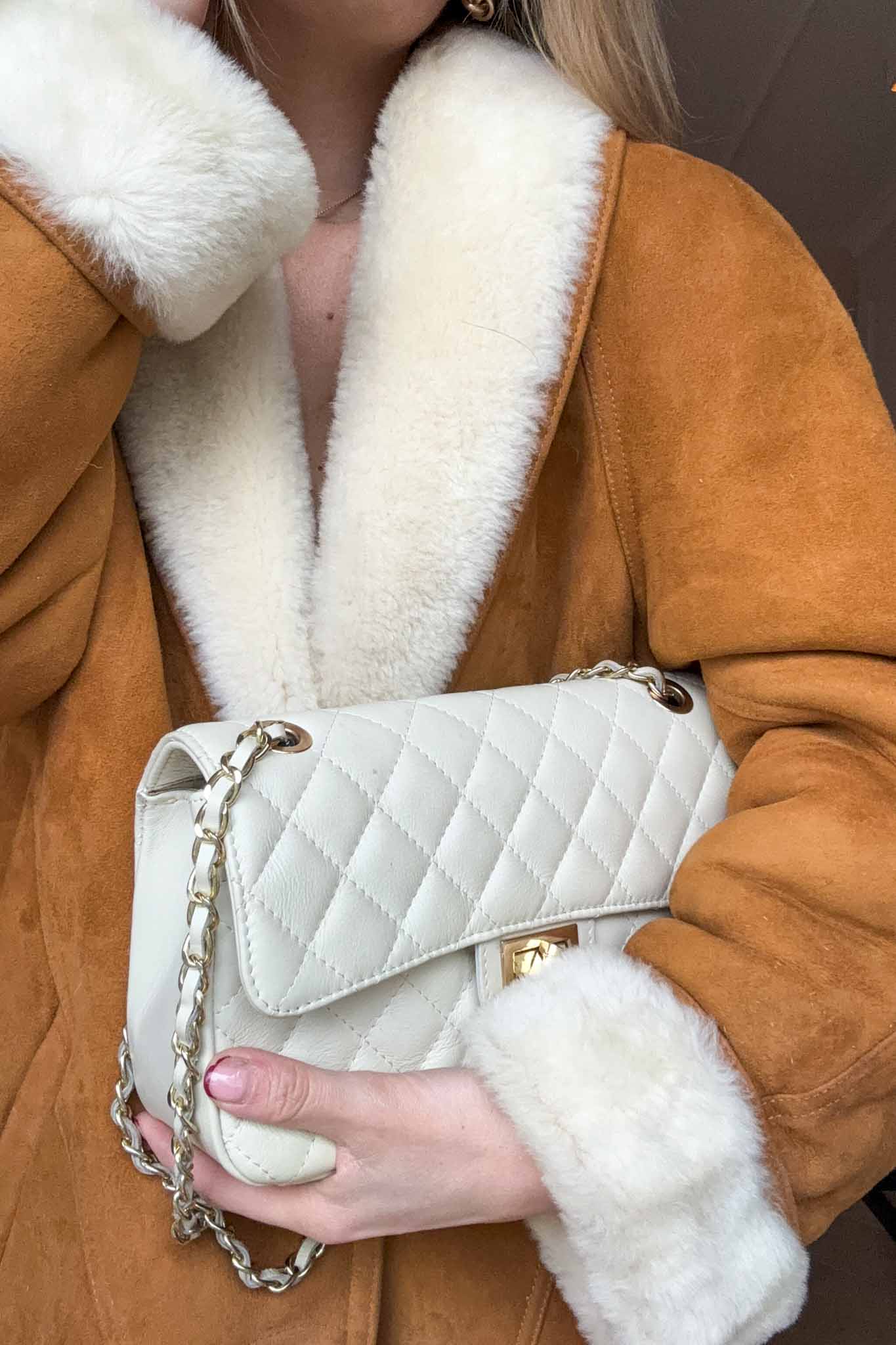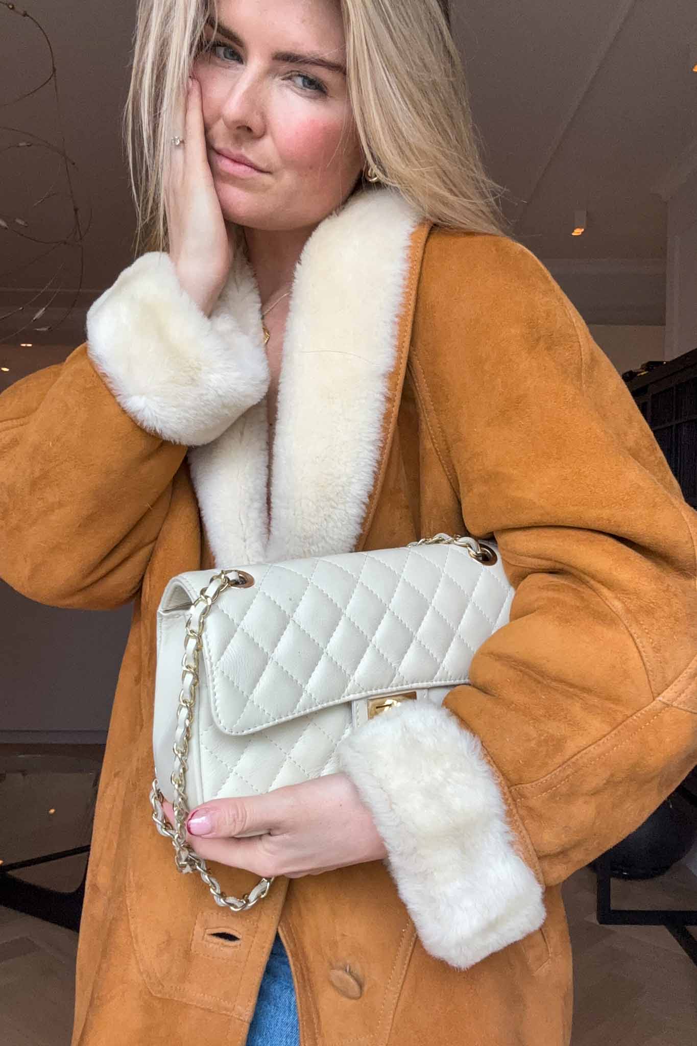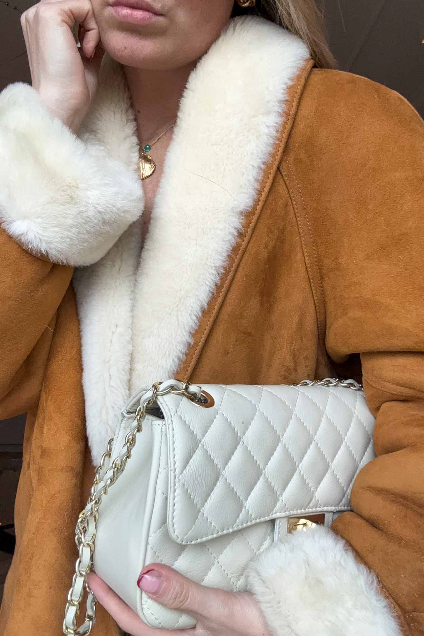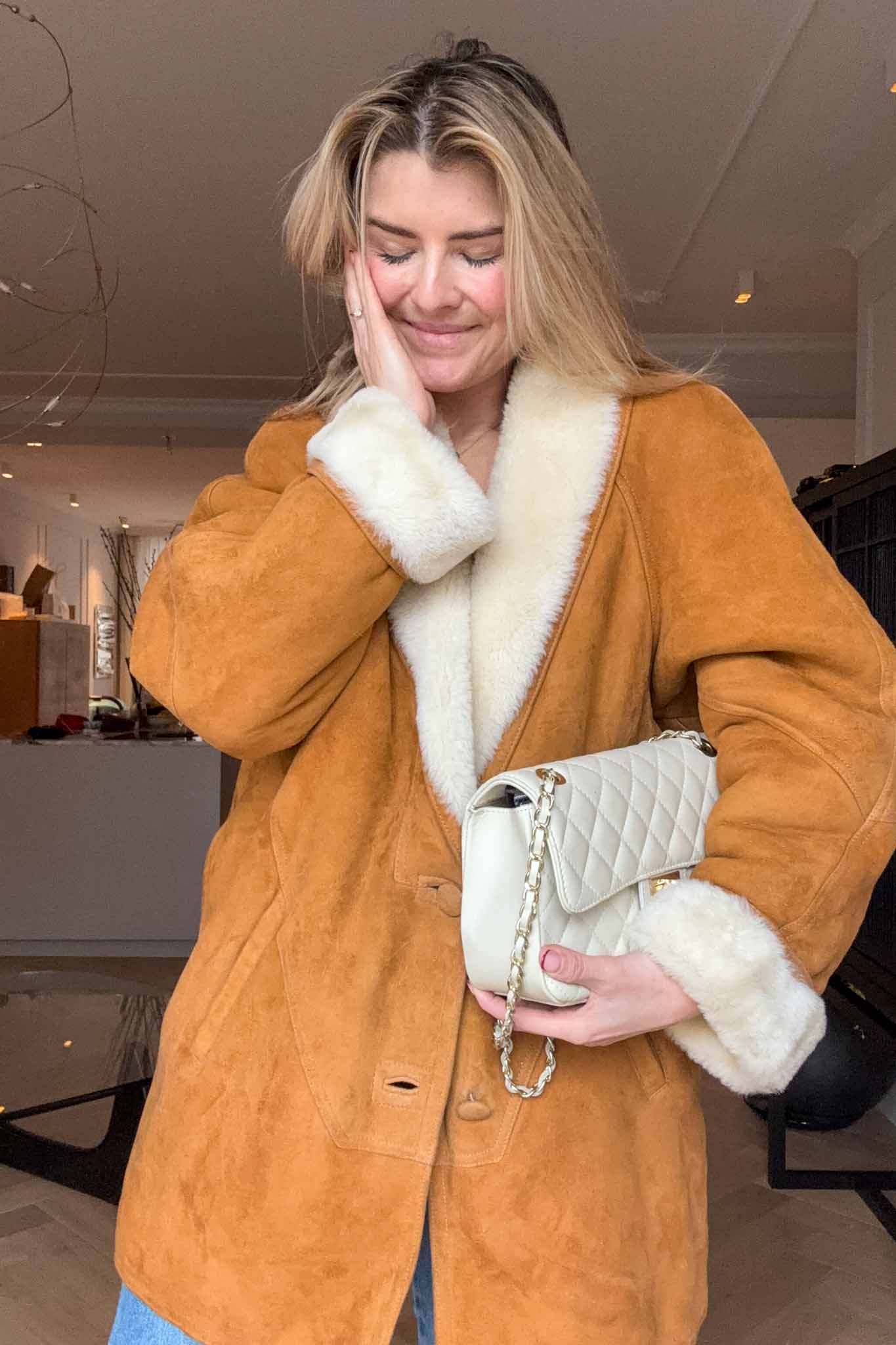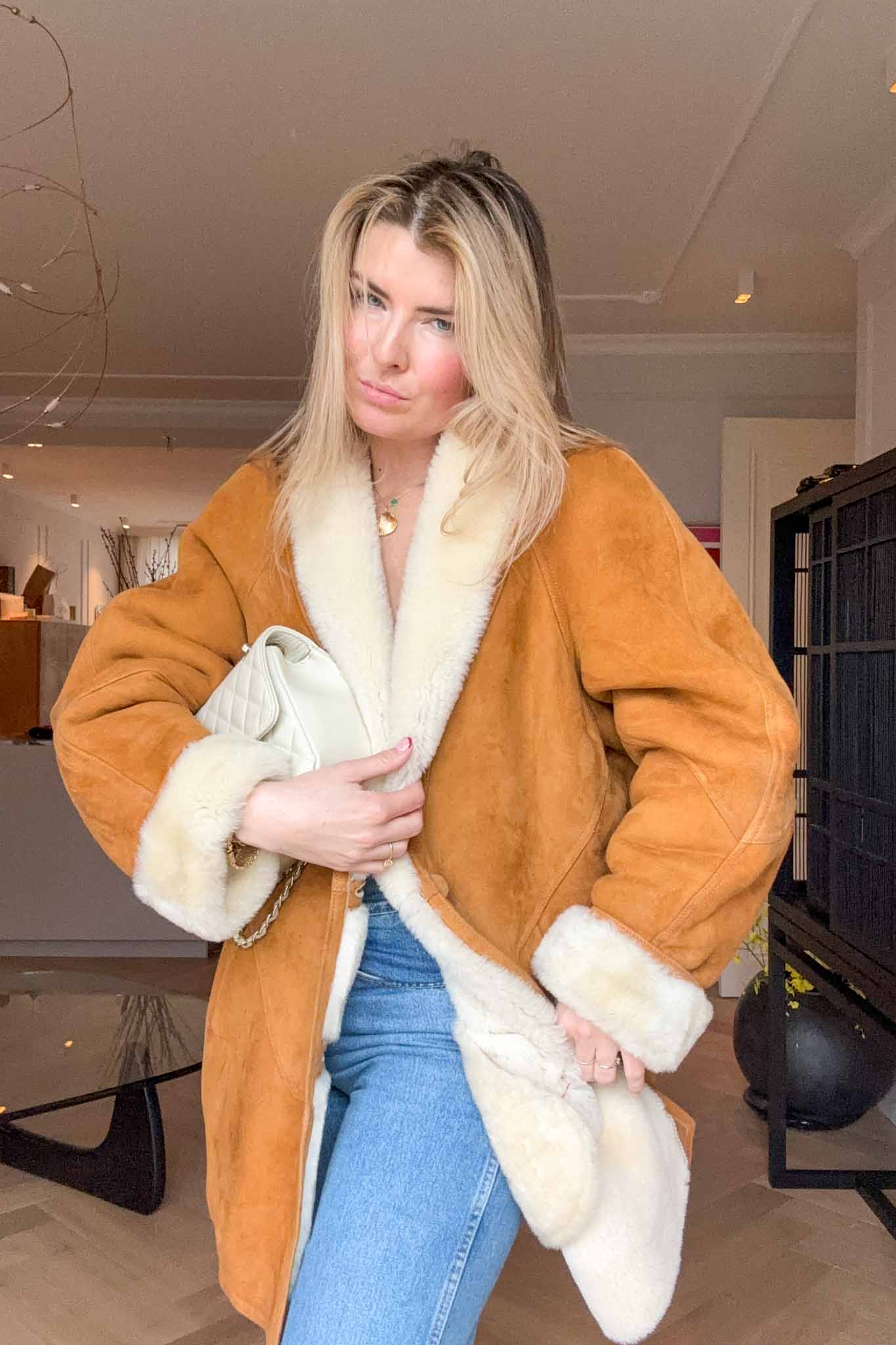 The Cognac Classic Lammy Coat is a timeless suede coat lined with soft cream sherling. Elegant, warm, and effortlessly chic, it features a clean silhouette that works both casually and dressed up. A true forever winter piece.