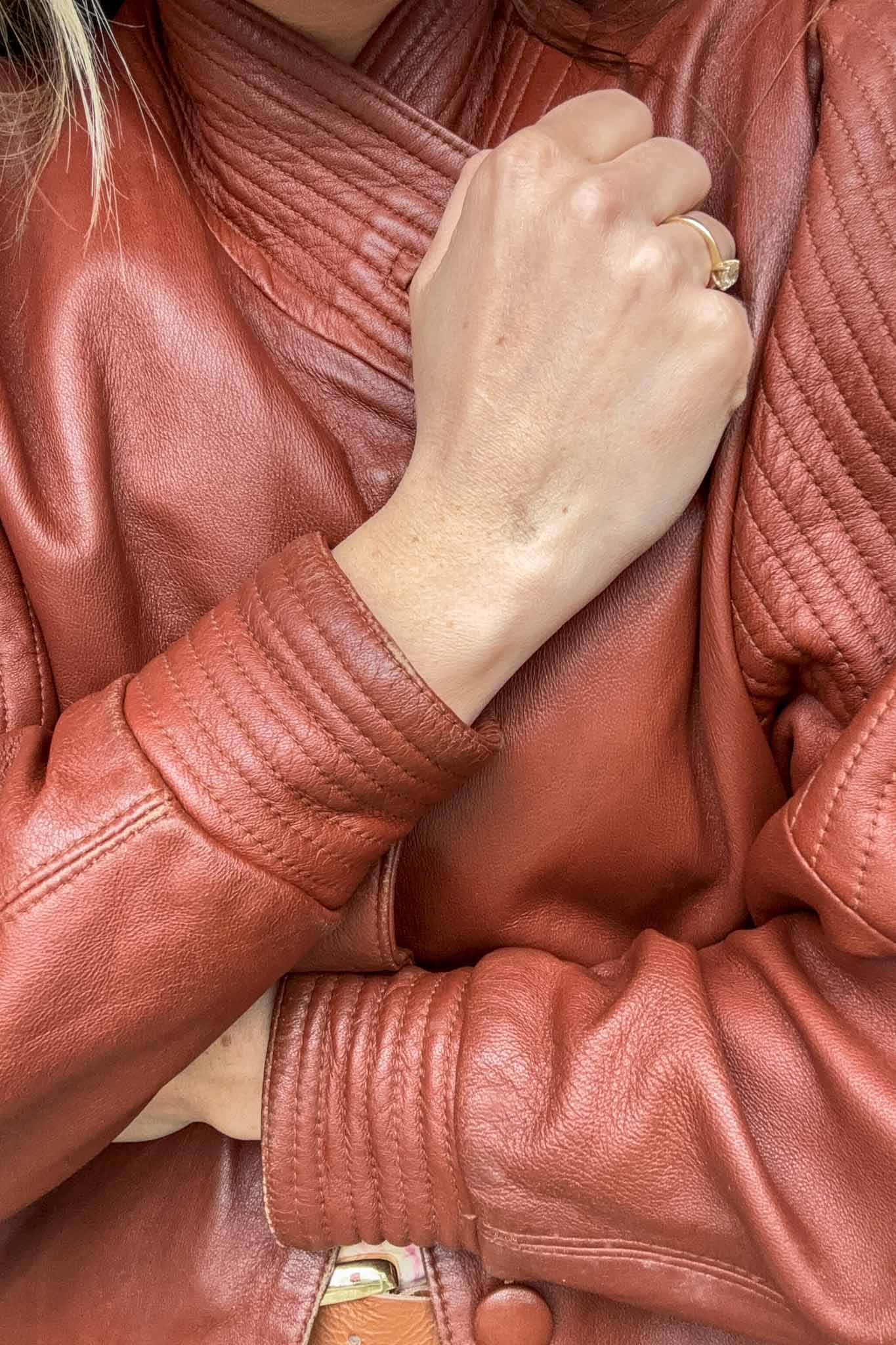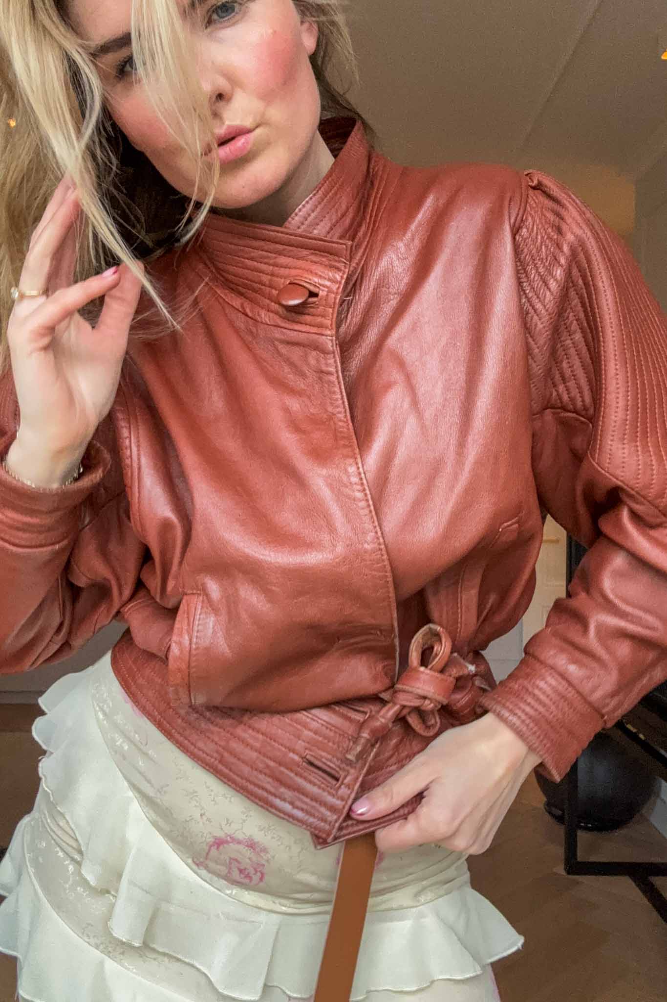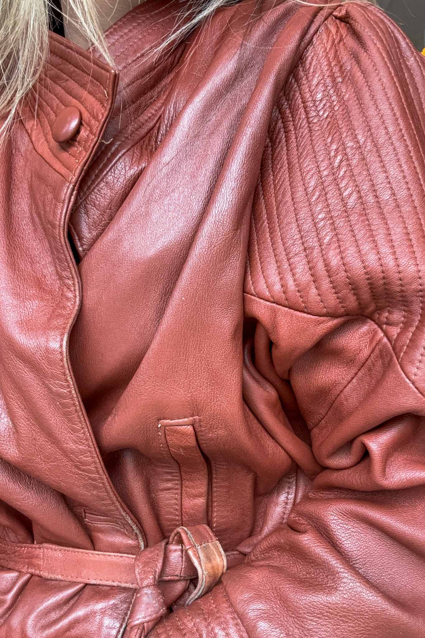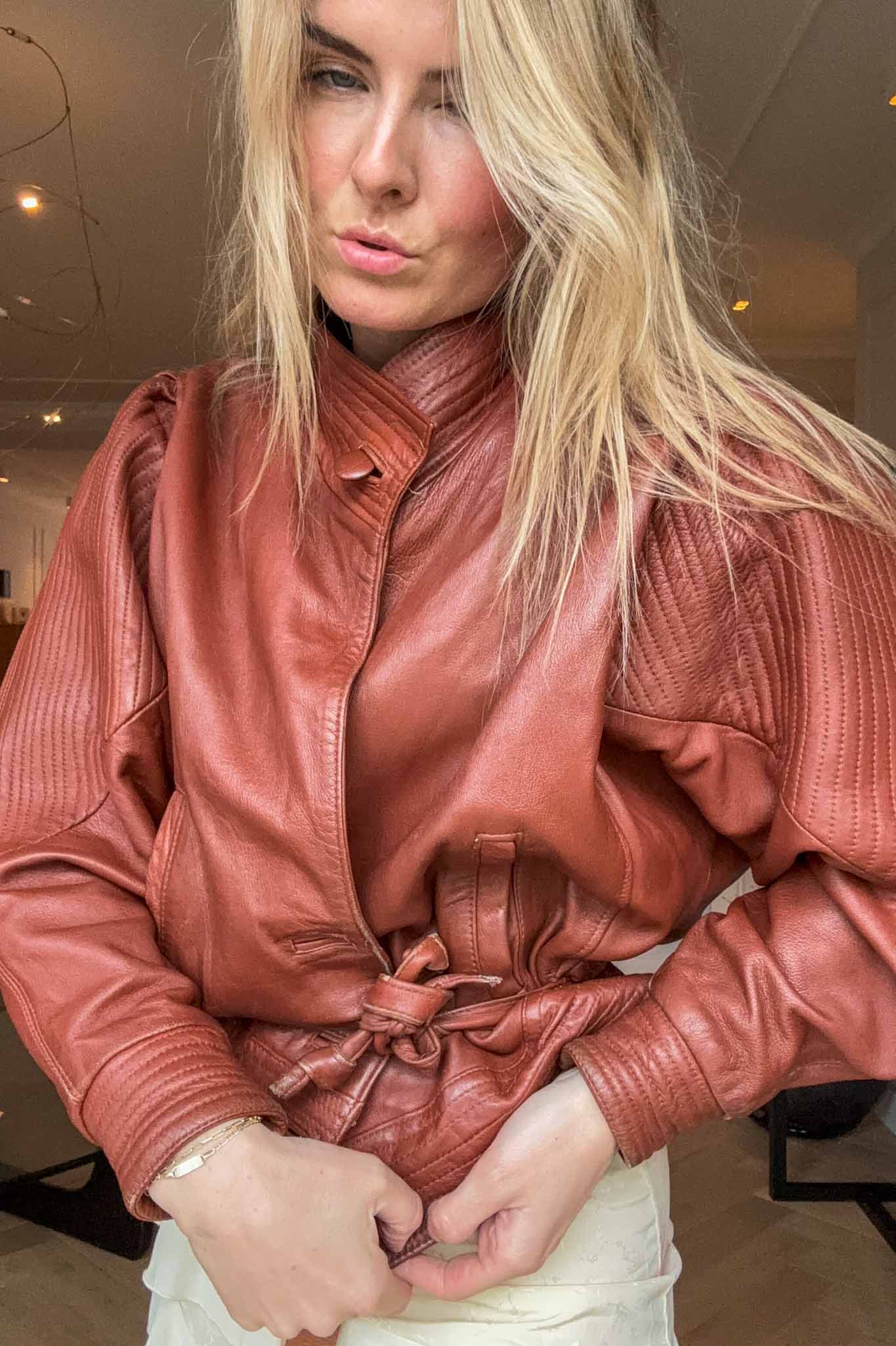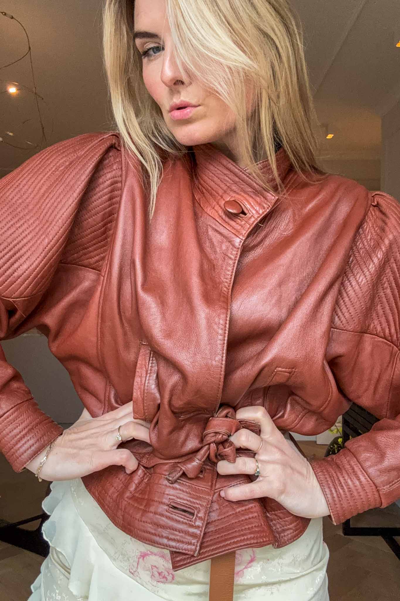 The Cognac Icon Jacket is a sculptural leather piece with balloon sleeves, cinched waist belt, and strong structured stitching. Inspired by high-end designer tailoring.