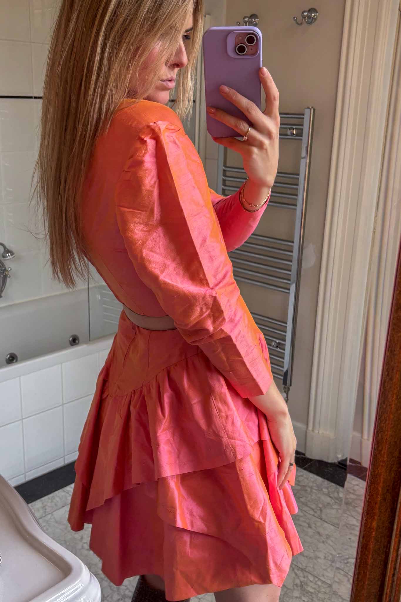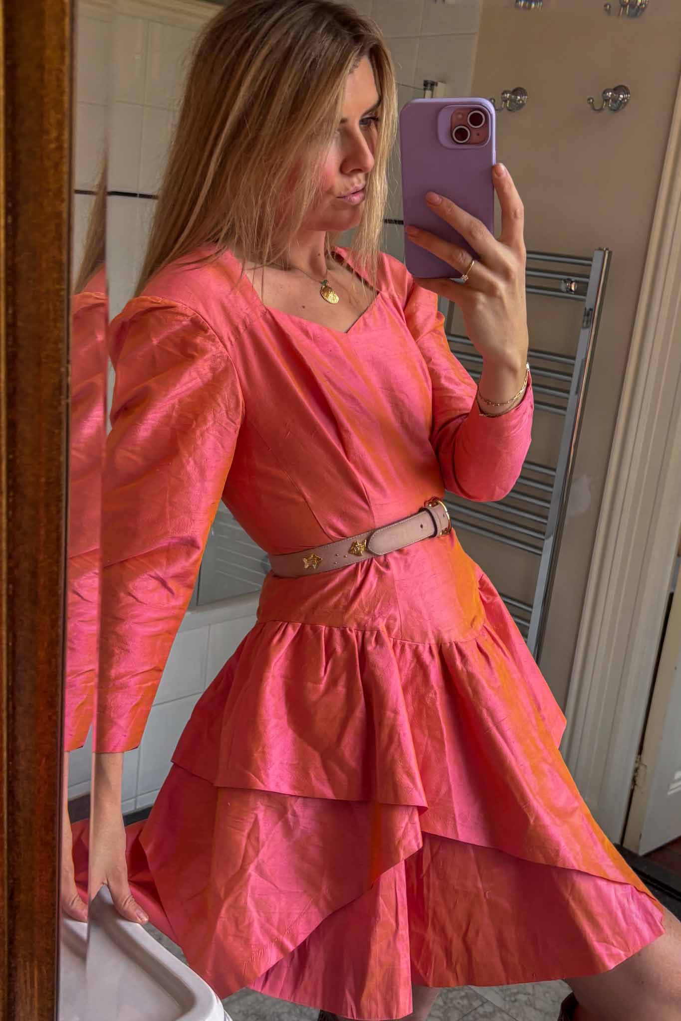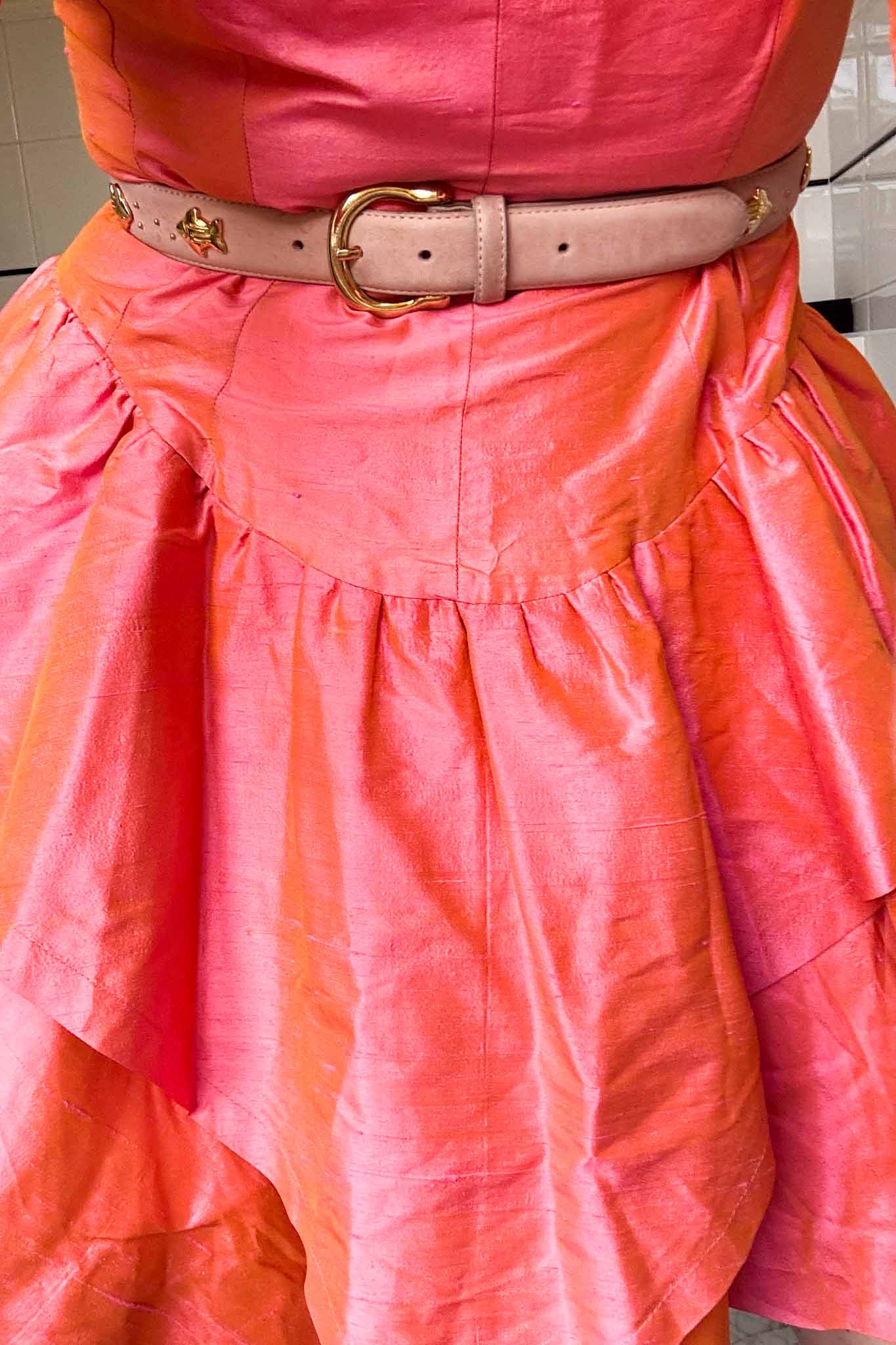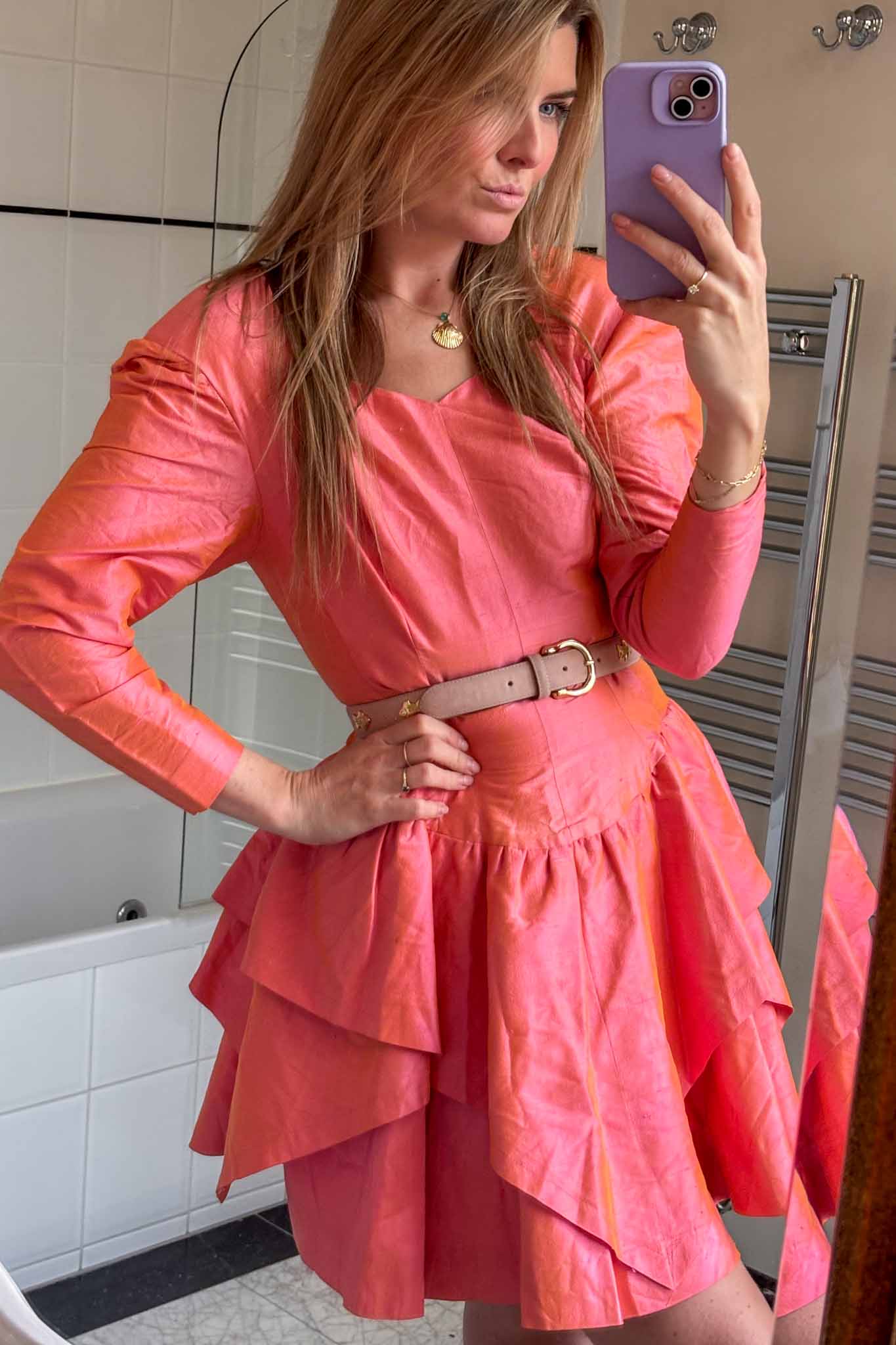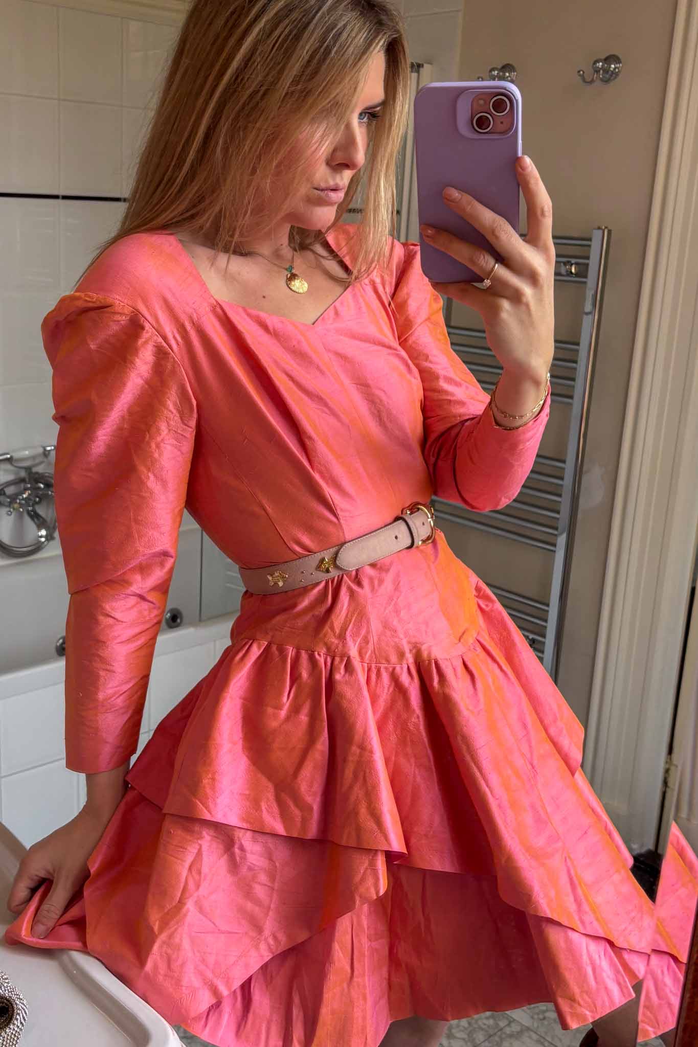Elevate your holiday wardrobe with this stunning coral raw silk A-line peplum dress, a true one-of-a-kind piece that blends timeless elegance with modern sophistication. Crafted from luxurious raw silk, it has that subtle pearly sheen and rich texture that make coral look especially chic and luminous.