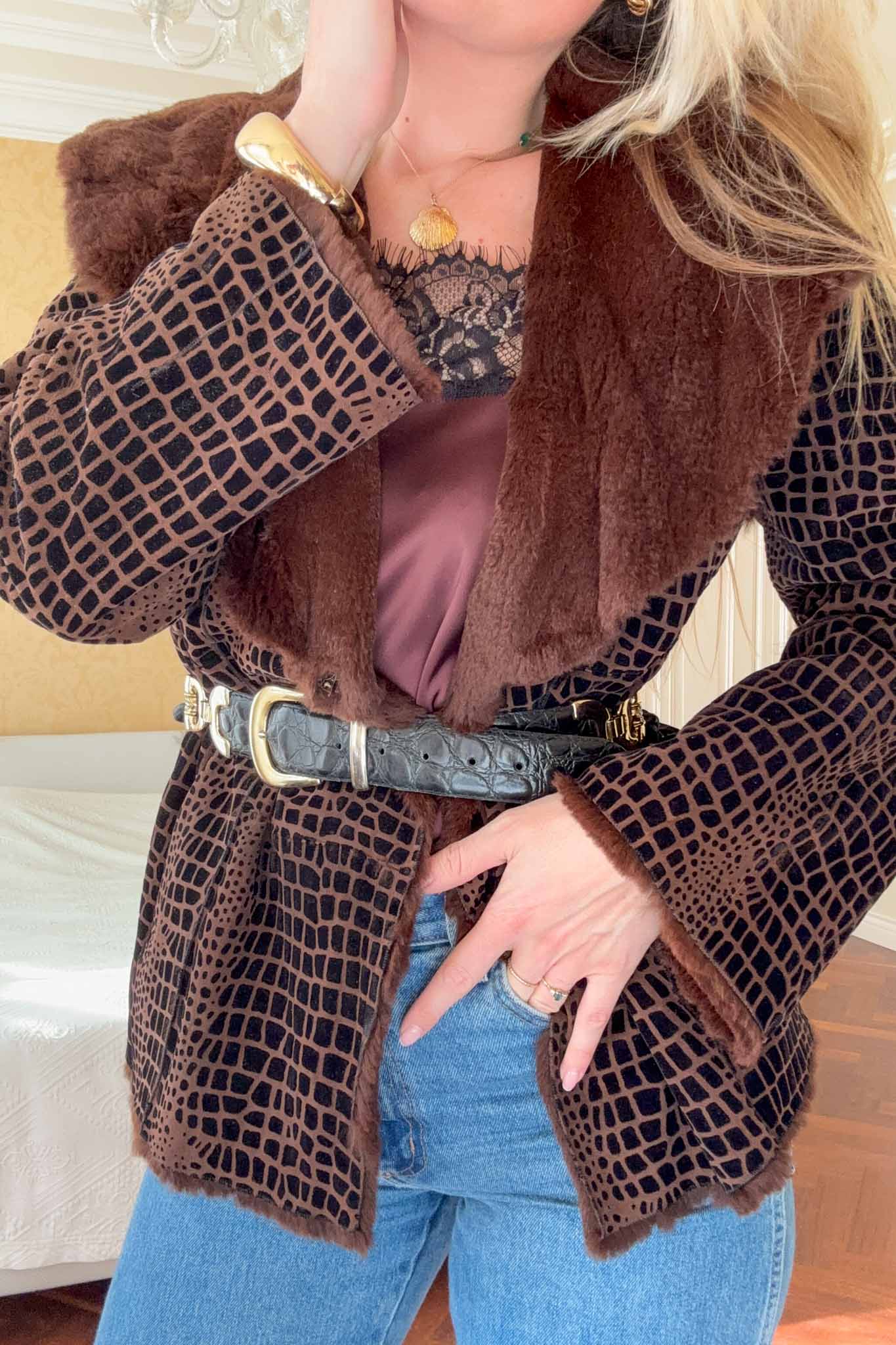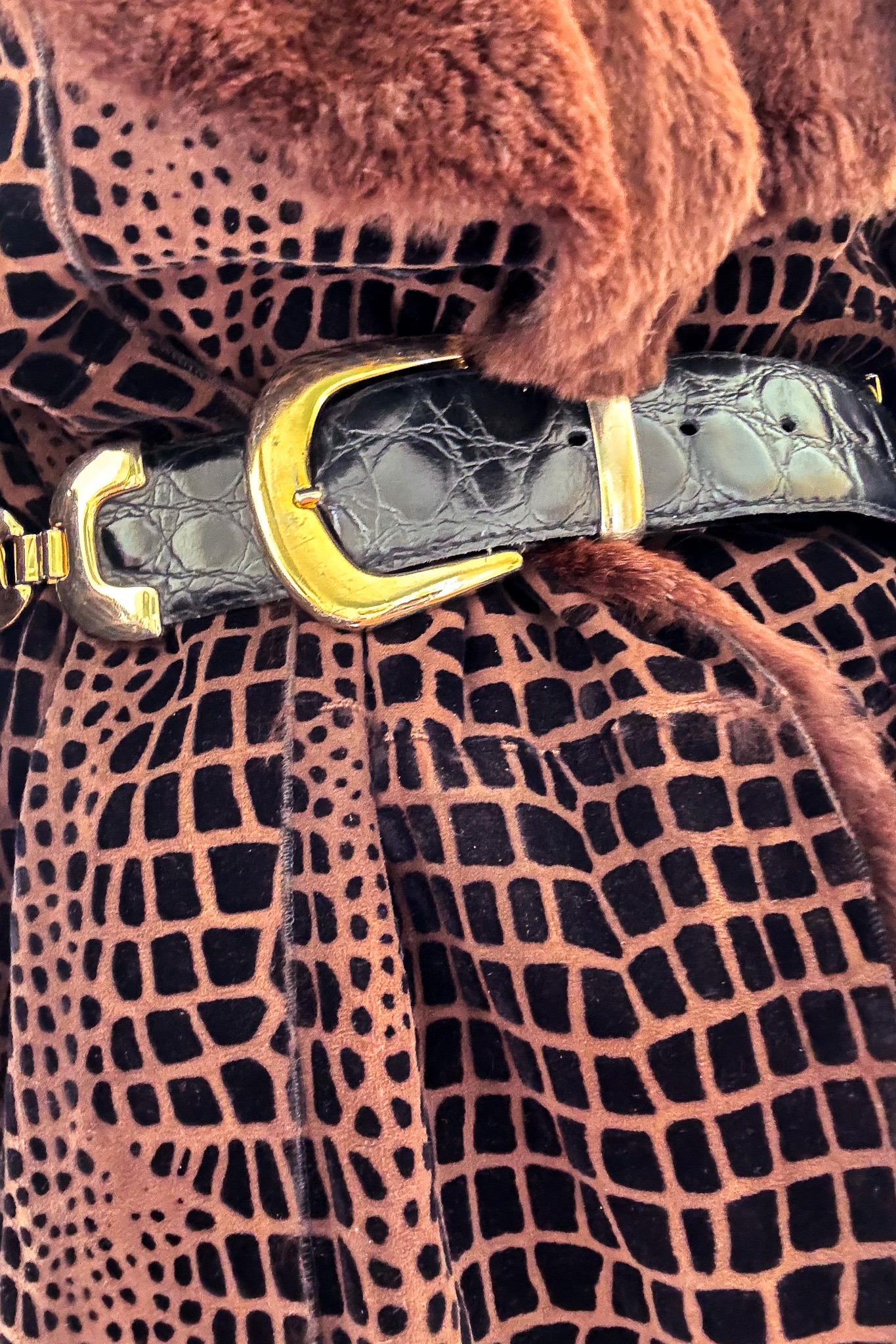 A true vintage treasure, the The deducing chocolate suede velvet coat is the definition of luxury and timeless elegance. Crafted with a faux croco effect suede and velvet, this coat is a dream. The deep, rich tones are complemented by a full, ultra-soft shearling lining, ensuring both warmth and sophistication. The structured silhouette, accented with a delicate leather tie belt at the waist, creates a flattering fit while maintaining its effortlessly chic, vintage edge. A rare statement piece that blends bold textures with vintage charm—designed for those who love to stand out.