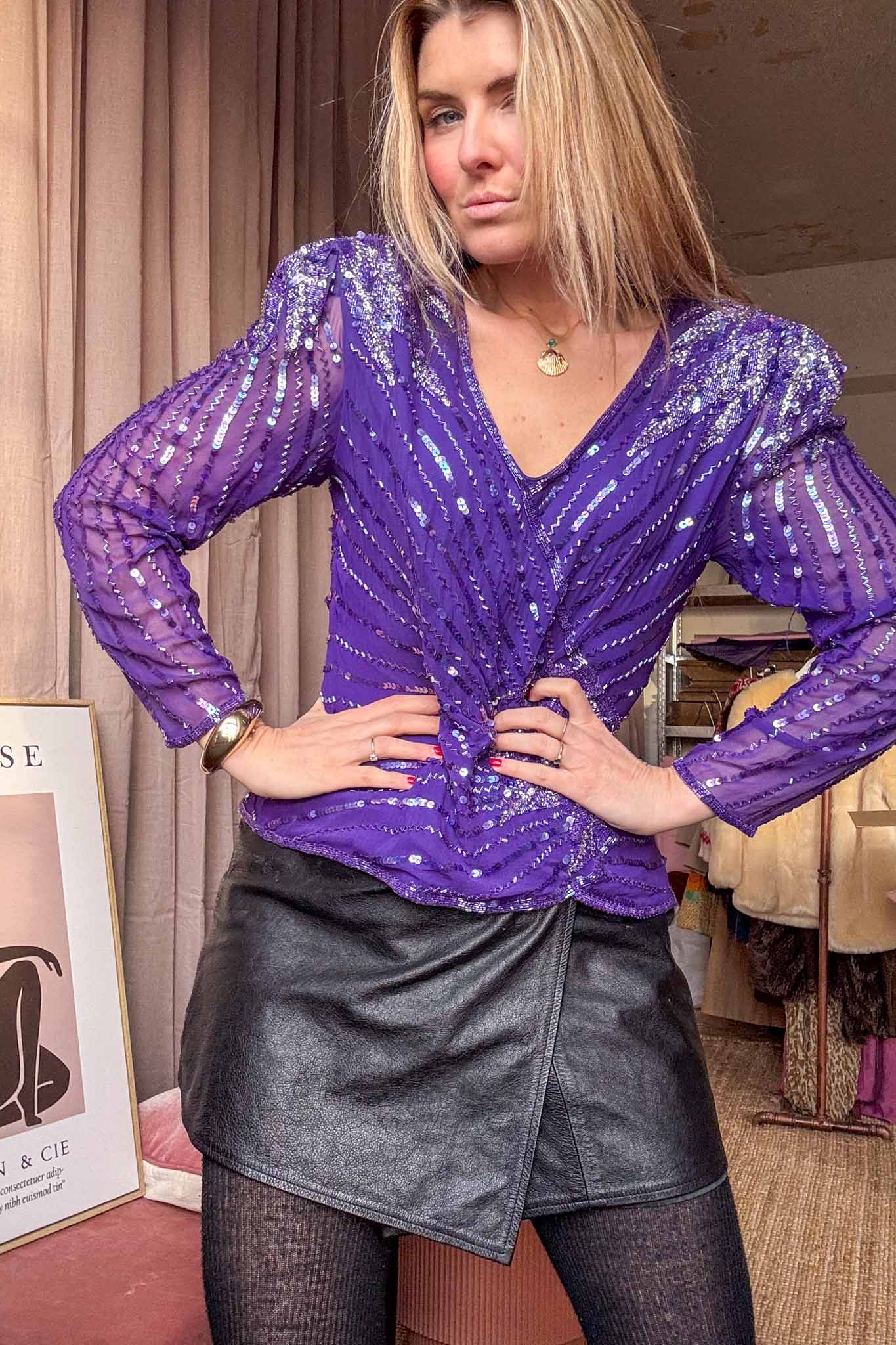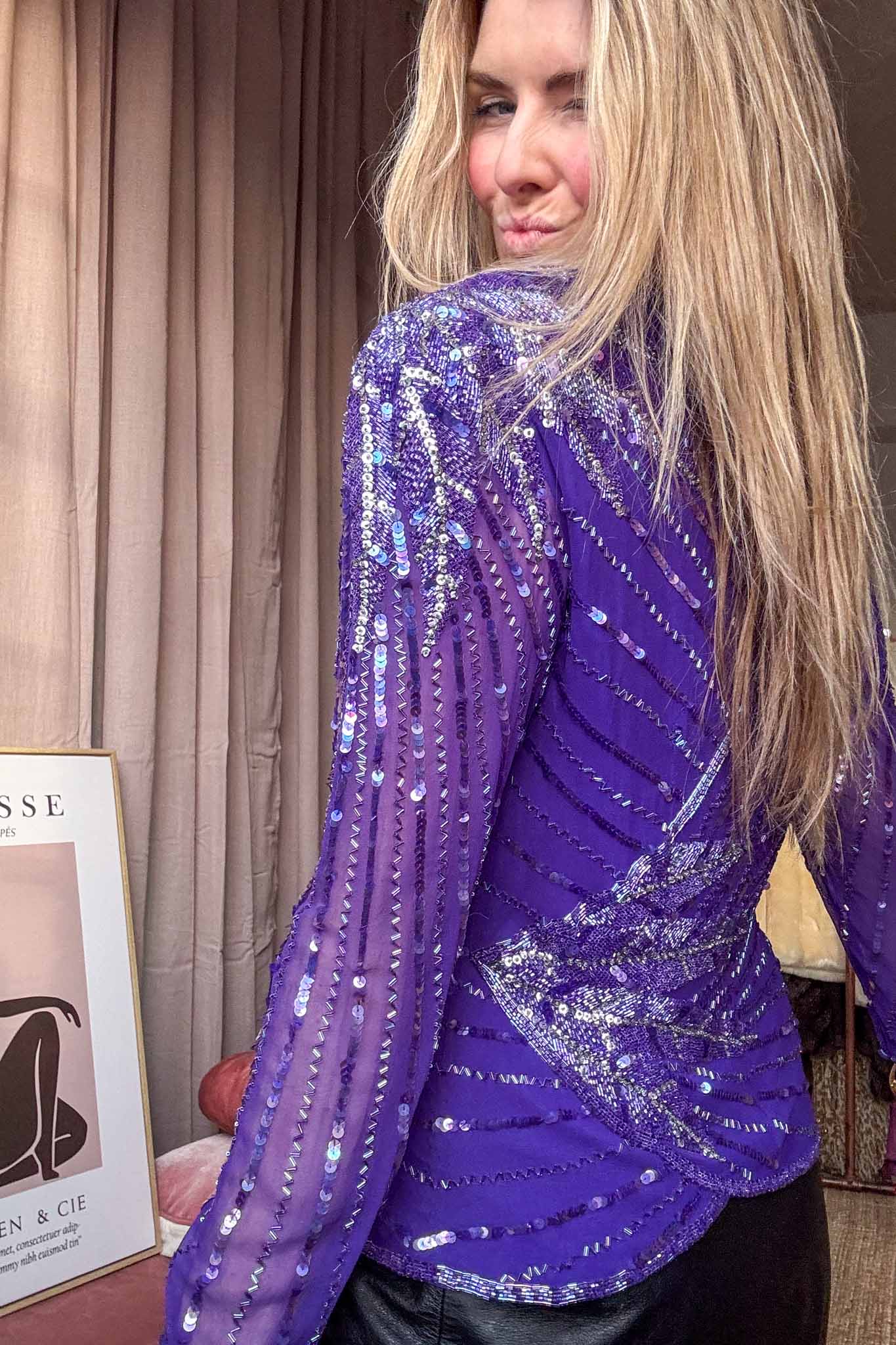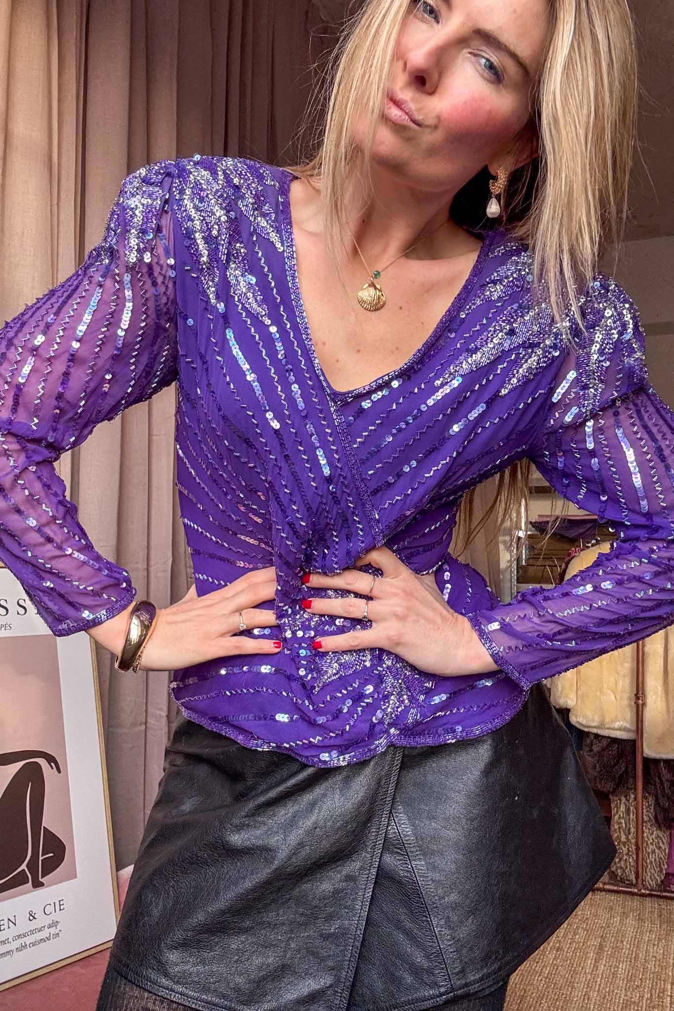 The drama deep purple sequin silk top, this beautiful purple top has shimmering sequins laid out in a stunning pattern, creating that play of light and texture. With a flattering fit for sizes up to 38, this treasure offers style and comfort for your next night out of a special event. This stunning item is perfect for adding that extra pop of glam to any outfit. It can be styled with pants or skirts for an eye-catching look. Hand-selected and cleaned with love by us! This beautiful sequin top is ready to make you shine!