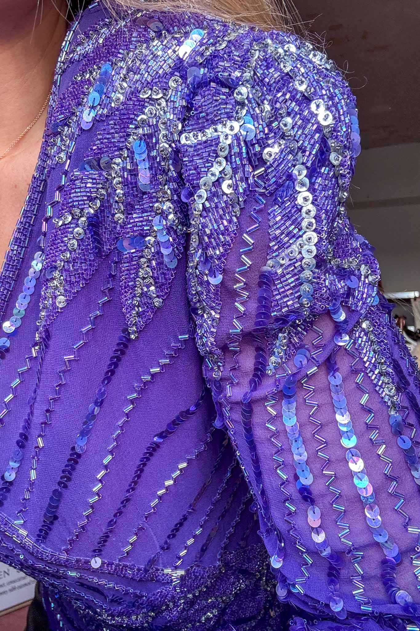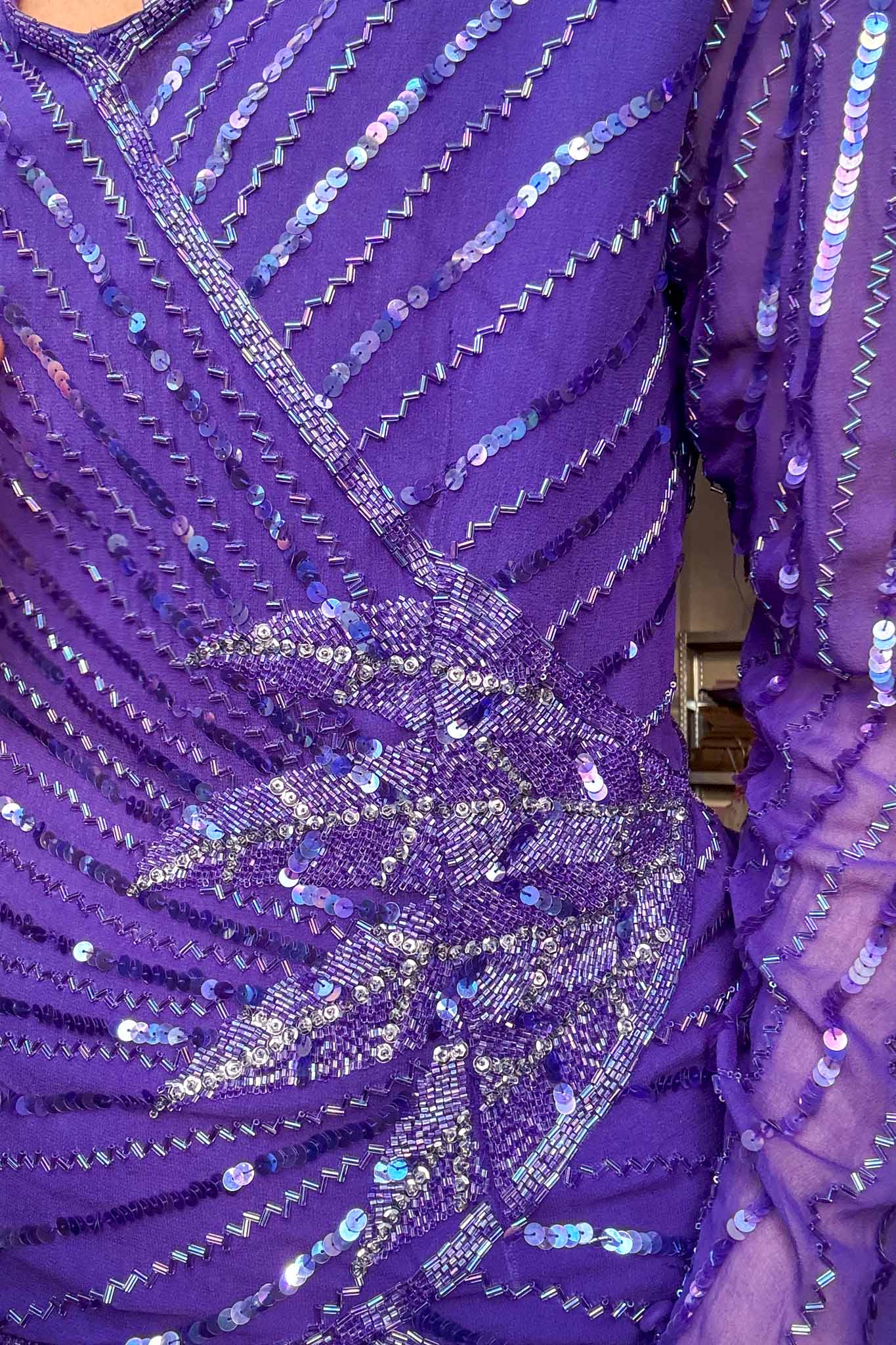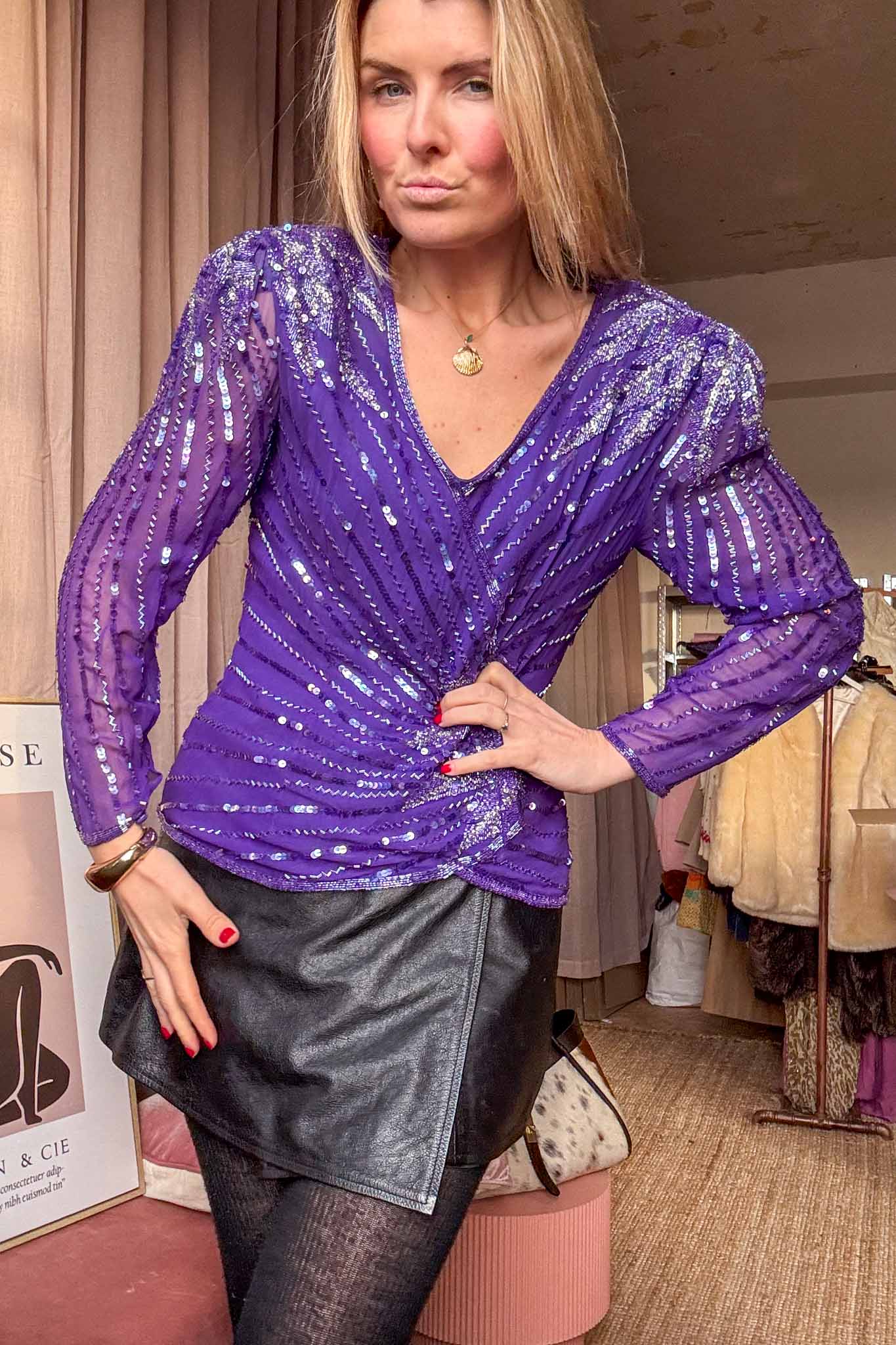 The drama deep purple sequin silk top, this beautiful purple top has shimmering sequins laid out in a stunning pattern, creating that play of light and texture. With a flattering fit for sizes up to 38, this treasure offers style and comfort for your next night out of a special event. This stunning item is perfect for adding that extra pop of glam to any outfit. It can be styled with pants or skirts for an eye-catching look. Hand-selected and cleaned with love by us! This beautiful sequin top is ready to make you shine!