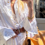 Delicate vertical stripes, subtly woven with golden thread, elongate the figure and add a refined touch of shimmer, while the stunning gold-toned buttons bring a hint of vintage glamour. With its chic, slightly oversized fit and graceful drape, it’s the kind of piece that transitions beautifully from day to night. Wear this stunner as a one size fits all. The model wears it in an oversized fit as a 36.