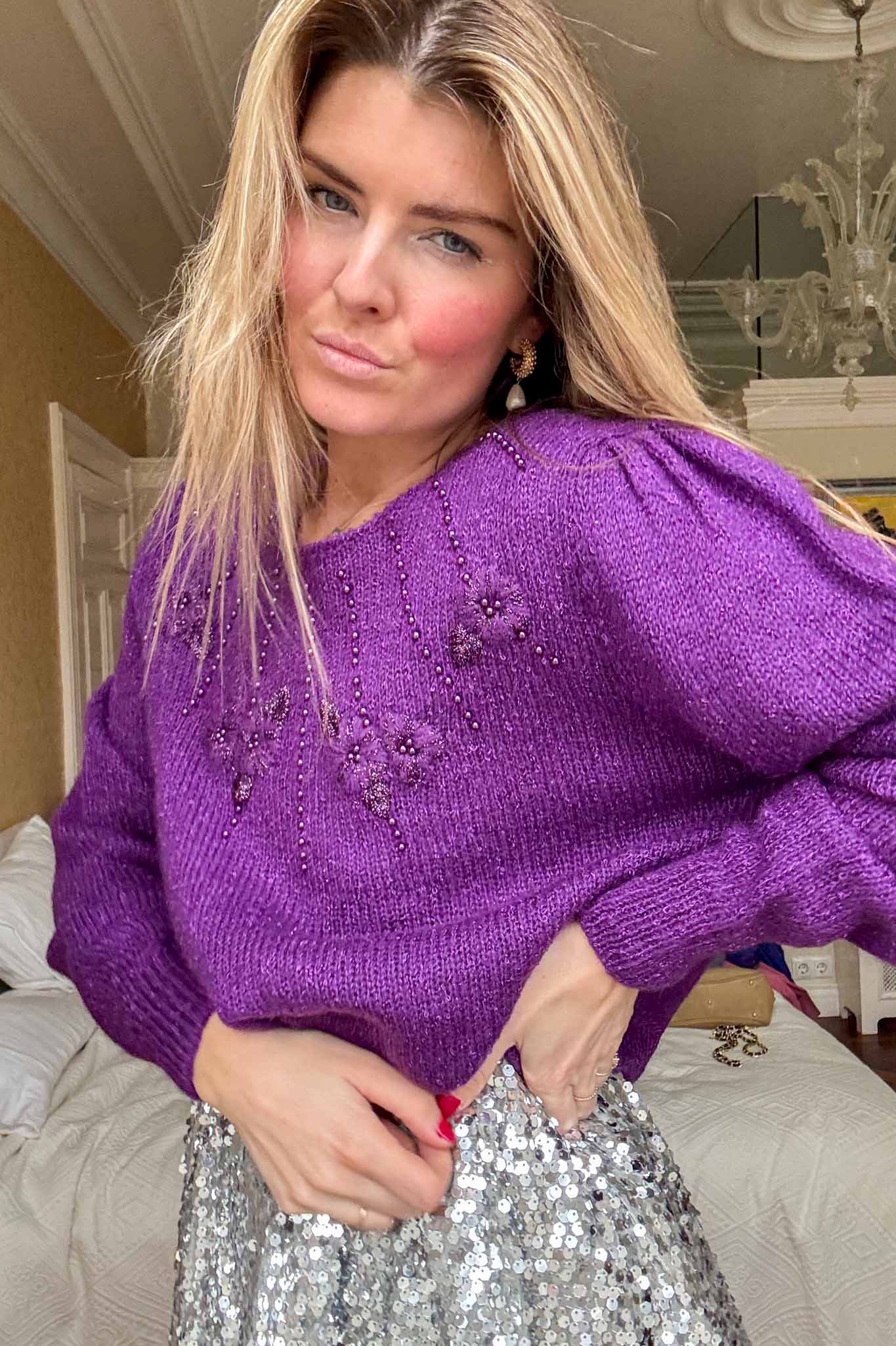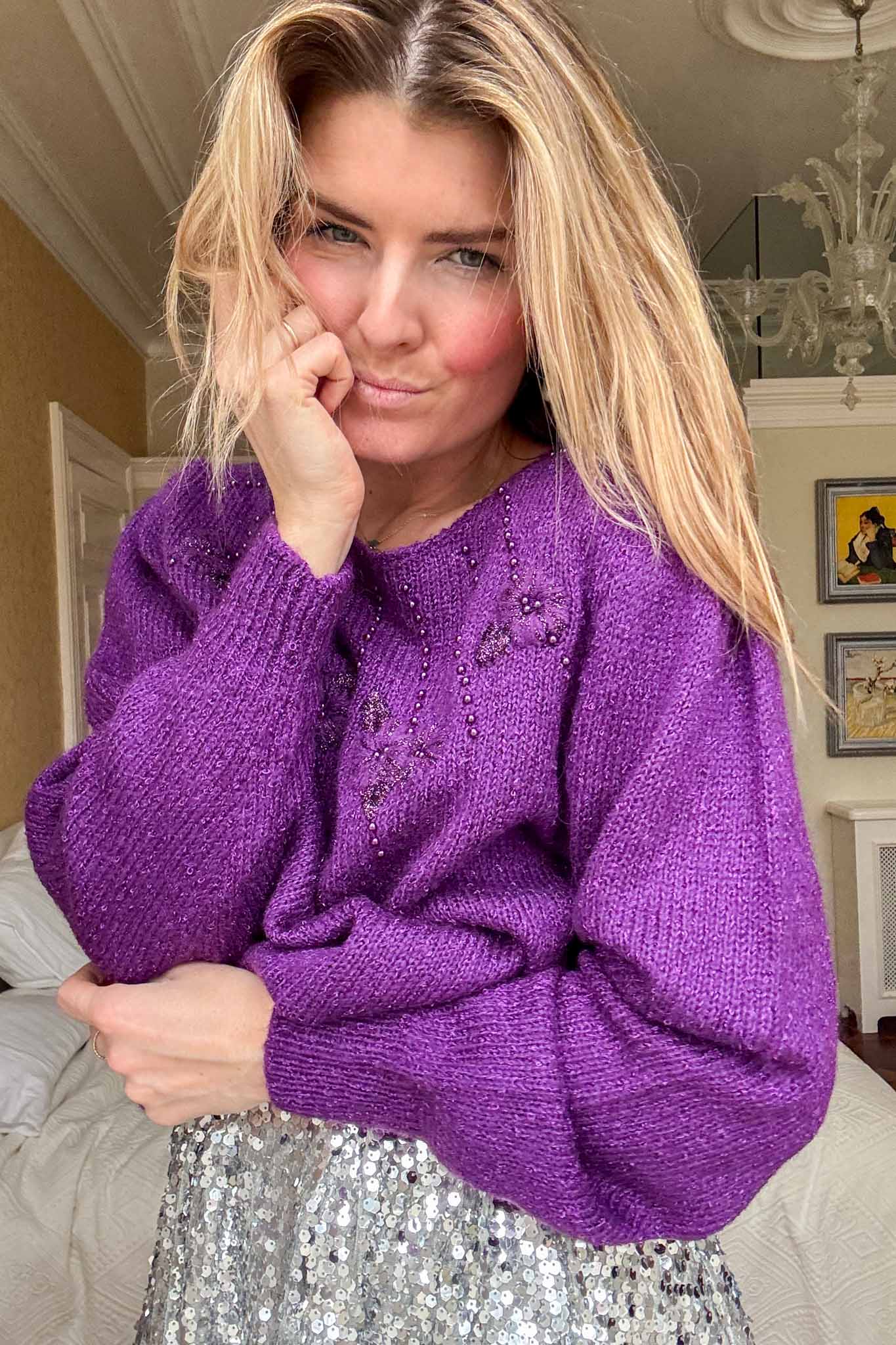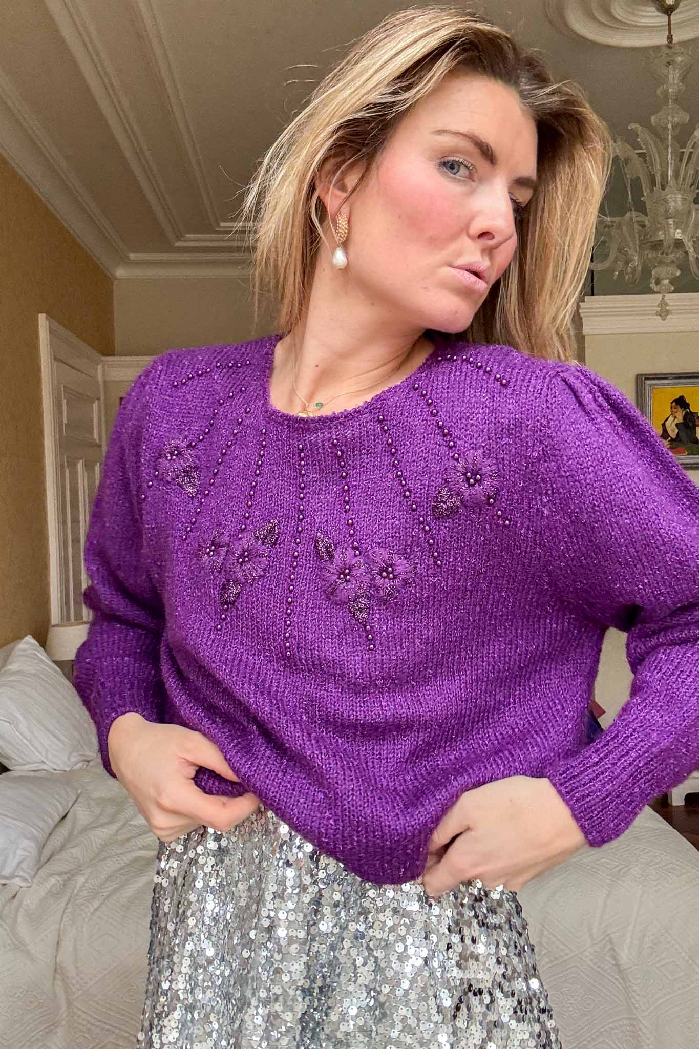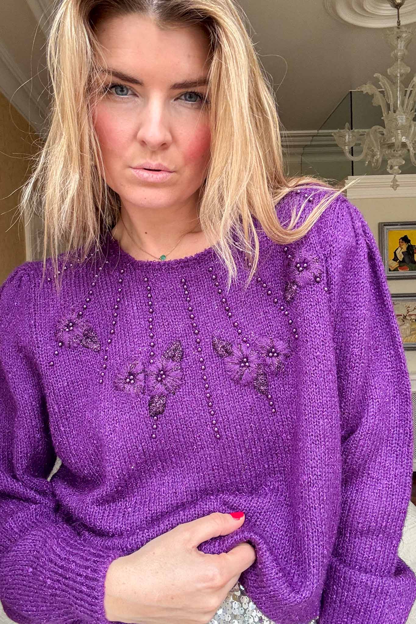 Wrap yourself in understated elegance with the Manhattan spark knit. This deep purple treasure is adorned with delicate beaded details that catch the light, adding a subtle shimmer to its cozy design. The soft, luxurious knit offers both warmth and style, making it perfect for cooler days or layered for a special evening look. Pair it with tailored trousers or your favorite skirt for an effortlessly chic ensemble. As always, this knit has been lovingly cleaned and steamed by our team, ready to bring timeless charm to your collection.
