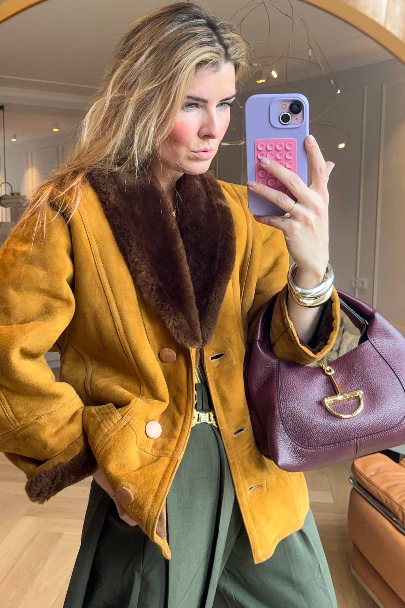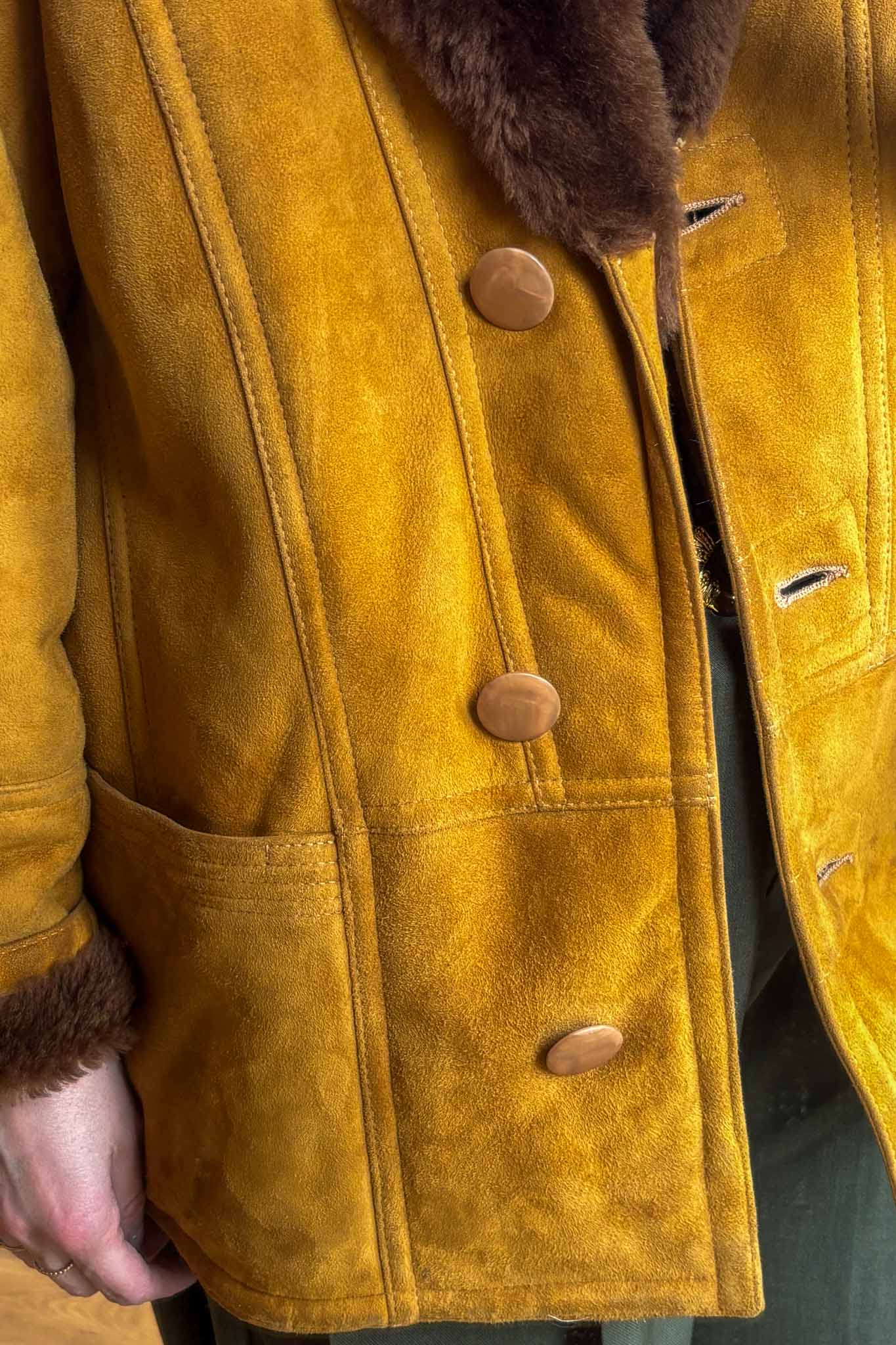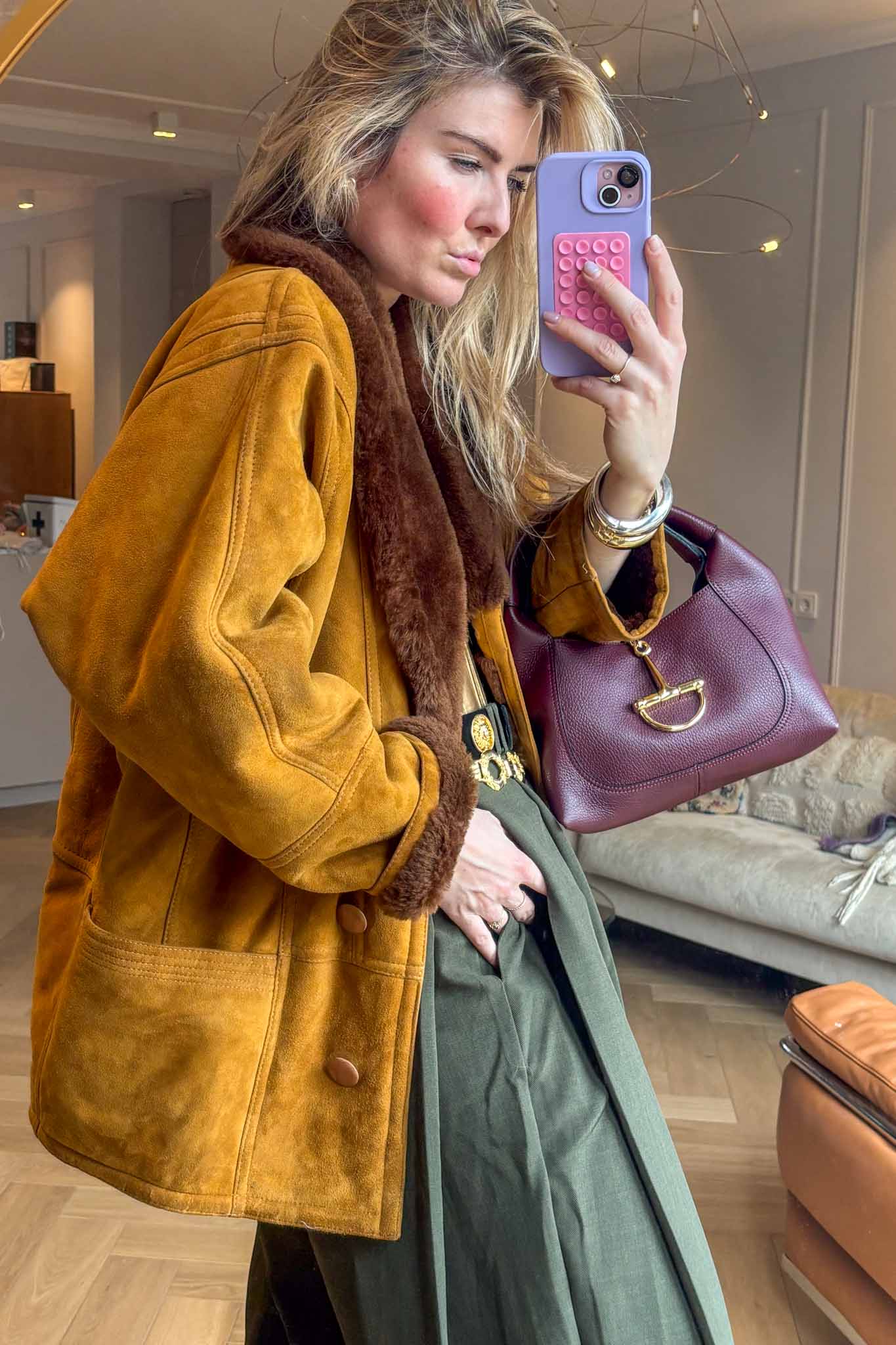 Your new wardrobe treasure: the Lovers’ Paradise Suede Shearling coat. Crafted in rich chocolate suede with a rare ochre color finish, this one-of-a-kind piece brings artisanal elegance to any outfit. Featuring two side pockets, a superb shearling lining, and a stunning length, it combines comfort, style, and statement-making design. Steamed and dry-cleaned by our team, each jacket is meticulously prepared for lasting beauty.