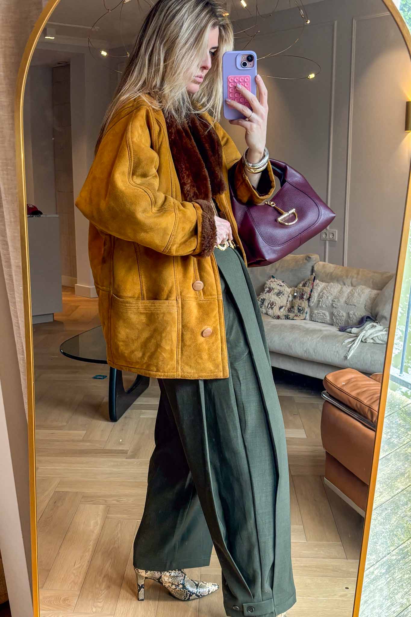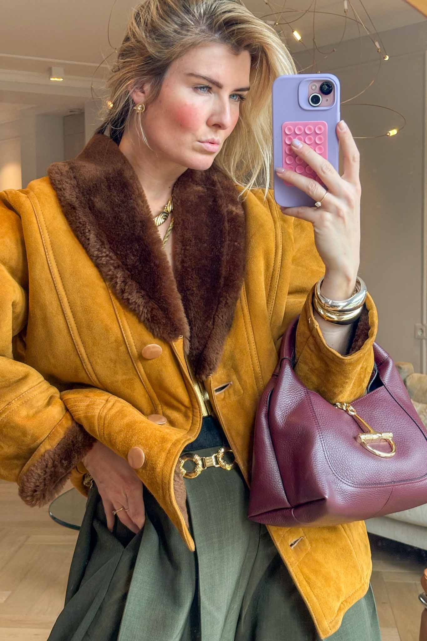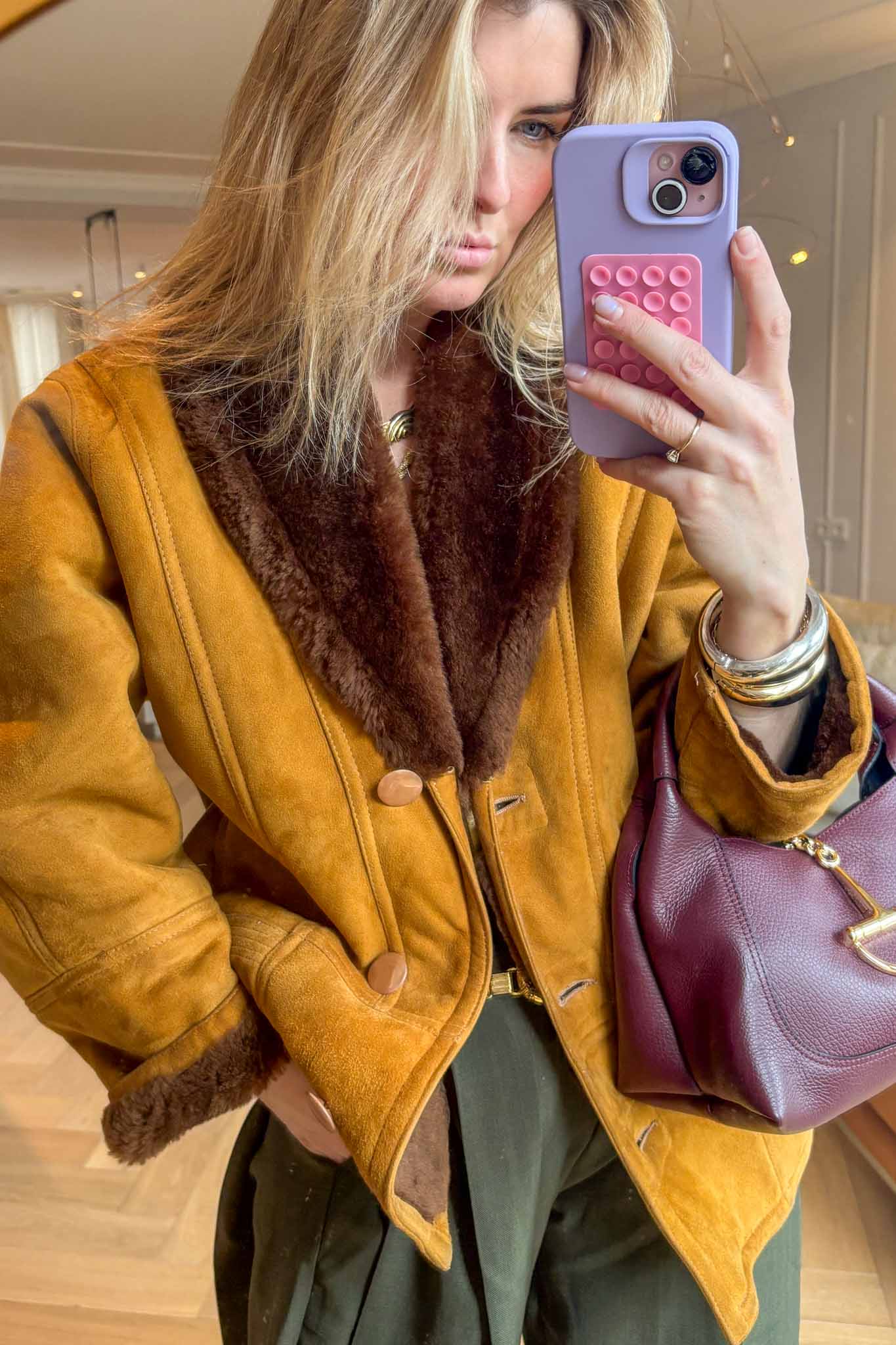 Your new wardrobe treasure: the Lovers’ Paradise Suede Shearling coat. Crafted in rich chocolate suede with a rare ochre color finish, this one-of-a-kind piece brings artisanal elegance to any outfit. Featuring two side pockets, a superb shearling lining, and a stunning length, it combines comfort, style, and statement-making design. Steamed and dry-cleaned by our team, each jacket is meticulously prepared for lasting beauty.