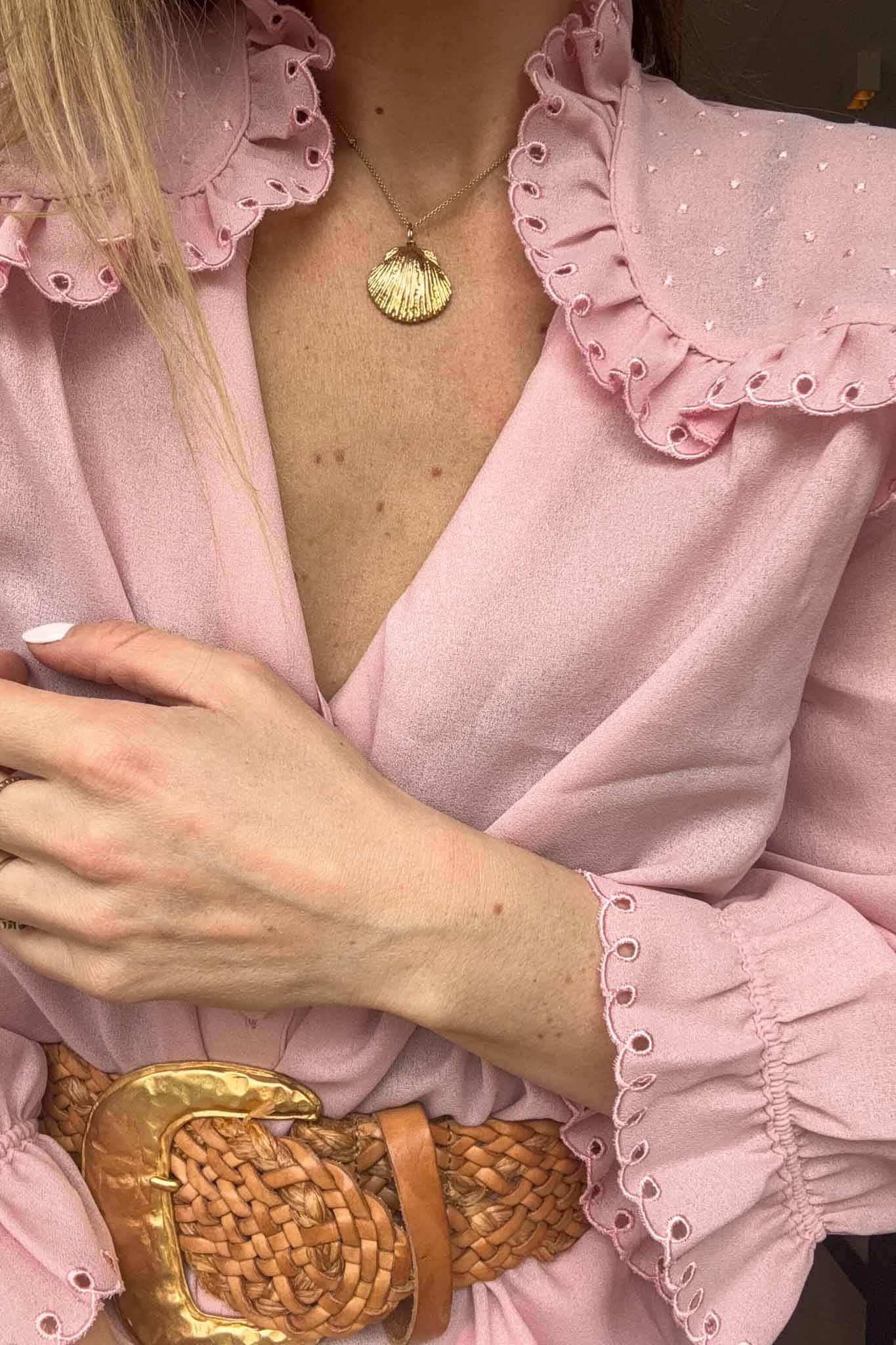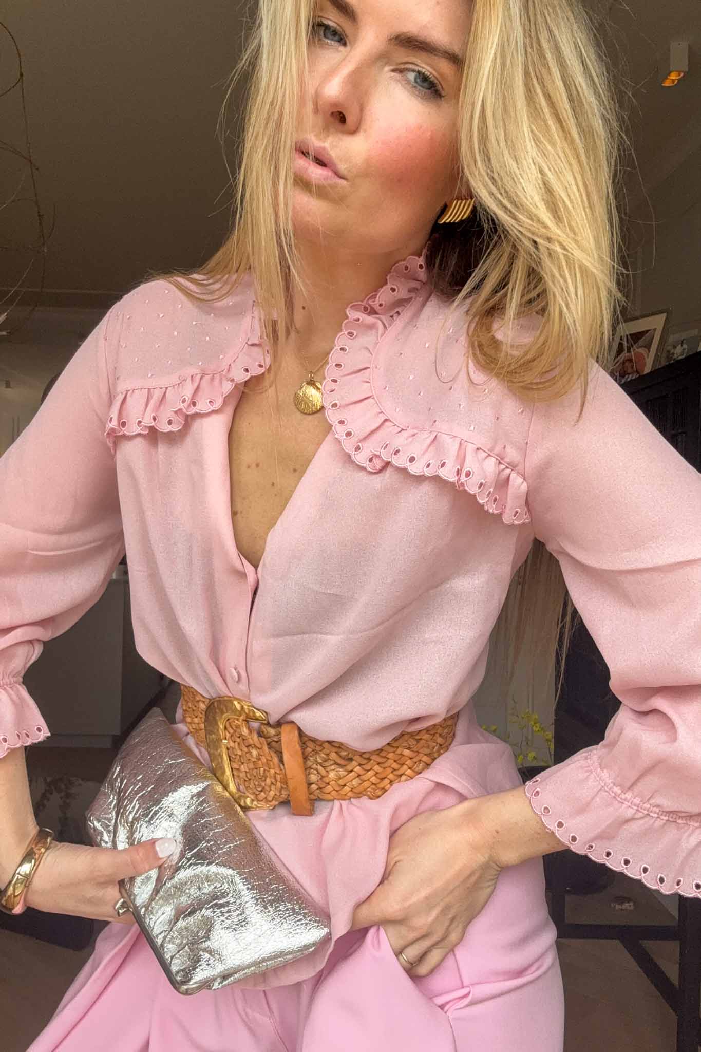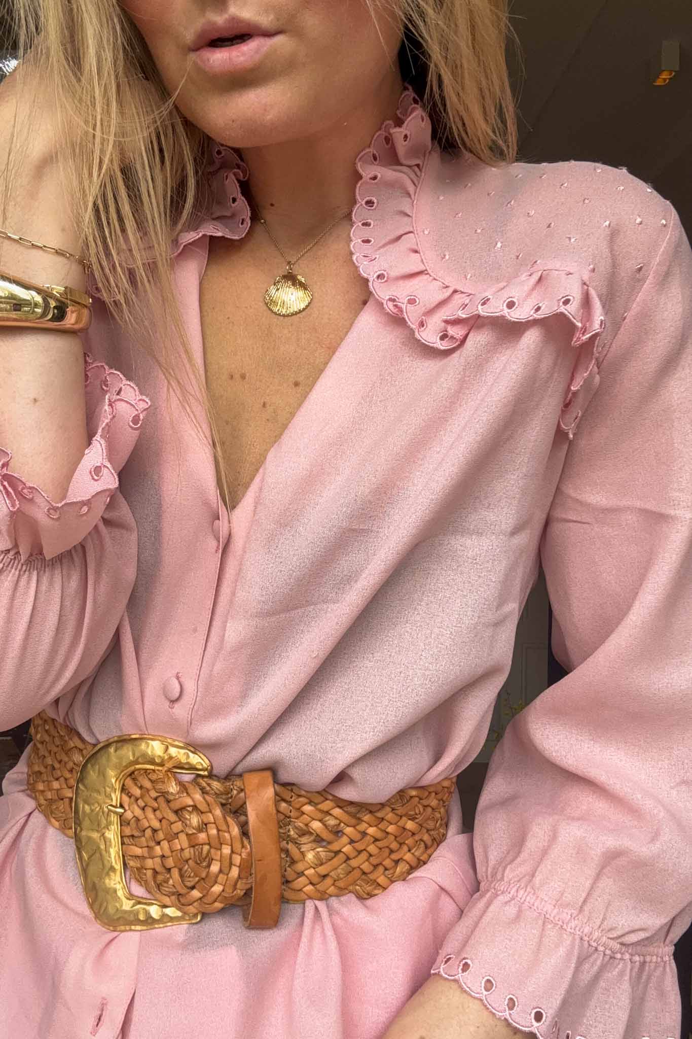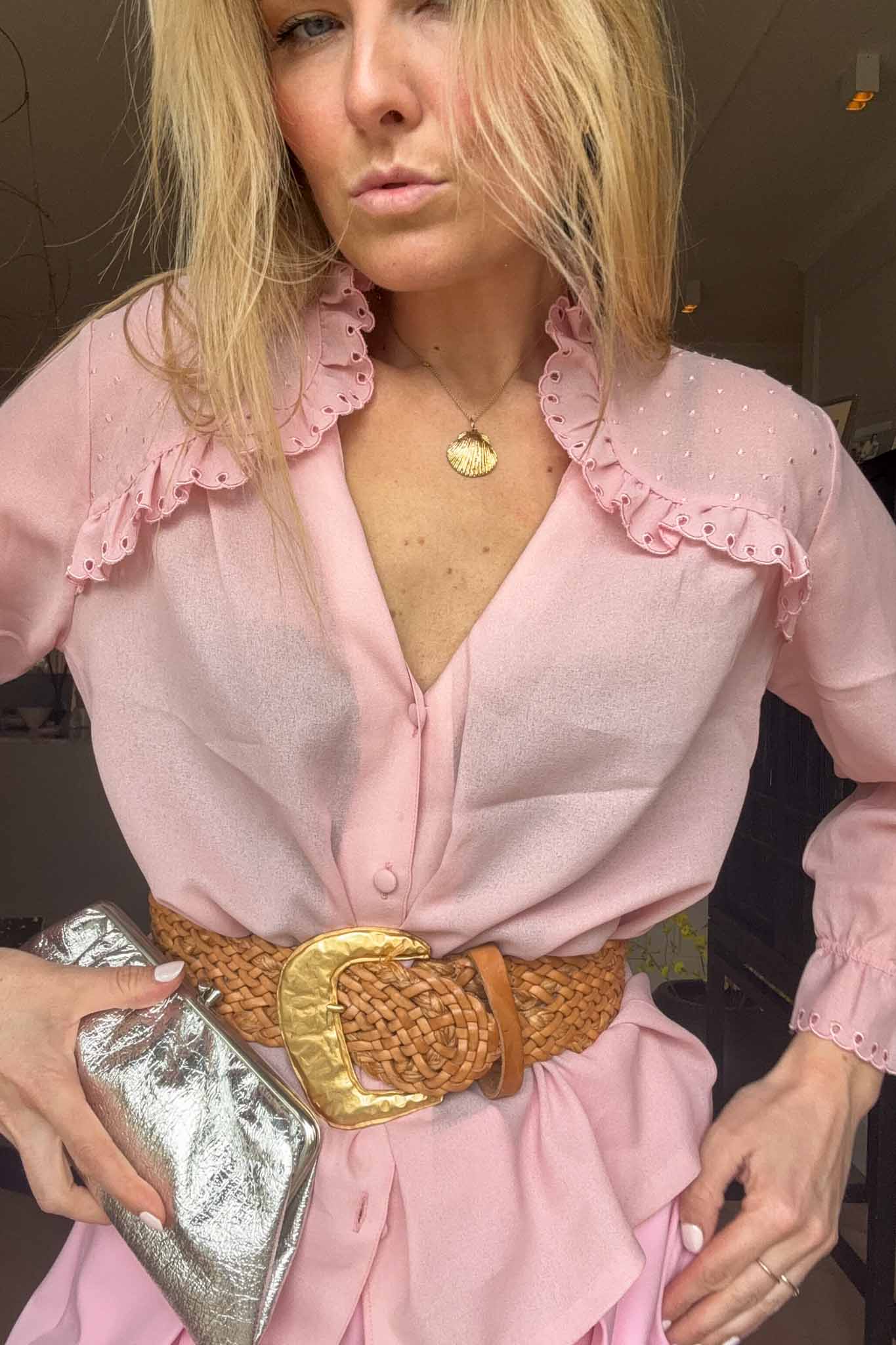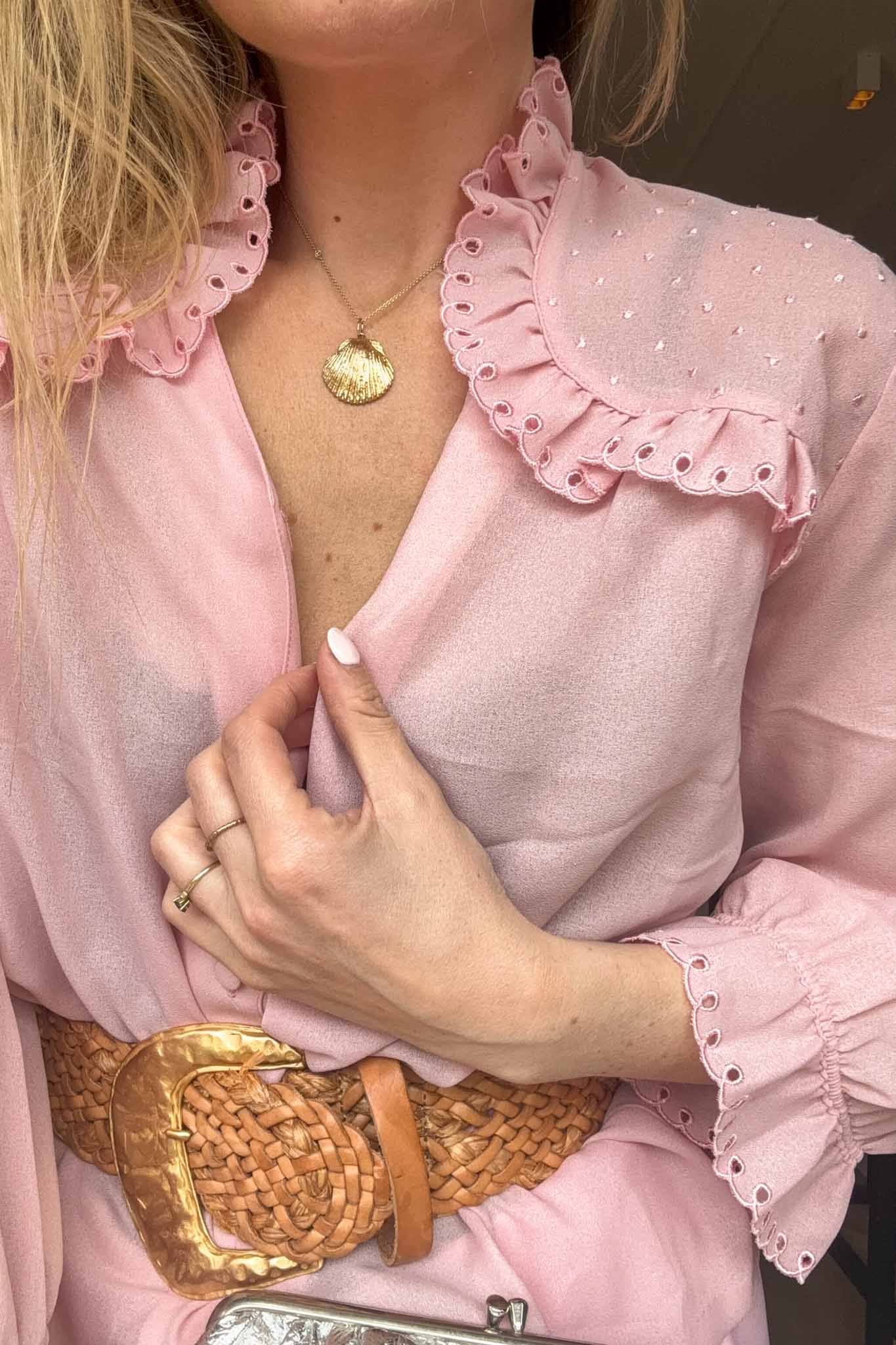 A soft romantic vintage blouse with delicate embroidered ruffles that make it feel timeless and feminine. This is one of those pieces that instantly elevates a simple outfit.
