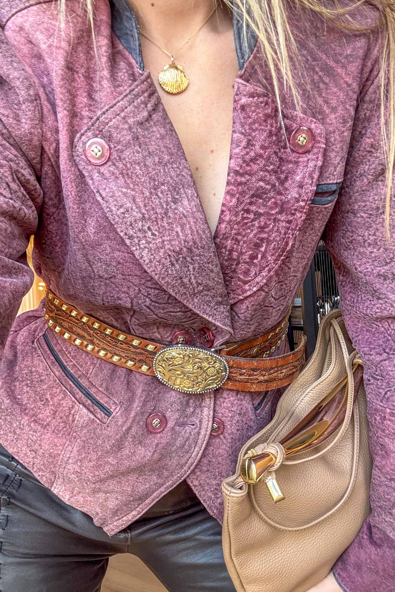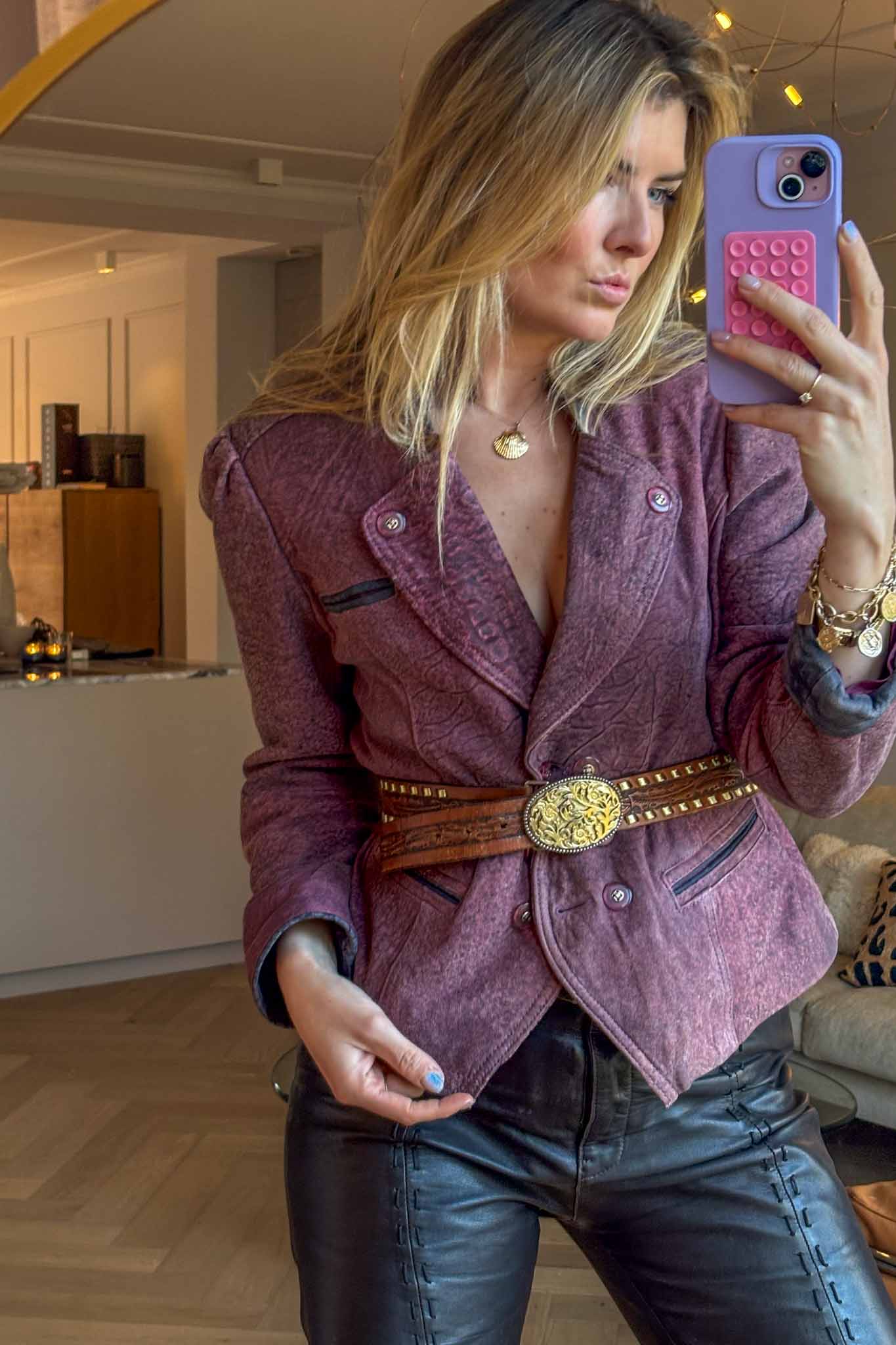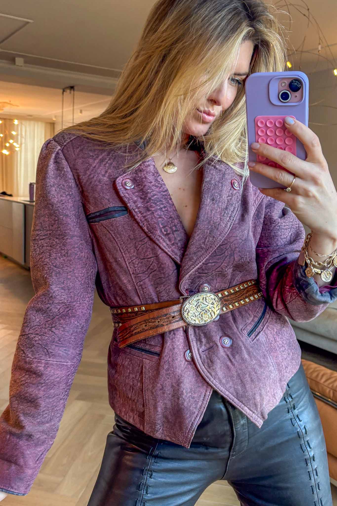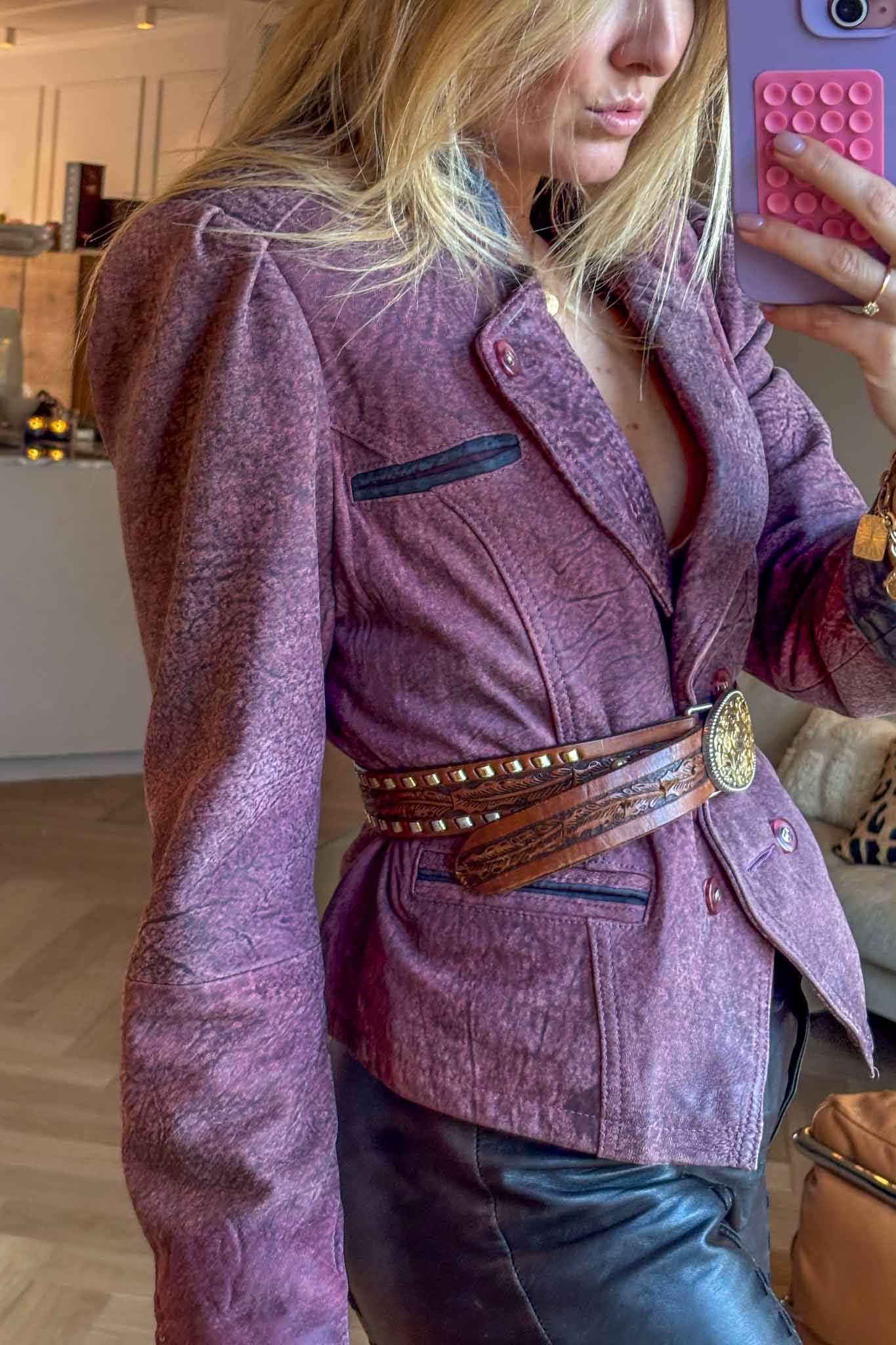 The Violet Riot Blazer is a purple leather statement jacket with intentional wear that gives it character, edge, and soul. The leather shows a beautifully damaged, lived-in finish, making each mark part of its story — nothing polished, nothing predictable.