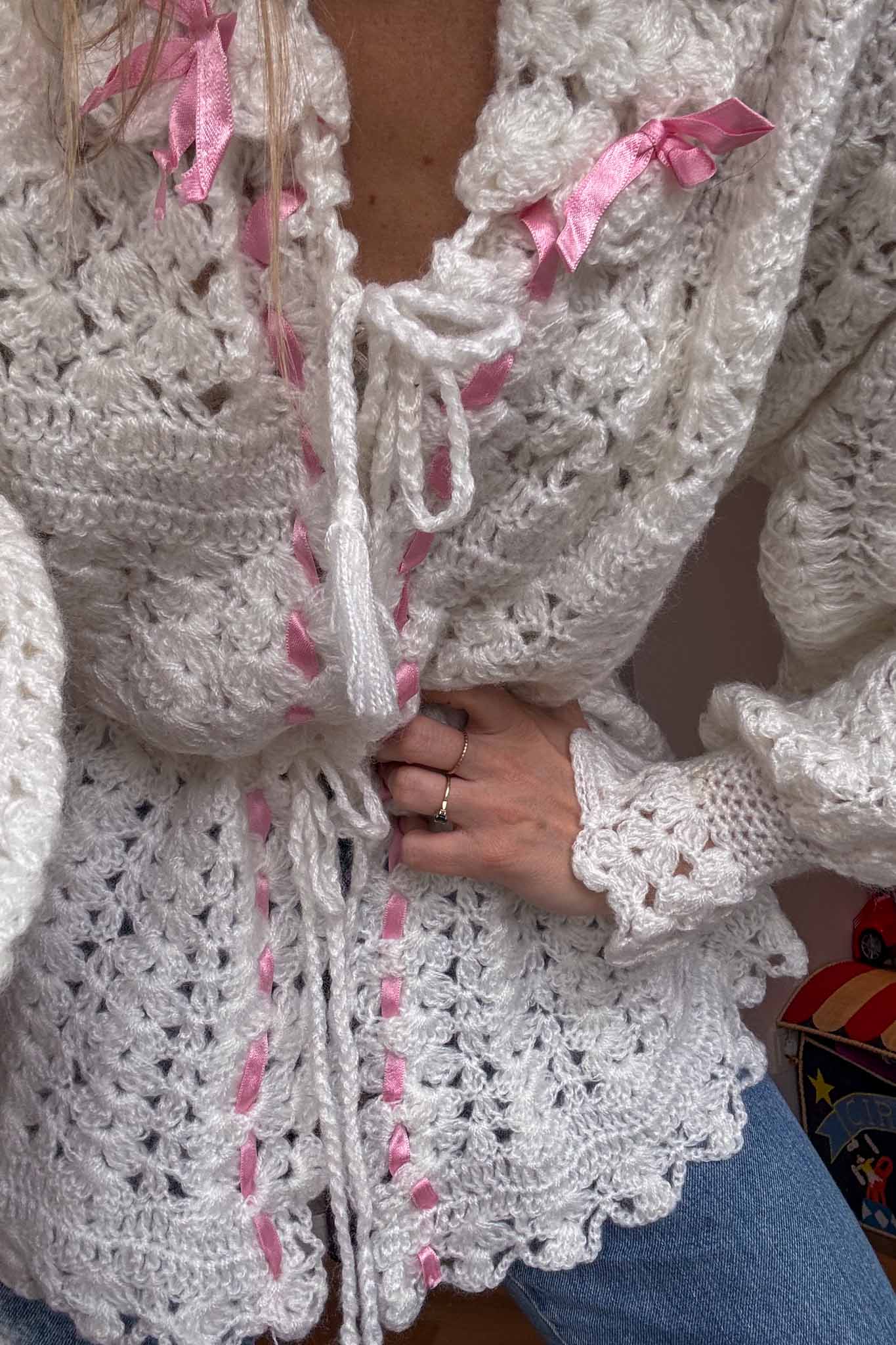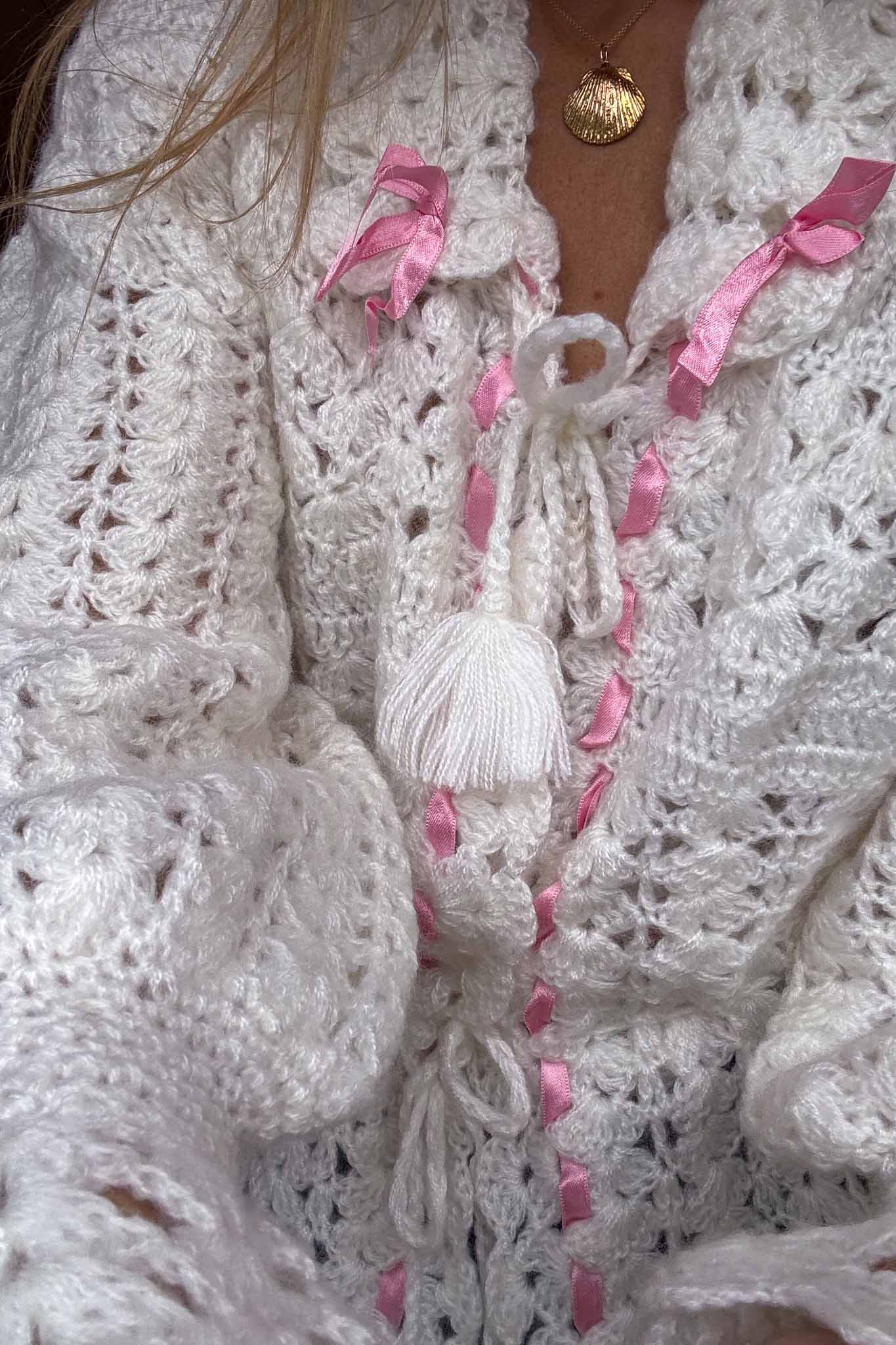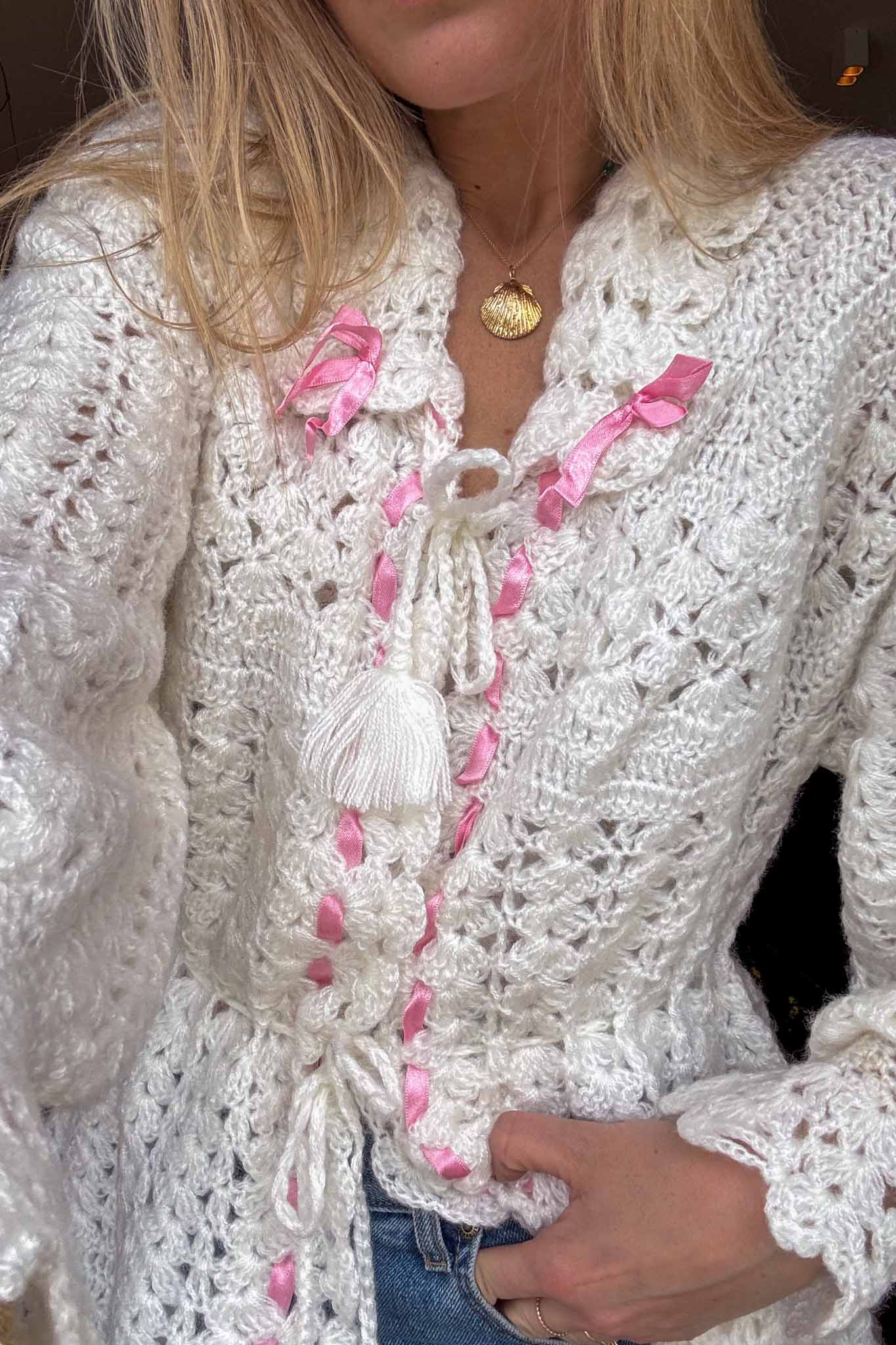 TThe Whimsical Ribbon Hand-knitted Cardigan is made out of 100% cotton vintage knit with embroidered pink lace ribbons running vertically. Featuring a fitted waist with tie, puffed sleeves, and soft stretch, it’s cozy, romantic, and one-of-a-kind.