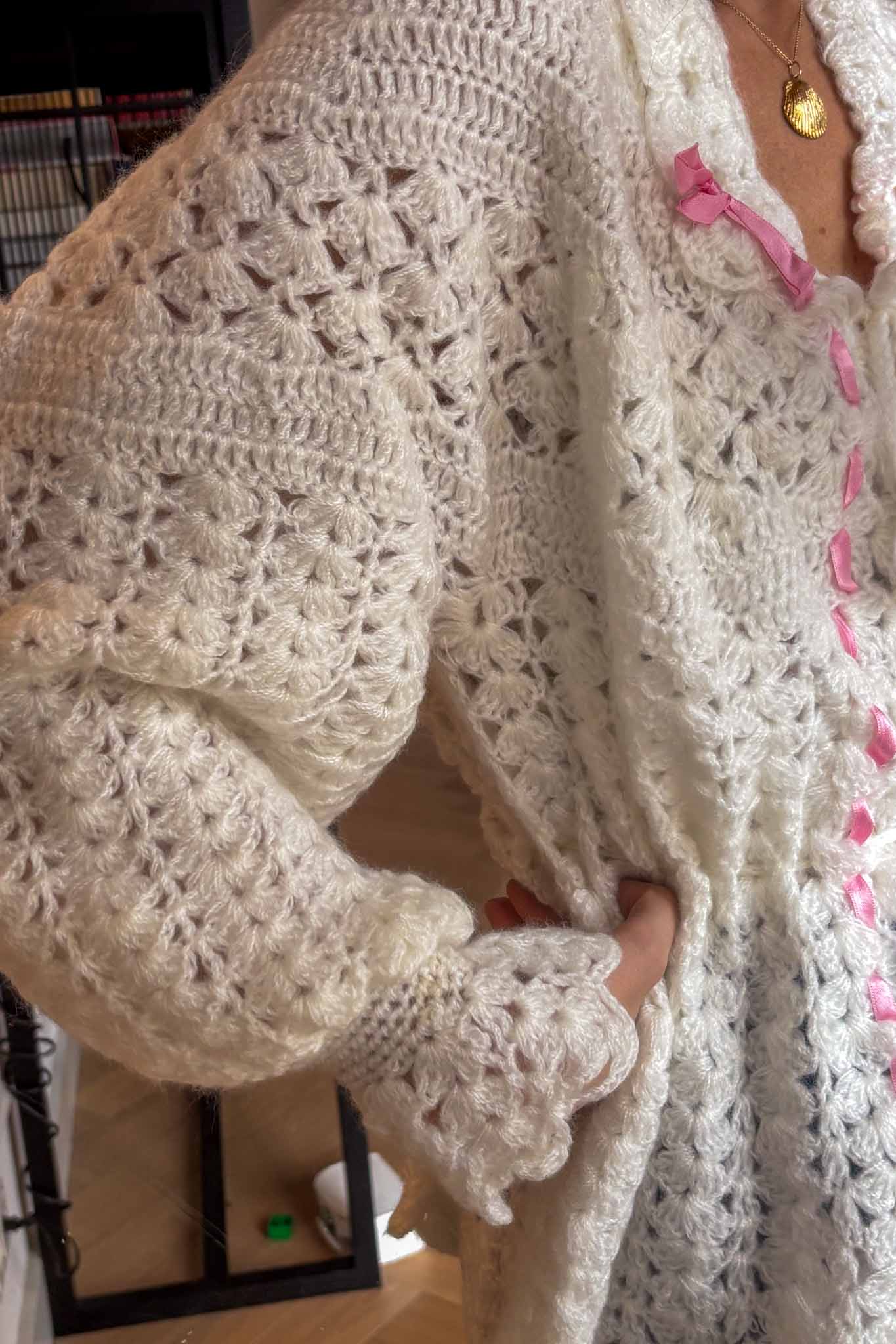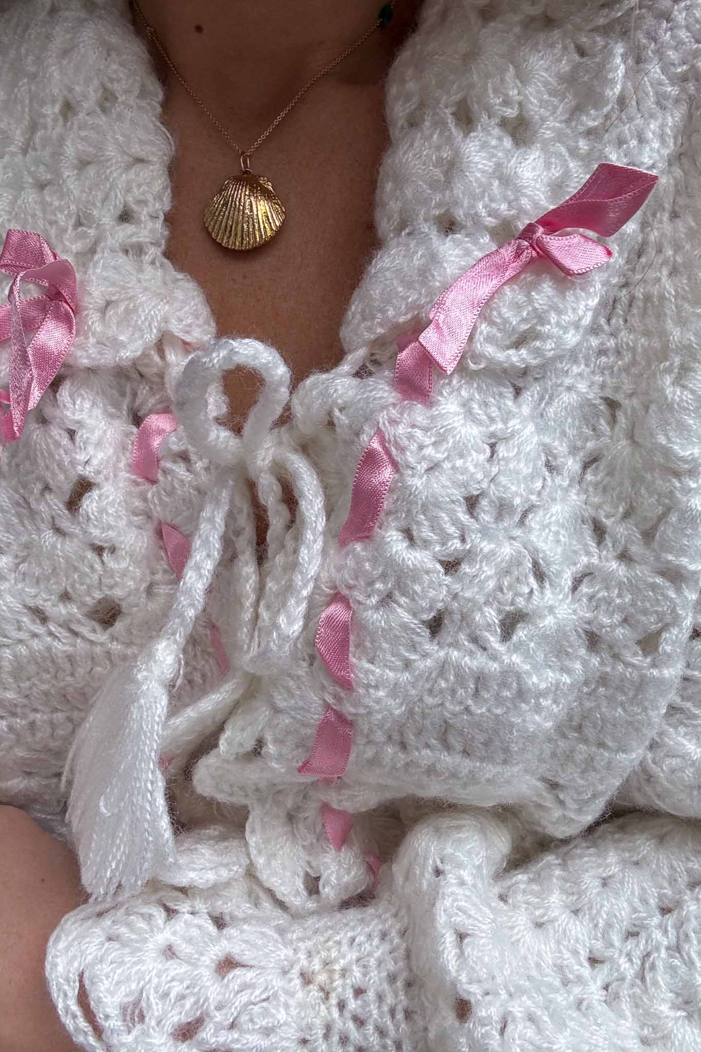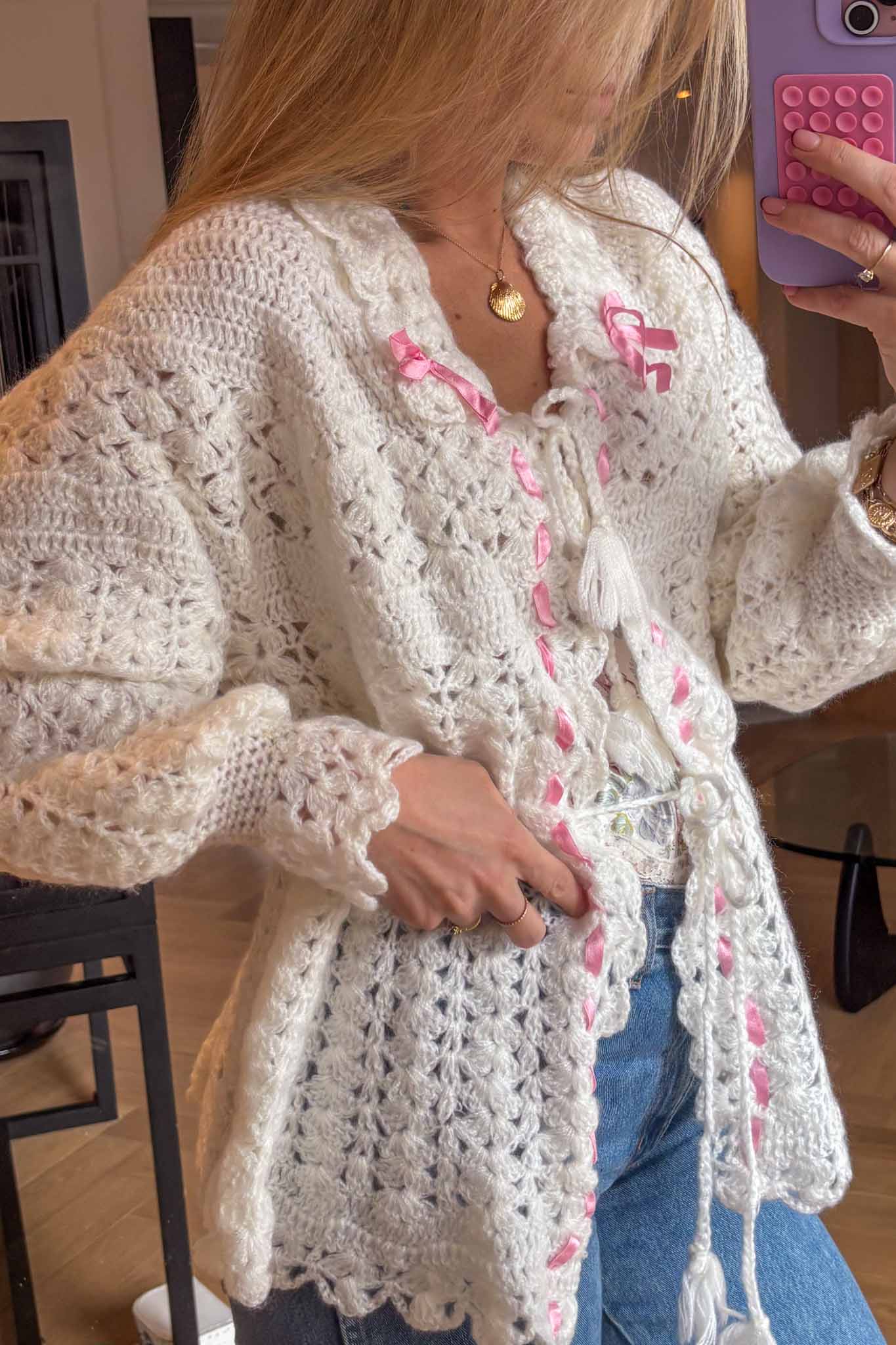TThe Whimsical Ribbon Hand-knitted Cardigan is made out of 100% cotton vintage knit with embroidered pink lace ribbons running vertically. Featuring a fitted waist with tie, puffed sleeves, and soft stretch, it’s cozy, romantic, and one-of-a-kind.